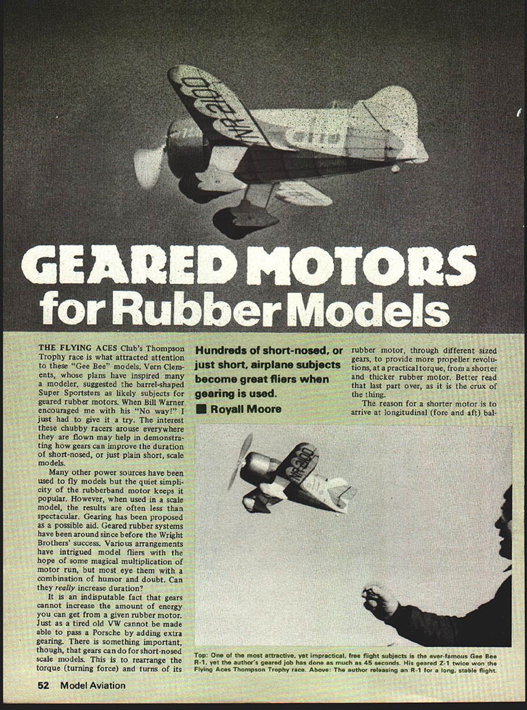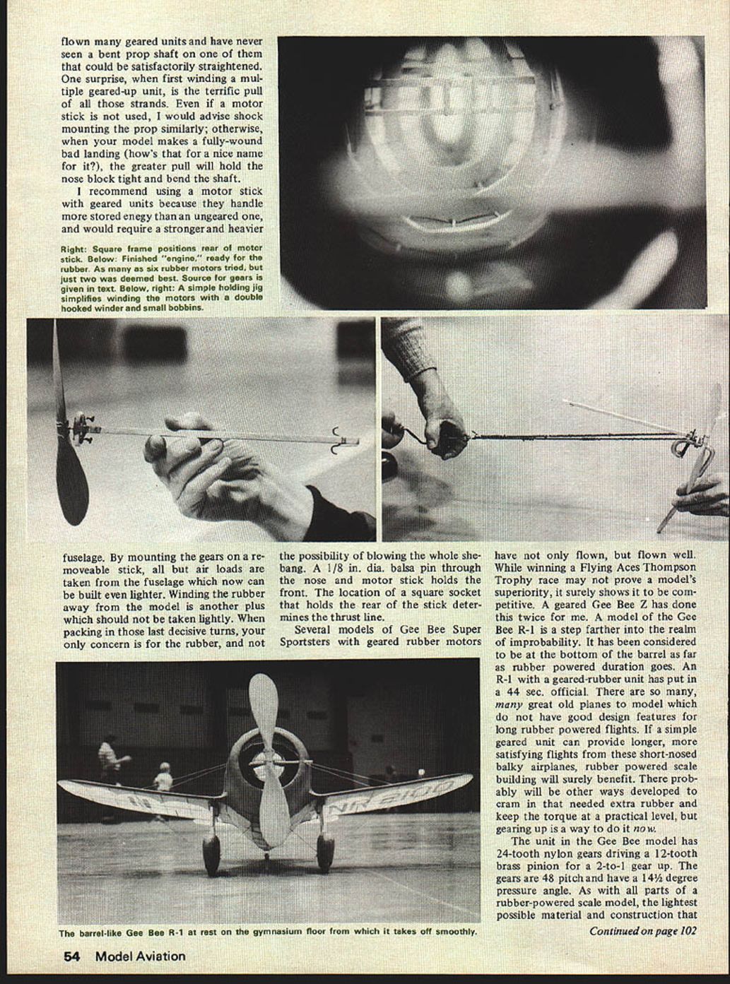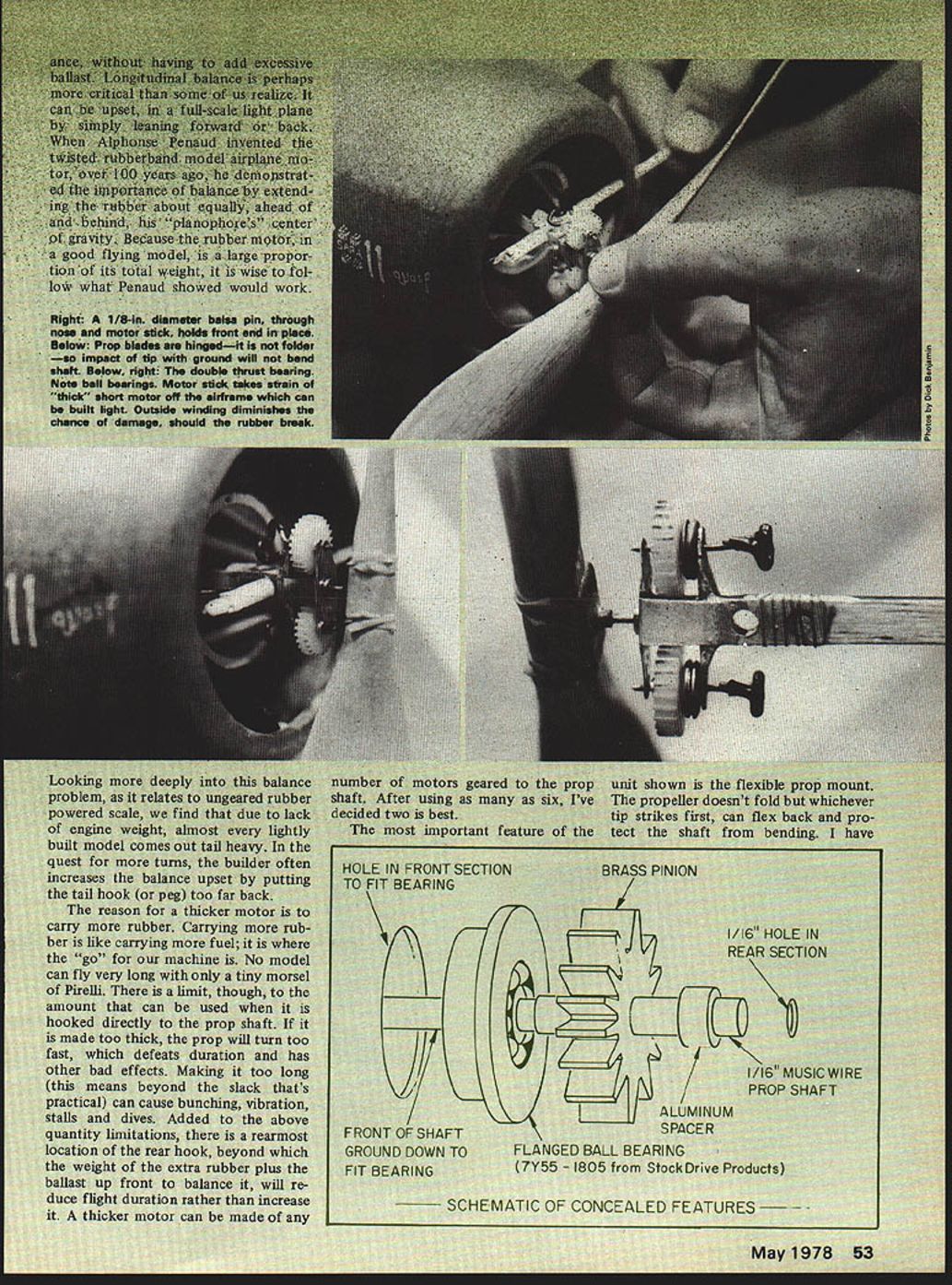 NO OCR TEXT NO OCR TEXT flown geared units seen bent prop shaft could satisfactori surprise first tiple geared-up unit strands stick used ting prop sii model ma1 bad landing hows tli greater nose block tight recommend geared units stored em would requu Right Square frame stick Below rubber As just two deemi given text Below simplifies winding hooked winder fuselage mc moveable n fr e possibility blo uang 1/8 dia *he nose motc location holds rear mines thrust line Several models rtsters gesi rac urity re rice -1 st sprobab ill b er p e sec great c lot have rubber r4 BOX 511G HIGGINSVILLE MISSOURI 64037 booklet comes Ace unit helps lot Good Luck Geared Motors/Moore continued page 54 can withstand strain should used vestige gear box really double thrust bearing light front section provide two supports shaft 021 thick rear 010 thick front steel blanks tack sold ered together edge accurate drilling before cutting shape spacing shaft holes tested scrap gears shafts slight amount lash necessary free running assembly 039 music wire hook shafts have short flat ground bushings will aluminum bushings swaged Sterling Instrument Catalog 464-page compendium Precision Electro-Mechanical Components includes 109-page tech nical section precision gearing gear train design Broken down nine sections catalogue includes listing over 6500 gears plus numerous other categories items Dimensioned scale drawings tables etc impressively presented Price $395 Ster ling Instrument 55 S Denton Ave New Hyde Park NY 11040 product review product review product review tightly place turned press fit 1/8 thick nylon gears Six grooves milled lengthwise bushing anchor gear An extra inch hook shafts clipped off later allows chucking lathe machining bushings 3/32 thick 12-tooth gear sliced brass pinion wire cutoff tool lathe after accurately dril ling undersize drive fit 1/16 m music wire prop shaft front 3/8 shaft ground lathe fit small ball bearing bearing has flange inside front section takes radial thrust loads fast est turning part source small gears bearings Stock Drive Products 55 South Denton Ave New Hyde Park NY 11040 catalog 75 Handbook Stock Gears $295 Quickie/Berliner continued page 56 ing test-beds other things no wants talk about yet public looked least briefly previously nounced plan develop 4-6-seater along lines VariEze cruise 200 mph 150 hp must have placed hold Rut Rutan works quietly secretly little skunk works Mojave Air port first proof continued dedication needs little guy came early 1978 Quickie revealed unsuspecting world along rumors revolu tionary projects yet come Secrecy maintained during amazingly brief time between start construc tion August 13 1977 first flight November 15 Quickie tough airplane put label Its part negative-stagger bi plane part tail-first canard part tan dem-wing means its unlike other airplane shape seen before its different just sake being different radical design carefully worked out advance Burt co-designers builders Tom Jewett Gene Sheehan flew first day made total 15 flights first week could never have happened ser ious problems solve isnt just appearance Quickie different Thanks VariEze-like construction unusually clean lines gets performance its limited horsepower aeronautical de signers have dreamed about 18 hp cruises speed Cessna 150 120 mph barely 2/3 total wing area little Formula racer lifts 180-lb pilot 20 lbs baggage enough fuel fly almost 600 miles terms efficiency its class itself Few airplanes get much two mph/horsepower theyre designed mainly speed Fac tory-built lightplanes still struggling get mph hp Quickie gets almost seven mph horse developed its highly-modified durability 2-cylinder 4-cycle industrial engine days ever greater con cern fuel economy whos object 120-mph airplane gets close 90 miles per gallon prototype ex pected hit 100 mpg once its few bugs have ironed out ever-popular Cessna gets bit over 20 mpg home builts like single-seat VW-powered Volksplane get around 30 mpg key Quickies performance its product review product review product review Complete Manual Precision Mechanical Components intended engineers design ers purchasing agents remarkable 576-page catalogue available Winfred M Berg Inc describes illustrates scale dimensioned drawings con ceivable type gear sprocket belt drive shaft bearing etc mechanically-minded modeler can think special section miniature sprockets chains other power transmission devices special interest Winf red M Berg Inc 499 Ocean Ave East Rockaway NY 11518 product review product review product review 102 Model Aviation Since weve business 24 years can sure stay offer service customers years come youre interested what have offer send Si complete catalog Add 550 1st Class mail return Ak IlL Em product review product review product review