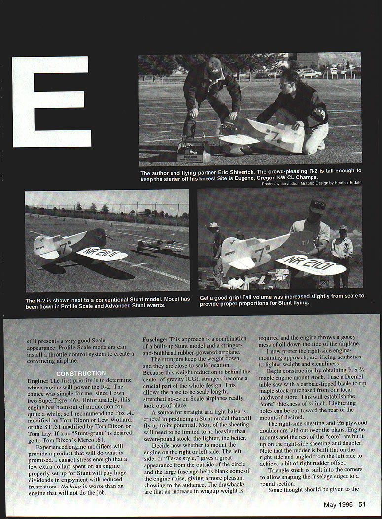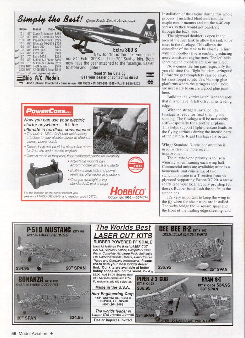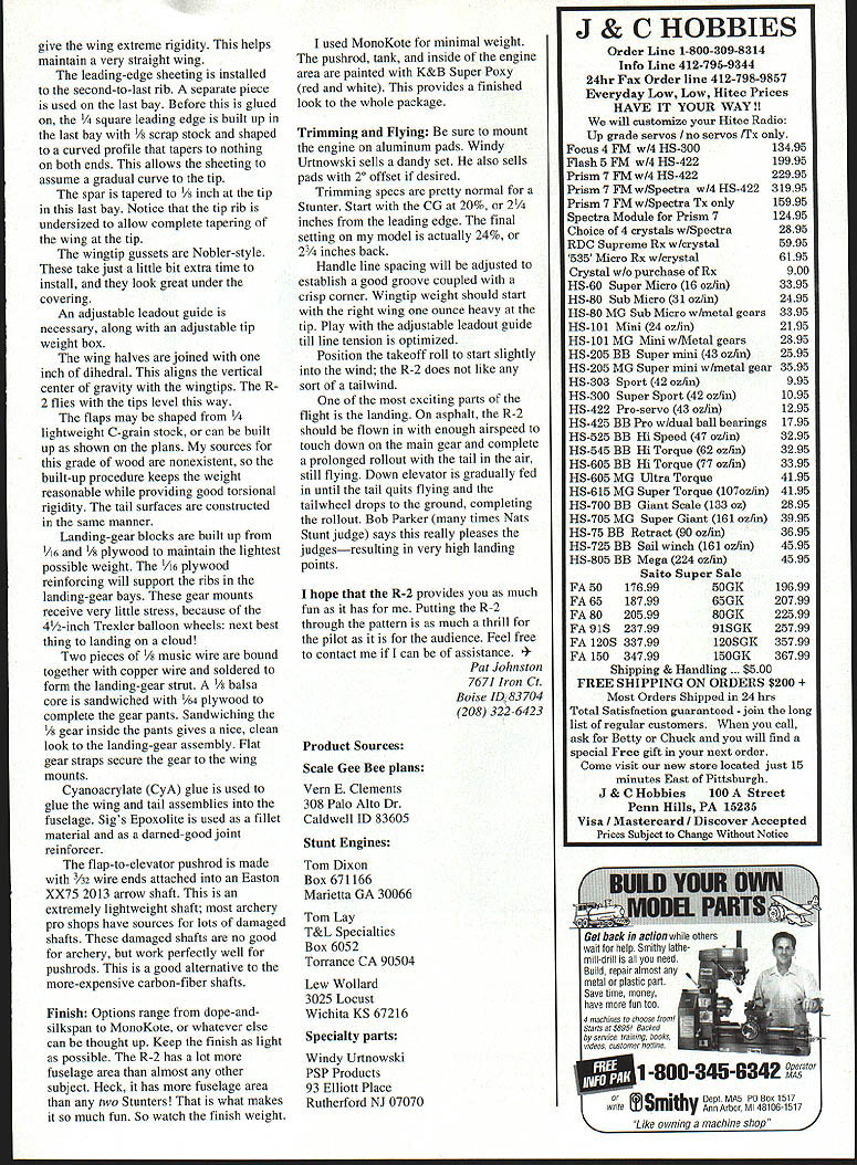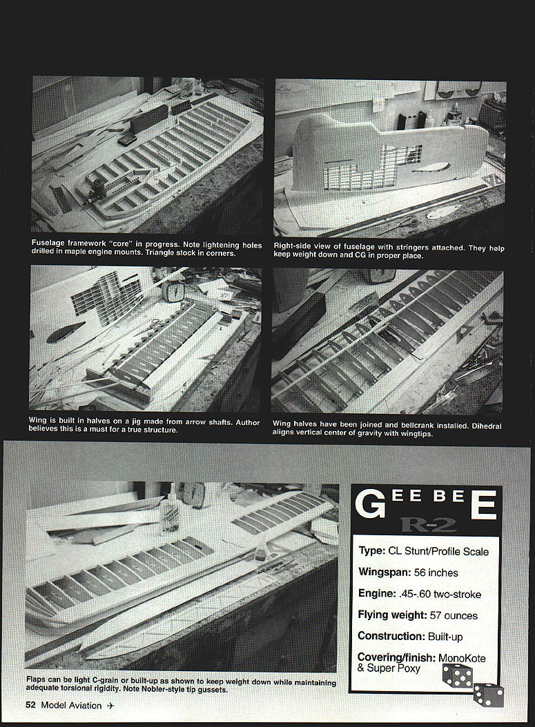 50 Model Aviation engine tnat will oo e jobare increase wingtl round section isSome thought should given May1996 51 Type CL Stunt/Profile Scale Wingspan 56 inches Engine 45-60 two-stroke Flying weight 57 ounces Construction Built-up Covering/finish AnnnKote & Super Poxy Aviation T UP STUB ANT ELEVATORS 3/B STAB TWICANESS-1/16 SKINS iTP -i/B RIRS S- -1/ASOOARESPAR 1-II-U III IIIIII IIII r 3/32 MUSIC BARESLABO BERAINO 1/B TRIANGLE CORNER STUCK 3/72 SPIN 7W STOCK 5/B B 3/A BOURBEASS LANSINU GEAR MOUNTING DETAILS 1/lA PLO BRACING WACEL PANTS ARE 1/AR PLO /SANOWICAED OVER 1/A BALSA CORES COPPER WIRE WRAP AND SODER TOPICAL FUSELAGE SECTION fi TAE FRONT OP TAE VERTICAL STAR IS OPISET TO TAE LEFT 1/A RUDDER OFFSET BOISE FLAT TA RISAT SIDE 3/22 PLO BLEIBLERS ELEVATOR 25 ENGINE AREATANK AREA FLAPS 25IEiZiIZI 1 1/A GREAT PLANES ________2013 EASTON AUMINLMOAk BABEEL ARROW SHAFT 3/32 SB STRINGERS 3/B 3/B MAPLE GEE 8FF P2 PAT JOHNSTON BA TO Dl ENGINES SO INSR IN SPAN 57 OZ BATH UTBA EIOAJPUPERBZED 2/TB/ABA RIESTAD MODEL AVL4TION SHEET T 0F2 809 1 FLSELAGE SECTION AT RUDDER fl 1 D -o i w 0 D 0 D cii 2 RIB SPACING BOTH WINGS EQUAL SPAN SEPARATE SHEETINGBUILD UP 1/4 SO LE ON LAST BAYAT LAST BAY STRIPSAND BOTTOM 1 oz ~TTNGHT INSTALL ADJUSTABLE LEADOUT GUIDE OF CHOICE TAPER SPAR IN LAST BAY 1/16 TIP 1/16 GUSSETS FILLER BLOCK 1/4 50 SPARS 1/16 LE SHEETING 7# STOCK 1/4 50 LE LANDING GEAR POSITION 4 BELLCRANK BOTTOM OF CENTER SECTION SHEETING TO HERE F7A T / 1/4 X 1/16 CAP STRIPs--------TRAILING EDGE SHEER WEBS 1/16 GRAIN VERTICAL MAIN SPAR SHEER WEBS 1/16 GRAIN VERTICAL BUILT UP FLAPS ROOT RIB TIP RIB 1/16 TE SHEETING3/B TE CAP 7# STOCK 1/16 SKINS GEE BEE P2 PAT JOHNSTON FOR 46 TO 51 ENGINES 560 50 IN56 IN SPAN 57 OZ WITH 5T46 #77#A 2385 /7/77777/AJ 89901112 MODEL AVIATION COMPUTERIZED 2/16/96 RWPRIESTADSHEET 2 0F2 8092 Cu 0 0 CD 612 0 ow can use electric starter anywhere ultimate cordless convenience built-in 1214 12Ah lead-acid battery attaches electric starter eliminate clumsy power cords Dependable unit provides clutter-free starts 2-stroke 4-stroke engines Case made fuelproof fiber-reinforced plastic durability Adjustable mounts can accommodate almost starter Built-in charge lack power terminals offer recharging options Charges overnight using standard AC wall charger location dealer nearest please call 1 -800-682-8948 mention code #047C HOBBCOa Copynght 1995 3074174 installation engine during whole process installed blind nuts maple motor mounts cut 4-40 cap screws would penetrate through back side plywood doubler open area fuel tank allow tank inset fuselage allows centerline tank closely line needle-valve assembly producing consistent engine runs left-side sheeting doublers now installed Now comes fun part especially old-time free flight builders stringers Before get completely carried away lets forget add is strip glue platforms stringers end necessary ensure good glue joint Build up vertical stabilizer note have Y8 left offset its leading edge stringers installed fuselage ready final shaping sanding fuselage will noticeably stiffespecially profile airplane helps support flight-pressure loads flying surfaces during intense parts pattern Rigid fuselages fly better Wing Standard D-tube construction used some recent improvements number-one priority use wing jig framing wing half Commercial units available homemade unit consisting two stanchions made T section 3/ plywood supporting Easton X7 2014 arrow shafts see local archery pro shop Rubber bands lash shafts stanchions Its very important keep wing jig shear webs installed webs bridge re spars front trailing edge sheeting Worlds Best LASER CUT KITS RUBBER POWERED FF SCALE ldt features finest LASER CUT BALSA Contest Rubber Corrputer Drawn Plans Corrlete Hardware PacA AuthentIc Full Color Watersllde Decals Real Colored TIssue Corrplete InstructIons Pleas check local hobby dealer first kits avaIlable better hobby shops around world Catalog $900 Add $400 shipping kit Overseas orders add 20% FL residents add 6% sales tax Made USA ierr Engineering Corp 1431 Chaffee Dr Suite 3 TItuevIlle FL 32780 407 264-2488 worlds leader Laser Cut model aimraft 56 Model Aviation er Inquires invited give wing extreme rigidity helps maintain very straight wing leading-edge sheeting installed second-to-last rib separate piece used last bay Before glued re leading edge built up last bay /8 scrap stock shaped curved profile tapers nothing both ends allows sheeting assume gradual curve tip spar tapered 1/ inch tip last bay Notice tip rib undersized allow complete tapering wing tip wingtip gussets Nobler-style take just little bit extra time install look great under covering An adjustable leadout guide necessary along adjustable tip weight box wing halves joined inch dihedral aligns vertical center gravity wingtips R 2 flies tips level way flaps may shaped lightweight C-grain stock can built up shown plans sources grade wood nonexistent built-up procedure keeps weight reasonable providing good torsional rigidity tail surfaces constructed same manner Landing-gear blocks built up 46 1/8 plywood maintain lightest possible weight /16 plywood reinforcing will support ribs landing-gear bays gear mounts receive very little stress because 41/2-lnch Trexler balloon wheels next best thing landing cloud Two pieces /8 music wire bound together copper wire soldered form landing-gear strut 1/g balsa core sandwiched 1/54 plywood complete gear pants Sandwiching 1/8 gear inside pants gives nice clean look landing-gear assembly Flat gear straps secure gear wing mounts Cyanoacrylate CyA glue used glue wing tail assemblies fuselage Sigs Epoxolite used fillet material darned-good joint reinforcer flap-to-elevator pushrod made /32 wire ends attached Easton XX75 2013 arrow shaft extremely lightweight shaft archery pro shops have sources lots damaged shafts damaged shafts no good archery work perfectly well pushrods good alternative more-expensive carbon-fiber shafts Finish Options range dope-and silkspa