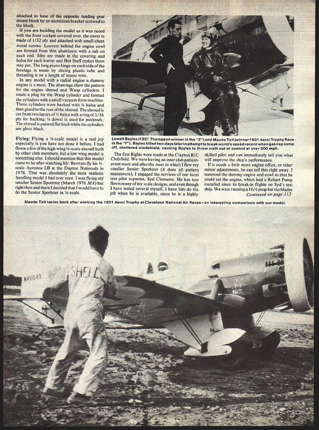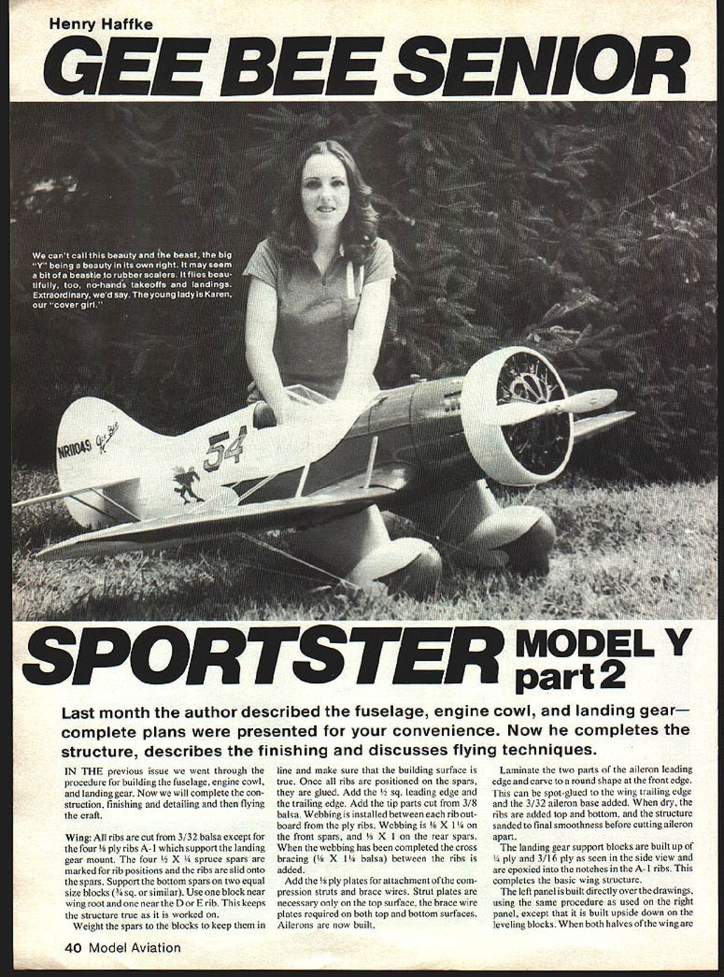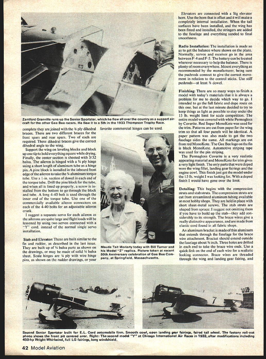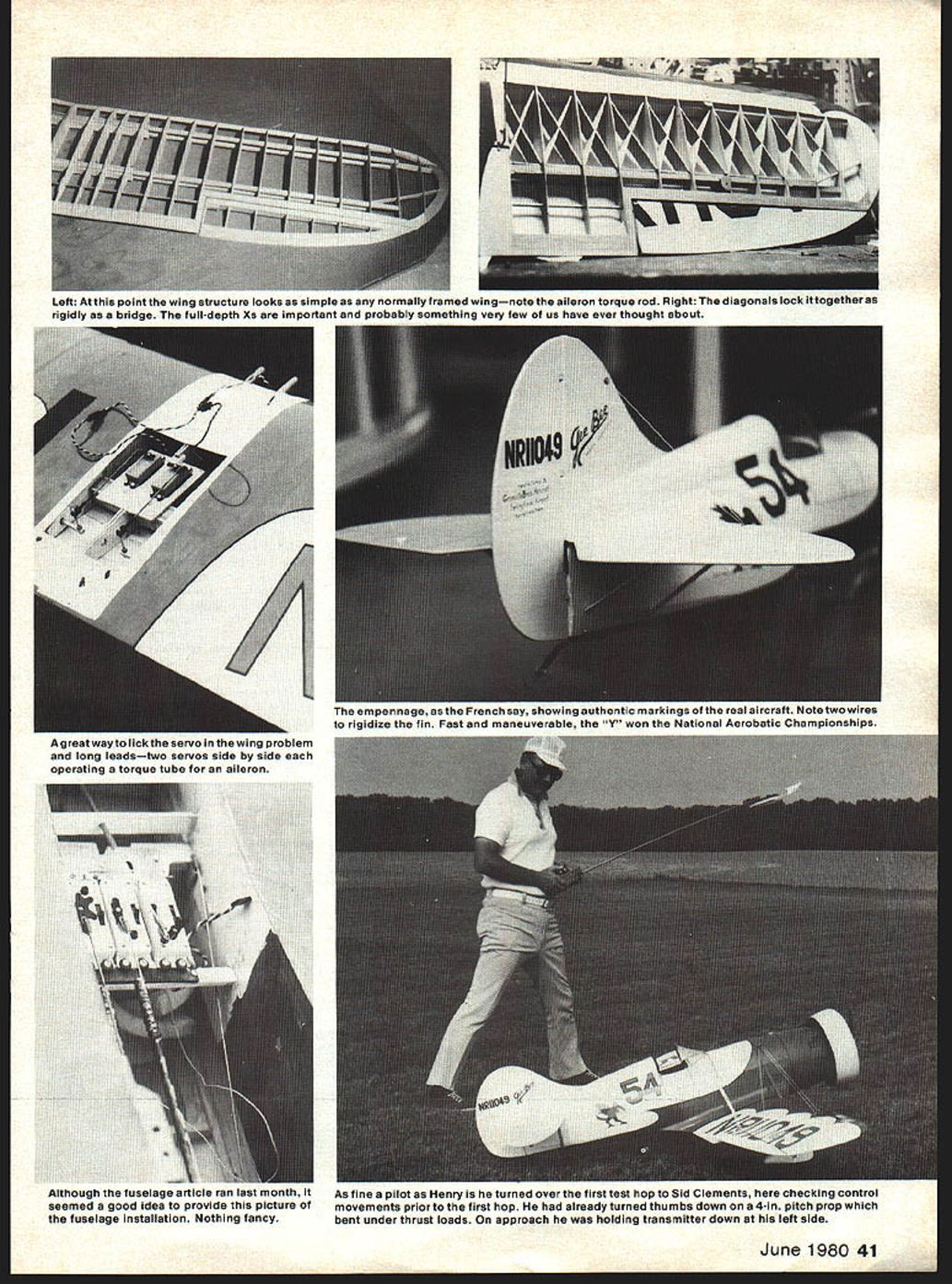 Henry Haffke GEE BEE SENIOR SPOR MODEL Y part2 Last month author described fuselage engine cowl landing gear complete plans presented convenience Now completes structure describes finishing discusses flying techniques IN THE previous issue went through procedure building fuselage engine cowl landing gear Now will complete con struction finishing detailing flying craft Wing ribs cut 3/32 balsa except four 1/ ply ribs A-i support landing gear mount four pruce spars marked rib positions ribs slid onto spars Support bottom spars two equal size blocks imilar Use block near wing root near D E rib keeps structure true worked Weight spars blocks keep line make sure building surface true Once ribs positioned spars glued Add eading edge trailing edge Add tip parts cut 3/8 balsa Webbing installed between rib Out board ply ribs Webbing front spars rear spars webbing has completed cross bracing balsa between ribs added Add plates attachment com pression struts brace wires Strut plates necessary top surface brace wire plates required both top bottom surfaces Ailerons now built Laminate two parts aileron leading edge carve round shape front edge can spot-glued wing trailing edge 3/32 aileron base added dry ribs added top bottom structure sanded final smoothness before cutting aileron apart landing gear support blocks built up ply 3/16 ply seen side view epoxied notches A- 1 ribs completes basic wing structure left panel built directly over drawings using same procedure used right panel except built upside down leveling blocks both halves wing 40 Model Aviation June 1980 41 Left point wing structure looks simple normally framed wingnote aileron torque rod Right diagonals lock ittogetheras rigidly bridge fuH-depth Xs important probably something very few us have ever thought about 7 Agreatwayto lickthe servo wing problem long leadstwo servos side side operating torque tube aileron empennage French say showing authentic markings real aircraft Note two wires rigidize fin Fast maneuverable Y won National Aerobatic Championships ixnougn ruseiage articie ran asi muniri seemed good idea provide picture fuselage installation Nothing fancy As tine pilot Henry turned over first test hop Sid Clements checking control movements prior first hop already turned thumbs down 4in pitch prop bent under thrust loads approach holding transmitter down left side complete joined dihedral braces two different braces front spars rear spars Two required dihedral braces give correct dihedral angle wing Support wing leveling blocks block up tip hold everything square drying Finally center section sheeted 3/32 balsa aileron hinged hinge using short length aluminum tube hinge pin pine block installed inboard front edge aileron take inum torque tube Use 1-in section dowel end torque tube Drill pine block tube lined up properly screw stalled bottom go through block tube long 4-40 bolt used through inner end torque tube Use commercially available aileron connectors 4-40 bolts adjustable aileron crank suggest separate servo aileron ailerons quite large flight loads will lessened using two servos connected Y cord instead normal single servo installation Stab Elevator built similar fin rudder described last issue built up a parts shown drawings may made solid a sheet Scale hinges wire hinge pins shown rudder drawings favorite commercial hinges can used Elevators connected Sig elevator horn Use horn offset will make completely internal installation tail surfaces have installed wing has fitted installed stringers added fuselage everything sanded final smoothness Radio Installation installation made get balance shown plans Normally servos receiver go area between F-4 F-5 battery can located wherever necessary help balance plenty room everywhere Mount everything recommended manufacturer being sure pushrods connect give correct move ment relation control sticks Use stiff pushrodsat least Yi dowel Finishing There ways finish model todays materials always problem decide way go intended go full fabric dope route last minute decided try keep things light possible stay under 15 lb weight limit scale competition entire model covered white Permagloss Coverite Red Super MonoKote used trim Patterns cut paper wing trim four panels will identical paper pattern also made get two fuselage sides same markings cut red MonoKote Gee Bee logo fin black MonoKote Automotive striping tape used pin striping Permagloss Coverite very realistic appearing material MonoKote trim gives very light finish parts doped wing fillet landing gear fairings engine cowl finish just got model under 15 lb weight looking doped finish would have gone over limit Detailing This begins compression struts stab struts compression struts cut streamlined aluminum tubing available hobby shops held place short sheet-metal screws stab struts shaped spruce suggest omitting have build up stabthey add con siderably its strength brace wires give really distinctive appearance made elastic cord found fabric shops An aluminum bracket made thin aluminum extends through fuselage brace wire attachment Bracket should extend outside fuselage about 3/ inch Three holes drilled end take brace wire ends Use quick-link end wire realistic looking connector Brace wires threaded through wing landing gear fairing 42 Model Aviation zantiora tiranvilIe runs up tne Senior Sporisser flew overthe country support air craft other Gee Bee racers flew 5th 1933 Thompson Trophy Race Maude Tait Moriarty today Bill Turner Model Z replica Picture taken recent 50th Anniversary celebration Gee Bee Com pany Springfield Massachusetts Second Senior Sportster built EL Cord automobile firm Smooth cowl open landing gear fairings faired tail wheel factory roll-out photo shows front pit covered over Right second model WY Chicago International Air Races 1933 after modifications including 450-hp Wright Whirlwind full LG fairings long windshield -A - bad base eppasiw leading gear Oui1t block aluminum bracket screwed block building model raced