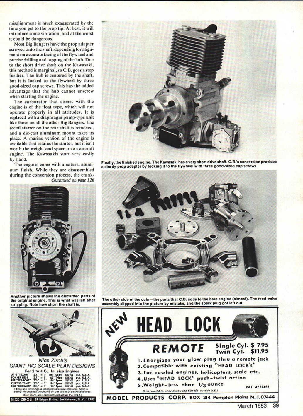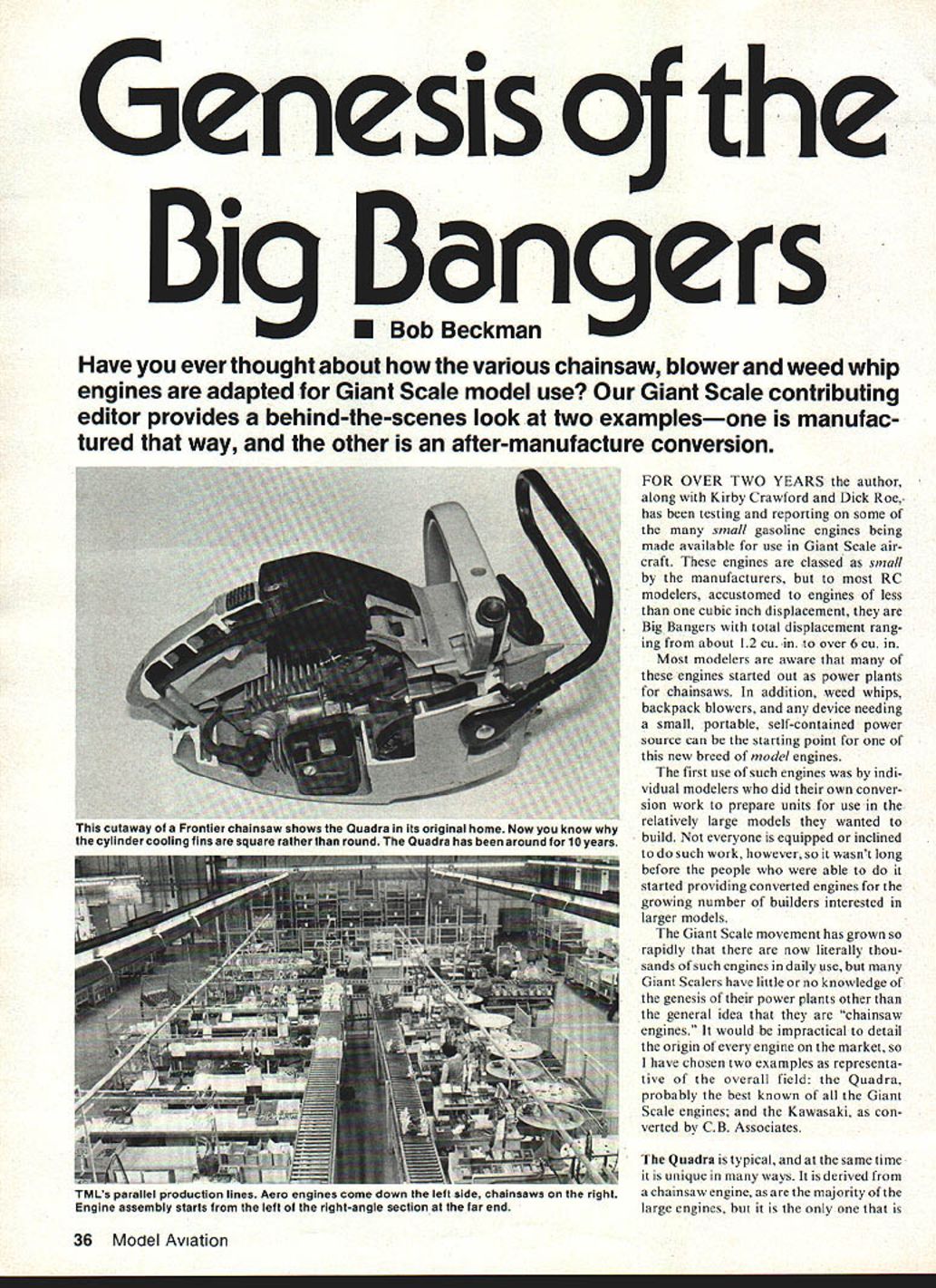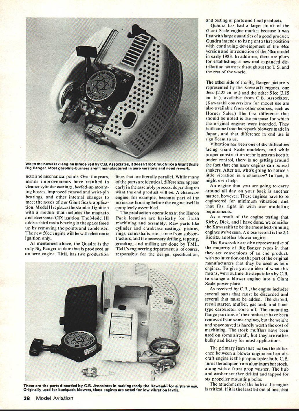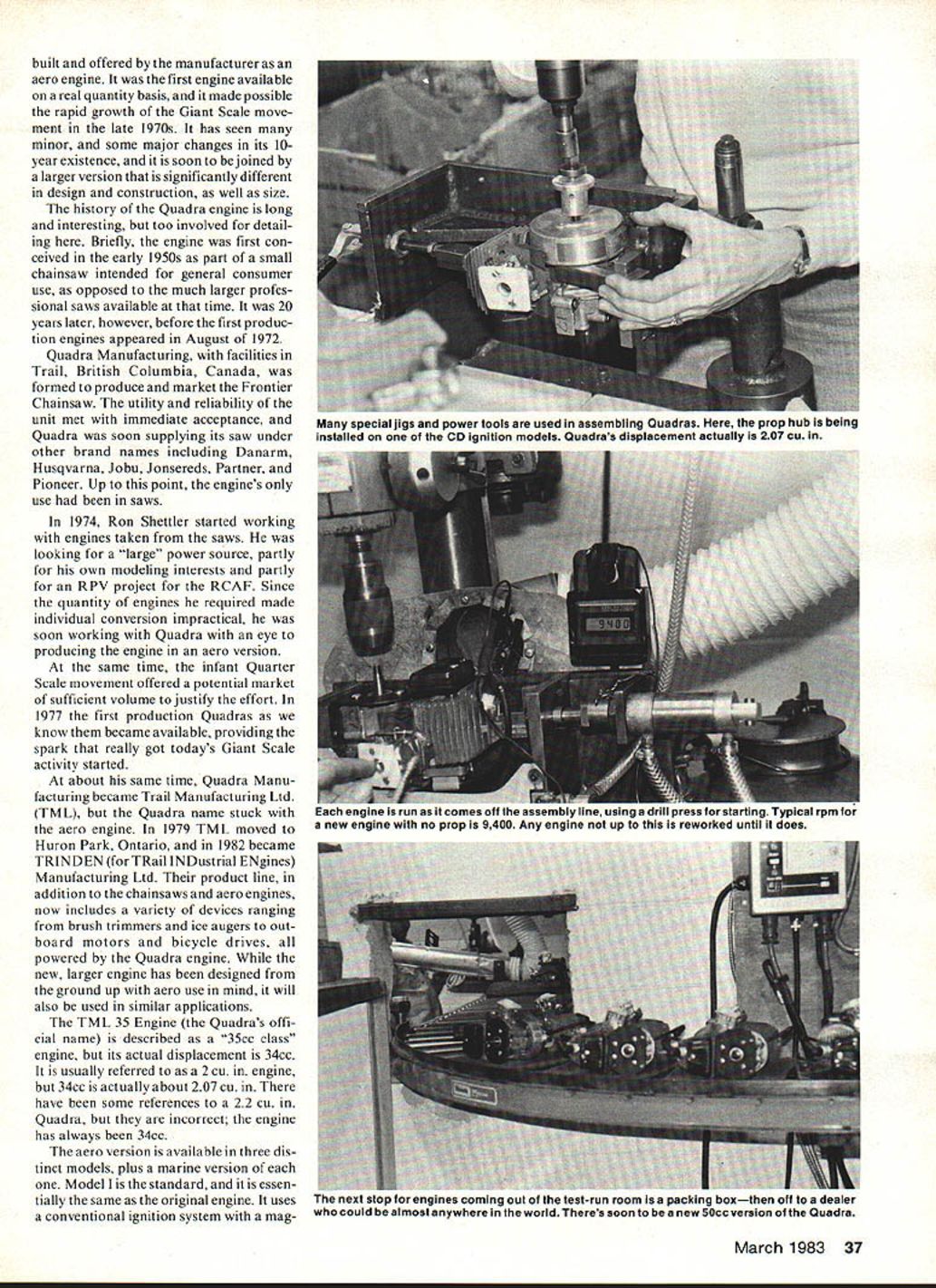 Genesis o Big Bangers Bob Beckman Have ever thought about various chainsaw blower weed whip engines adapted Giant Scale model use Giant Scale contributing editor provides behind-the-scenes look two examplesone manufac tured way other after-manufacture conversion FOR OVER TWO YEARS author along Kirby Crawford Dick Roe has testing reporting some small gasoline engines being made available use Giant Scale air craft engines classed small manufacturers RC modelers accustomed engines less cubic inch displacement Big Bangers total displacement rang ing about 12 cu over 6 cu Most modelers aware engines started out power plants chainsaws addition weed whips backpack blowers device needing small portable self-contained power source can starting point new breed model engines first use such engines indi vidual modelers did own conver sion work prepare units use relatively large models wanted build everyone equipped inclined such work however soit wasnt long before people able started providing converted engines growing number builders interested larger models Giant Scale movement has grown rapidly now literally thou sands such engines daily use hut Giant Scalers have little no knowledge genesis power plants other general idea chainsaw engines would impractical detail origin engine market have chosen two examples representa tive overall field Quadra probably best known Giant Scale engines Kawasaki con verted CB Associates Quadra typical same time unique ways derived chainsaw engine majority large engines 36 Model Aviation cutaway Frontier chainsaw shows Quadra its original home Now know cylinder cooling fins square rather round Quadra has around 10 years TMLs parallel production lines Aero engines come oown ien mae cnainsaws rigni Engine assembly starts left right-angle section far end built offered manufacturer aero engine first engine available real quantity basis made possible rapid growth Giant Scale move ment late 1970s has seen minor some major changes its 10year existence soon bejoined larger version significantly different design construction well size history Quadra engine long interesting too involved detail ing Briefly engine first con ceived early 1950s part small chainsaw intended general consumer use opposed much larger profes sional saws available time 20 years later however before first produc tion engines appeared August 1972 Quadra Manufacturing facilities Trail British Columbia Canada formed produce market Frontier Chainsaw utility reliability unit met immediate acceptance Quadra soon supplying its saw under other brand names including Danarm Husqvarna Jobu Jonsereds Partner Pioneer Up point engines use saws 1974 Ron Shettler started working engines taken saws looking large power source partly own modeling interests partly RPV project RCA F Since quantity engines required made individual conversion impractical soon working Quadra eye producing engine aero version same time infant Quarter Scale movement offered potential market sufficient volume justify effort 1977 first production Quadras know became available providing spark really got todays Giant Scale activity started about same time Quadra Manu facturing became Trail Manufacturing Ltd TML Quadra name stuck aero engine 1979 TML moved Huron Park Ontario 1982 became TRIN DEN TRail INDustrial ENgines Manufacturing Ltd product line addition chainsaws aero engines now includes variety devices ranging brush trimmers ice augers out board motors bicycle drives powered Quadra engine new larger engine has designed ground up aero use mind will also used similar applications TML 35 Engine Quadras offi cial name described 35cc class engine its actual displacement 34cc usually referred 2 cu engine 34cc actually about 207 cu have some references 22 cu Quadra incorrect engine has always 34cc aero version available three dis tinct models plus marine version Model standard essen tially same original engine uses conventional ignition system mag March 1983 37 special jigs power tools used assembling uuaaras Mere tne prop flUD IS oeing installed CD ignition models Quadras displacement actually 207 cu engine run comes oft assembly line usingstarting Typical rpm tor new engine no prop 9400 Any engine up reworked until does next stop engines coming out test-run room packing boxthen off dealer could almost anywhere world Theres soon new 50cc version Quadra neto mechanical points Over years minor improvements have resulted cleaner cylinder castings beefed-up mount ing bosses improved conrod wrist-pin bearings other internal changes meet needs Giant Scale applica tion Model II replaces standard ignition module includes magneto electronic CD ignition Model III adds third main bearing space freed up removing points condenser new 50cc engine will electronic ignition As mentioned above Quadra Big Banger date produced aero engine TML has two production lines literally parallel parts identical differences appear early assembly process depending what end product will chainsaw engine example becomes part main saw housing before engine itself completely assembled production operations Huron Park location basically finish machining assembly Raw parts like cylinder crankcase castings pistons rings crankshafts etc come subcon tractors necessary drilling tapping grinding milling done TML TMLs engineering department course responsible design specification testing 01 parts final products Quadra has large chunk Giant Scale engine market because first large quantities good product Quadra intends hang onto position continuing development 34cc version introduction 50cc model early 1983 addition plans establishing new expanded dis tribution network throughout US rest world other side Big Banger picture represented Kawasaki engines 36cc 222 cu other 51cc 315 cu available CB Associates Kawasaki conversions model use also available other sources such Homer Sales first difference should noted purpose original engines intended both come backpack blowers made Japan difference end