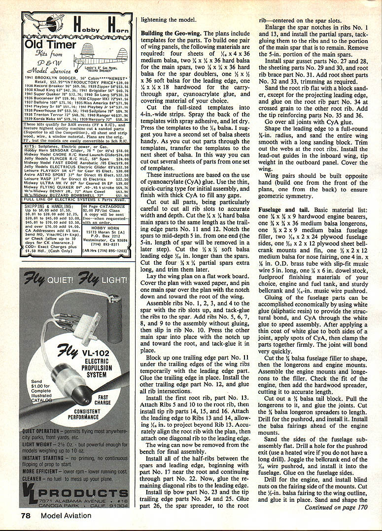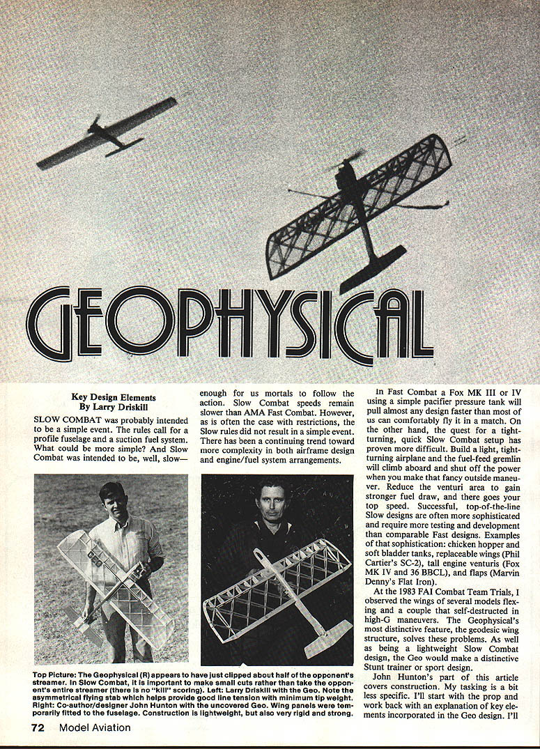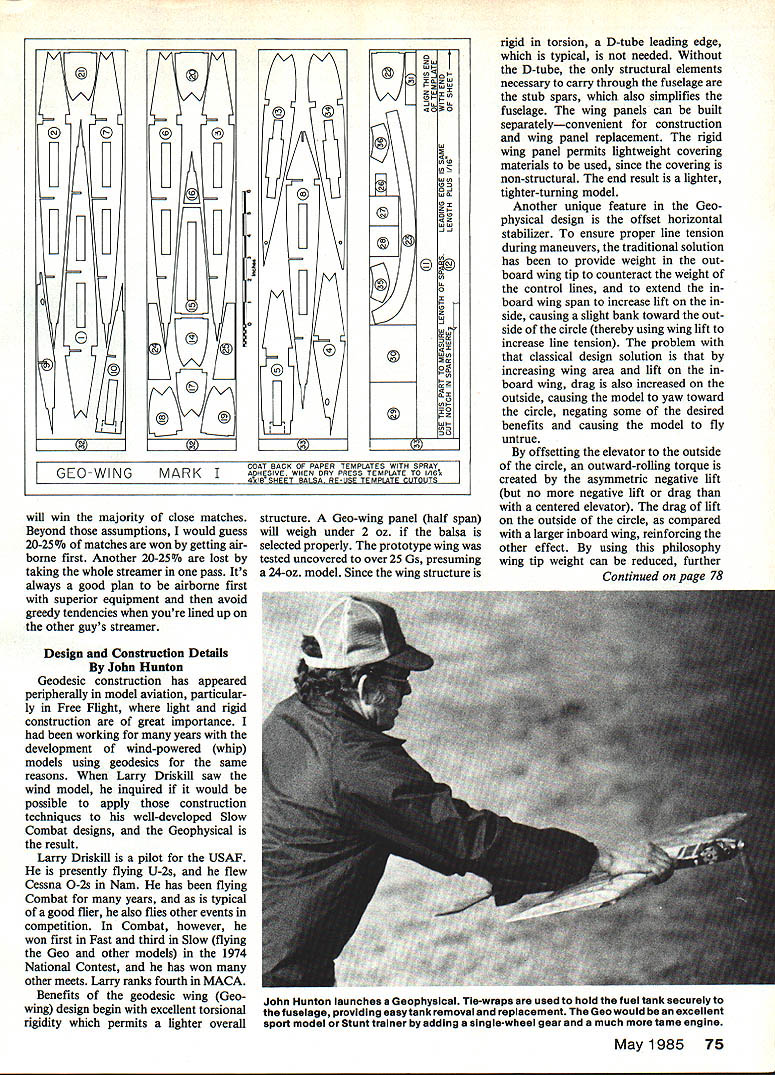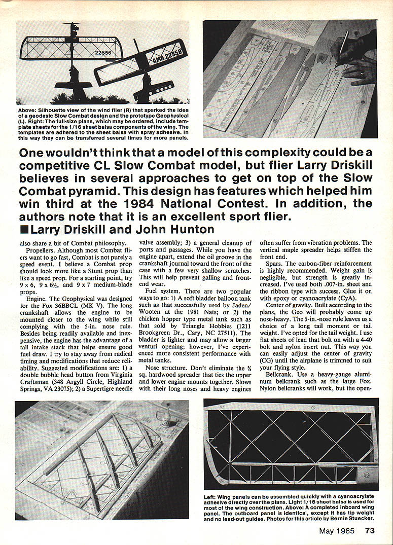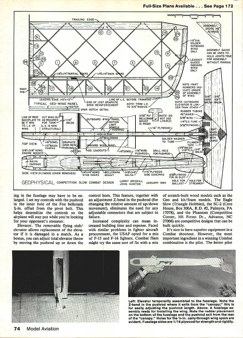 Key Design Elements Larry Driskill SLOW COMBAT probably intended simple event rules call profile fuselage suction fuel system What could simple Slow Combat intended well slow enough us mortals follow action Slow Combat speeds remain slower AMA Fast Combat However often case restrictions Slow rules did result simple event has continuing trend toward complexity both airframe design engine/fuel system arrangements Fast Combat Fox MK III IV using simple pacifier pressure tank will pull almost design faster us can comfortably fly match other hand quest tightturning quick Slow Combat setup has proven difficult Build light tightturning airplane fuel-feed gremlin will climb aboard shut off power make fancy outside maneu ver Reduce venturi area gain stronger fuel draw goes top speed Successful top-of-the-line Slow designs often sophisticated require testing development comparable Fast designs Examples sophistication chicken hopper soft bladder tanks replaceable wings Phil Cartiers SC-2 tall engine venturis Fox MK IV 36 BBCL flaps Marvin Dennys Flat Iron 1983 FAI Combat Team Trials observed wings several models flex ing couple self-destructed high-G maneuvers Geophysicals distinctive feature geodesic wing structure solves problems As well being lightweight Slow Combat design Geo would make distinctive Stunt trainer sport design John Huntons part article covers construction tasking bit less specific Ill start prop work back explanation key ele ments incorporated Geo design Ill 72 Model Aviation Top Picture Geophysical R appears have just clipped about half opponents streamer Slow Combat important make small cuts rather take oppon ents entire streamer no kill scoring Left Larry Driskill Oco Note asymmetrical flying stab helps provide good line tension minimum tip weight Right Co-author/designer John Hunton uncovered Geo Wing panels tem porarily fitted fuselage Construction lightweight also very rigid strong lxi 4 Above Silhouette view wind flier R sparked idea geodesic Slow Combat design prototype Geophysical L Right full-size plans may ordered Include tem plate sheets 1/16 sheet baisa components wing templates adhered sheet balsa spray adhesive way can transferred several times panels wouldnt think model complexity could competitive CL Slow Combat model flier Larry Driskill believes several approaches get top Slow Combat pyramid design has features helped him win third 1984 National Contest addition authors note excellent sport flier U Larry Driskill John Hunton also share bit Combat philosophy Propellers Although Combat fli ers want go fast Combat purely speed event believe Combat prop should look like Stunt prop like speed prop starting point try 9 x 6 9 x 6A 9 x 7 medium-blade props Engine Geophysical designed Fox 36BBCL MK V long crankshaft allows engine mounted closer wing still complying 5-in nose rule Besides being readily available inex pensive engine has advantage tall intake stack helps ensure good fuel draw try stay away radical timing modifications reduce reli ability Suggested modifications 1 double bubble head button Virginia Craftsman 348 Argyll Circle Highland Springs VA 23075 2 Supertigre needle valve assembly 3 general cleanup ports passages have engine apart extend oil groove crankshaft journal toward front case few very shallow scratches will help prevent galling frontend wear Fuel system two popular ways go 1 soft bladder balloon tank such successfully used Jaden Wooten 1981 Nats 2 chicken hopper type metal tank such sold Triangle Hobbies 1211 Brookgreen Dr Cary NC 27511 bladder lighter may allow larger venturi opening however Ive experi enced consistent performance metal tanks Nose structure Dont eliminate Y1 sq hardwood spreader ties upper lower engine mounts together Slows long noses heavy engines often suffer vibration problems vertical maple spreader helps stiffen front end Spars carbon-fiber reinforcement highly recommended Weight gain negligible strength greatly creased Ive used both 007-in sheet ribbon type success Glue epoxy cyanoacrylate CyA Center gravity Built according plans Geo will probably come up nose-heavy 5-in-nose rule leaves us choice long tail moment tall weight Ive opted tall weight use flat sheets lead bolt 4-40 bolt nylon insert nut way can easily adjust center gravity CG until airplane trimmed suit flying style Bellcrank Use heavy-gauge alumi num bellcrank such large Fox Nylon bellcranks will work openMay1985 73 Left Wing panels can assembled quickly cyanoacrylate adhesive directly over plans Light 1/16 sheet balsa used wing construction Above completed inboard wing panel outboard panel identical except has tip weight no lead-out guides Photos article Bernie Stuecker Full-Size Plans Available. See Page 172 TRAILING EDGE-N --___ mzZILZ7 j-l/BxI/4PARTIALAS /I/4xI/4MAIN SS 27 LEADING EDGE /2 I/2~ TYPICAL GEO-WINS PANEL LINE OF LE BEFORE TRIMMING -END DF007 GRAPHITE NOTE-TRIM LE SPAR REINFORCEMENTTO 3/B RADIUS SPAR NOTCH DETAIL_ PLY V21 NOTE- DO BELLCRAN Ifj NOT USE MOUNTLITEPLY 12 REOD LINE OF PROP CUT WING OU BACKPLATE TO AS REQUIREDOUTBOARD WINPANEL BE 5 MINFOR TANKBALSAMOTION TO LE OFLE IS NONLIMIT WINGISTRUCTURAL 1/16 PLYW 0007 / I/8DIA SOLDER OUTBOARD WING ONLY 9 LEADOUT #GUIDES 4INBOARD WING ONLY 23I NOTE- PART NUMBERS ND ICATE ORDER 35 OF ASSEMBLY OF WING 36 NOTE- OUTBOARD ELEVATOR IS LON GER THAN OTHERA RUBBER TUBING RET I/B QD TUBE - 3/32PLY~ ASSEMBLY GAUGE CAN BE USED TO HOLD JOINTS TRUE FOR ASSEMBLY WITHOUT PINNING 1 ji1 AL j BAtS I - -- ---- -I~RNI Lr9ASOLDER WASHER TOP VIEWI/8DOWELGRAPHITEI TUBEFILAMENT I/2BALSASPAR REINIIOARD WINIIANEL FAIRINGFOR HOLE FOR HOLE FOR GEOPHYSICAL COMPETITION SLOW COMBAT DESIGNLARRY DRISKILL JANUARY 19B4BALLASTSTREAMER JOHN HUNTON ing fuselage may have en larged Set controls pushrod inner hole Fox bellcrank %-in offset pivot bolt helps desensitize controls airplane will stay put youre looking opponents streamer Elevator removable flying stab/ elevator allows replacement eleva tor damaged match As bonus can adjust