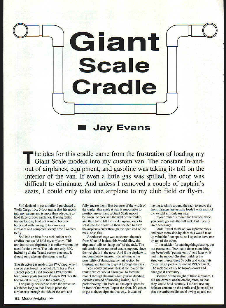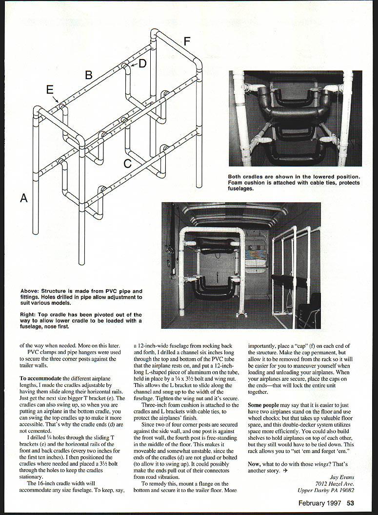OIIE7L Giant KScale Cradle 0 J - K U Jay Evans idea cradle came frustration loading Giant Scale models custom van constant in-andout airplanes equipment gasoline taking its toll interior van little gas spilled odor difficult eliminate unless removed couple captains seats could take airplane club field fly-in So decided get trailer purchased Wells Cargo lOx 5-foot trailer fits nicely garage adequate hold three four airplanes Having rented trailers before did want become burdened having tie down airplanes equipment time wanted fly So idea rack holder cradles would hold airplanes unit holds two airplanes trailer need tie-downs unit cost $60 including Ts corner brackets should take afternoon make structure made PVC pipe can purchased about $275 1 /2 X 10-foot piece used two-inch PVC four corner posts 1 /2-inch PVC horizontal rails b cradles c originally decided make structure 80 inches long could place airplanes through side unit fully encase because width trailer made nearly impossible position myself Giant Scale model between rack wail trailer try lift model up over set cradles decided have airplanes enter through open end rack nose first Another change shorten rack 80 48 inches would ailow airplanes tails hang out rack tail section does need cradle support since weight nose airplane completely encased eliminate possibility damaging tail section twisting turning get through rack could put rack rear trailer would allow feed model through unit youre standing outside instead kneeling inside prefer having front open space front open door Its easier get equipment way instead having climb around rack get front Trailers usually loaded weight front anyway trailer five feet wide could go full rack really isnt necessary didnt want make two separate racks have side-by-side would take up valuable floor space opted have top other Im stickler making things strong permanent Too times something has built permanently later moved So after building structure used three s wing nuts secure joints instead PVC cement rack can easily broken down changed necessary Because weight airplanes did use cement cradle joints would hold securely did use bolts cement cradle end joints d entire cradle could swing up out 52 Model Aviation e Structure made PVC pipe fittings Holes drilled pipe allow adjustment suit various models Right Top cradle has pivoted out way allow lower cradle loaded fuselage nose first of the way needed later PVC clamps pipe hangers used secure three corner posts against trailer walls acconunodate different airplane lengths made cradles adjustable having slide aiong horizontal rails Just get next size bigger T bracket e cradles can also swing up putting airplane bottom cradle can swing top cradles up make accessible Thats cradle ends d cemented drilled s through sliding T brackets e horizontal rails front back cradles two inches first ten inches positioned cradles needed placed 3/2 bolt through holes keep cradles stationary 16-inch cradle width will accommodate size fuselage keep say 12-inch-wide fuselage rocking back forth drilled channel six inches long through top bottom PVC tube airplane rests put 12-inchlong L-shaped piece aluminum tube held place Y2 bolt wing nut allows L bracket slide along channel snug up width fuselage Tighten wing nut its secure Three-inch foam cushion attached cradles L brackets cable ties protect airplanes flaish Since two four corner posts secured against side wall post against front wall fourth post free-standing middle floor makes moveable somewhat unstable since ends cradles d glued bolted allow swing up could possibly make ends pull out connectors road vibration remedy mount flange bottom secure trailer floor importantly place cap f end structure Make cap permanent allow removed rack will easier maneuver yourself loading unloading airplanes airplanes secure place caps endsthat will lock entire umt together Some people may say easier just have two airplanes stand floor use wheel chocks takes up valuable floor space double-decker system utilizes space efficiently could also build shelves hold airplanes top other still would have tied down rack allows set em forget em Now what wings Thats another story Evans 7012 Hazel Ave Upper Darby PA 19082 February 1997 53 Both cradles shown lowered position Foam cushion attached cable ties protects fuselages