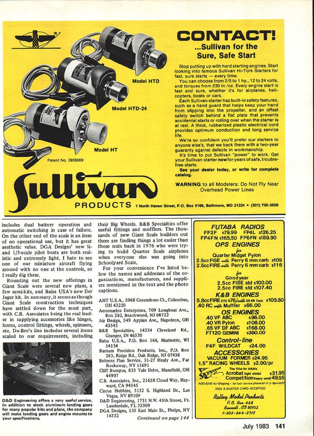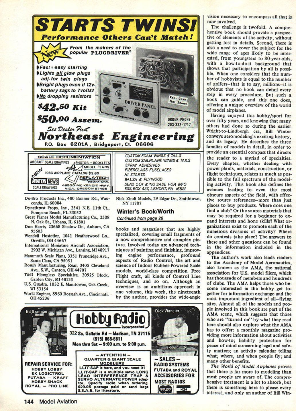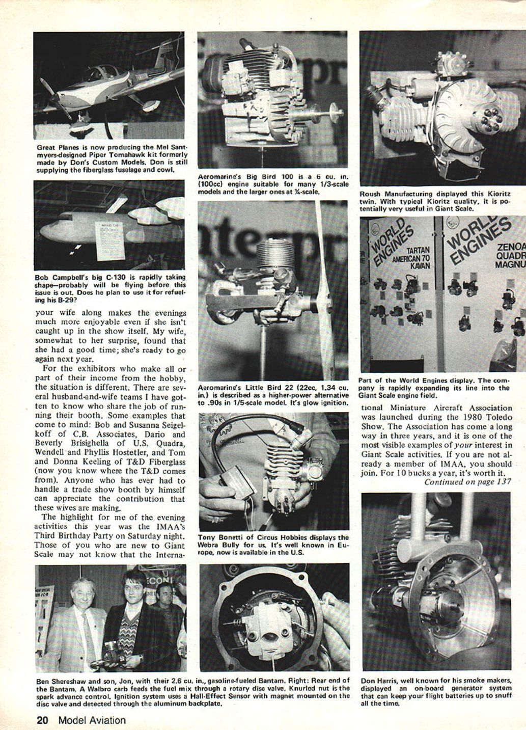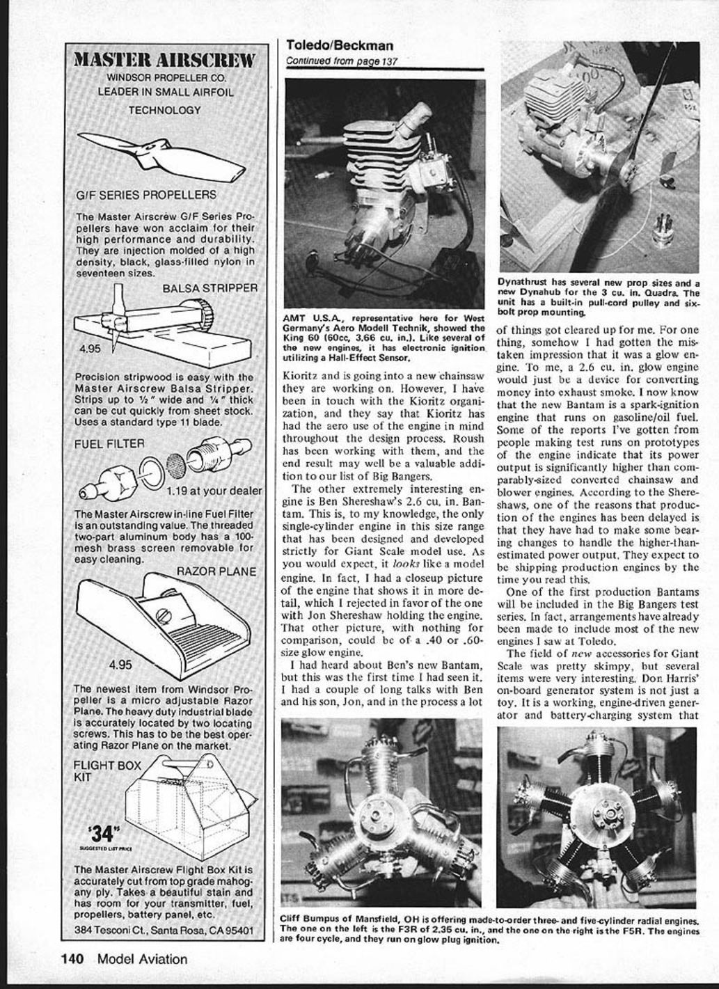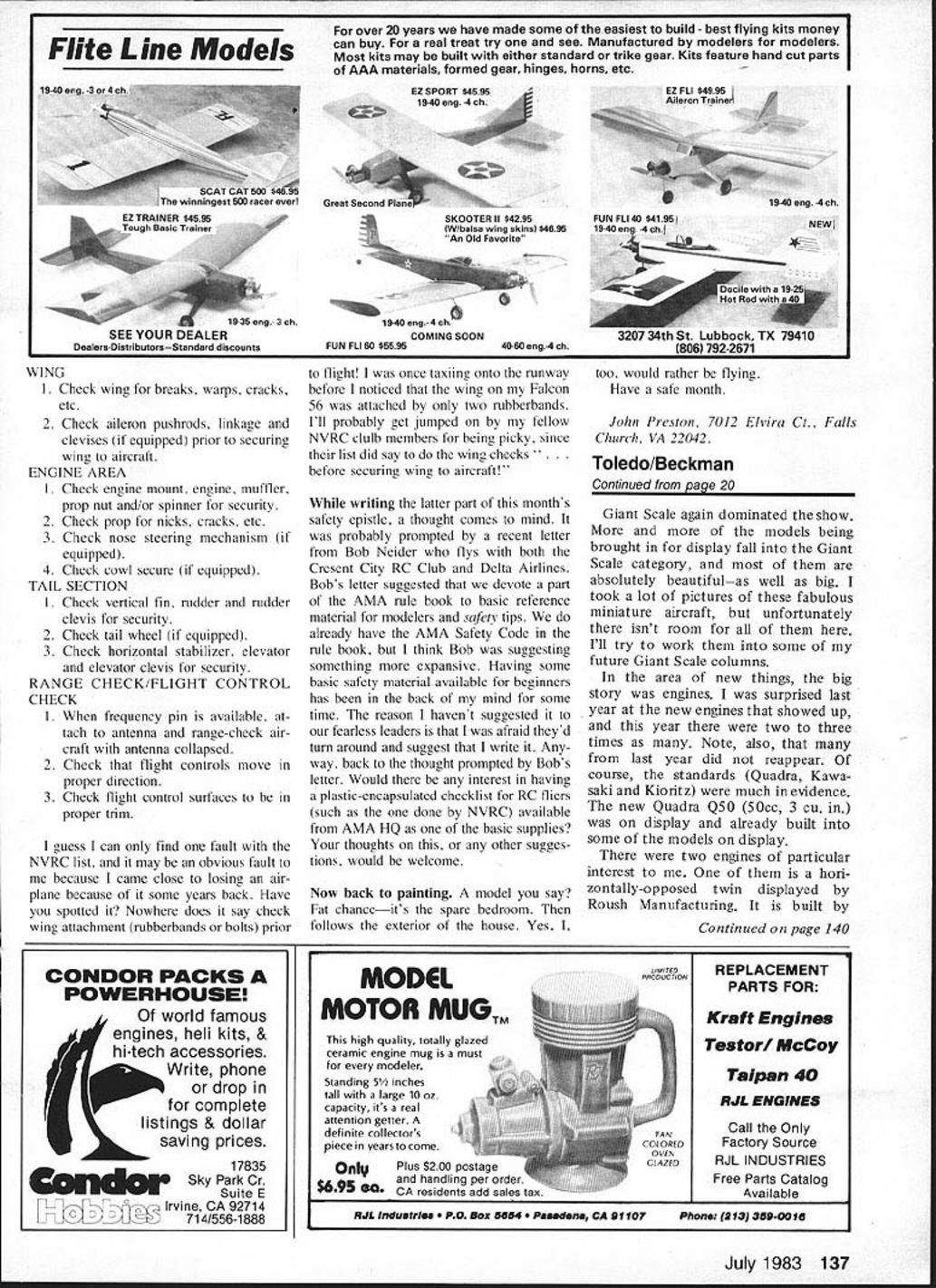 Bob Beckman Henry Haffkes Gee Bee models always impressive Senior Sportster Model V Bob Seigelkoffs beautiful 1/3-scale 35 Kawasaki-powered Shoestring Built Bob Morse plans available Mammoth Scale Plans 18 Model Aviation US Quadra booth featured Dario Brisighellas latest plan design Steen Skybolt Wendell Hostetler has come up another good plans offering Its Piper Vagabond 114-in wingspan Nick Ziroli now has tibergiass tuselage go along plans Corsair plane has balsa wing tail Beautiful CAP-21 Stan Dzon Giant Scale models display years Toledo RC Exposition THE WEAK SIGNALS SHOW Toledo particularly pleasant year first time wife Evelyn came really isnt much terested show itself fact went arena brief visit However sure nice get back motel after hard days tramping around find waiting enjoyed seeing old friends evenings got meet lot people has heard talk about over years lot wives come Toledo husbands dont see until sun goes down Lets face wives usu ally put up hobby cause like want us happy Fighting way through crowds show can drag interested youre terested torture can now testify own experience having July 1983 19 Air Designs 1/3-scale SE-5 Plans reviewed recently author Giant Scale column Balsa USAs new Der Jagergood news Giant Scale bipe lovers Jerry Behrens has producing quality plans Giant Scale designs Bob Beckman chopped off Dave Reids head concentrate DGAs several years has partial full kits well new lightweight pilot busts Theyre realistic Jerry Gardners half-size Pins quite pmject Construction closely follows original both design materials engine compartment shown right-hand picture two-cylinder engine 18-hp Limbach swings 36-12 prop Bob Campbelrs big C-iSU rapioly taking shapeprobably will flying before issue out Does plan use ref uel ing B-29 wife along makes evenings much enjoyable isnt caught up show itself wife somewhat surprise found good time shes ready go again next year exhibitors make part income hobby situation different sev eral husband-and-wife teams have got ten know share job run ning booth Some examples come mind Bob Susanna Seigel koff CB Associates Dario Beverly Brisighella US Quadra Wendell Phyllis Hostetler Tom Donna Keeling T&D Fiberglass now know T&D comes Anyone has ever handle trade show booth himself can appreciate contribution wives making highlight evening activities year IMAAs Third Birthday Party Saturday night new Giant Scale may know Interna Part World Engines display com pany rapidly expanding its line Giant Scale engine field tional Miniature Aircraft Association launched during 1980 Toledo Show Association has come long way three years visible examples interest Giant Scale activities al ready member IMAA should join 10 bucks year its worth Continued page 137 20 Model Aviation Great Planes now producing Mel Sant myers-designed Piper Tomahawk kit formerly made Dons Custom Models Don still supplying fiberglass fuselage cowl Aeromarines Big Bird 100 6 cu 100cc engine suitable 1/3-scale models larger ones /4-scale Roush Manufacturing displayed Kioritz twin typical Kioritz quality p0tentiallyverv useful Giant Scale Meromarines Little Bird 22 22cc 134 cu described higher-power alternative 90s 1/5-scale model Its glow ignition Tony Bonetti Circus Hobbies displays Webra Bully us Its well known Eu rope now available US Ben Shereshaw son Jon 26 cu gasoline-fueled Bantam Right Rear end Bantam Walbro carb feeds fuel mix through rotary disc valve Knurled nut spark advance control Ignition system uses Hall-Effect Sensor magnet mounted disc valve detected through aluminum backplate Don Harris well known smoke makers displayed on-board generator system can keep flight batteries up snuff time Flite Line Models over 20 years have made some easiest build best flying kits money can buy real treat try see Manufactured modelers modelers Most kits may built either standard trike gear Kits feature hand cut parts AAA materials formed gear hinges horns etc EZSPORT $4 1940 eng -4 EZ ILl $4996 Aileron Trainer 19-40 eng -4 oh SKOOTER II $4295 Iwlbalsa wing skins $4695 An Old Favorite 40-60 eng-4 oh FUN FLI 40 $4195NEW 19-40 en -4chl 4 19 Rod 40 3207 34th St Lubbock TX 79410 806792 2671 WING I Check wing breaks warps cracks etc 2 Check aileron pushrods linkage devises equipped prior securing wing aircraft ENGINE AREA I Check engine mount engine muffler prop nut and/or spinner security 2 Check prop nicks cracks etc 3 Check nose steering mechanism equipped 4 Check cowl secure equipped TAIL SECTION I Check vertical fin rudder rudder clevis security 2 Check tail wheel equipped 3 Check horizontal stabilizer elevator elevator clevis security RANGE CHECK/FLIGHT CONTROL CHECK I When frequency pin available tach antenna range-check air craft antenna collapsed 2 Check flight controls move proper direction 3 Check flight control surfaces proper trim guess can find fault NVRC list may obvious fault because came close losing air plane because some years back Have spotted Nowhere does say check wing attachment rubberbands bolts prior CONDOR PACKS POWERHOUSE world famous engines hell kits & Write phone hi-tech accessories NI or drop 3j complete listings& dollar saving prices 17835 Sky Park Cr WWuSuite E Irvine CA 92714 CD 71 4/556 1888 flight once taxiing onto runway before noticed wing Falcon 56 attached two rubberbands Ill probably get jumped fellow NVRC clulb members being picky since list did say wing checks before securing wing aircraft writing latter part months safety epistle thought comes mind probably prompted recent letter Bob Neider flys both Cresent City RC Club Delta Airlines Bobs letter suggested devote part AMA rule book basic reference material modelers safers- tips already have AMA Safety Code rule book think Bob suggesting something expansive Having some basic safety material available beginners has back mind some time reason havent suggested fearless leaders afraid theyd turn around suggest write Any way back thought prompted Bobs letter Would interest having plastic-encapsula