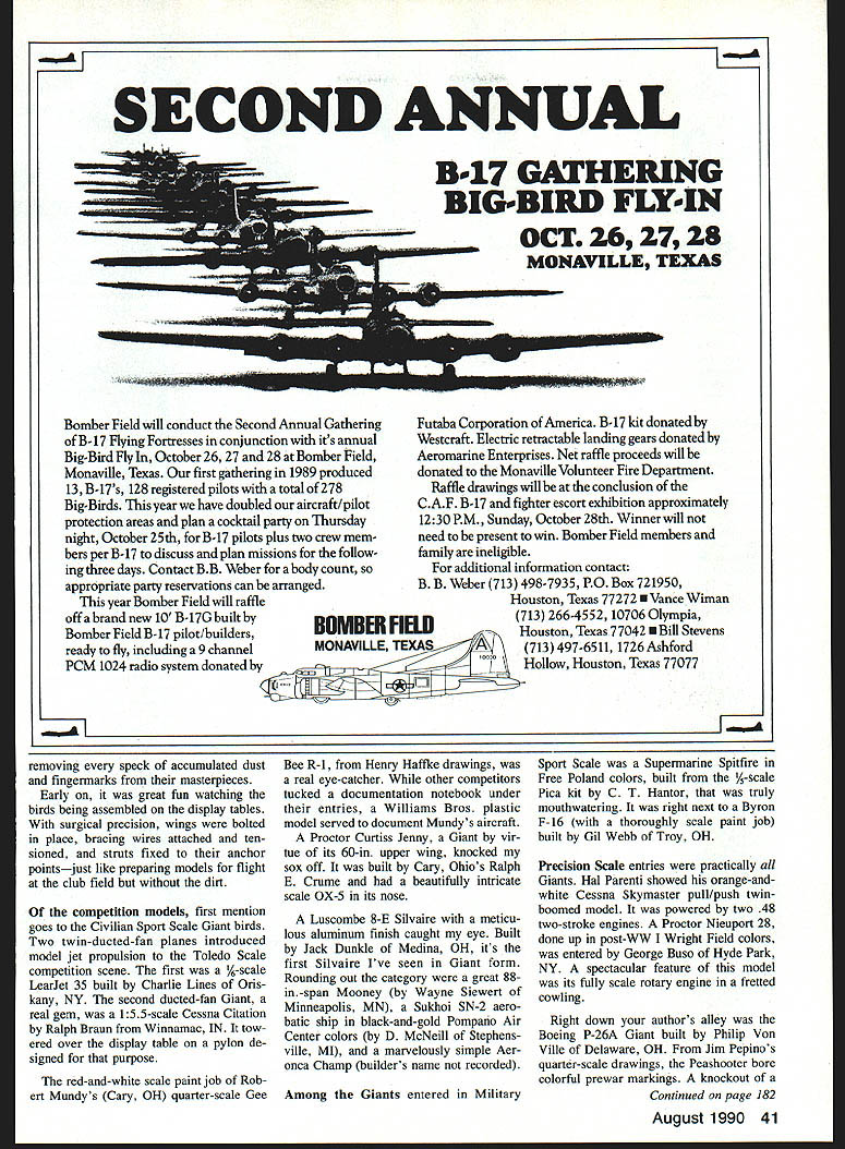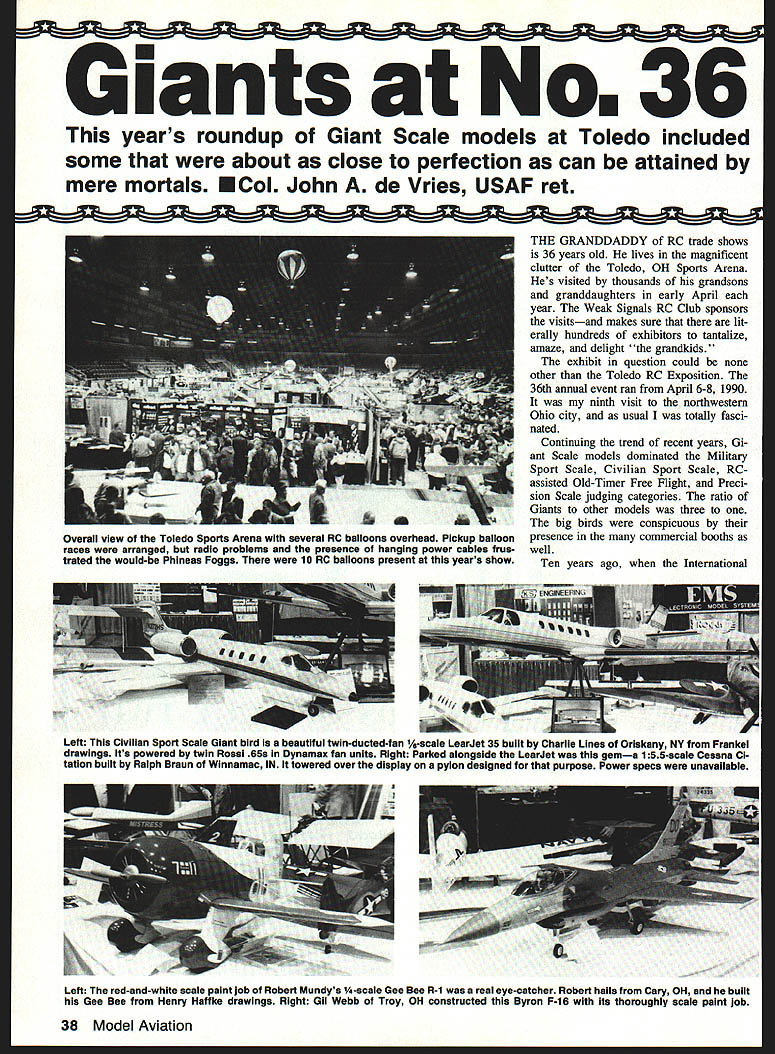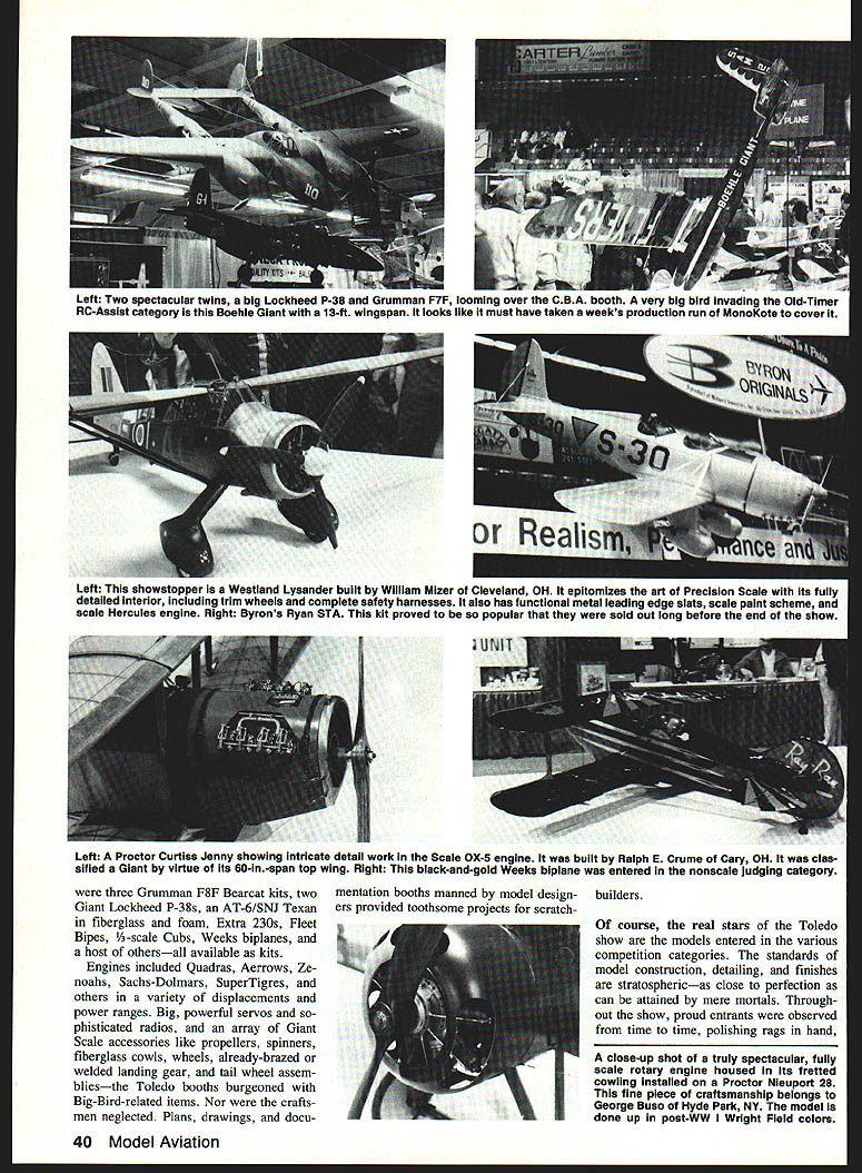 Giants o36 years roundup Giant Scale models Toledo included some about close perfection can attained mere mortals ECoI John de Vries USAF ret THE GRANDDADDY RC trade shows 36 years old lives magnificent clutter Toledo OH Sports Arena Hes visited thousands grandsons granddaughters early April year Weak Signals RC Club sponsors visitsand makes sure lit erally hundreds exhibitors tantalize amaze delight grandkids exhibit question could other Toledo RC Exposition 36th annual event ran April 6-8 1990 ninth visit northwestern Ohio city usual totally fasci nated Continuing trend recent years Gi ant Scale models dominated Military Sport Scale Civilian Sport Scale RC assisted Old-Timer Free Flight Preci sion Scale judging categories ratio Giants other models three big birds conspicuous presence commercial booths well Ten years ago International Left Civilian Sport Scale Giant bird beautiful twin-ducted-fan 1/-scale LearJet 35 buIlt Charlie Lines Oriskany NY Frankel drawings Its powered twin Rossi 658 Dynamax fan units Right Parked alongside LearJet gema 155-scale Cessna CI tation built Ralph Braun Winnamac IN towered over display pylon designed purpose Power specs unavaIlable Left red-and-white scale paint job Robert Mundys -scale Gee Bee R-1 real eye-catcher Robert hails Cary OH built Gee Bee Henry Haffke drawings Right Gil Webb Troy OH constructed Byron F-iS its thoroughly scale paint job 38 Model Aviation Overall view Toledo Sports Arena several RC balloons overhead Pickup balloon races arranged radio problems presence hanging power cables frus trated would-be Phineas Foggs 10 RC balloons present years show Left The meticulous aluminum finish beautiful 8-E Silvaire real attention-getter rare bird built Jack Dunkle dma OH Right As can seen photo prewar paint scheme thia -scale Boeing P-26A Peashooter attracted lot attention youths era striking model built Phillip Von Yule Delaware OH drawings executed Jim Pepino Left Entered Precision Scale nicely done Japanese Zero Platt kit built William Carper Jackson OH Right outstanding Supermarine Spitfire constructed CT Hantor 1A-scale Pica kit beautifully finished Free Poland colors Hal Parentis orange-and-white pull/push twin-boomed Cessna Skymaster powered two 48 two-stroke engines Right Sukhoi aerobatic ship done up black-and-gold Pompano Air Center colors pride joy D McNeill Stephensville Ml Left AHS Manufacturing displayed its SNJ/AT-6 fiberglass-and-foam kit Right Wendell Hostetlers latest Giant design Cessna 206 Miniature Airplane Association IMAA few plan sets available Suit- big birds universally available born Toledos Commodore Perry Ho- able engines hard find Giant ac- necessary bits pieces ease tel practically Giants scratch-built cessories nonexistent 1990 Kits construction flying display August 1990 39 Left Two spectacular twins big Lockheed P-38 Grumman F7F looming uvur mu DM UIJQIfl very big oird invading udd-Timer RC-Asslst category Boehie Giant 13-ft wingspan looks like must have taken weeks production run MonoKote cover Left This showstopper Westland Lysander built Wiiiiam Mizer Cleveland OH epitomizes art Precision Scale its fully detailed interior inciuding trim wheels complete safety harnesses also has functional metal leading edge slats scale paint scheme scale Hercules engine Right Byrons Ryan STA kit proved popular sold out long before end show Left A Proctor Curtiss Jenny showing intricate detail work Scaie OX-5 engine built Ralph E Crume Cary OH clas sified Giant virtue its 60-in-span top wing Right black-and-gold Weeks biplane entered nonscale judging category three Grumman F8F Bearcat kits two Giant Lockheed P-38s AT-6/SNJ Texan fiberglass foam Extra 230s Fleet Bipes -scale Cubs Weeks biplanes host othersall available kits Engines included Quadras Aerrows Ze noahs Sachs-Dolmars SuperTigres others variety displacements power ranges Big powerful servos phisticated radios array Giant Scale accessories like propellers spinners fiberglass cowls wheels already-brazed welded landing gear tail wheel assem bliesthe Toledo booths burgeoned Big-Bird-related items Nor crafts men neglected Plans drawings docu mentation booths manned model design ers provided toothsome projects scratch builders course real stars Toledo show models entered various competition categories standards model construction detailing finishes stratosphericas close perfection can attained mere mortals Through out show proud entrants observed time time polishing rags hand close-up shot truly spectacular fully scale rotary engine housed its fretted cowling installed Proctor Nieuport 28 fine piece craftsmanship belongs George Buso Hyde Park NY model done up post-WW Wright Field colors 40 Model Aviation SECOND ANNUAL Bomber Field will conduct Second Annual Gathering B- 17 Flying Fortresses conjunction its annual Big-Bird Fly October 26 27 28 Bomber Field Monaville Texas first gathering 1989 produced 13 B-17s 128 registered pilots total 278 Big-Birds year have doubled aircraft/pilot protection areas plan cocktail party Thursday night October 25th B-17 pilots pius two crew mem ben per B-17 discuss plan missions follow ing three days Contact BB Weber body count appropriate party reservations can arranged year Bomber Field will raffle off brand new 10 B-17G built Bomber Field B-17 pilot/builders ready fly including 9 channel PCM 1024 radio system donated Futaba Corporation America B-17 kit donated Westcraft Electric retractable landing gears donated Aeromarine Enterprises Net raffle proceeds will donated Monaville Volunteer Fire Department Raffle drawings will conclusion CAF B-17 fighter escort exhibition approximately 1230PM Sunday October 28th Winner will need present win Bomber Field members family ineligible additional information contact B B Weber 713 498-7935 PO Box 721950 Houston Texas 77272 U Vance Wiman 713 266-4552 10706 Olympia Houston Texas 77042 Stevens 713 497-6511 1726 Ashford Hollow Houston Texas 77077 removing speck accumulated dust fingermarks masterpieces
