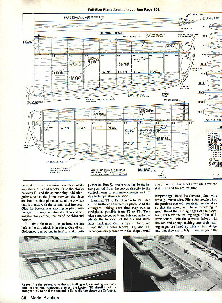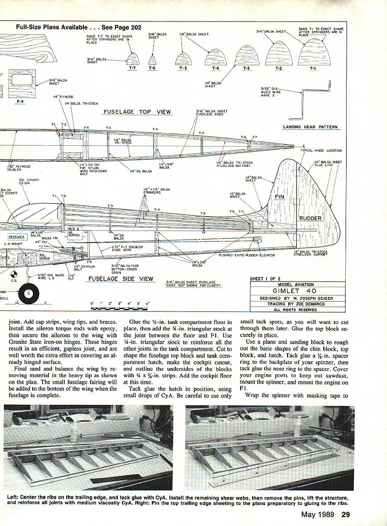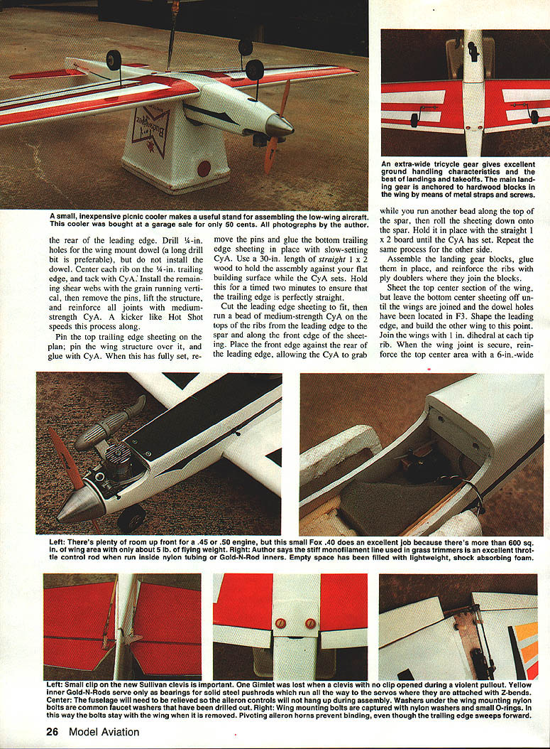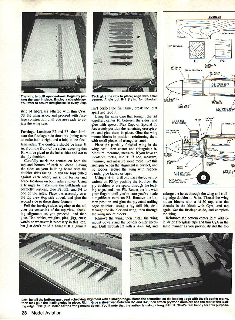 NO OCR TEXT NO OCR TEXT small inexpensive picnic cooier makes UseTul stana Tor assemiing tne low-wing aircrat cooler bought garage sale 50 cents photographs author rear leading edge Drill A-in holes wing mount dowel long drill bit preferable install dowel Center rib A-in trailing edge tack CyA Install remain ing shear webs grain running verti cal remove pins lift structure reinforce joints mediumstrength CyA kicker like Hot Shot speeds process along Pin top trailing edge sheeting plan pin wing structure over glue CyA has fully set re move pins glue bottom trailing edge sheeting place slow-setting CyA Use 30-in length straight 1 x 2 wood hold assembly against flat building surface CyA sets Hold timed two minutes ensure trailing edge perfectly straight Cut leading edge sheeting fit run bead medium-strength CyA tops ribs leading edge spar along front edge sheet ing Place front edge against rear leading edge allowing CyA grab An extra-wide tricycle gear gives excellent ground handling characteristics best landings takeoffs main land ing gear anchored hardwood blocks wing means metal straps screws run another bead along top spar roll sheeting down onto spar Hold place straight 1 x 2 board until CyA has set Repeat same process other side Assemble landing gear blocks glue place reinforce ribs ply doublers join blocks Sheet top center section wing leave bottom center sheeting off un til wings joined dowel holes have located F3 Shape leading edge build other wing point Join wings 1 dihedral tip rib wing joint secure rein force top center area 6-in-wide Left Theres plenty room up front 45 50 engine small Fox 40 does excellent job because theres 600 sq wing area about 5 lb flying weight Right Author says stiff monofilament line used grass trimmers excellent throt tle control rod run inside nylon tubing Gold-N-Rod inners Empty space has filled lightweight shock absorbing foam 26 Model Aviation inner nods b fuselage e ~ron c bolts common fauc~ washershave beeout way bolts stay wing wnen renioveu Pivciiiiig eiieru during vlole n . tache hang up during assembly Washers under wing muu ig Imylull counting bolts captured nylon washers small -rlngs orns prevent binding though trailing edge sweeps forward - BfiLA BtOCj I\ \ K ID 50 NGU*E N CYCLE ____IZLLL 4PLj BL&R FJLLER5 L BALR BL WEBS BATE BWCK 3/BRLpJjp TP 8011DM AILThIc IIiflRE 2 WHEEL UMJoeph Geiger 2 PLC DOUBLER 46 Bi SHEET 2 BL&A &iEET RQ &1OCK $IG LGBLo BAL RI5 .. NXjBALcAP N 4 BLR &IEET N strip fiberglass adhered thin CyA Set wing aside proceed fuse lage construction until ready ad just wing seat Fuselage Laminate F2 F3 lami nate fuselage side doublers being sure make both right left fuse lage sides doublers should inset front sides assuring Fl will glued balsa sides ply doublers Carefully mark centers both top bottom bulkhead Laying sides building board doubler sides facing up tops butted against other mark former brace locations both sides once Using triangle make sure bulkheads perfectly vertical glue F2 F3 F4 sides Place assembly over top view top side down glue second side three formers Pull fuselage sides together tail over centerline top view check ing alignment proceed glue Use bricks weights pins jigs curse words whatever necessary step just dont build banana alignment isnt perfect first time break joint apart redo Using same care brought tail together center Fl between sides glue epoxy Flex Zap Special T Accurately position remaining crosspiec es glue place Glue wing mount blocks position reinforcing small pieces triangular stock Place partially finished wing wing seat center triangulate Measure measure measure have incidence meter use measure measure measure some Get straight alignment perfect no sooner secure wing rubberbands glue tacks tape Using A-in drill bit mark dowel lo cations F3 pushing bit ply doublers spars through lead ing edge F3 Rotate bit fingers until youre sure youve made significant mark F3 Remove bit position glue plywood trailing edge doubler Using /32 drill bit drill through doubler wing through wing mount blocks Remove wing install wing mount dowels bottom center sheet ing Drill through F3 A-in bit DOUBLER 1/32 PLYWOC 1/4 PLYwOOD F-IF-2 3/IA BALSA /2 BALSASHEET SHEETBALSA TRI-STOCK I/4 BALSA TRI-STOCKF El FUEL TANK AREA CB 2-1/2 SIA SPINNER1/4 BALSA TRI-STOCK I/B PLYWOOO NOSE RINS 3/IA BALSA SHE FuSELAGE SISE I/43/R 40-50TWOI/B PLYBALSA CYCLE ENSIFE1/2 BALSA I/B PLYWOSO NOSE RINSF-I PLY 2FUEL TANK AREA BALSA TRI-SYOCK 3 SOWN THROST VS BALSA SHEETVZ BALSA SHEETB BALSA TRI-p STOCK 1/16 PLY 5/35 CIA MUSICSUPPORTI WIRE NOSE SEAR SAVE BROWN 5-1/4 SIA WHEEL enlarge holes through wing trail ing edge doubler Thread wing mount blocks A-20 tap coat threads block CyA tap again Set fuselage aside complete wing Reinforce bottom center joint 6in-wide fiberglass tape thin CyA same manner previously did top Left Install bottom spar again checking alignment straightedge Match centerilne ieading edge rib center marks tack glue ieading edge piace Right Glue shear web between R-1 R-2 attach plywood doublers rear lead ing edge Drill 1h-in holes wing mount dowel Youll note author using long drill bit Thats real handy purpose 28 Model Aviation U wing built upside-down Begin pin- Tack glue ribs place align small ning spar place Employ straightedge square Angle out R-1 As dihedral want assure straightness step SAND 1-1 TO EXACT SHAPE S/IA BALSA SHEETAETER STRINGERS ARE IN Full-Size Plans Available. See Page 202 S/IA BALSAI/B BALSA SHEETPLACE SANS T-7 TO EXACT SHAPESHEET AFTER STRINGERS ARE IN PLACE SHEET-91T-4___T-2T-I 3/16 BALSA T-7T-6________ 3/IA BALSA SHEET F-4 I/A PLYWOOD 1/4 BALSA THI-STOCI T4TO F-A FUSELAGE TOP VIEW T-3 T-4 r-3 I/B BALSA SHEET 3/IA BALSA SHEET FUSELAGE SIDES T-5 S/SD SIA MUSIC WIRE MAKE LANDING GEAR PATTERN T-KT-T KI/4 BALSA TRI- STOCK TSPICAL HINGE LOCATION 1/4 BALSA SHEET 1/4 BALSA TRbSTOCKSLUE LINE I/A S/BFUSELAGE BOTTOM I/Ax 20 TAPBALSA 1/3D PLYWOODFOR NYLON DOUBLERWING BOLD SOWNI/4SO BALSA BOLT1/4 BALSA SHEET D
