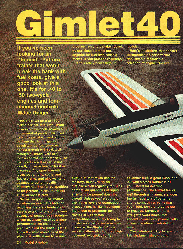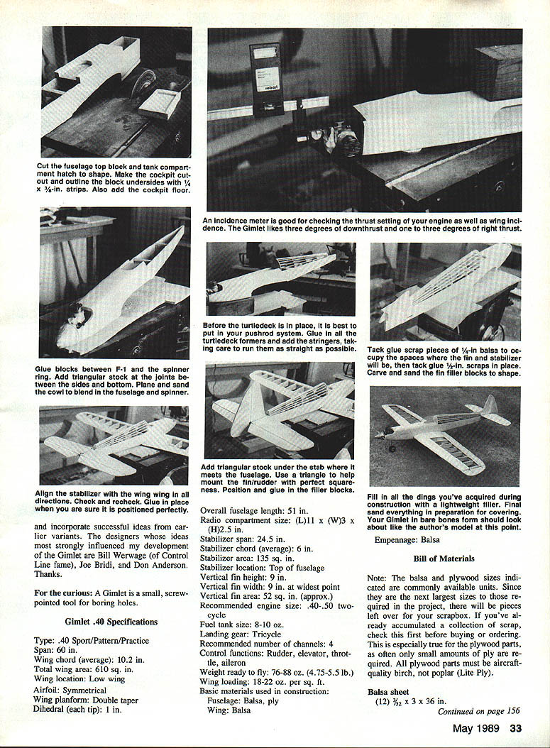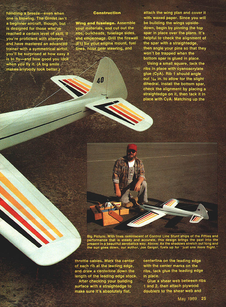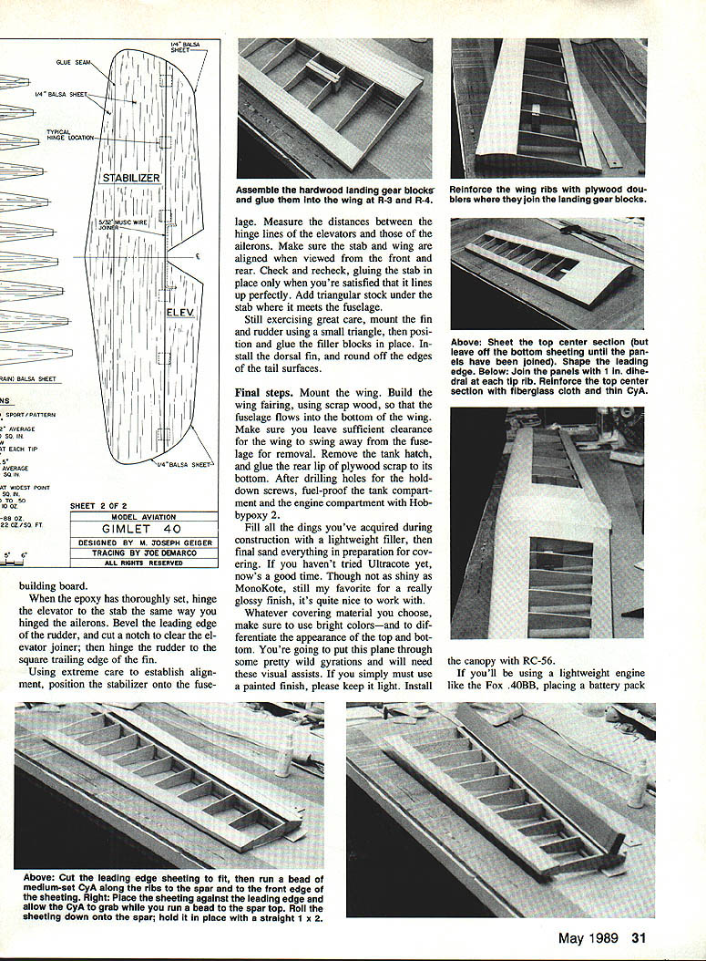 NO OCR TEXT NO OCR TEXT small inexpensive picnic cooier makes UseTul stana Tor assemiing tne low-wing aircrat cooler bought garage sale 50 cents photographs author rear leading edge Drill A-in holes wing mount dowel long drill bit preferable install dowel Center rib A-in trailing edge tack CyA Install remain ing shear webs grain running verti cal remove pins lift structure reinforce joints mediumstrength CyA kicker like Hot Shot speeds process along Pin top trailing edge sheeting plan pin wing structure over glue CyA has fully set re move pins glue bottom trailing edge sheeting place slow-setting CyA Use 30-in length straight 1 x 2 wood hold assembly against flat building surface CyA sets Hold timed two minutes ensure trailing edge perfectly straight Cut leading edge sheeting fit run bead medium-strength CyA tops ribs leading edge spar along front edge sheet ing Place front edge against rear leading edge allowing CyA grab An extra-wide tricycle gear gives excellent ground handling characteristics best landings takeoffs main land ing gear anchored hardwood blocks wing means metal straps screws run another bead along top spar roll sheeting down onto spar Hold place straight 1 x 2 board until CyA has set Repeat same process other side Assemble landing gear blocks glue place reinforce ribs ply doublers join blocks Sheet top center section wing leave bottom center sheeting off un til wings joined dowel holes have located F3 Shape leading edge build other wing point Join wings 1 dihedral tip rib wing joint secure rein force top center area 6-in-wide Left Theres plenty room up front 45 50 engine small Fox 40 does excellent job because theres 600 sq wing area about 5 lb flying weight Right Author says stiff monofilament line used grass trimmers excellent throt tle control rod run inside nylon tubing Gold-N-Rod inners Empty space has filled lightweight shock absorbing foam 26 Model Aviation inner nods b fuselage e ~ron c bolts common fauc~ washershave beeout way bolts stay wing wnen renioveu Pivciiiiig eiieru during vlole n . tache hang up during assembly Washers under wing muu ig Imylull counting bolts captured nylon washers small -rlngs orns prevent binding though trailing edge sweeps forward - BfiLA BtOCj I\ \ K ID 50 NGU*E N CYCLE ____IZLLL 4PLj BL&R FJLLER5 L BALR BL WEBS BATE BWCK 3/BRLpJjp TP 8011DM AILThIc IIiflRE 2 WHEEL UMJoeph Geiger 2 PLC DOUBLER 46 Bi SHEET 2 BL&A &iEET RQ &1OCK $IG LGBLo BAL RI5 .. NXjBALcAP N 4 BLR &IEET N strip fiberglass adhered thin CyA Set wing aside proceed fuse lage construction until ready ad just wing seat Fuselage Laminate F2 F3 lami nate fuselage side doublers being sure make both right left fuse lage sides doublers should inset front sides assuring Fl will glued balsa sides ply doublers Carefully mark centers both top bottom bulkhead Laying sides building board doubler sides facing up tops butted against other mark former brace locations both sides once Using triangle make sure bulkheads perfectly vertical glue F2 F3 F4 sides Place assembly over top view top side down glue second side three formers Pull fuselage sides together tail over centerline top view check ing alignment proceed glue Use bricks weights pins jigs curse words whatever necessary step just dont build banana alignment isnt perfect first time break joint apart redo Using same care brought tail together center Fl between sides glue epoxy Flex Zap Special T Accurately position remaining crosspiec es glue place Glue wing mount blocks position reinforcing small pieces triangular stock Place partially finished wing wing seat center triangulate Measure measure measure have incidence meter use measure measure measure some Get straight alignment perfect no sooner secure wing rubberbands glue tacks tape Using A-in drill bit mark dowel lo cations F3 pushing bit ply doublers spars through lead ing edge F3 Rotate bit fingers until youre sure youve made significant mark F3 Remove bit position glue plywood trailing edge doubler Using /32 drill bit drill through doubler wing through wing mount blocks Remove wing install wing mount dowels bottom center sheet ing Drill through F3 A-in bit DOUBLER 1/32 PLYWOC 1/4 PLYwOOD F-IF-2 3/IA BALSA /2 BALSASHEET SHEETBALSA TRI-STOCK I/4 BALSA TRI-STOCKF El FUEL TANK AREA CB 2-1/2 SIA SPINNER1/4 BALSA TRI-STOCK I/B PLYWOOO NOSE RINS 3/IA BALSA SHE FuSELAGE SISE I/43/R 40-50TWOI/B PLYBALSA CYCLE ENSIFE1/2 BALSA I/B PLYWOSO NOSE RINSF-I PLY 2FUEL TANK AREA BALSA TRI-SYOCK 3 SOWN THROST VS BALSA SHEETVZ BALSA SHEETB BALSA TRI-p STOCK 1/16 PLY 5/35 CIA MUSICSUPPORTI WIRE NOSE SEAR SAVE BROWN 5-1/4 SIA WHEEL enlarge holes through wing trail ing edge doubler Thread wing mount blocks A-20 tap coat threads block CyA tap again Set fuselage aside complete wing Reinforce bottom center joint 6in-wide fiberglass tape thin CyA same manner previously did top Left Install bottom spar again checking alignment straightedge Match centerilne ieading edge rib center marks tack glue ieading edge piace Right Glue shear web between R-1 R-2 attach plywood doublers rear lead ing edge Drill 1h-in holes wing mount dowel Youll note author using long drill bit Thats real handy purpose 28 Model Aviation U wing built upside-down Begin pin- Tack glue ribs place align small ning spar place Employ straightedge square Angle out R-1 As dihedral want assure straightness step SAND 1-1 TO EXACT SHAPE S/IA BALSA SHEETAETER STRINGERS ARE IN Full-Size Plans Available. See Page 202 S/IA BALSAI/B BALSA SHEETPLACE SANS T-7 TO EXACT SHAPESHEET AFTER STRINGERS ARE IN PLACE SHEET-91T-4___T-2T-I 3/16 BALSA T-7T-6________ 3/IA BALSA SHEET F-4 I/A PLYWOOD 1/4 BALSA THI-STOCI T4TO F-A FUSELAGE TOP VIEW T-3 T-4 r-3 I/B BALSA SHEET 3/IA BALSA SHEET FUSELAGE SIDES T-5 S/SD SIA MUSIC WIRE MAKE LANDING GEAR PATTERN T-KT-T KI/4 BALSA TRI- STOCK TSPICAL HINGE LOCATION 1/4 BALSA SHEET 1/4 BALSA TRbSTOCKSLUE LINE I/A S/BFUSELAGE BOTTOM I/Ax 20 TAPBALSA 1/3D PLYWOODFOR NYLON DOUBLERWING BOLD SOWNI/4SO BALSA BOLT1/4 BALSA SHEET D