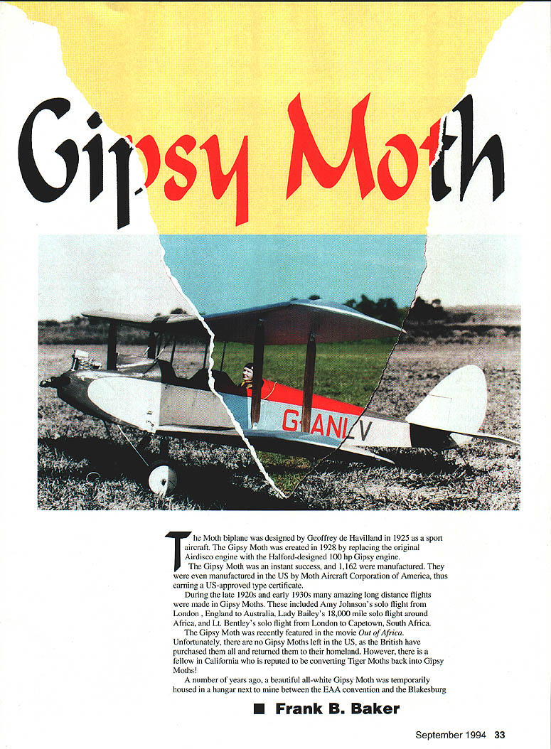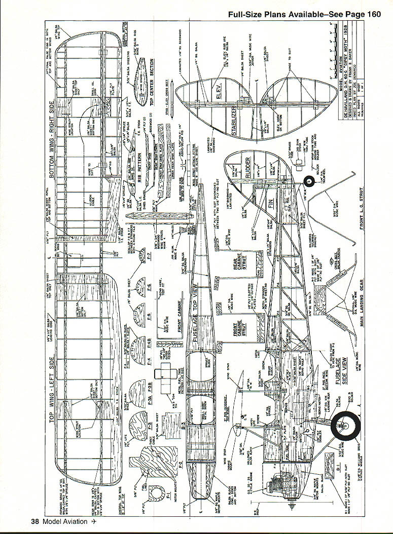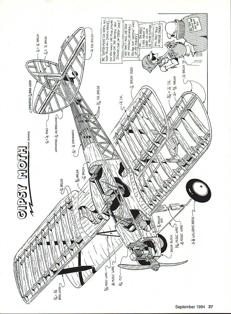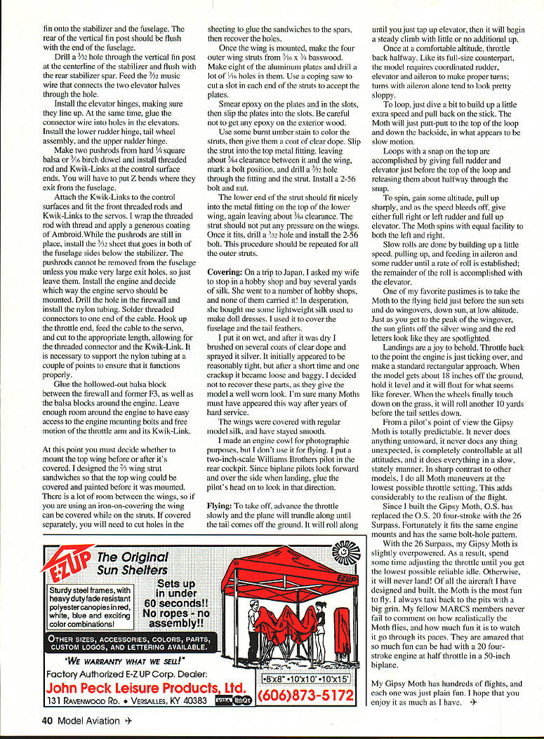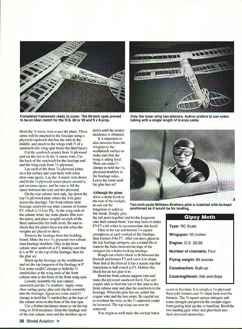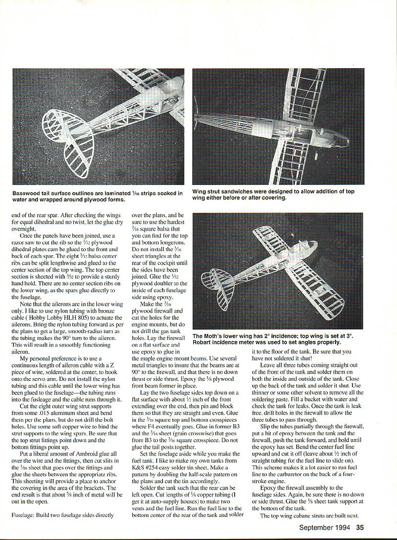 he Moth biplane designed Geoffrey de Havilland 1925 sport aircraft Gipsy Moth created 1928 replacing original Airdisco engine Halforckdesigned 100 hp Gipsy engine Gipsy Moth instant success nd 1162 manufactured manufactured US Moth Aircraft Corporation f America thus earning US-approved type certificate During late 1920s early 1930s amazing long distanc ffights made Gipsy Moths included Amy Johnsons solo flight London and Australia Lady Baileys 18000 mile solo flight around Africa Lt Bentleys solo flight London Capetown South Africa Gipsy Moth recently featured movie Out Africa Unfortunately no Gipsy Moths left US British have purchased returned homeland However fellow California reputed converting Tiger Moths back Gipsy Moths number years ago beautiful all-white Gipsy Moth temporarily housed hangar next between EAA convention Bkkesburg Frank B Baker September 1994 33 AAA fly-in small size rather fragile beauty plane anchored itself back mind did come fore until purchased OS 20 four-stroke engine started thinking about biplanes Gipsy Moth became obvious plane build Arbitrarily selecting 50-inch wingspan enlarged excellent set threeviews appeared Aeromodeller result moderately sized model ideally matched its power plant 9 x 6 prop CONSTRUCTION standards Gipsy Moth particularly light model should take pains keep weight down Use epoxy very sparingly some reason adds weight very insidious manner Choosing weight balsa consistent its use also important Wings Since wings easiest part model will needed build fuselage lets start wing spars consist top bottom x ce balsa sandwiched between Use aliphatic resin glue laminate spars sure secure manner will ensure straight Note balsa spacer does go root rib plywood dihedral brace slips Since wings longer standard 48-inch strip make spars wing panel cut spruce pieces short center section Make wing ribs stacking /16 balsa blanks cutting band saw usually make ribs wing panel time Although plans show false rib between full rib did put just adds weight work Once ribs have cut lay out complete wing building board pin three segments spar place important keep three segments properly aligned problems arise putting dihedral braces remainder wing construction Left The Moth covered silk Finish silver dope sprayed over brushed-on clear dope base Below The Moth flies realistically predictably Turns require coordinated rudder elevator aileron V standard however will need trim ribs Y16 sheet used root end wing panels install sheeting top wing until wing cabane struts have fitted Once wing panels have built laminate 1/ x ce spar caps four dihedral braces trim fit holes wing spars Glue center section spar stubs slide holes wing panel spars block up wings get 12 inches dihedral outer 34 Model Aviafion 4 end rear spar After checking wings equal dihedral no twist let glue dry overnight Once panels have joined use razor saw cut rib 2 plywood dihedral plates cam glued front back spar eight 3A2 balsa center ribs can split lengthwise glued center section top wing top center section sheeted 42 provide sturdy hand hold no center section ribs lower wing spars glue directly fuselage Note ailerons lower wing like use nylon tubing bronze cable y Lobby HLH 805 actuate ailerons Bring nylon tubing forward per plans get large smooth-radius turn tubing makes 900 turn aileron will result smoothly functioning aileron personal preference use continuous length aileron cable Z piece wire soldered center hook onto servo arm install nylon tubing cable until lower wing has glued fuselagethe tubing runs fusleage cable runs through Cut eight outer wing strut supports some 015 aluminum sheet bend per plans drill bolt holes Use some soft copper wire bind strut supports wing spars sure top strut fittings point down bottom fittings point up Put liberal amount Ambroid glue over wire fittings cut slits /16 sheet goes over fittings glue sheets between appropriate ribs sheeting will provide place anchor covering area brackets end result about 5/ inch metal will out open Fuselage Build two fuselage sides directly over plans sure use hardest 3/is square balsa can find top bottom longerons install 3A6 sheet triangles rear cockpit until sides have joined Glue A2 plywood doubler inside fuselage side using epoxy Make plywood firewall cut holes engine mounts drill gas tank holes Lay firewall flat surface use epoxy glue maple engine mount beams Use several metal triangles insure beams 900 firewall no down thrust side thrust Epoxy /i plywood front beam former place Lay two fuselage sides top down flat surface about /2 inch front extending over end pin block straight Glue /6 square top bottom crosspieces F4 eventually goes Glue former B3 /l6 sheet grain crosswise goes B3 /l6 square crosspiece glue tail posts together Set fuselage aside make fuel tank like make own tanks K&S #254 easy solder tin sheet Make pattern doubling half-scale pattern plans cut tin accordingly Solder tank such rear can left open Cut lengths er tubing get auto-supply houses make two vents fuel line Run fuel line bottom center rear tank solder floor tank sure have soldered shut Leave three tubes coming straight out front tank solder both inside outside tank Close up back tank solder shut Use thinner some other solvent remove soldering paste Fill bucket water check tank leaks Once tank leak free drill holes firewall allow three tubes pass through Slip tubes partially through firewall put bit epoxy between tank firewall push tank forward hold until epoxy has set Bend center fuel line upward cut off leave about Y2 inch straight tubing fuel line slide scheme makes lot easier run fuel line carburetor back fourstroke engine Epoxy firewall assembly fuselage sides Again sure no down side thrust Glue / sheet tank support bottom tank top wing cabane struts built next September 1994 35 Basswood tail surface outlines laminated 1/16 strips soaked water wrapped around plywood forms Wing strut sandwiches designed allow addition top wing either before after cov