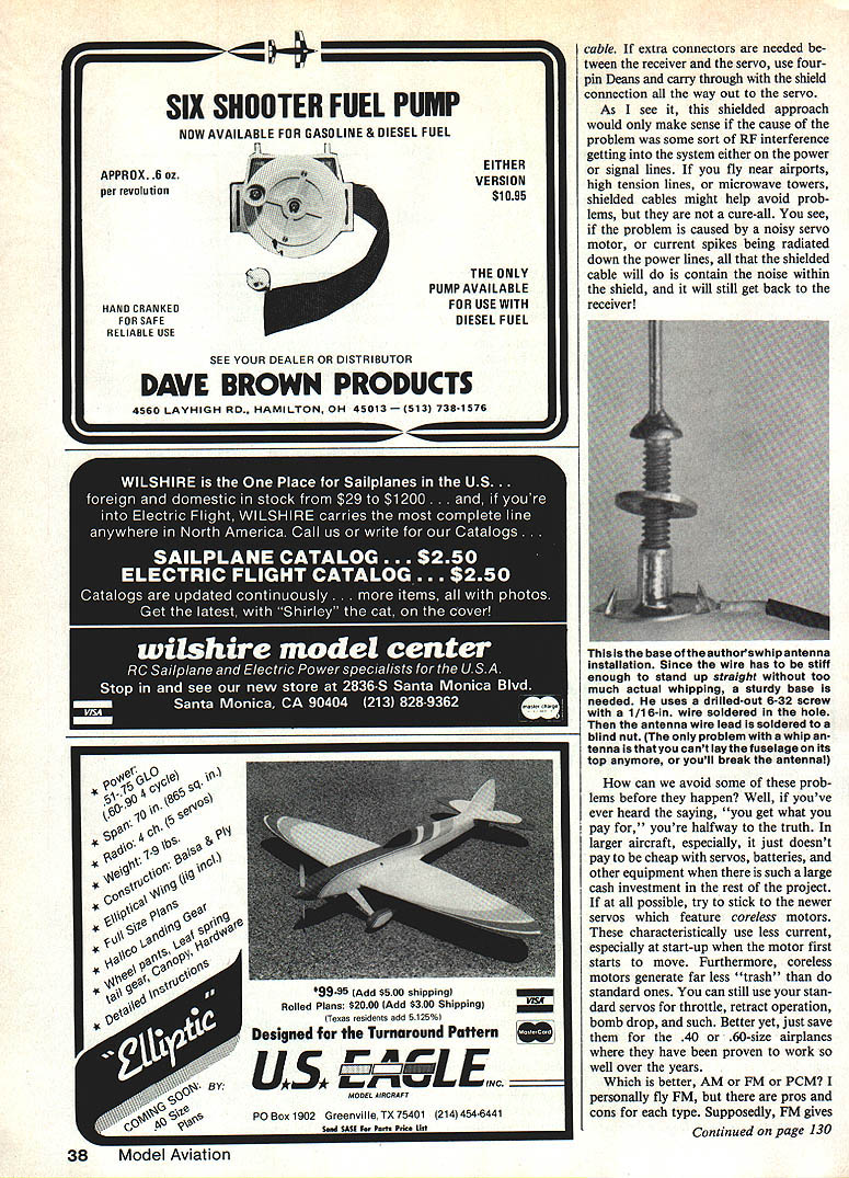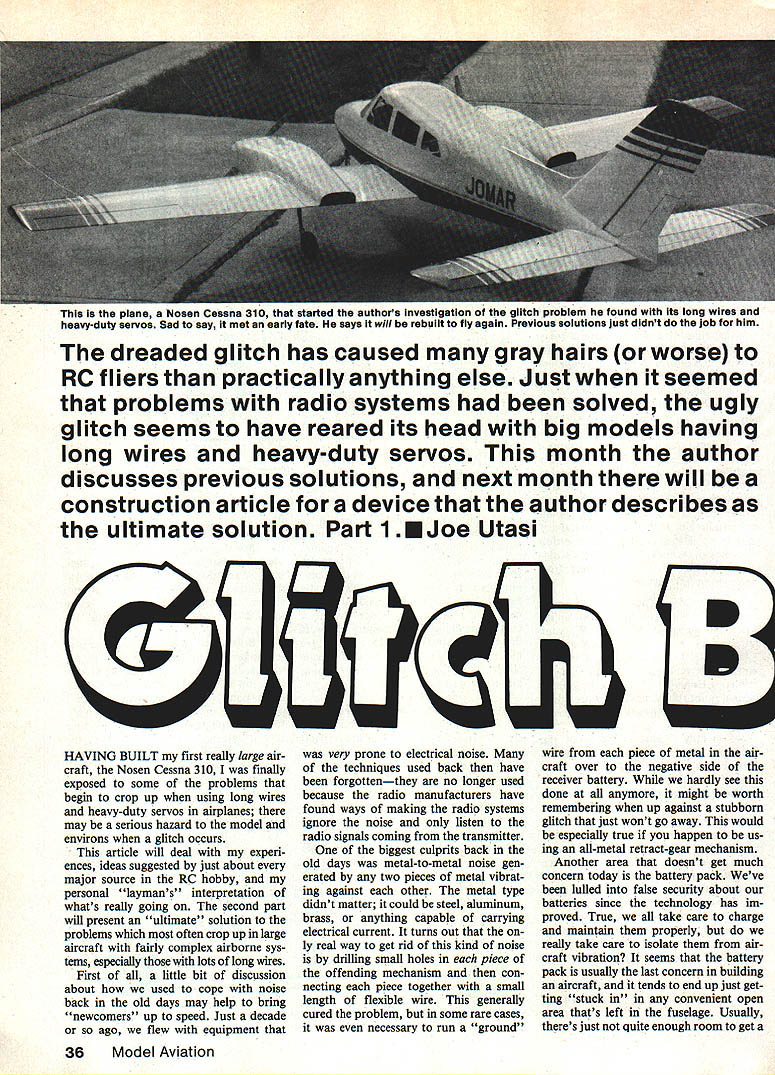 TfliC ins piano iosen Cessna 310 started authors InvestigatIon glitch problem found Its long wires heavy-duty servos Sad say met early fate says will rebuilt fly again Previous solutions just didnt job him dreaded glitch has caused gray hairs worse RCfliersthan practicallyanything else Justwhen seemed problems radio systems solved ugly glitch seems have reared its head big models having long wires heavy-duty servos month author discusses previous solutions next month will construction article device author describes ultimate solution Part 1 EJoe Utasi B B HAVING BUILT first really large air craft Nosen Cessna 310 finally exposed some problems begin crop up using long wires heavy-duty servos airplanes may serious hazard model environs glitch occurs article will deal experi ences ideas suggested just about major source RC hobby personal laymans interpretation whats really going second part will present ultimate solution problems often crop up large aircraft fairly complex airborne sys tems especially lots long wires First little bit discussion about used cope noise back old days may help bring newcomers up speed Just decade ago flew equipment very prone electrical noise techniques used back have forgottenthey no longer used because radio manufacturers have found ways making radio systems ignore noise listen radio signals coming transmitter biggest culprits back old days metal-to-metal noise gen erated two pieces metal vibrat ing against other metal type didnt matter could steel aluminum brass anything capabe carrying electrical current turns out ly real way get rid kind noise drilling small holes piece offending mechanism con necting piece together small length flexible wire generally cured problem some rare cases necessary run ground wire piece metal air craft over negative side receiver battery hardly see done anymore might worth remembering up against stubborn glitch just wont go away would especially true happen us ing all-metal retract-gear mechanism Another area doesnt get much concern today battery pack Weve lulled false security about batteries since technology has im proved True take care charge maintain properly really take care isolate air craft vibration seems battery pack usually last concern building aircraft tends end up just get ting stuck in convenient open area thats left fuselage Usually theres just quite enough room get 36Model Aviation Left Schematic typical signal buffer used boost signal level servos well keep noise signal line backing up receiver capacitors optional providing power supply decoupling slowdown signal edges prevent signal radiation Right Schematic typical choke setup used quite frequently sometimes used capacitor author says probably better left Present-day Radio Control systems operate normal-size planes very well modifications really good layer foam padding around either cram anyway compress foam use some thin ner foam worse yet no foam Sure seems work OK may have 150 flights airplane setup suddenly starts go ing wild pilot begins aint got dance maybe its battery finally gave up farm Think about Another area thats taken granted receiver antenna Some us still remember old days try position antenna away servo motors battery wiring like should others dont seem care What heck its got plenty ground range right Wrong What works ground doesnt always work air once its up its too late change mind move antenna best policy keep antenna far away jossible anything elec trical metallic aircraft Usually means straight run top fuselage back top fin small rubberband will maintain tension keep antenna nice straight Remember antenna length criti cal tuning receiver should kept straight possible run ning solid music wire pushrods tail using wire cable systems another caveat should heeded wire lengths controls close same length antenna sometimes strange things can happen radio system situations like few things can done During planning stages long control cable runs should broken randomly once per run wood plastic insulating connec tor some sort theory will prevent electrical resonances~ might upset radio system plane already built youve just discovered glitch problem best alternative would give vertical whip antenna try simply piece music wire solder receiver antenna course would remove length wire antenna equal length music wire Ive told some newer 1991 receiver designs especially touchy about antenna position whip antenna sure way get reliable opera tion back Kraft offering whip accessory its radio system may still available cant hurt may save plane What about chokes Im sure now youve probably heard other fliers talking about chokes helped hurt particular installation old days used put chokes power leads keep RF picked up wiring backing up receiver causing havoc Well size servos being used todays larger aircraft high currents have pass through wiring puttiig chokes power leads out question Nonetheless gave try being sure use choke capable car rying current seemed harm good chokes power lead just waving transmit ter antenna near aircraft would drive system wild dont have really good explanation really happened next place see chokes being used some degree success signal lead servos being fed long wiring rally choke will range size 100 microhenries 100 millihenries Futaba also recommends capacitor 001 microfarads ground servo side choke Ive tried didnt cause problems used airplane theory behind approach servo motor can generate current spikes electrical noise passed signal lead wire harness noise tends upset decoder kind interference can recog nized glitches channel long leads well sometimes next channel pulse train Unfortunately usually aileron channel has long leads causes aileron glitches next channel line usually elevator two strikes against odds against saving plane getting analyze problem pretty slim very fortunate managed get Cessna back ground eight times harm trying make sense out whole glitch phenome non bottom line chokes signal lead can help some situations An