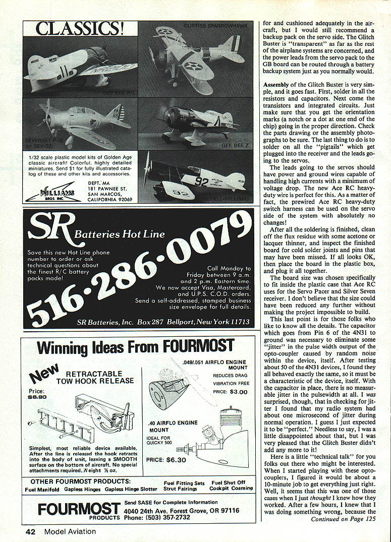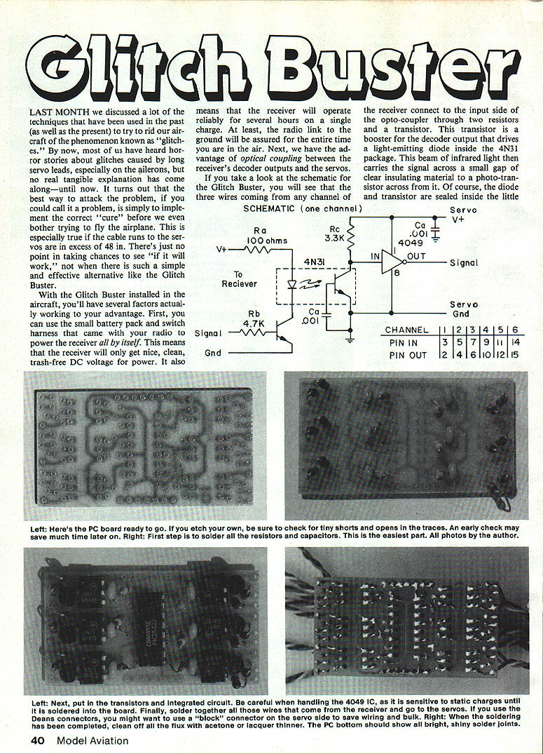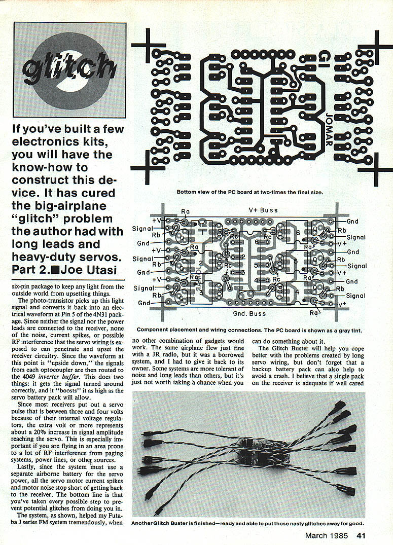 LAST MONTH discussed lot techniques have used past well present try rid air craft phenomenon known glitch es now us have heard hor ror stories about glitches caused long servo leads especially ailerons no real tangible explanation has come alonguntil now turns out best way attack problem could call problem simply imple ment correct cure before bother trying fly airplane especially true cable runs ser vos excess 48 Theres just no point taking chances see will work such simple effective alternative like Glitch Buster Glitch Buster installed aircraft youll have several factors actual ly working advantage First can use small battery pack switch harness came radio power receiver itself means receiver will get nice clean trash-free DC voltage power also means receiver will operate reliably several hours single charge least radio link ground will assured entire time air Next have ad vantage optical coupling between receiver s decoder outputs servos take look schematic Glitch Buster will see three wires coming channel SCHEMATIC channel RaRc I0Oohms33K 4N31IN Reciever J RbCa 47K001 Signal Gnd receiver connect input side opto-coupler through two resistors transistor transistor booster decoder output drives light-emitting diode inside 4N3 1 package beam infrared light carries signal across small gap clear insulating material photo-tran sistor across course diode transistor sealed inside little Servo Cal V 001 4049 OUT Signal 8 Servo Gnd CHANNEL II 1213141516 PIN IN PIN OUT II 51719111 14 12 1416110112 15 Left Heres PC board ready go etch own sure check tiny shorts opens traces An early check may save much time later Right First step soider resistors capacitors easiest part photos author Left Next put transistors integrated circuit careful handling 4049 IC sensitive static charges until soldered board Finally solder together wires come receiver go servos use Deans connectors might want use block connector servo side save wiring bulk Right soldering has completed clean off flux acetone lacquer thinner PC bottom should show bright shiny solder joints 40 Model Aviation youve built few electronics kits will have know-how construct de vice has cured big-airplane glitch problem author long leads heavy-duty servos Part 2EJoe Utasi six-pin package keep light outside world upsetting things photo-transistor picks up light signal converts back elec trical waveform Pin 5 4N3 1 pack age Since neither signal nor power leads connected receiver noise current spikes possible RF interference servo wiring ex posed can penetrate upset receiver circuitry Since waveform point upside down signals optocoupler routed 4049 inverter buffer does two things gets signal turned around correctly boosts high servo battery pack will allow Since receivers put out servo pulse between three four volts because internal voltage regula tors extra volt represents about 20% increase signal amplitude reaching servo especially im portant flying area prone lot RF interference paging systems power lines oth sources Lastly since system must use separate alrborne battery servo power servo motor current spikes motor noise stop short getting back receiver bottom line youve taken possible step pre vent potential glitches doing system shown helped Futa ba J series FM system tremendously 00 00w O4 oo ign Rb G n d gnal Rb Gn d Signal G n Ra V Buss Buss OO OO Gnd Rb Sign iv Component placement wiring connections PC board shown gray tint no other combination gadgets would work same irplane flew just fine JR radio borrowed system give back its owner Some systems tolerant noise long leads others its just worth taking chance can something about Glitch Buster will help cope better problems created long servo wiring dont forget backup battery pack can also help avoid crash believe single pack receiver adequate well cared March 1985 41 Bottom view PC board twotimes final size Another Giitch Buster finishedready abie put nasty giitches away good eR TOW HOOK RELEASE Price 5890 Afterof Simplest reliable device available line released hook retracts unit leaving SMOOTH surface bottom aircraft No special attachments required N eight Vs oz 0491051 AIRFLO ENGINE MOUNT REDUCES DRAG 4 VIBRATION FREE PRICE $300 PRICE $630 OTHER FOURMOST PRODUCTS Fuel Fitting Sets Fuel Shut Off Fuel Manifold Gapless Hinges Gapless Hinge Slotter Strut Fairings Cockpit Coaming ST Send SASE Complete Information 4040 24th Ave Forest Grove OR 97116 PRODUCTS Phone 503 357-2732 cushioned adequately air craft would still recommend backup pack servo side Glitch Buster transparent far rest airplane systems concerned power leads servo pack GB board can routed through battery backup system just normally would Assembly Glitch Buster very sim ple goes fast First solder resistors capacitors Next come transistors integrated circuits Just make sure get orientation marks notch dot end chip going proper direction Check parts drawing assembly photo graphs sure last thing to solder pigtails get plugged receiver leads go ing servos leads going servos should have power ground wires capable handling high currents minimum voltage drop new Ace RC heavyduty wire perfect As matter fact prewired Ace RC heavy-duty switch harness can used servo side system absolutely no changes After soldering finished clean off flux residue some acetone lacquer thinner inspect finished board cold solder joints pins may have missed looks OK place board plastic box plug together board size chosen specifically fit inside plastic case Ace RC uses Servo Pacer Silver Seven receiver dont believe size could have reduced further making project impossible build last point folks like know details capacitor goes Pin 6 4N3 1 ground necessary eliminate some jitter pulse width output opto-coupler caused random noise within device itself After testing about 50 4N3 1 devices found behaved exactly same soit must characteristic device itself capacitor place no measur able jitter pulsewidth surprised though checking jit ter found radio system about micro