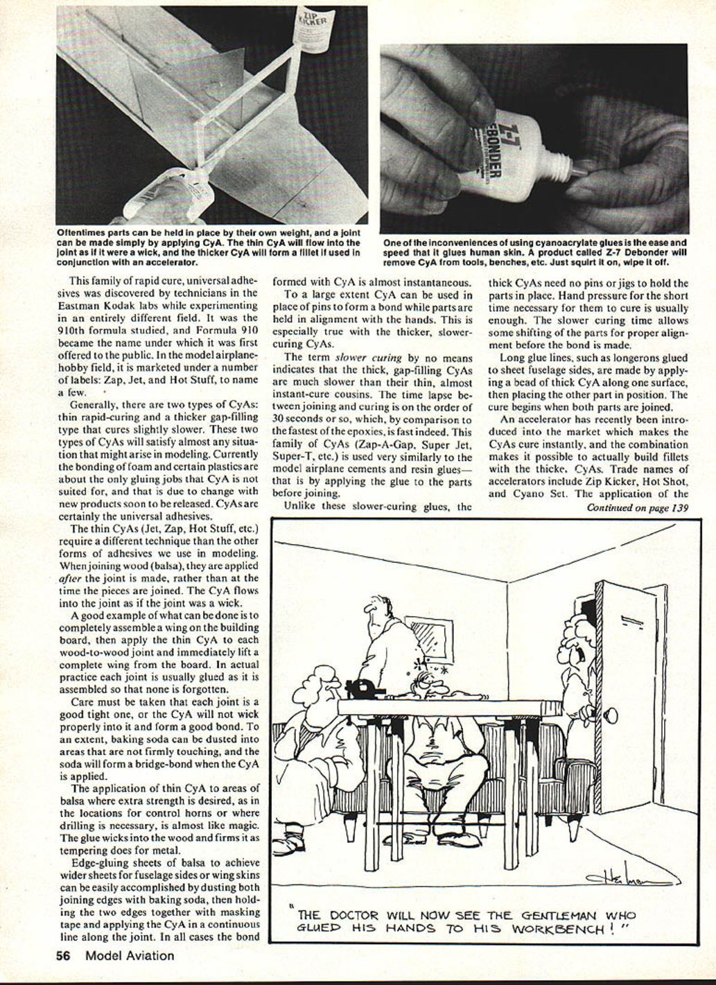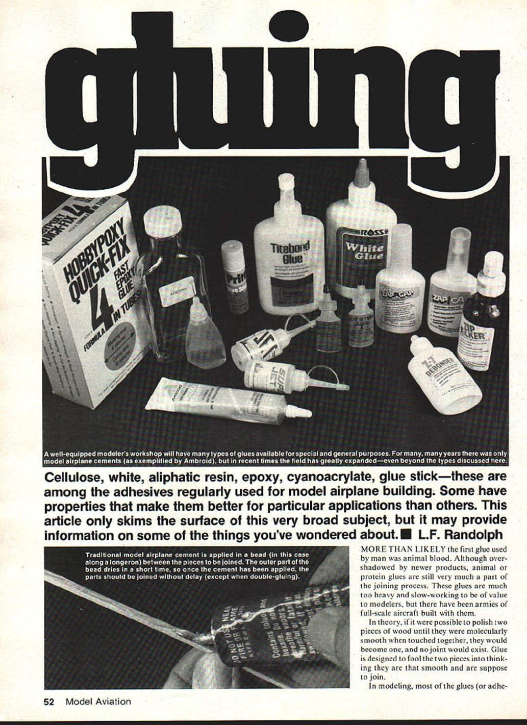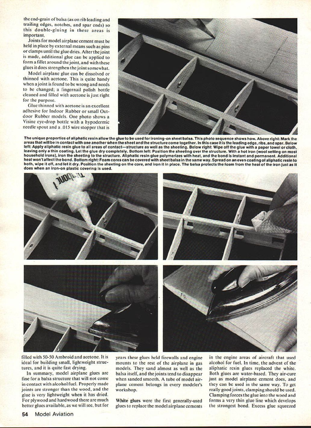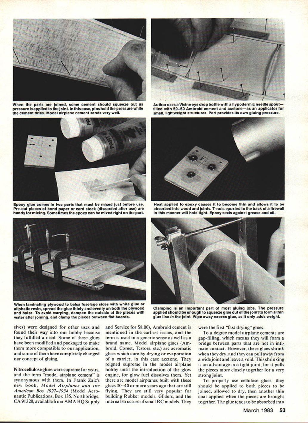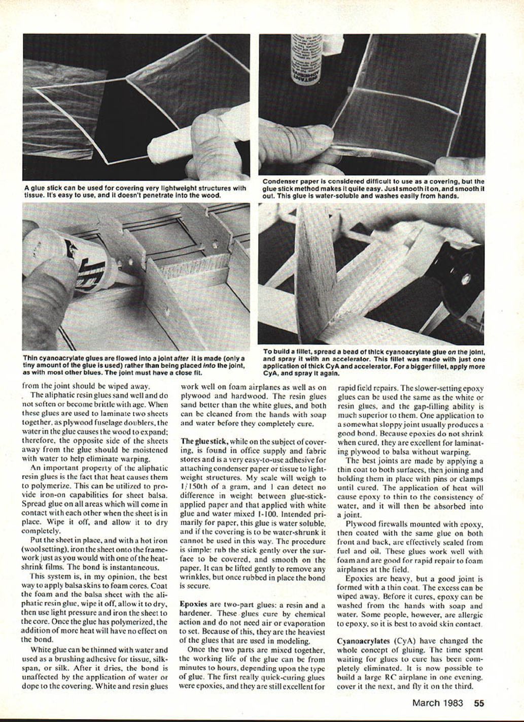 Cellulose white aliphatic resin epoxy cyanoacrylate glue stickthese among adhesives regularly used model airplane building Some have properties make better particular applications others article skims surface very broad subject may provide information some things youve wondered aboutE LF Randolph MORE THAN LIKELY first glue used man animal blood Although over shadowed newer products animal protein glues still very much part joining process glues much too heavy slow-working value modelers have armies full-scale aircraft built theory possible polish two pieces wood until molecularly smooth touched together would become nojoint would exist Glue designed fool two pieces think ing smooth suppose join modeling glues adhe 52 Model Aviation sives designed other uses found way hobby because fulfilled need Some glues have modified packaged make compatible application some have completely changed concept gluing Nitrocellulose glues supreme years term model airplane cement synonymous Frank Zaics new book Model Airplanes American Boy 19271934 Model Aero nautic Publications Box 135 Northbridge CA 91328 available AMA HQ Supply Service $800 Ambroid cement mentioned earliest issues term used generic sense well brand name Model airplane glues Am broid Comet Testors etc aeromatic glues cure drying evaporation carrier case acetone reigned supreme model airplane hobby until introduction glow engine glow fuel dissolves Yet model airplanes built glues 3040 years ago still flying still very popular building Rubber models Gliders internal structure small RC models first fast drying glues degree model airplane cements gap-filling means will form bridge between parts inti mate contact However glues shrink dry can pull away widejoint leave void shrinking advantage tight joint pulls pieces closely together very strong joint properly cellulose glues should applied both pieces joined allowed dry another thin coat applied wher pieces brought together glue ends absorbed March 1983 53 parts joined some cement should squeeze out pressure applied joint case pins hold pressure cement dries Model airplane cement sands very well Author uses Visine eye drop bottle hvpodermic needle spout filled 5050 Ambroid cement acetoneas applicator small iiohtweiaht structures Part provides Its own gluing pressure Epoxy glue comes two parts must mixed just before use Pre-cut pieces bond paper card stock discarded after use handy mixing Sometimes epoxy can mixed right part Heat applied epoxy causes become thin allows absorbed wood joints T-nuts epoxied back firewali manner will hold tight Epoxy seals against grease oil laminating plywood balsa fuselage sides wltfl wnite giue aliphatic resin spread glue thinly evenly both plywood balsa avoid warping dampen outside pieces water after joining clamp pieces between flat boards Clamping important part gluing jobs pressure applied should enough squeeze glue out joint form thin glue iine loint Wipe away excess gluE oniy adds weight end-grain balsa rib leading trailing edges notches spar ends double-gluing areas Important Joints model airplane cement must held place external means such pins clamps until glue dries After thejoint made additional glue can applied form fillet around thejoint glues does strengthen thejoint somewhat Model airplane glue can dissolved thinned acetone quite handy ajoint found wrong needs changed fingernail polish bottle cleaned filled acetone just right purpose Glue thinned acetone excellent adhesive Indoor Rubber small Out door Rubber models photo shows Visine eye-drop bottle hypodermic needle spout 015 wire stopper filled 50-50 Ambroid acetone years glues held firewalls engine ideal building small lightweight struc- mounts rest airplane gas tures quite fast drying models sand almost well summary model airplane glues balsa itself thejoints tend disappear fine balsa structure will come sanded smooth tube model air contact alcohol fuel Properly made plane cement belongs modelers joints stronger wood workshop glue very lightweight has dried plywood hardwood much better glues available will see Wiiite glues first generally-used glues replace model airplane cements engine areas aircraft used alcohol fuel time advent aliphatic resin glues replaced white Both glues water-based air-cure just model airplane cement does can used same way get really goodjoints clamping should used Clamping forces glue wood forms very thin glue line develops strongest bond Excess glue squeezed 54 Model Aviation unique properties aliphatic resin allow glue used ironing-on sheet balsa photo sequence shows Above right Mark areas will contact another sheet structure come together case leading edge ribs spar Below left Apply aliphatic resin glue areas contactstructure well sheeting Below right Wipe off glue wilh paper towel cloth leaving thin coating Let glue dry completely Bottom left Position sheeting over structure hot iron wool setting household irons iron sheeting structure Aliphatic resin glue polymerizes heat bond instant permanent Additional heat wont affect bond Bottom right Foam cores can covered sheet balsa same way Spread coating aliphatic resin both wipe off let dry Position sheeting core iron place balsa protects foam heat iron just does iron-on plastic covering used joint should wiped away aliphatic resin glues sand well soften become brittle age glues used laminate two sheets together plywood fuselage doublers water glue causes wood expand therefore opposite side sheets away glue should moistened water help eliminate warping An important property aliphatic resin glues fact heat causes polymerize can utilized pro vide iron-on capabilities sheet balsa Spread glue areas will come contact other sheet place Wipe off allow dry completely Put sheet place hot iron wool setting iron sheet onto frame workjust would heatshrink films bond instantaneous system opinion best way apply balsa skins foam cores Coat foam balsa sheet ali phatic resin glue wipe off allow dry use light pressure iron sheet core On