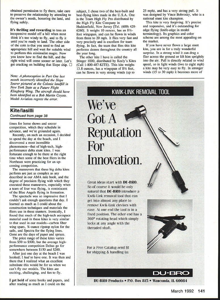 NO OCR TEXT obtained permission fly take care preserve relationship attending owners needs honoring land flying safely Its thrilling rewarding toss inexpensive model off hill think its too windy fly fly until youre ready land other side coin need find appropriate hill wait suitable wind perform minimalist magic Now know find hill right wind will come sooner later Lets get cracking building Slope ship D Note A photocaption Part last month incorrectly identified Slope Soarer pictured Colonie landfill New York State Future Flight Klingberg Wing aircraft should have identjied Bob Martin Coyote Model Aviation regrets error Kite/lasi Iii Continued page 38 times horse shows soccer competition schedule advance grounded again Recently such occasion decided spend day beach discovered incredible phenomenonthat high-tech highperformance delta stunt kites fortunate enough right time some best fliers Northeast practicing up coming competition maneuvers big delta kites perform just complex described AMA rule book degree precision flying executed maneuvers especially team four flying reminiscent Blue Angels flying formation spectacle impressive couldnt ask enough questions day learned much could about construction techniques materials fliers use stunters Ironically found much high-tech aerospace material used kites very similar used modelscarbon fiber wing spars 3/4 -ounce ripstop nylon sails Spectra flying lines Gone days paper spruce price range kites varies $50 $500 average highperformance competition Deltas go somewhere between $150 $200 After just day beach hooked have realized what excellent substitute would us cant fly models kites exciting challenging fun fly got hold some books papers after reading much could subject chose two best-built best-flying kites made USA Team High Fly Pro distributed High Fly Kite Company Haddonfield New Jersey [Tel 609 4296260] weighs 10 ounces has 8foot wingspan can flown winds three 20 mph flies very fast very precisely excellent team flying fact team flies kite performs demos throughout country year long other kite have called Stinger 1000 distributed Keelys Kites Call 1-800-487-KITE kite weighs 138 ounces has wingspan 81/2 feet can flown very strong winds up 25 mph has very strong pull designed Vince Bobrosky national stunt kite champion kite very forgiving Its precise responsive its outstanding edge flying knife-edge model terminology Its graphics color scheme among appealing market have never flown large stunt kite truly wonderful surprise strong wind can drag flier across ground lift him sprightly air Pull directly related wind speed light winds two eight mph kite may very easy fly stronger winds 15 30 mph becomes March 1992 141 Real Stuff Dave ____________Performance Specialties True AAC & ABC Piston/Cylinder Assemblies Serious Horsepower AAC Nelson 40 FAI Formula OS Hanno Special 05 61 SF/RE YS 61R 1 Q-50 Available Following Engines ABC Nelson 40 FAI Formula 1 Q-500 05 32 05 4OVF VRP OS 46SF OS 61SF/RE OS 61VE 0S61 SEN-H REN-H 0561 FSR 05 91 VRDF ST X-40 Rossi 40 YS 45 YS 60 FR/ES YS61 R/SYS 120 Complete Parts & Service OS ST YS & bra Performance Specialties ox 3146 nerville NV 89410 Phone 702-265-7523 FAX 702-265-7522 ViS4I Send $200 1992 Catalog challenge may find yourself flying alongfeet gracelessly scraping random patterns sand So next time its too windy fly plane field taken over special event another dont frustrated Have ball Go fly kite Robins/Wilson Continued page 56 ovations throughout United States England movie staffing Dennis Morgan especially inspirational children eight-to-12 age group Morgan pushed Hollywood stage prop Curtiss P-40 Warhawk 35-degree dive slightly lifting right wing deflection shot gave chase another Japanese Zero sound theater burst machine gun fire six 50caliber weapons enemy plane went down impressionable young boys mentally wore General Scotts three Distinguished Flying Crosses two Silver Stars five Air Medals bib D overalls T-shirts poured out Saturday matin& onto Main Street USA Not few would go fight future air battles defense freedom General Robert L Scott Jr retired US Air Force 1957 Museum Aviation supported voluntary contributions Scott serves its ongoing Campaign Chairman museum boasts first-rate display Scotts 23rd Fighter Group memorabilia God Co-pilot shown museum theater photographs film display first edition responding advertisers mention read about Model Aviation Scotts book presented him mother can also seen enthusiasm staff volunteers nationally prominent depository historical aircraft memorabilia unmistakable Theyre both preserve history tradition Robins Air Force Base US Air Force make visitors feel welcome Anyone attending can expect cordial southern-style greeting followed fascinating educational experience round/Aldrich Continued page 59 built competed locally design 1952 didnt remember since Georgia gang didnt make 1952 Nationals California conversation last week Bill ** 4620 CRANDALL-I ANF$VILLE RD CORYDON INDIANA 47112 ** ____________________________________ __________________________ Large selection Remote Control Model Airplanes professional LISTED BELOW Business since 1973 ES SUBJECT TO CHANGE WITHOUT NOTICE IS JUST FEW OF THE MFGWE STOCK HOURS MONDAYTHRUTHURSpAVOAAA PAA D7nAVOAAAPM A-i USTO JIGCLOSED SATURDAY& AMBR OlD ARCO RUBBERBANDS BRiDI DAVEYS SYSTEMS cOVERiTE DEvcON DREMEL DU-BRO DY NA Fl LITE SONIc-TRONIcS STERLING SULLIVAN TOP FLiTE VS ENGINES LA Ni ER MILLER NORTHEAST ZINGER PROPS complete listing etcplease sends stamped self-address enve lope DEALERS WANTED Limited Quantity STAFFORD SCALE 8-24$300 ENGINES 4 19-25 WINGSPAN 9Oinebes FKKITSIGkkumI FOX FUTABA GOLDBERG GAS MODEL PROD HALLCO HOBBYPOXY HOT STUFF K & B MFG Si G SAITO 142 Model Aviation 0 STAFFORD AIRCOUPE $9995 PLEASE CALL FOR SPECIALS OF THE MONTH