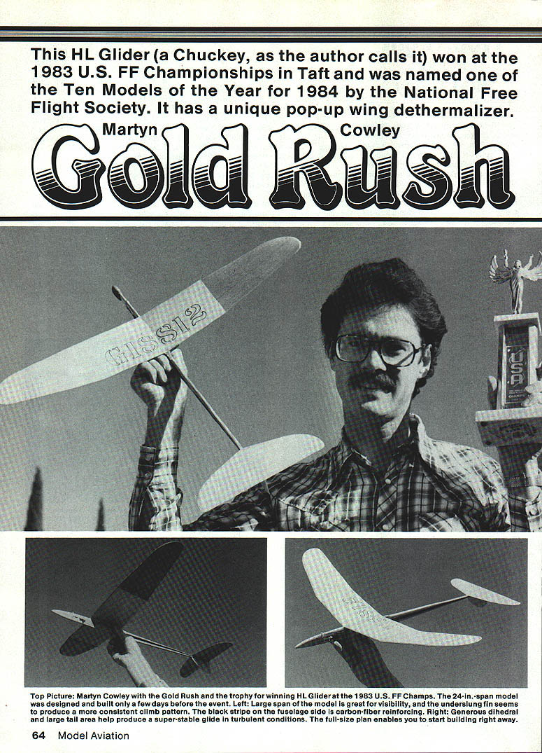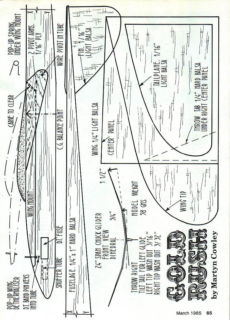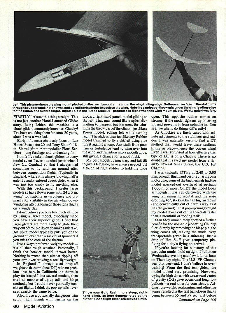 This HL Glider Chuckey author calls won 1983 US FF Championships Taft named Ten Models Year 1984 National Free Flight Society has unique pop-up wing dethermalizer MartynCowley % 4V N Top Picture Martyn Cowley Gold Rush trophy winning HL Gilder 1983 US FF Champs 24-in-span modei designed built few days before event Left Large span model great forvisiblilty underslung fin seems produce consistent cilmb pattern black stripe fuselage side carbon-fiber reinforcing Right Generous dihedral large tail area help produce super-stable glide turbulent conditions full-size plan enables start building right away 64 Model Aviation POPtIP WI [ TM [ MALIS[k .111ARYL 10 .pD~ PoPop s~i n tflTh[RWIW MutiliT M BA[1 Pill KLYS______AIIWMRIIMT___________X IrilolliBEVVIIIJIIUUIII PIYOTAPI1S __ ______________________1/16 PLY______ I-- --_______________ SM[P TUBET FUSE BALAH[ POITWIRE PIYOT Ill TUBE SELME 114x 1 MAR BALSA__________________ -____________FIll 1/16 ,1I[R1/4LIcThT BALSA\LKI1T BALSA 1 1/ SPAM MU LI[P [ROll VIEW P AL THROW RIGHT TILT JAIL FOR LEFT LD[ LEFT TIP WASH OUT /16 RIUIT TIP WASH OUT Ii 02 31 Martyn Cowley / N ___________ TAILPLAllL 1/16 LIGHT BALSA I\THROW lAB 1/4 HARD BALSA I\ UHIER RIGHT [hER PAMEL -4I FIRSTLY lets set thing straight just another Hand-Launched Glider story Being British machine chuck glider commonly known Chucky Ive chucking some 20 years since wee lad Early influences obviously focus Lee Hines Sweepette 20 Tony Slaters 18m Slarmi Aeromodeller Plans Ser vicelong fuselage underslung fin think Ive taken chuck gliders model event ever attended flew CL Combat always something fly run around after between competition flights Typically England always blowing half gale usually entered chuck glider just too windy fly anything else background prefer large models have flown some 24 x 5 wings stability turbulence pri marily visibility air down wind after landing long flights windy day dont believe lose too much altitude using larger model especially since have superior glide find large gliders likely glide way out trouble make mistake An 18-in model typically puts ground quicker sackful spanners miss core thermal Ive always preferred weighty models its rough weather Personally think heavier model throws better Nothing worse almost ripping off arm overthrowing real lightweight England always used drop-off weights dethermalize DT no prob lembut California thermals play keeps lost several models tried manner tip-up tails hinge methods could never get really con sistent flights think pop-up tails never seat exactly same twice Also use potentially dangerous trim setup right launch washin inboard right-hand panel model gliding left may sound like spiral dive waiting happen its great trim ming throw part climbjust like Power model rolling left turning right glide just like Rubber model trimmed fly right/left using side thrust against warp Any stalls poor trim turbulence tend wing-over wind transition smooth glide still giving chance good flight best models using warp tail tilt give left glide have always needed just touch right rudder hold glide open opposite rudder comes stronger model tightens-up strong lift prevents spinning-in see aliens things differently As Chuckies finely-tuned mi nute adjustments stabilizer rud der naturally keen find DT method would leave surfaces firmly placehence pop-up wing surprised effective type DT Chucky no doubt saved model flyaway several times during US FF Champs typically DTing 240 300 min flight despite chasing motorbike some big thermals model specked-out overhead perhaps 1000 ft DT model looks though has self-destructed wing remaining horizontal nose dropping 450 sticking tail high air conveniently out harms way hits ground pop-up wing brought model down out thermals faster mouthful roofing nails Stan Stoy immediately spotted further benefit nomadic jet-setting Chucky flier Simply removing hinge pin wing comes off making model very transportable suitcase Just drop Hot Stuff gives temporary pinfixing days flying arrival youre looking history particular model hold tight built Wednesday evening flew hour Thursday night US FF Champs weekend dont believe overtraining first test glides model looked very promising However trying high times rearward center gravity CG gave occasional long low pulloutsa real killer consistency Ad ding nose weight retrimming adjusting warps resulted last half-dozen flights being between 55 57 sec just before Continued Page 150 66 Model Aviation Left picture shows wing mount pivoted two plywood arms underthe wing traiiing edge Dethermaiizerfuse siot burns through rubberband notahown smali spring heipsto push upthewing Notethesandpaperthrowgrip underthewing ieadingedge thumb middie finger Right Dead Duck Dl produced fiight wing mount pivots Works quickly/safely Throw Goid Rush steep righthand ciimb demonstrated author Good fiight times around 1 mm 5 orc$eooaclca flTTTHANDE1N 04 Page CATALOGUE Up $800 add $150$200 PP/tat Class $801 $2000 add $225A copy will sent $2001 $4500 add $300 free-when requested-$4001 $7000 add $350 ord over $7000 add $400HOBBY HORN CA Addressees add 0% law15173 Moran St [A] Send MO Visa/MC#Exppo Box 2212 Check allow up 30Westminster Ca 92684 days CK clearance 714 0030311 COO Esact Charges plus $180 HdI Cash Only[Aft Hr5 714 0951203] humidity meter corner box plastic curtain closes front box except hands enter covering light bulb furnishes heat dry paper framework light work Additional heat generated heating pad under cardboard work surface Place structure covered condenser paper inside box close curtain start heating relative humidity down around 10% slip hands under curtain cover part part re-enters real world paper will sag somewhat unless home atmosphere dry inside box have models outlast usefulness using technique caution humidity inside box doesnt fall rather quickly box itself may damp will have dried out work properly Another photo shows easy covering technique Trim condenser paper oversize lay outline 