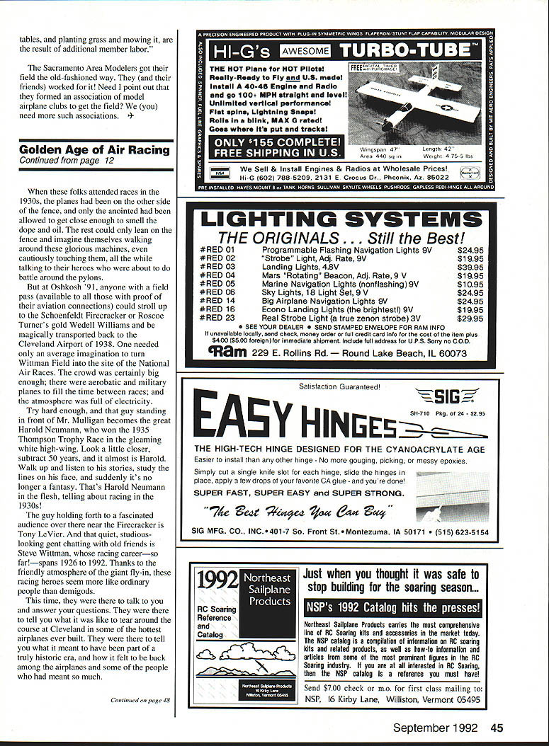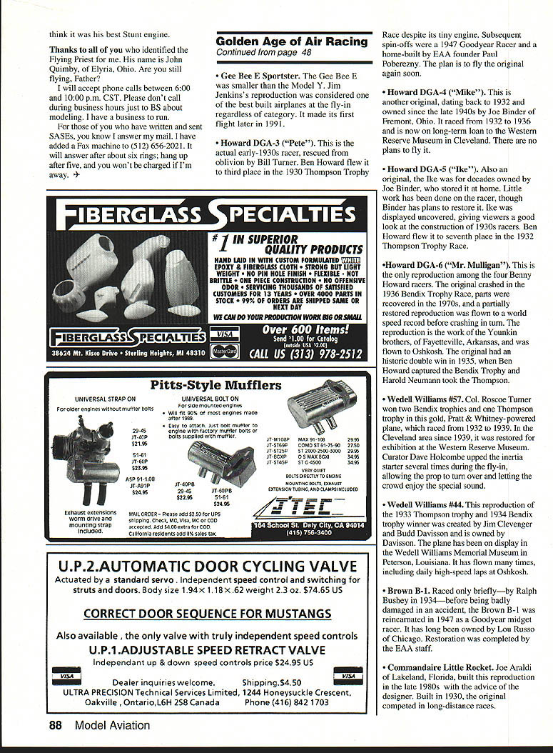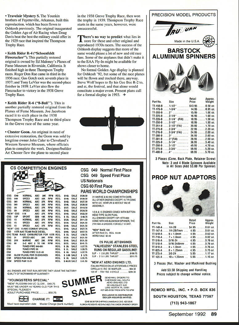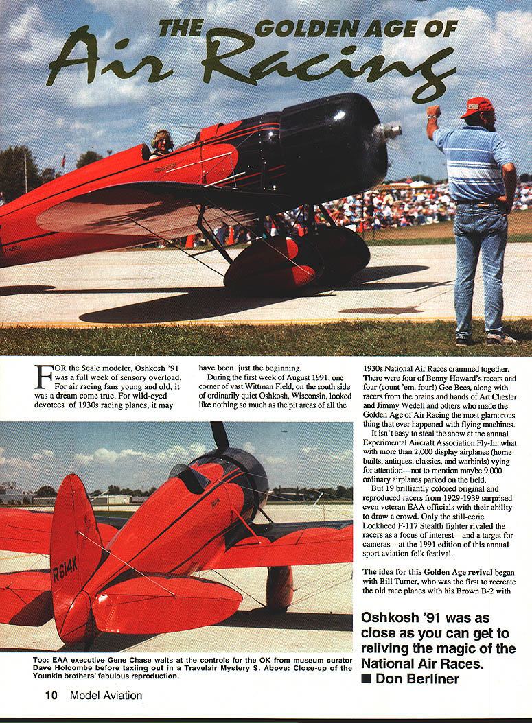FOR Scale modeler Oshkosh 91 full week sensory overload air racing fans young old dream come true wild-eyed devotees 1930s racing planes may have just beginning During first week August 1991 corner vast Wittinan Field south side ordinarily quiet Oshkosh Wisconsin looked like nothing much pit areas Top EAA executive Gene Chase waits controls OK museum curator Dave Holcombe before taxiing out Travelair Mystery S Above Close-up Vounkin brothers fabulous reproduction 1930s National Air Races crammed together four Benny Howards racers four count em four Gee Bees along racers brains hands Art Chester Jimmy Wedell others made Golden Age Air Racing glamorous thing ever happened flying machines isnt easy steal show annual Experimental Aircraft Association Fly-In what 2000 display airplanes home builts antiques classics warbirds vying attentionnot mention maybe 9000 ordinaiy airplanes parked field 19 brilliantly colored original repreduced racers 1929-1939 surprised veteran EAA officials ability draw crowd Only still-eerie Lockheed F-i 17 Stealth fighter rivaled racers focus interestand target camerasat 1991 edition annual sport aviation folk festival idea Golden Age revival began Bill Turner first recreate old race planes Brown B-2 Oshkosh 91 close can get reliving magic National Air Races Don Berliner 10 Model Aviation its Miss Los Angeles logo Gee Bee Model Z built mainly Ed Marquardt Bill collected several vintage craft Disney Studio movie Rocketeer realized enough colorful display Oshkosh Bill knew air show crowds reacted new/old race planes showed off enormous gathering Oshkosh could expected respond same way would worth almost amount effort get airplanes people EAA especially President Tom Poberezny agreed phone Bill went calling owners new old 1930s racers others deeply involved preserving history air racing through work groups enthusiasts reaction almost unanimously enthusiastic strongly suggesting bunch airplanes long scattered among museums private collections could brought together big celebration bygone era Once Bill began talking museum officials received promises participation Ed Maloneys Planes Fame Riverside California Fred Crawford Collection presided over Dave Holcombe Western Reserve Museum Cleveland Ohio Joe Binder agreed drag long-dormant seriously-in-need-of-work Howard Ike out garage Lou Russo owner rare Brown B-i predecessor Miss Los September 1992 11 couldnt have far away protests race pilot Tony LeVier right rear Joe Binder owner Ben Howards Ike Mike raceplanes Mr Mulliganthe Howard DGA-6skims along 250 mph big racer close-up Younkin brothers built reproduction well Steve Wittman aviation writer Ann Cooper L Marian Henderson widow NAR manager Cliff Henderson Steve raced recently 1990 trademark red-and-white scallop paint scheme loudly proclaims Gee Bee Angeles pennitted airplane shipped EAA shops restoration could completed Turner set crew volunteers loose Howards Pete hopes getting air time list grew over 30 airplanes half originals including several big beautifully restored biplanes flown minor races As time dismantling shipping neared lot prospects fell wayside owners perhaps afraid damage crowds pressing have closer look 19 remained Eight actual 1930s airplanes various states restoration eight others newly built accurate reproductions Several replicas flown others almost ready spread clipped wings race planes arrived Wittman Field named longtime manager air racing great Steve Wittman lives across field large trucks As opening day fly-in approached pieces deposited large Kermit Weeks hangar operated EAA commercial side airport assembled out sight gathering mob could almost imagine Thompson Bendix Greve Trophy starting lines awaited pointy spinners atmosphere 1930s National Air Races reborn one planes towed grassy plot front three-pointed white tent would serve center celebration parked odd angles taxiway crews applied last-minute cosmetic touches soon surrounded knowledgeable crowd drawn magnetbuilders restorers just plain airplane people surprisingly people lots praise sighs admiration skill dedication rescued treasured old airplanes ohlivion returned original sometimes better original glory no less appreciative turned photographs small drawings realistic reproductions airplanes seen half century longer crowd also stirred way no fully anticipated Scores hundreds old-timers found themselves gasping amazement threedimensional images airplanes propelled aviation years ago exploits men women flew planes National Air Races influenced admirers become airline military pilots aeronautical engineers flight instructors lives changed forever airplanes now returned history books spread out before themandfor Over over could heard remarking friends no particular never thought Id see airplanes again younger counterparts chimed never thought Id see period Hardly anyone among thousands wandering through surrealistic pit area known couple old racers existed anywhere After led pretty wild lives rendered obsolete eruption technical progress during Second World War see eight original racers modem copies almost some could handle Childhood memories shapes colors presumed have vanished forever flooded back startling accuracy were19 race planes place familiar place spectators stories tell Stories bravery creativity stories danger stories exploring unknown 12 Model Aviation Let Howard DciA-3 Pete DGA-4 Mike background Center Brown B-i just-restored 1934 forerunner Miss Los Angeles Right Schoenfeldt Firecracker built Keith Rider partially restored Planes Fame Left Art Chesters Goon ready restoration Western Reserve Museum Cleveland OH Center Keith Rider R-6 8-Ball Planes Fame collection Riverside CA Right Benny Howards DGA-3 Pete nearing completion restoration Continued page 45 Possibly first time four Gee Bees have photographed together Clockwise top Gee Bee Model E Gee Bee R-2 Gee Bee Z Wedell Williams Miss Paterson Gee Bee V tables planting grass mowing result additional member labor Sacram