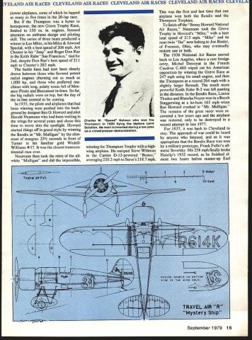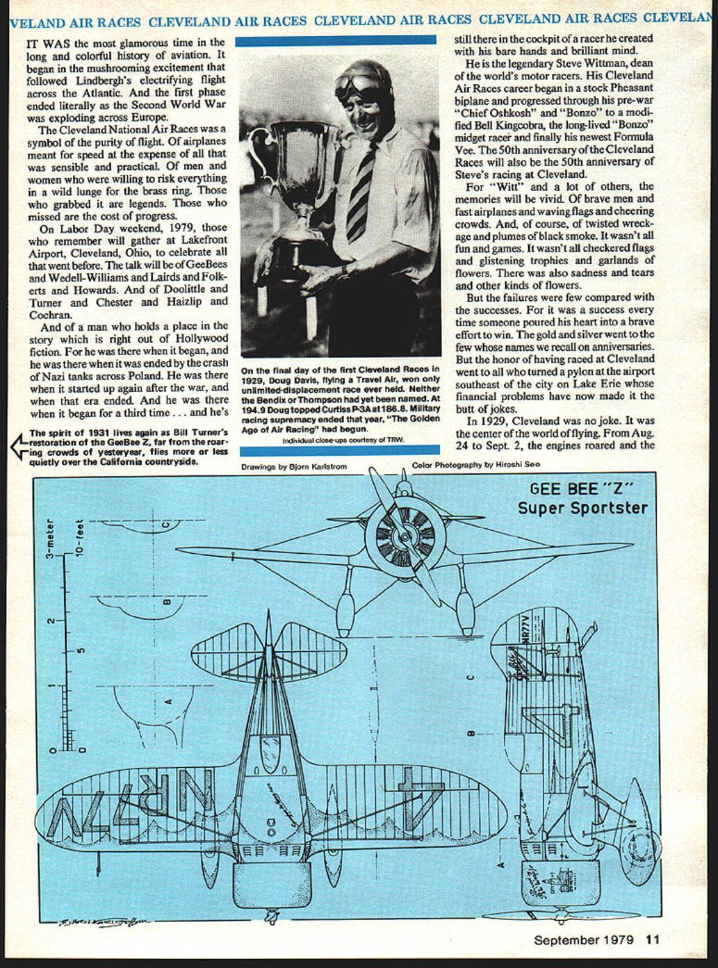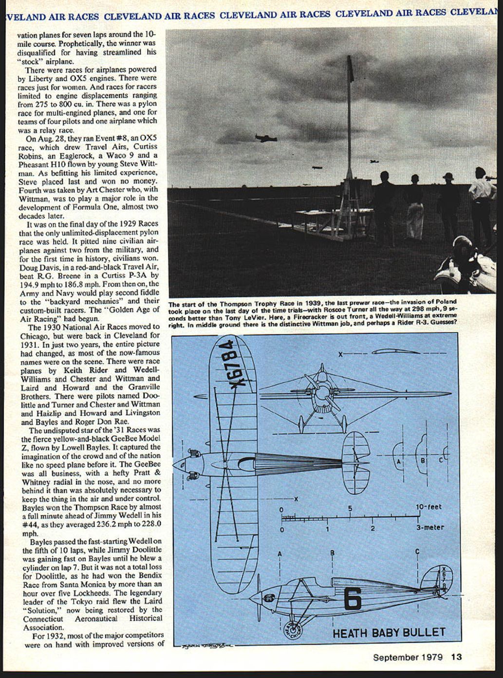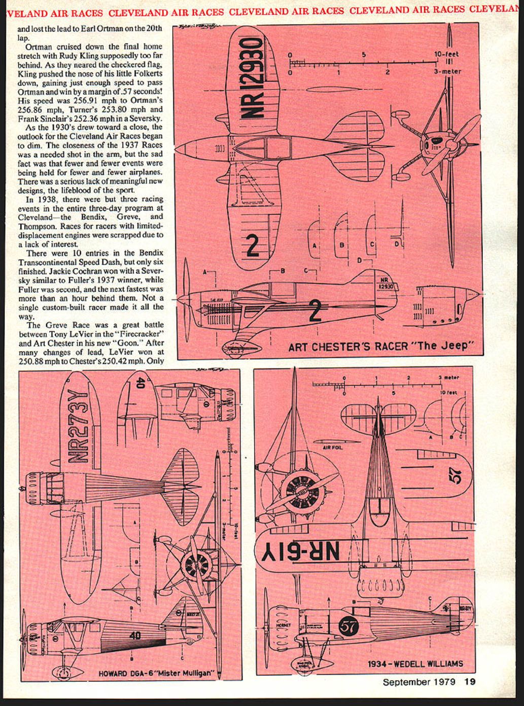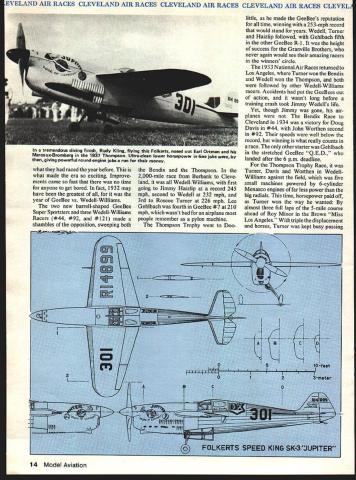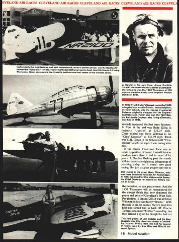 NO OCR TEXT VELAND AIR RACES CLEVELAND AIR RACES CLEVELAND AIR RACES CLEVELAND AIR RACES CLEVELM IT WAS glamorous time long colorful history aviation began mushrooming excitement followed Lindberghs electrilring flight across Atlantic first phase ended literally Second World War exploding across Europe Cleveland National Air Races symbol purity flight airplanes meant speed expense sensible practical men women willing risk everything wild lunge brass ring grabbed legends missed cost progress Labor Day weekend 1979 remember will gather Lakefront Airport Cleveland Ohio celebrate went before talk will GeeBees Wedell-Willianis Lairds Folk erts Howards Doolittle Turner Chester Haizlip Cochran man holds place story right out Hollywood fiction began ended crash Nazi tanks across Poland started up again after war era ended began third time. hes spirit 1931 lives again Bill Turners oration GeeBee Z far roar ing crowds yesteryeer flies less quietly over California countryside still cockpit racer created bare hands brilliant mind legendary Steve Wittman dean worlds motor racers Cleveland Air Races career began stock Pheasant biplane progressed through pre-war Chief Oshkosh Bonzo modi fied Bell Kingoobra long-lived Boazo midget racer finally newest Fonnula Vee 50th anniversary Cleveland Races will also 50th anniversary Steves racing Cleveland Witt lot others memories will vivid brave men fast airplanes waving flags cheering crowds course twisted wreck age plumes black smoke wasnt fun games wasnt checkered flags glistening trophies garlands flowers also sadness tears other kinds flowers failures few compared successes success time someone poured heart brave effort win gold silver went few names recall anniversaries honor having raced Cleveland went turned pylon airport southeast city Lake Erie financial problems have now made butt jokes 1929 Cleveland no joke center world flying Aug 24 Sept 2 engines roared Drawings Blorn Karistromcolor Photography Hiroahi Seo Super Sportster S E 0 0 N C 7m 0 IO ~ September1979 11 final day first Cleveland Races 1929 Doug Davis flying Travel Air won unlImIted-dIsplacement race ever held Neither Bendix orThompson yet named 1949 DougtoppedCurtissP3Aatl88S Military racing supremacy ended year Golden Age Air Racing begun IndMdual close-ups courtesy TRW VELAND AIR RACES CLEVELAND AIR RACES CLEVELAND AIR RACES CLEVELAND AIR RACES CLEVELI fans howled America riding high great surge enthusiasm aviation triggered Lindbergh being turned booming aircraft indus try flood new pilots two months time would collapse Great Depression now things couldnt have better feeling first Cleve land Air Races opened schedule 10 days racing stunt flying spot landing contests parachute jump ing efficiency races record attempts would forerunners two classic events American air racing Non-Stop Air Derby Los Angeles would become Bendix Race Free-For-All would become Thompson Trophy Race longest cross-country races 2000 miles California drew four entries failed finish another Roscoe Turner arrived after deadline winner flying Lockheed Air Express Henry Brown averaged 156 mph won largest single prize meet$5000 quite bundle days $78000 paid out sum recently reached Reno Air Races First pylon races second day dozen National Guard pilots flew Douglas 0-2 Curtiss 0-11 obser 12 Model Aviation Cleveland place August24 through September 2 1929 great surge enthusiasm triggered Undbergh turned booming aircraft industryand Great Depression still two months away Hordes people daring pilots fast airplanesand NaWs Los Angeles VELAND AIR RACES CLEVELAND AIR RACES CLEVELAND AIR RACES CLEVELAND AIR RACES CLEVELM vation planes seven laps around 10mile course Prophetically winner disqualified having streamlined stock airplane races airplanes powered Liberty OX5 engines races just women races racers limited engine displacements ranging 275 800 cu pylon race multi-engined planes teams four pilots airplane relay race Aug 28 ran Event #8 0X5 race drew Travel Airs Curtiss Robins Eaglerock Waco 9 Pheasant H1O flown young Steve Witt man As befitting limited experience Steve placed last won no money Fourth taken Art Chester Wittman play major role development Formula almost two decades later final day 1929 Races unlimited-displacement pylon race held pitted nine civilian air planes against two military first time history civilians won Doug Davis red-and-black Travel Air beat RG Breene Curtiss P-3A 1949 mph 1868 mph Army Navy would play second fiddle backyard mechanics start Thompson Trophy Race 1939 last prewar racethe inVasion Poland custom-built racers Golden Age took place last day time trialswith Roscoe Turner way 298 mph 9 soAir Racing begun conds better Tony LeVier Firecracker out front Wedell-Williams extreme 1930 National Air Races moved right middle ground distinctive Wittman Ioband perhaps Rider R-3 Guesses Chicago back Cleveland 1931 just two years entire picture changed now-famous names scene race planes Keith Rider Wedell Williams Chester Wittman Laird Howard Granville Brothers pilots named Doo little Turner Chester Wittman Haizlip Howard Livingston Bayles Roger Don Rae undisputed star 31 Races fierce yellow-and-black GeeBee Model Z flown Lowell Bayles captured imagination crowd nation like no speed plane before GeeBee business hefty Pratt & Whitney radial nose no behind absolutely necessary keep thing air under control Bayles won Thompson Race almost full minute ahead Jimmy Wedell #44 averaged 2362 mph 2280 mph Bayles passed fast-starting Wedell fifth 10 laps Jimmy Doolittle gaining fast Bayles until blew cylinder lap 7 total loss Doolittle won Bendix Race Santa Monica hour over five Lockheeds legendary leader Tokyo raid flew Laird Solution now being restored Connecticut Aeronautical Historical Association 1932 major competitors hand improved versions September 1979 13 EVELAND AIR RACES CLEVELAND AIR RACES CLEVELAND AIR RACES CLEVELAND AIR RACES CLEVELA what raced year before Bendix Thompson what made era exciting