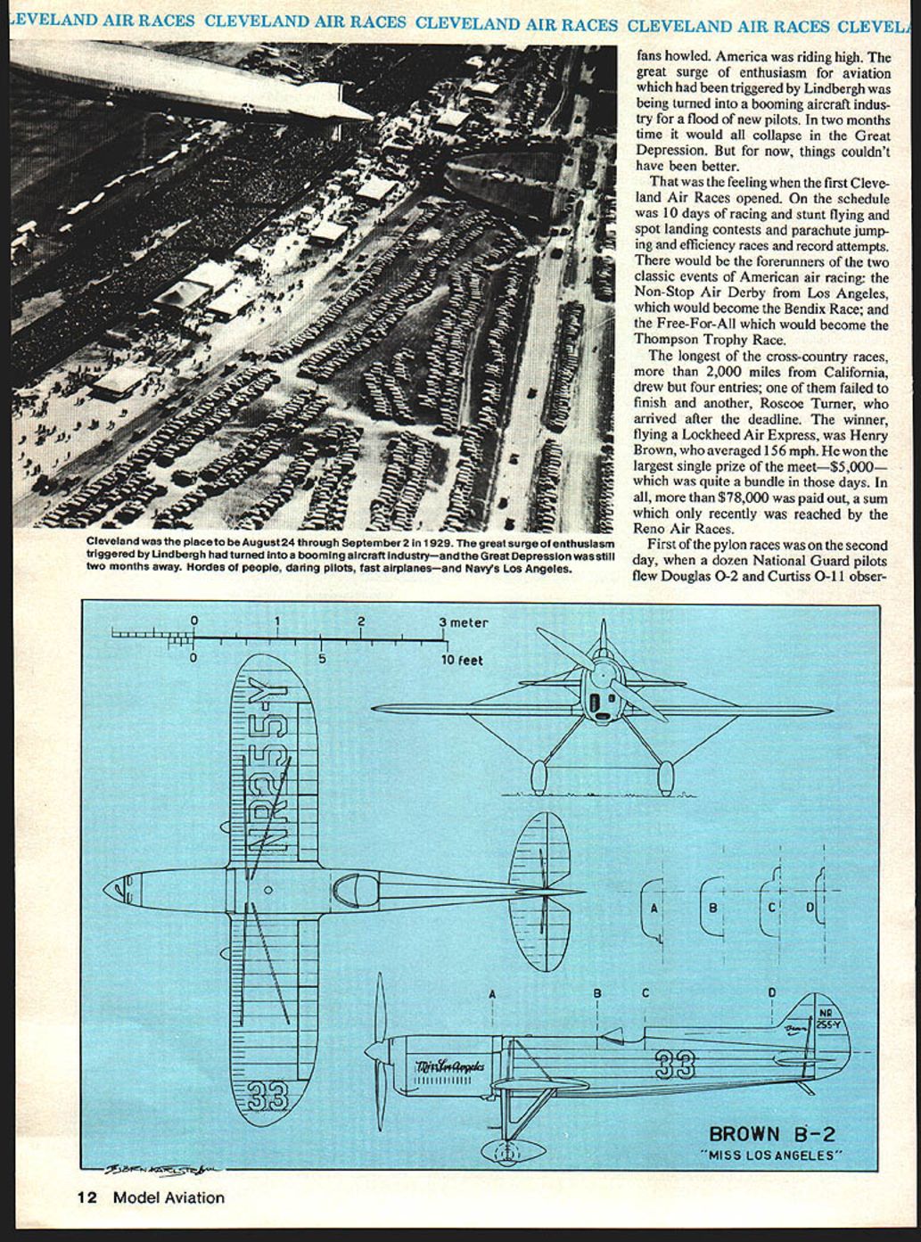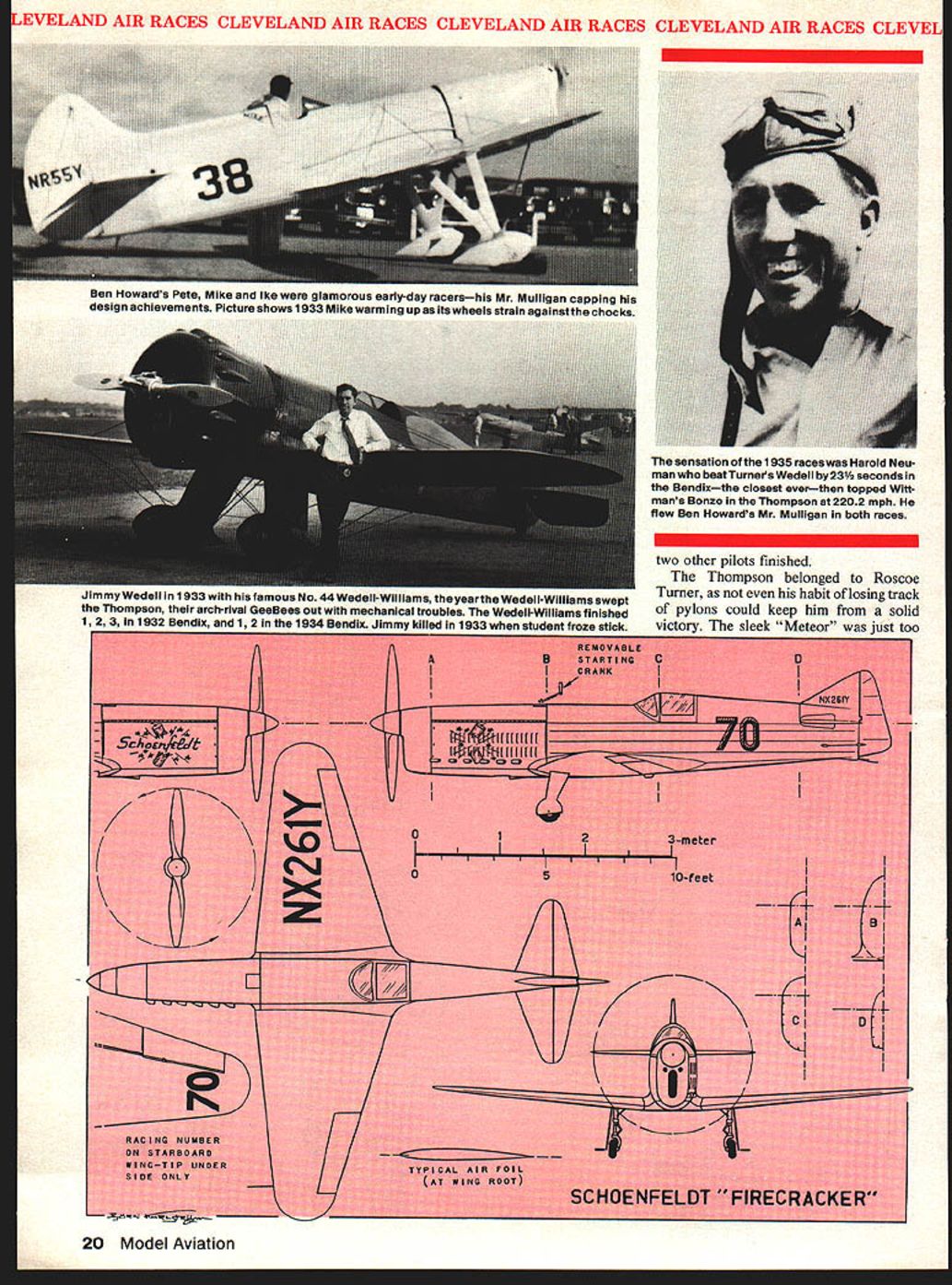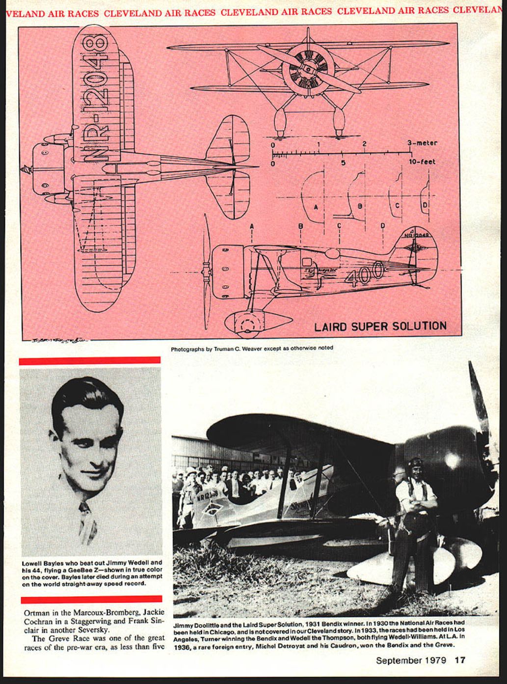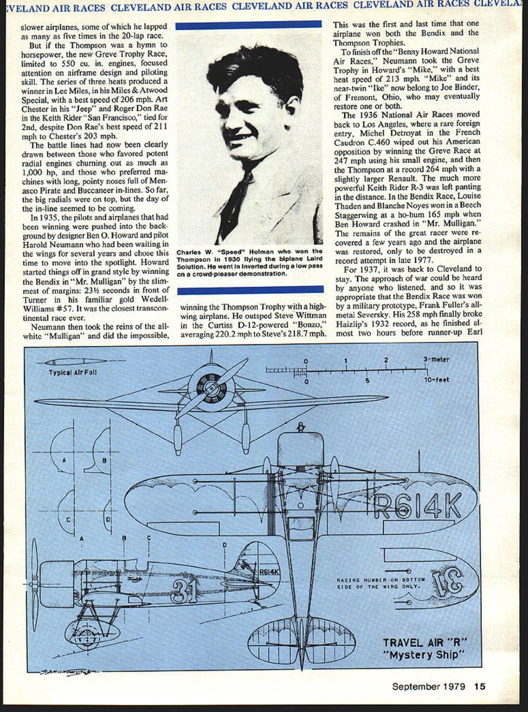 NO OCR TEXT VELAND AIR RACES CLEVELAND AIR RACES CLEVELAND AIR RACES CLEVELAND AIR RACES CLEVELM IT WAS glamorous time long colorful history aviation began mushrooming excitement followed Lindberghs electrilring flight across Atlantic first phase ended literally Second World War exploding across Europe Cleveland National Air Races symbol purity flight airplanes meant speed expense sensible practical men women willing risk everything wild lunge brass ring grabbed legends missed cost progress Labor Day weekend 1979 remember will gather Lakefront Airport Cleveland Ohio celebrate went before talk will GeeBees Wedell-Willianis Lairds Folk erts Howards Doolittle Turner Chester Haizlip Cochran man holds place story right out Hollywood fiction began ended crash Nazi tanks across Poland started up again after war era ended began third time. hes spirit 1931 lives again Bill Turners oration GeeBee Z far roar ing crowds yesteryeer flies less quietly over California countryside still cockpit racer created bare hands brilliant mind legendary Steve Wittman dean worlds motor racers Cleveland Air Races career began stock Pheasant biplane progressed through pre-war Chief Oshkosh Bonzo modi fied Bell Kingoobra long-lived Boazo midget racer finally newest Fonnula Vee 50th anniversary Cleveland Races will also 50th anniversary Steves racing Cleveland Witt lot others memories will vivid brave men fast airplanes waving flags cheering crowds course twisted wreck age plumes black smoke wasnt fun games wasnt checkered flags glistening trophies garlands flowers also sadness tears other kinds flowers failures few compared successes success time someone poured heart brave effort win gold silver went few names recall anniversaries honor having raced Cleveland went turned pylon airport southeast city Lake Erie financial problems have now made butt jokes 1929 Cleveland no joke center world flying Aug 24 Sept 2 engines roared Drawings Blorn Karistromcolor Photography Hiroahi Seo Super Sportster S E 0 0 N C 7m 0 IO ~ September1979 11 final day first Cleveland Races 1929 Doug Davis flying Travel Air won unlImIted-dIsplacement race ever held Neither Bendix orThompson yet named 1949 DougtoppedCurtissP3Aatl88S Military racing supremacy ended year Golden Age Air Racing begun IndMdual close-ups courtesy TRW VELAND AIR RACES CLEVELAND AIR RACES CLEVELAND AIR RACES CLEVELAND AIR RACES CLEVELI fans howled America riding high great surge enthusiasm aviation triggered Lindbergh being turned booming aircraft indus try flood new pilots two months time would collapse Great Depression now things couldnt have better feeling first Cleve land Air Races opened schedule 10 days racing stunt flying spot landing contests parachute jump ing efficiency races record attempts would forerunners two classic events American air racing Non-Stop Air Derby Los Angeles would become Bendix Race Free-For-All would become Thompson Trophy Race longest cross-country races 2000 miles California drew four entries failed finish another Roscoe Turner arrived after deadline winner flying Lockheed Air Express Henry Brown averaged 156 mph won largest single prize meet$5000 quite bundle days $78000 paid out sum recently reached Reno Air Races First pylon races second day dozen National Guard pilots flew Douglas 0-2 Curtiss 0-11 obser 12 Model Aviation Cleveland place August24 through September 2 1929 great surge enthusiasm triggered Undbergh turned booming aircraft industryand Great Depression still two months away Hordes people daring pilots fast airplanesand NaWs Los Angeles VELAND AIR RACES CLEVELAND AIR RACES CLEVELAND AIR RACES CLEVELAND AIR RACES CLEVELM vation planes seven laps around 10mile course Prophetically winner disqualified having streamlined stock airplane races airplanes powered Liberty OX5 engines races just women races racers limited engine displacements ranging 275 800 cu pylon race multi-engined planes teams four pilots airplane relay race Aug 28 ran Event #8 0X5 race drew Travel Airs Curtiss Robins Eaglerock Waco 9 Pheasant H1O flown young Steve Witt man As befitting limited experience Steve placed last won no money Fourth taken Art Chester Wittman play major role development Formula almost two decades later final day 1929 Races unlimited-displacement pylon race held pitted nine civilian air planes against two military first time history civilians won Doug Davis red-and-black Travel Air beat RG Breene Curtiss P-3A 1949 mph 1868 mph Army Navy would play second fiddle backyard mechanics start Thompson Trophy Race 1939 last prewar racethe inVasion Poland custom-built racers Golden Age took place last day time trialswith Roscoe Turner way 298 mph 9 soAir Racing begun conds better Tony LeVier Firecracker out front Wedell-Williams extreme 1930 National Air Races moved right middle ground distinctive Wittman Ioband perhaps Rider R-3 Guesses Chicago back Cleveland 1931 just two years entire picture changed now-famous names scene race planes Keith Rider Wedell Williams Chester Wittman Laird Howard Granville Brothers pilots named Doo little Turner Chester Wittman Haizlip Howard Livingston Bayles Roger Don Rae undisputed star 31 Races fierce yellow-and-black GeeBee Model Z flown Lowell Bayles captured imagination crowd nation like no speed plane before GeeBee business hefty Pratt & Whitney radial nose no behind absolutely necessary keep thing air under control Bayles won Thompson Race almost full minute ahead Jimmy Wedell #44 averaged 2362 mph 2280 mph Bayles passed fast-starting Wedell fifth 10 laps Jimmy Doolittle gaining fast Bayles until blew cylinder lap 7 total loss Doolittle won Bendix Race Santa Monica hour over five Lockheeds legendary leader Tokyo raid flew Laird Solution now being restored Connecticut Aeronautical Historical Association 1932 major competitors hand improved versions September 1979 13 EVELAND AIR RACES CLEVELAND AIR RACES CLEVELAND AIR RACES CLEVELAND AIR RACES CLEVELA what raced year before Bendix Thompson what made era exciting
