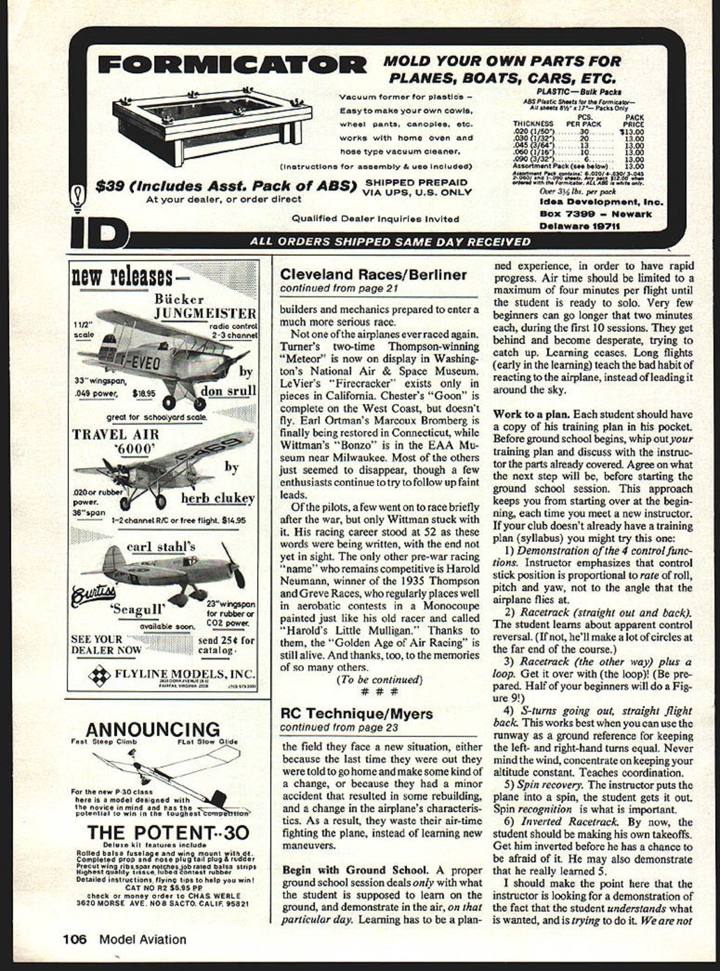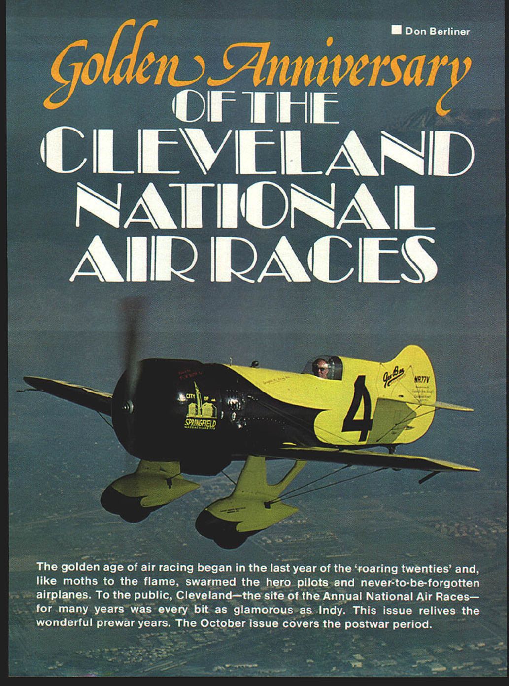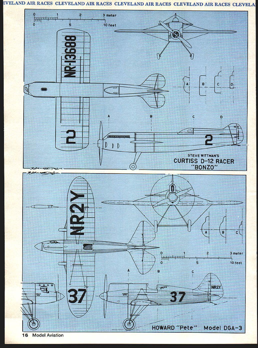 NO OCR TEXT VELAND AIR RACES CLEVELAND AIR RACES CLEVELAND AIR RACES CLEVELAND AIR RACES CLEVELM IT WAS glamorous time long colorful history aviation began mushrooming excitement followed Lindberghs electrilring flight across Atlantic first phase ended literally Second World War exploding across Europe Cleveland National Air Races symbol purity flight airplanes meant speed expense sensible practical men women willing risk everything wild lunge brass ring grabbed legends missed cost progress Labor Day weekend 1979 remember will gather Lakefront Airport Cleveland Ohio celebrate went before talk will GeeBees Wedell-Willianis Lairds Folk erts Howards Doolittle Turner Chester Haizlip Cochran man holds place story right out Hollywood fiction began ended crash Nazi tanks across Poland started up again after war era ended began third time. hes spirit 1931 lives again Bill Turners oration GeeBee Z far roar ing crowds yesteryeer flies less quietly over California countryside still cockpit racer created bare hands brilliant mind legendary Steve Wittman dean worlds motor racers Cleveland Air Races career began stock Pheasant biplane progressed through pre-war Chief Oshkosh Bonzo modi fied Bell Kingoobra long-lived Boazo midget racer finally newest Fonnula Vee 50th anniversary Cleveland Races will also 50th anniversary Steves racing Cleveland Witt lot others memories will vivid brave men fast airplanes waving flags cheering crowds course twisted wreck age plumes black smoke wasnt fun games wasnt checkered flags glistening trophies garlands flowers also sadness tears other kinds flowers failures few compared successes success time someone poured heart brave effort win gold silver went few names recall anniversaries honor having raced Cleveland went turned pylon airport southeast city Lake Erie financial problems have now made butt jokes 1929 Cleveland no joke center world flying Aug 24 Sept 2 engines roared Drawings Blorn Karistromcolor Photography Hiroahi Seo Super Sportster S E 0 0 N C 7m 0 IO ~ September1979 11 final day first Cleveland Races 1929 Doug Davis flying Travel Air won unlImIted-dIsplacement race ever held Neither Bendix orThompson yet named 1949 DougtoppedCurtissP3Aatl88S Military racing supremacy ended year Golden Age Air Racing begun IndMdual close-ups courtesy TRW VELAND AIR RACES CLEVELAND AIR RACES CLEVELAND AIR RACES CLEVELAND AIR RACES CLEVELI fans howled America riding high great surge enthusiasm aviation triggered Lindbergh being turned booming aircraft indus try flood new pilots two months time would collapse Great Depression now things couldnt have better feeling first Cleve land Air Races opened schedule 10 days racing stunt flying spot landing contests parachute jump ing efficiency races record attempts would forerunners two classic events American air racing Non-Stop Air Derby Los Angeles would become Bendix Race Free-For-All would become Thompson Trophy Race longest cross-country races 2000 miles California drew four entries failed finish another Roscoe Turner arrived after deadline winner flying Lockheed Air Express Henry Brown averaged 156 mph won largest single prize meet$5000 quite bundle days $78000 paid out sum recently reached Reno Air Races First pylon races second day dozen National Guard pilots flew Douglas 0-2 Curtiss 0-11 obser 12 Model Aviation Cleveland place August24 through September 2 1929 great surge enthusiasm triggered Undbergh turned booming aircraft industryand Great Depression still two months away Hordes people daring pilots fast airplanesand NaWs Los Angeles VELAND AIR RACES CLEVELAND AIR RACES CLEVELAND AIR RACES CLEVELAND AIR RACES CLEVELM vation planes seven laps around 10mile course Prophetically winner disqualified having streamlined stock airplane races airplanes powered Liberty OX5 engines races just women races racers limited engine displacements ranging 275 800 cu pylon race multi-engined planes teams four pilots airplane relay race Aug 28 ran Event #8 0X5 race drew Travel Airs Curtiss Robins Eaglerock Waco 9 Pheasant H1O flown young Steve Witt man As befitting limited experience Steve placed last won no money Fourth taken Art Chester Wittman play major role development Formula almost two decades later final day 1929 Races unlimited-displacement pylon race held pitted nine civilian air planes against two military first time history civilians won Doug Davis red-and-black Travel Air beat RG Breene Curtiss P-3A 1949 mph 1868 mph Army Navy would play second fiddle backyard mechanics start Thompson Trophy Race 1939 last prewar racethe inVasion Poland custom-built racers Golden Age took place last day time trialswith Roscoe Turner way 298 mph 9 soAir Racing begun conds better Tony LeVier Firecracker out front Wedell-Williams extreme 1930 National Air Races moved right middle ground distinctive Wittman Ioband perhaps Rider R-3 Guesses Chicago back Cleveland 1931 just two years entire picture changed now-famous names scene race planes Keith Rider Wedell Williams Chester Wittman Laird Howard Granville Brothers pilots named Doo little Turner Chester Wittman Haizlip Howard Livingston Bayles Roger Don Rae undisputed star 31 Races fierce yellow-and-black GeeBee Model Z flown Lowell Bayles captured imagination crowd nation like no speed plane before GeeBee business hefty Pratt & Whitney radial nose no behind absolutely necessary keep thing air under control Bayles won Thompson Race almost full minute ahead Jimmy Wedell #44 averaged 2362 mph 2280 mph Bayles passed fast-starting Wedell fifth 10 laps Jimmy Doolittle gaining fast Bayles until blew cylinder lap 7 total loss Doolittle won Bendix Race Santa Monica hour over five Lockheeds legendary leader Tokyo raid flew Laird Solution now being restored Connecticut Aeronautical Historical Association 1932 major competitors hand improved versions September 1979 13 EVELAND AIR RACES CLEVELAND AIR RACES CLEVELAND AIR RACES CLEVELAND AIR RACES CLEVELA what raced year before Bendix Thompson what made era exciting