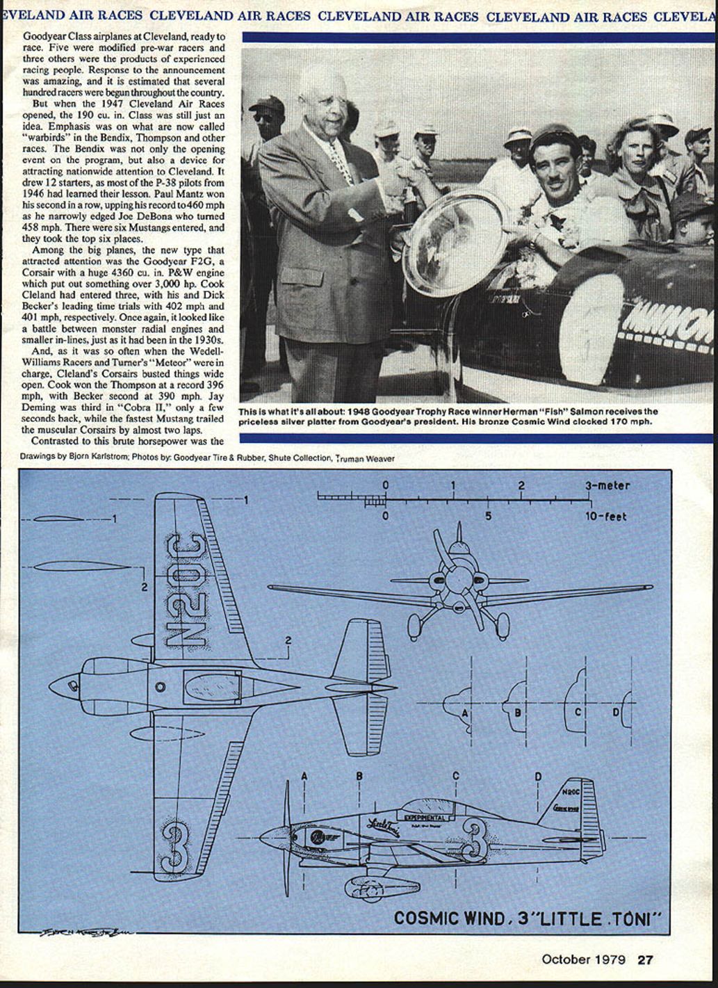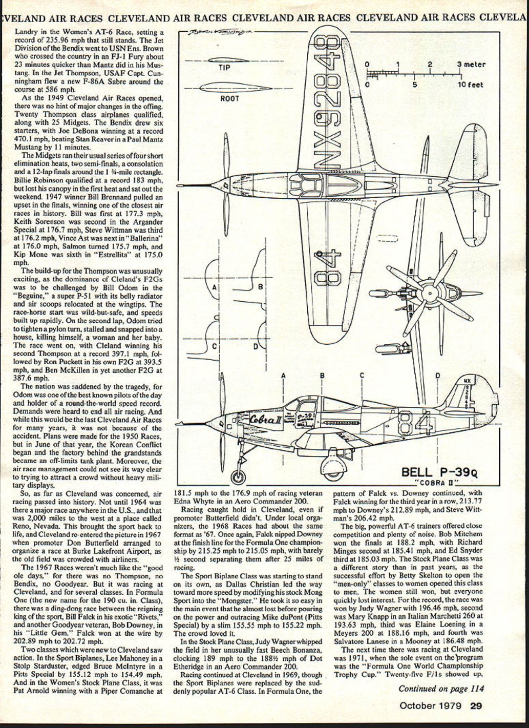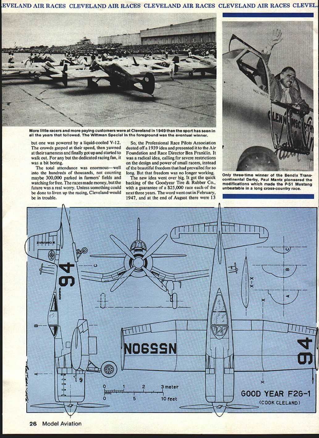 NO OCR TEXT EVELAND AIR RACES CLEVELAND AIR RACES CLEVELAND AIR RACES CLEVELAND AIR RACES CLEVEL war over races would never samethe old races died yet another war Korean conflict Lightflings Mustangs Corsairs Airacobras et al aboundedthen jets swooshed stage public grew bored pert Goodyears came lasting sensation finally coming down years cele brational racesand air racing appears destined remain part Amer ican aeronautical scene WHEN World War II ended life returned normal except very different kind normal war severe killed tens millions people nothing would ever same something innocent National Air Races expe 24 Model Aviation scene has changed action same pair little racing biplanes beardown Cleveland finish line coveted checkered flag backstretch new downtown racing plant over Lake Erie just 20-minute walk Public Square WELAND AIR RACES CLEVELAND AIR RACES CLEVELAND AIR RACES CLEVELAND AIR RACES CLEVEL rienced permanent drastic changes its prewar shape size sound single pre-war racing plane competed after war impossibly low-slung Crosby Racer entered Cleveland 1946 never showed remained few people Tony LeVier Steve Wittman Earl Ortman Art Chester backolder wiserbut no less eager So too Jackie Cochran Paul Mantz airplanes flew bore no similarity exciting machines raced few years before fact flight line Cleveland Hopkins Airport looked like bunch gremlins slipped previous night sprayed red blue yellow paint over Army Navys best fighter planes what everyone would fly Civilianized P-38 Lightnings P-39 Airacobras P-S 1 Mustangs P-63 King cobras F4U Corsairs werent racers course much faster anything Clevelands pylons ever seen cheap low-time Mustang could bought Government forSi O00 could walk down line pick wanted great airplanes little need Uncle Sam tried unload surplus legion war-trained pilots never wanted see military airplane again few did showed up Cleveland Labor Day weekend 1946 quantity did fans special opportunity see famed fighters action maybe settle some old arguments about fastest argument still goes Inline hallowed tradition weekend speed began Bendix Race Los Angeles entry list longest ever 14 P-38s 4 P-51s 2 P-63s Corsair Douglas A-26 Two veterans old days readyCochran Mantzwith beauti fully cleaned-up Mustangs other well-known figure line-up Indian apolis 500 racer Rex Mays P-38 sad day loved custombuilt racers old 16th-place finisher broke Frank Fullers pre-war record solid 40 mph winner covering 2048 miles less five hours Paul Mantz P-5 1 C its wings sealed filled gas could make run non-stop drag-producing drop tanks averaged 4355 mph adding whopping 153 mph old record Cochran second 421 mph four Mustangs took first four places obvious Thompson Trophy Race would just different Alvin Tex Johnston later Boeings chief test pilot ruled time trials souped-up P-39Q Cobra II lap 409 mph led race start finish setting record 3739 mph 90 mph faster Roscoe Turners best seven years before big surprise Tony LeVier now Lockheed test pilot pushed big red P-38 second place ahead Mustangs Earl Ortman 20 seconds back LeVier finish Steve Wittman managed work way up 8th place nearly-stock Kingcobra Ten 12 starters finished race thanks airframes engines proven under wartime conditions delicate souped-up engines flimsy landing gears pre-war racers thing past Unfortunately individuality per sonality airplanes 1946 looked pretty much alike sounded lot alike October 1979 25 King Goodyear Midgets 105-lb Bill Bren nand won two precious trophies flying Steve Wlttmans Bustef now display National Air & Space Museum IEVELAND AIR RACES CLEVELAND AIR RACES CLEVELAND AIR RACES CLEVELAND AIR RACES CLEVEL little racers paying customers Cleveland 1949 sport has seen years followed Wittman Special foreground eventual winner powered liquid-cooled V-12 crowds gasped speed yawned sameness finally got up started walk out dedicated racing fan bit boring total attendance enormouswell hundreds thousands counting maybe 300000 parked farmers fields watching free races made money future real worry Unless something could done liven up racing Cleveland would trouble T So Professional Race Pilots Association dusted ofla 1939 idea presented Air Foundation Race Director Ben Franidin radical idea calling severe restrictions design power small racers instead beautiful freedom prevailed long freedom no longer working new idea went over big got quick backing Goodyear Tire & Rubber Co guarantee $25000 race next three years word went out February 1947 end August 13 Only three-time winner Bendix Trans continental Derby Paul Mantz pioneered modifications made P-51 Mustang unbeatable long cross-country race 26 Model Aviation VELAND AIR RACES CLEVELAND AIR RACES CLEVELAND AIR RACES CLEVELAND AIR RACES CLEVELAI Goodyear Class airplanes Cleveland ready race Five modified pre-war racers three others products experienced racing people Response announcement amazing estimated several hundred racers begun throughout country 1947 Cleveland Air Races opened 190 cu Class still just idea Emphasis what now called warbirds Bendix Thompson other races Bendix opening event program also device attracting nationwide attention Cleveland drew 12 starters P-38 pilots 1946 learned lesson Paul Mantz won second row upping record 460 mph narrowly edged Joe DeBona turned 458 mph six Mustangs entered took top six places Among big planes new type attracted attention Goodyear F2G Corsair huge 4360 cu P&W engine put out something over 3000 hp Cook Cleland entered three Dick Beckers leading time trials 402 mph 401 mph respectively Once again looked like battle between monster radial engines smaller in-lines just 1 930s often Wedell Williams Racers Turners Meteor charge Clelands Corsalrs busted things wide open Cook won Thompson record 396 mph Becker second 390 mph Jay Deming third Cobra II few seconds back fastest Mustang trailed muscular Corsairs almost two laps Contrasted brnte horsepower Drawings Biorn Karistrom Photoa Goodyear Tire & Rubber Shute Collecti