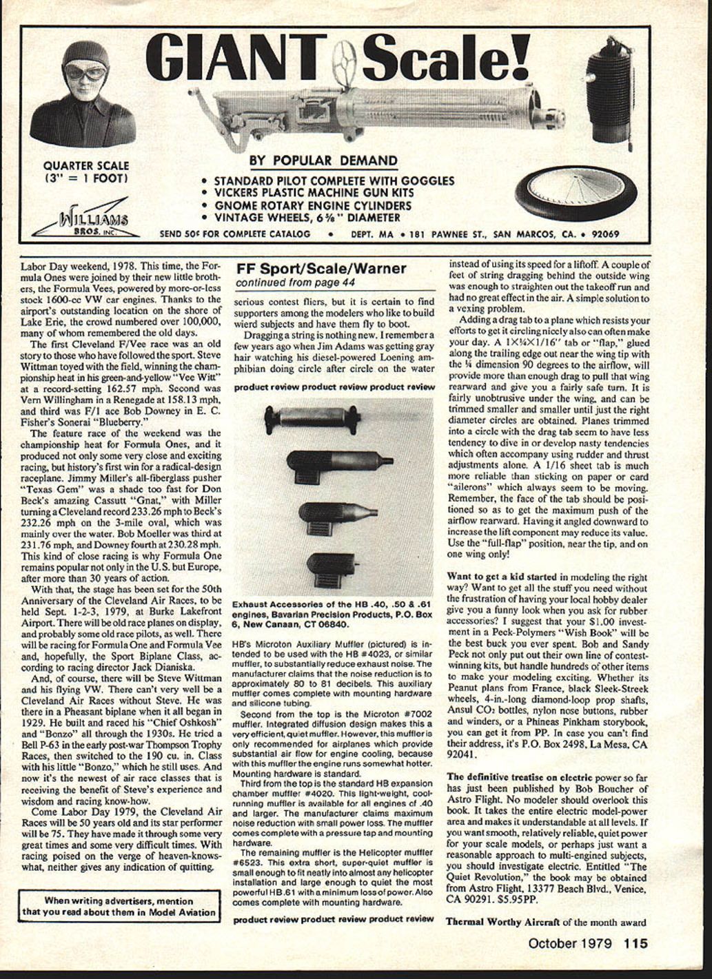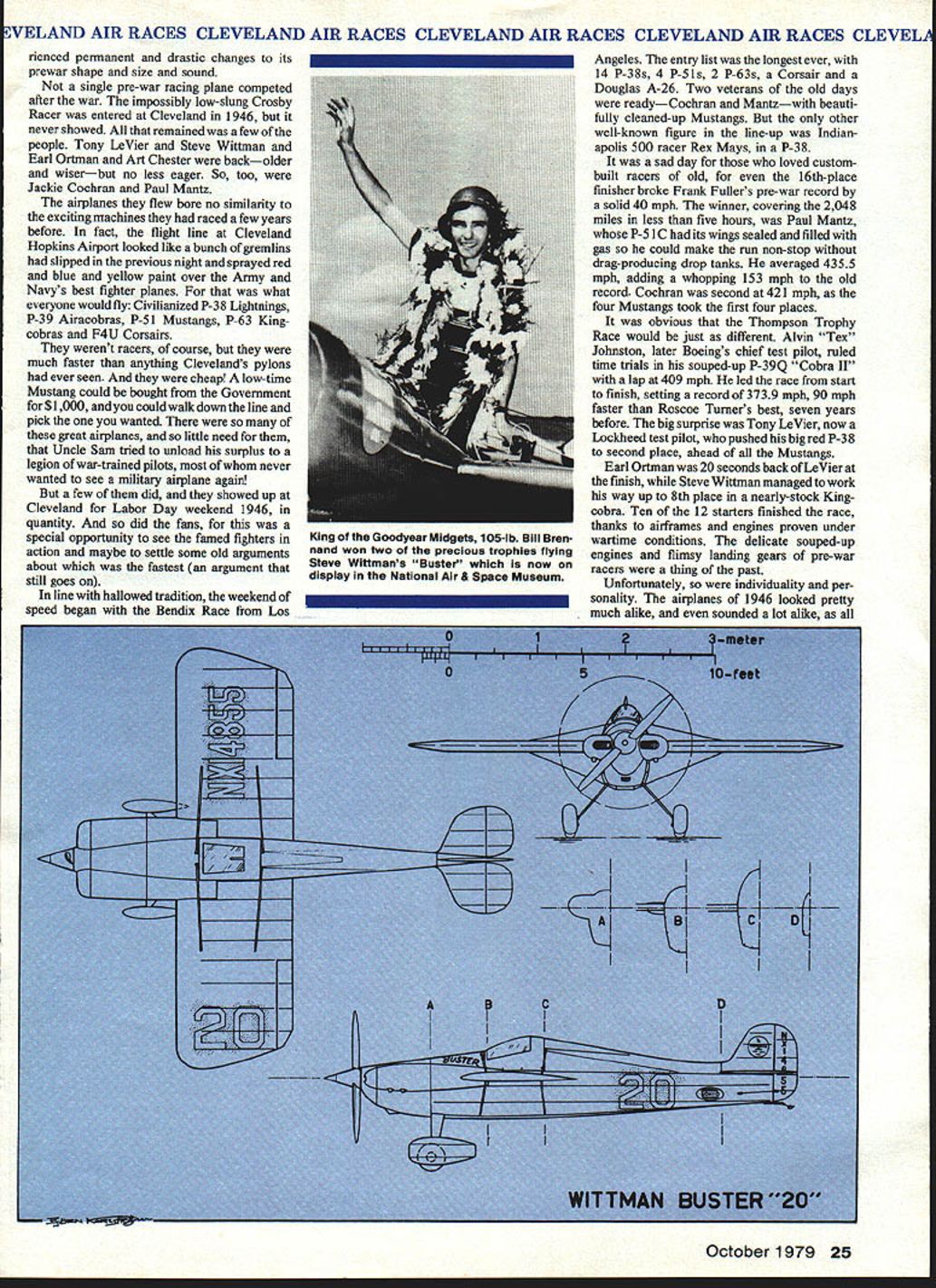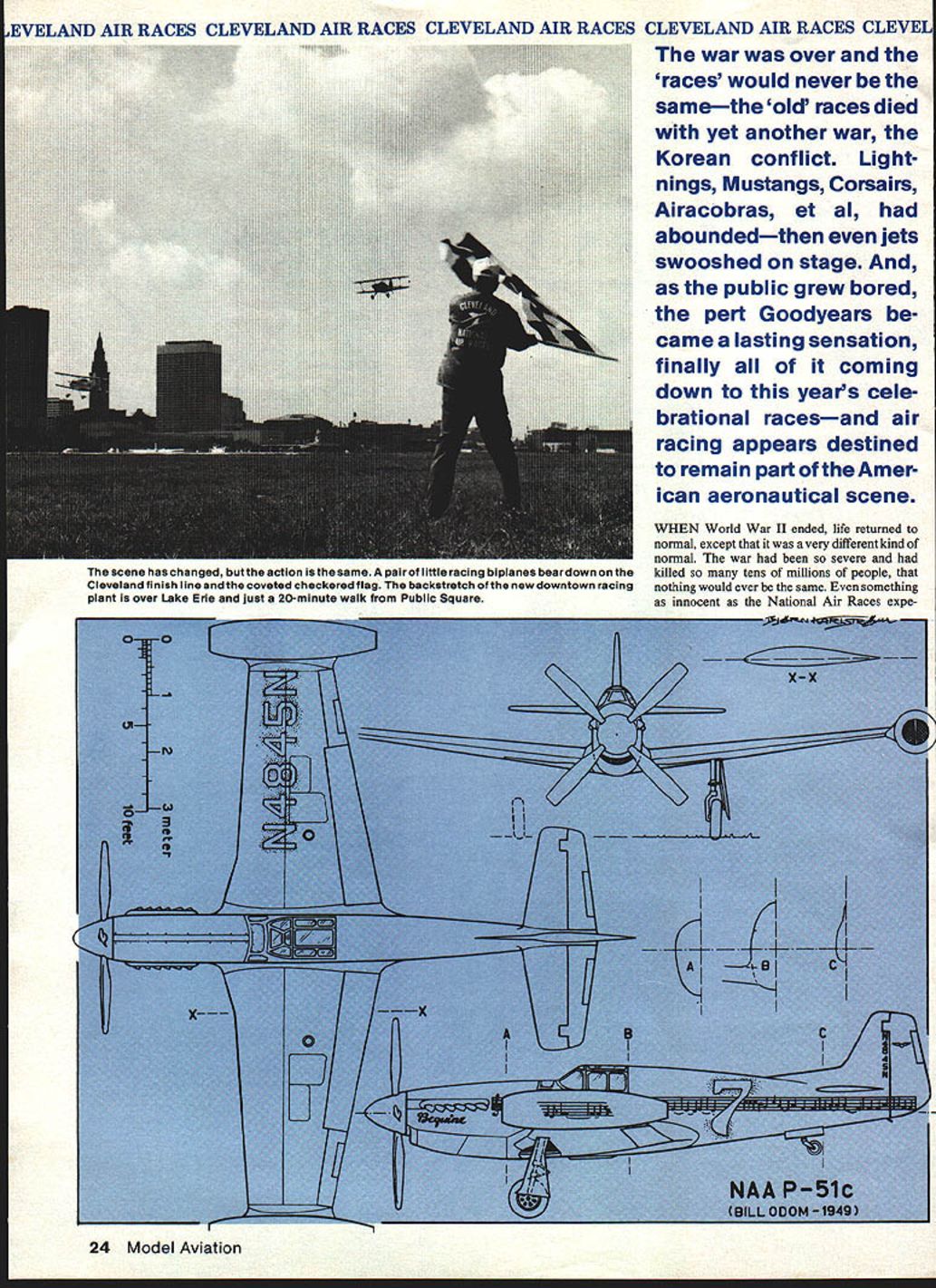 NO OCR TEXT EVELAND AIR RACES CLEVELAND AIR RACES CLEVELAND AIR RACES CLEVELAND AIR RACES CLEVEL war over races would never samethe old races died yet another war Korean conflict Lightflings Mustangs Corsairs Airacobras et al aboundedthen jets swooshed stage public grew bored pert Goodyears came lasting sensation finally coming down years cele brational racesand air racing appears destined remain part Amer ican aeronautical scene WHEN World War II ended life returned normal except very different kind normal war severe killed tens millions people nothing would ever same something innocent National Air Races expe 24 Model Aviation scene has changed action same pair little racing biplanes beardown Cleveland finish line coveted checkered flag backstretch new downtown racing plant over Lake Erie just 20-minute walk Public Square WELAND AIR RACES CLEVELAND AIR RACES CLEVELAND AIR RACES CLEVELAND AIR RACES CLEVEL rienced permanent drastic changes its prewar shape size sound single pre-war racing plane competed after war impossibly low-slung Crosby Racer entered Cleveland 1946 never showed remained few people Tony LeVier Steve Wittman Earl Ortman Art Chester backolder wiserbut no less eager So too Jackie Cochran Paul Mantz airplanes flew bore no similarity exciting machines raced few years before fact flight line Cleveland Hopkins Airport looked like bunch gremlins slipped previous night sprayed red blue yellow paint over Army Navys best fighter planes what everyone would fly Civilianized P-38 Lightnings P-39 Airacobras P-S 1 Mustangs P-63 King cobras F4U Corsairs werent racers course much faster anything Clevelands pylons ever seen cheap low-time Mustang could bought Government forSi O00 could walk down line pick wanted great airplanes little need Uncle Sam tried unload surplus legion war-trained pilots never wanted see military airplane again few did showed up Cleveland Labor Day weekend 1946 quantity did fans special opportunity see famed fighters action maybe settle some old arguments about fastest argument still goes Inline hallowed tradition weekend speed began Bendix Race Los Angeles entry list longest ever 14 P-38s 4 P-51s 2 P-63s Corsair Douglas A-26 Two veterans old days readyCochran Mantzwith beauti fully cleaned-up Mustangs other well-known figure line-up Indian apolis 500 racer Rex Mays P-38 sad day loved custombuilt racers old 16th-place finisher broke Frank Fullers pre-war record solid 40 mph winner covering 2048 miles less five hours Paul Mantz P-5 1 C its wings sealed filled gas could make run non-stop drag-producing drop tanks averaged 4355 mph adding whopping 153 mph old record Cochran second 421 mph four Mustangs took first four places obvious Thompson Trophy Race would just different Alvin Tex Johnston later Boeings chief test pilot ruled time trials souped-up P-39Q Cobra II lap 409 mph led race start finish setting record 3739 mph 90 mph faster Roscoe Turners best seven years before big surprise Tony LeVier now Lockheed test pilot pushed big red P-38 second place ahead Mustangs Earl Ortman 20 seconds back LeVier finish Steve Wittman managed work way up 8th place nearly-stock Kingcobra Ten 12 starters finished race thanks airframes engines proven under wartime conditions delicate souped-up engines flimsy landing gears pre-war racers thing past Unfortunately individuality per sonality airplanes 1946 looked pretty much alike sounded lot alike October 1979 25 King Goodyear Midgets 105-lb Bill Bren nand won two precious trophies flying Steve Wlttmans Bustef now display National Air & Space Museum IEVELAND AIR RACES CLEVELAND AIR RACES CLEVELAND AIR RACES CLEVELAND AIR RACES CLEVEL little racers paying customers Cleveland 1949 sport has seen years followed Wittman Special foreground eventual winner powered liquid-cooled V-12 crowds gasped speed yawned sameness finally got up started walk out dedicated racing fan bit boring total attendance enormouswell hundreds thousands counting maybe 300000 parked farmers fields watching free races made money future real worry Unless something could done liven up racing Cleveland would trouble T So Professional Race Pilots Association dusted ofla 1939 idea presented Air Foundation Race Director Ben Franidin radical idea calling severe restrictions design power small racers instead beautiful freedom prevailed long freedom no longer working new idea went over big got quick backing Goodyear Tire & Rubber Co guarantee $25000 race next three years word went out February 1947 end August 13 Only three-time winner Bendix Trans continental Derby Paul Mantz pioneered modifications made P-51 Mustang unbeatable long cross-country race 26 Model Aviation VELAND AIR RACES CLEVELAND AIR RACES CLEVELAND AIR RACES CLEVELAND AIR RACES CLEVELAI Goodyear Class airplanes Cleveland ready race Five modified pre-war racers three others products experienced racing people Response announcement amazing estimated several hundred racers begun throughout country 1947 Cleveland Air Races opened 190 cu Class still just idea Emphasis what now called warbirds Bendix Thompson other races Bendix opening event program also device attracting nationwide attention Cleveland drew 12 starters P-38 pilots 1946 learned lesson Paul Mantz won second row upping record 460 mph narrowly edged Joe DeBona turned 458 mph six Mustangs entered took top six places Among big planes new type attracted attention Goodyear F2G Corsair huge 4360 cu P&W engine put out something over 3000 hp Cook Cleland entered three Dick Beckers leading time trials 402 mph 401 mph respectively Once again looked like battle between monster radial engines smaller in-lines just 1 930s often Wedell Williams Racers Turners Meteor charge Clelands Corsalrs busted things wide open Cook won Thompson record 396 mph Becker second 390 mph Jay Deming third Cobra II few seconds back fastest Mustang trailed muscular Corsairs almost two laps Contrasted brnte horsepower Drawings Biorn Karistrom Photoa Goodyear Tire & Rubber Shute Collecti