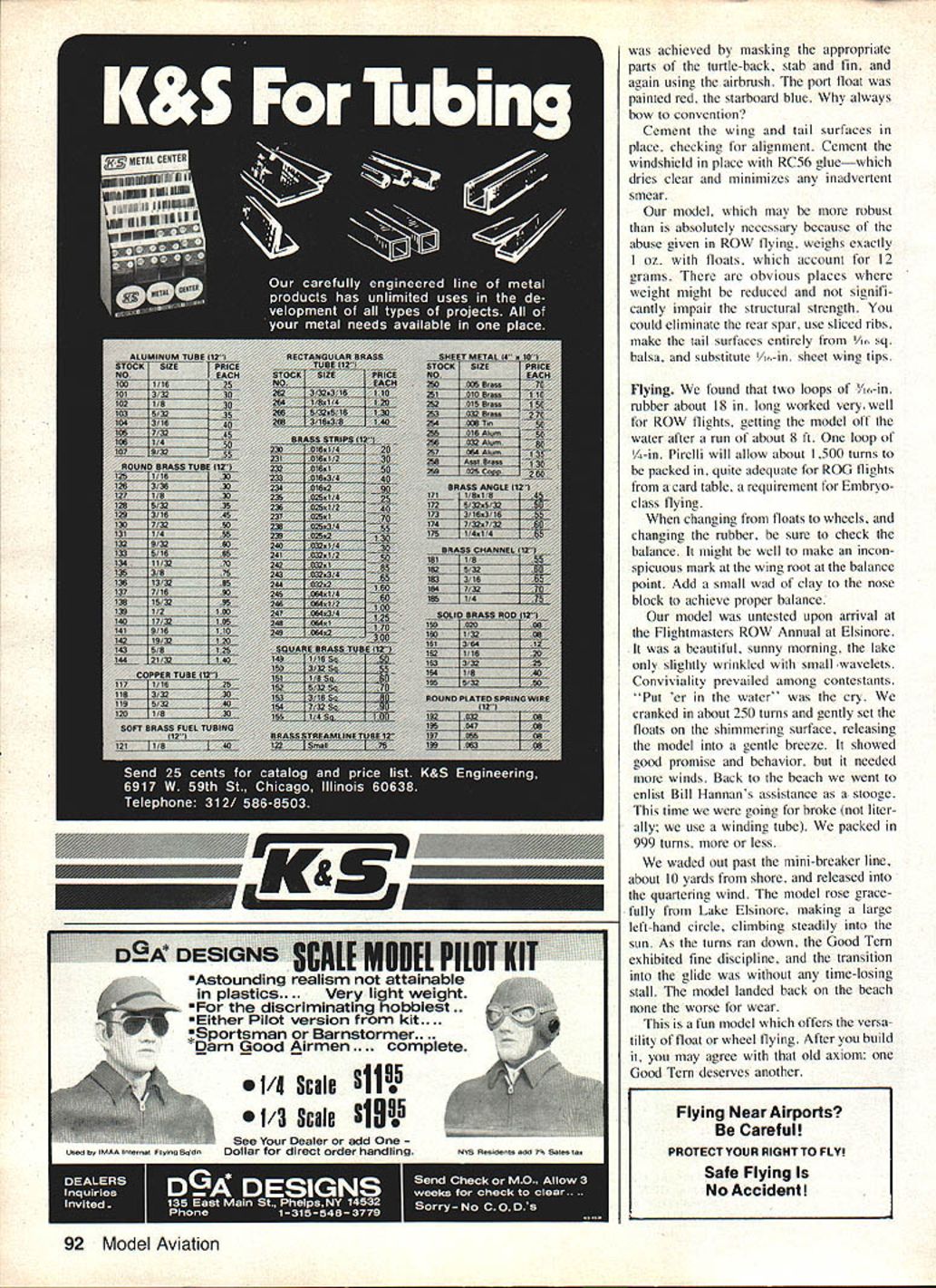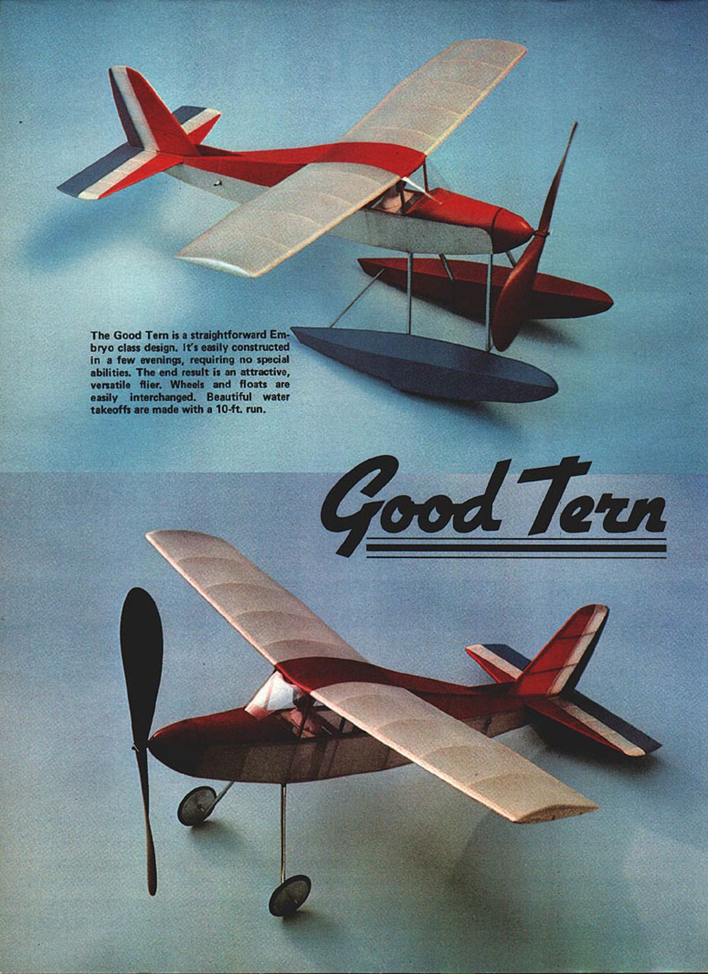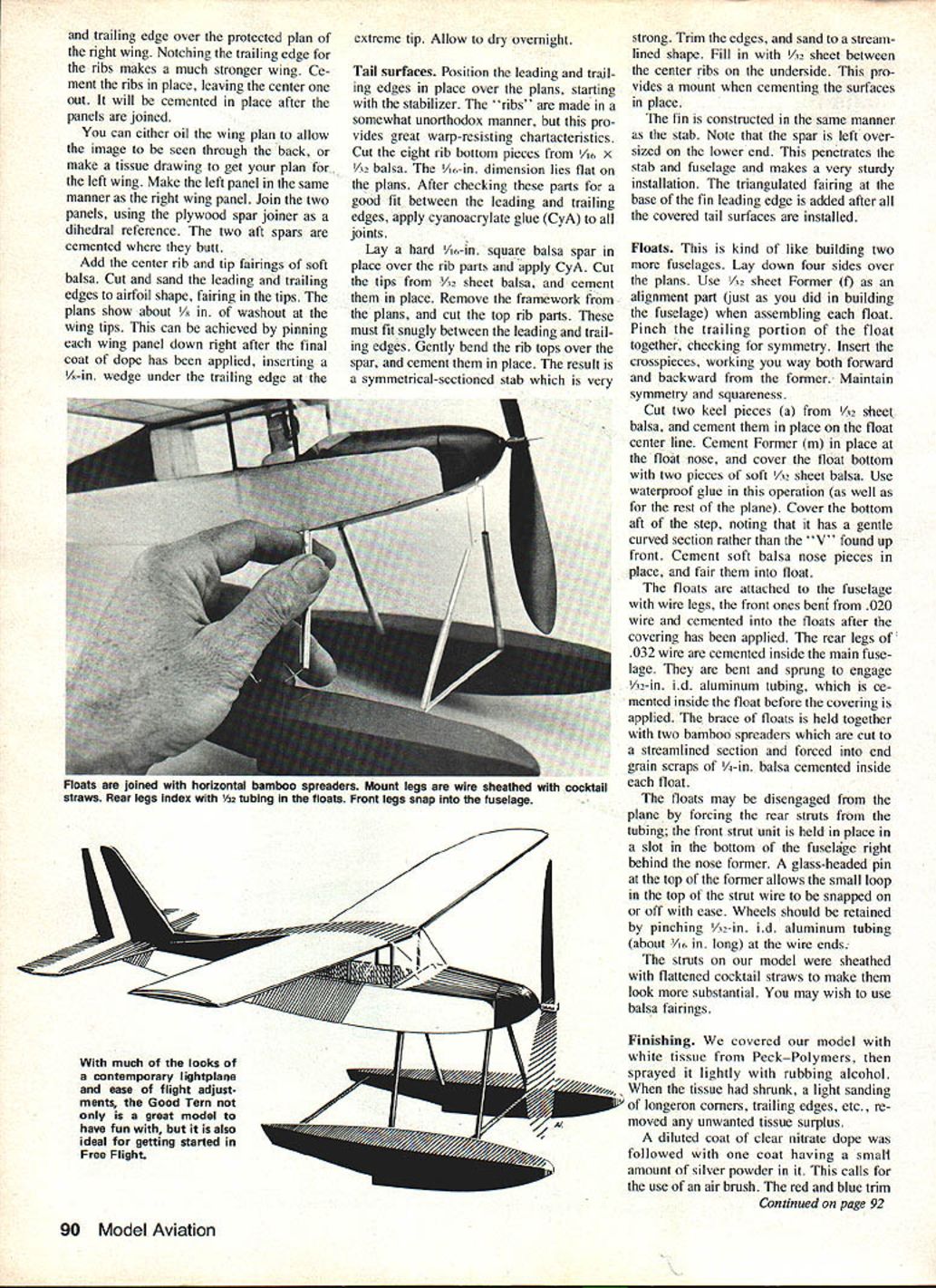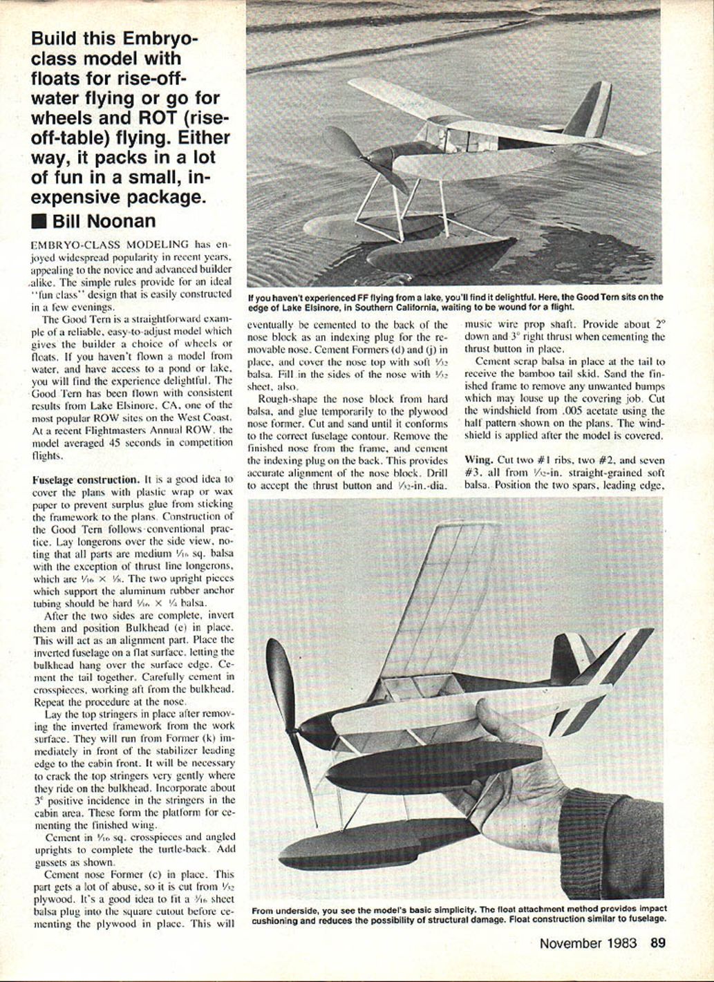 NO OCR TEXT Build Embryoclass model floats rise-offwater flying go wheels ROT rise off-table flying Either way packs lot fun small expensive package Bill Noonan EMBRYO CLASS MODELING has en joyed widespread popularity recent years appealing novice advanced builder alike simple rules provide ideal fun class design easily constructed few evenings Good Tern straightforward exam ple reliable easy-to-adjust model gives builder choice wheels floats havent flown model water have access pond lake will find experience delightful Good Tern has flown consistent results Lake Elsinore CA popular ROW sites West Coast recent Flightmasters Annual ROW model averaged 45 seconds competition flights Fuselage construction good idea cover plans plastic wrap wax paper prevent surplus glue sticking framework plans Construction Good Tern follows conventional prac tice Lay longerons over side view no ting parts medium /~ sq balsa exception thrust line longerons /i x /x two upright pieces support aluminum rubber anchor tubing should hard /16 X a After two sides complete invert position Bulkhead e place will act alignment part Place inverted fuselage flat surface letting bulkhead hang over surface edge Ce ment tail together Carefully cement crosspieces working aft bulkhead Repeat procedure nose Lay top stringers place after remov ing inverted framework work surface will run Former k im mediately front stabilizer leading edge cabin front will necessary crack top stringers very gently ride bulkhead Incorporate about 30 positive incidence stringers cabin area form platform ce menting finished wing Cement /6 sq crosspieces angled uprights complete turtle-back Add gussets shown Cement nose Former c place [his part gets lot abuse cut /32 plywood Its good idea fit /6 sheet balsa plug square cutout before ce menting plywood place will eventually cemented back nose block indexing plug re movable nose Cement Formers d j place cover nose top soft A2 balsa Fill sides nose /32 sheet also Rough-shape nose block hard balsa glue temporarily plywood nose former Cut sand until conforms correct fuselage contour Remove finished nose frame cement indexing plug back provides accurate alignment nose block Drill accept thrust button /32-in -dia music wire prop shaft Provide about 20 down 30 right thrust cementing thrust button place Cement scrap balsa place tail receive bamboo tail skid Sand fin ished frame remove unwanted bumps may louse up covering job Cut windshield 005 acetate using half pattern shown plans wind shield applied after model covered Wing Cut two #1 ribs two #2 seven #3 /32-in straight-grained soft balsa Position two spars leading edge November 1983 89 havent experienced FF flying lake youll find delightful Good Tern sits edge Lake Elsinore Southern California waiting wound flight underside see models basic simplicity float attachment method provides Impact cushioning reduces possibility structural damage Float construction similar fuselage trailing edge over protected plan right wing Notching trailing edge ribs makes much stronger wing Ce ment ribs place leaving center out will cemented place after panels joined can either oil wing plan allow image seen through back make tissue drawing get plan for. left wing Make left panel same manner right wing panel Join two panels using plywood spar joiner dihedral reference two aft spars cemented butt Add center rib tip fairings soft balsa Cut sand leading trailing edges airfoil shape fairing tips plans show about /x washout wing tips can achieved pinning wing panel down right after final coat dope has applied inserting A-in wedge under trailing edge much looks contemporary Iightplane ease flight adjust ments Good Tern great model have fun also ideal getting started Free Flight extreme tip Allow dry overnight Tail surfaces Position leading trail ing edges place over plans starting stabilizer ribs made somewhat unorthodox manner pro vides great warp-resisting chartacteristics Cut eight rib bottom pieces /6 X /3 balsa lu-in dimension lies flat plans After checking parts good fit between leading trailing edges apply cyanoacrylate glue CyA joints Lay hard Vi6-in square balsa spar place over rib parts apply CyA Cut tips /3 sheet balsa cement place Remove framework plans cut top rib parts must fit snugly between leading trail ing edges Gently bend rib tops over spar cement place result symmetrical-sectioned stab very strong Trim edges sand stream lined shape Fill /32 sheet between center ribs underside pro vides mount cementing surfaces place fin constructed same manner stab Note spar left over sized lower end penetrates stab fuselage makes very sturdy installation triangulated fairing base fin leading edge added after covered tail surfaces installed Floats kind like building two fuselages Lay down four sides over plans Use /3 sheet Former f alignment part just did building fuselage assembling float Pinch trailing portion float together checking symmetry Insert crosspieces working way both forward backward former Maintain symmetry squareness Cut two keel pieces /3 sheet balsa cement place float center line Cement Former in place float nose cover float bottom two pieces soft /3 sheet balsa Use waterproof glue operation well rest plane Cover bottom aft step noting has gentle curved section rather V found up front Cement soft balsa nose pieces place fair float floats attached fuselage wire legs front ones benf 020 wire cemented floats after covering has applied rear legs 032 wire cemented inside main fuse lage bent sprung engage /32-in id aluminum tubing ce mented inside float before covering applied brace floats held together two bamboo spreaders cut streamlined section forced end grain scraps /3-in balsa cemented inside float floats may disengaged plane forcing rear struts tubing front strut unit held place slot bottom fusekige right behind nose former glass-headed pin top former allows small loop top strut wire snapped off ease Wheels should retained pinching /3-in id aluminum tubing abo