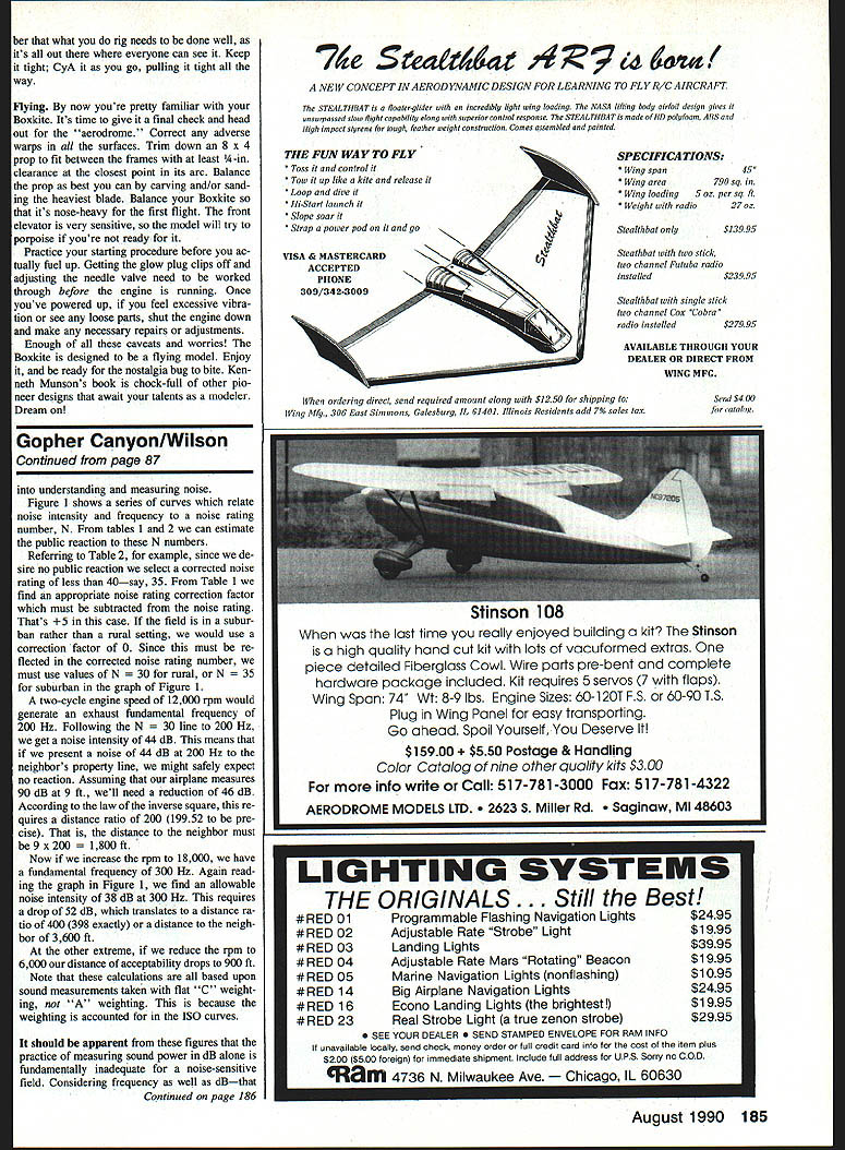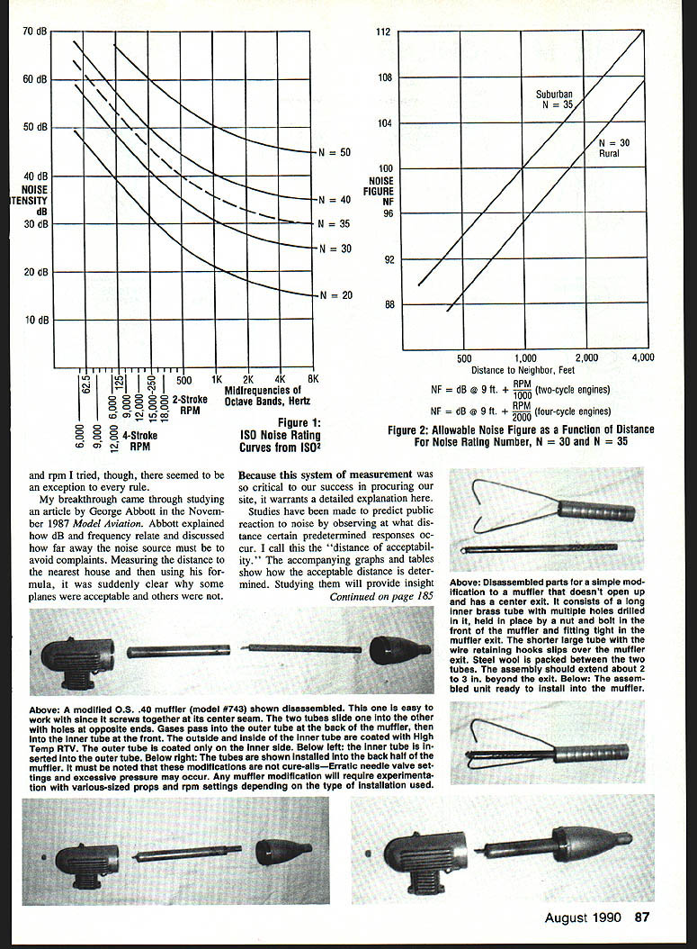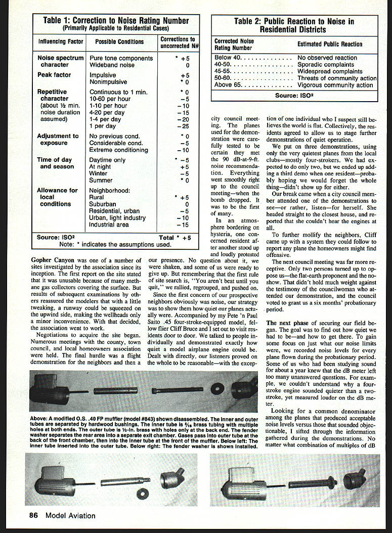 In age urbanization modelers take sophisti cated whole-sound approach measuring noise have edge achieving quiet flight San Diego club association won fly ing site partly doing just EJames Wilson LIKE MANY another success story grew out hard work innovation perseverance story Gopher Canyon about dedicated group RC fliers overcame local opposition secure muchneeded club flying site happened San Diego makes notable achievement large crowded city like San Diego finding flying site isnt close prox imity residential areas difficult indeed San Diego also very fast-growing city field long-term potential rare commodity Compounding challenge city surrounded mountains ocean plus side however San Diego fliers fortunate having active asso ciation flying clubs going gets tough tough get organized Spear headed Dennis Caudle local clubs banded together unified front 1986 association acts liaison county other land-controlling organizations Top picture Looking down new Gopher Canyon flying site white streaks photo methane gas collector pipes belonging methane gas generating facility shares site Above author manipulating homemade engine dynometer Cliff Bruce assisting background Note homemade test stand long rubber hose connected exhaust remove much exhaust noise possible test site August 1990 85 ian Maclaughlin ready takeoff new gravel surface proximity houses background main reason Go pher Canyon such noise-sensitIve site Table 1 Correction Noise Rating Number Primarily Applicable Residential Cases lnfiuencing FactorPossible ConditionsCorrections uncorrected N# Noise spectrumPure tone components* aracterWideband noise0 Peak factorImpulsive5 Nonimpuisive* 0 RepetitiveContinuous 1 mm* 0 character10-60 per hour5 about 10 per hour10 noise duration4-20 per day15 assumed1-4 per day20 1 per day25 Adjustment toNo previous cond* 0 exposureConsiderable cond5 Extreme conditioning10 Time dayDaytime only* seasonAt night5 Winter5 Summer* 0 Allowance forNeighborhood localRural* 5 conditionsSuburban0 Residential urban5 Urban light industry10 Industrial area15 Source 1502Total * te * indicates assumptions used Gopher Canyon number sites investigated association since its inception first report site stated unusable because meth ane gas collectors covering surface results subsequent examinations oth ers reassured modelers little tweaking runway could squeezed upwind side making weliheads minor inconvenience decided association went work Negotiations acquire site began Numerous meetings county town council local homeowners association held final hurdle flight demonstration neighbors Corrected NoiseEstImated Public Reaction Rating Number Below 40No observed reaction 40-50Sporadic complaints 45-55Widespread complaints 50-60Threats community action Above 65Vigorous community action Source 1502 city council meet ing planes used demon stration care fully tested certain met 90 dB-at-9-ft noise recommenda tion Everything went smoothly right up council meetingwhen bomb dropped first atmos phere bordering hysteria con cerned resident af ter another stood up loudly protested presence No question about shaken some us ready give up remembering first rule site search arent beat until quit rallied regrouped pushed Since first concern prospective neighbors obviously noise strategy show quiet planes actu ally Accompanied Pete n Paul Saito 45 four-stroke-equipped model fel low flier Cliff Bruce set out visit res idents door door talked people dividually demonstrated exactly quiet model airplane engine could Dealt direcfly listeners proved whole reasonablewith excep tion individual suspect still lieves world flat Collectively res idents agreed allow us stage further demonstrations quiet operation put three demonstrations using very quietest planes local clubsmostly four-strokers ex pected two ended up add ing third demo residentproba bly hoping would forget whole thingdidnt show up either break came city council mem ber attended demonstrations seeor rather listenfor herself headed straight closest house re ported couldnt hear engines further mollify neighbors Cliff came up system could follow report plane homeowners might find offensive next council meeting far re ceptive Only two persons turned up op pose usthe flat-earth proponent noshow didnt hold much weight against testimony councilwoman tended demonstration council voted grant us six months probationary period next phase securing field gan goal find out quiet beand get gain some focus just what noise limits recorded noise levels plane flown during probationary period Some us studying sound about year knew dB meter left too unanswered questions exam ple couldnt understand fourstroke engine sounded quieter twostroke yet measured louder dB ter Looking common denominator among planes produced acceptable noise levels versus sounded objec tionable sifted through information gathered during demonstrations No matter what combination multiples dB 86 Model Aviation Table 2 Public Reaction Noise Residential Districts Above modified 0S 40 FP muffler model #843 shown disassembled Inner outer tubes separated hardwood bushings Inner tube brass tubing multiple holes both ends outer tube -In brass holes back end fender washer separates rear ares separate exit chamber Gases pass outer tube back front chamber Inner tube front muffler Below left inner tube Inserted outer tube Below right fender washer shown Installed - \ N -_ Iij i S 2-Stroke IIRPM 4-Stroke 1K2K4K Mldtrequencies Octave Bands Hertz 112 108 104 -N 00 NOISE FIGURE -N40NF 96 N N N K FIgure 1 ISO Noise Rating Curves ISO2 Suburban N 2 88 500100020004000 Distance Neighbor Feet RPM NFdB@9ft cycle engines NF 9ft ngines 2000 tour-cycle e Figure 2 Allowable Noise Figure Function Distance Noise Rating Number N pm tried though seemed exception rule breakthrough came through studying article George Abbott Novem ber 1987 Model Aviation Abbott explained dB frequency relate discussed far away noise source must avoid complaints Measuring distance nearest h