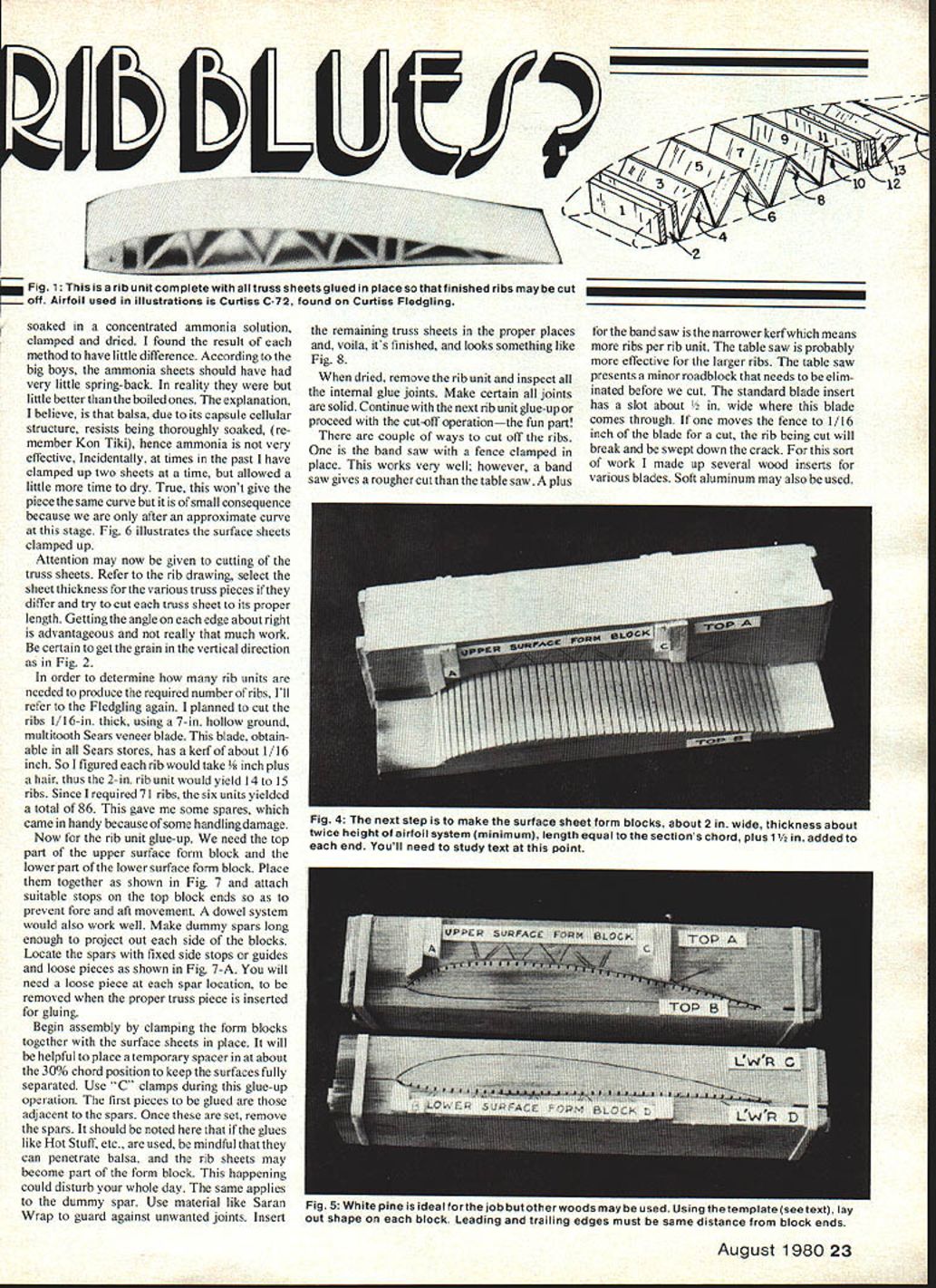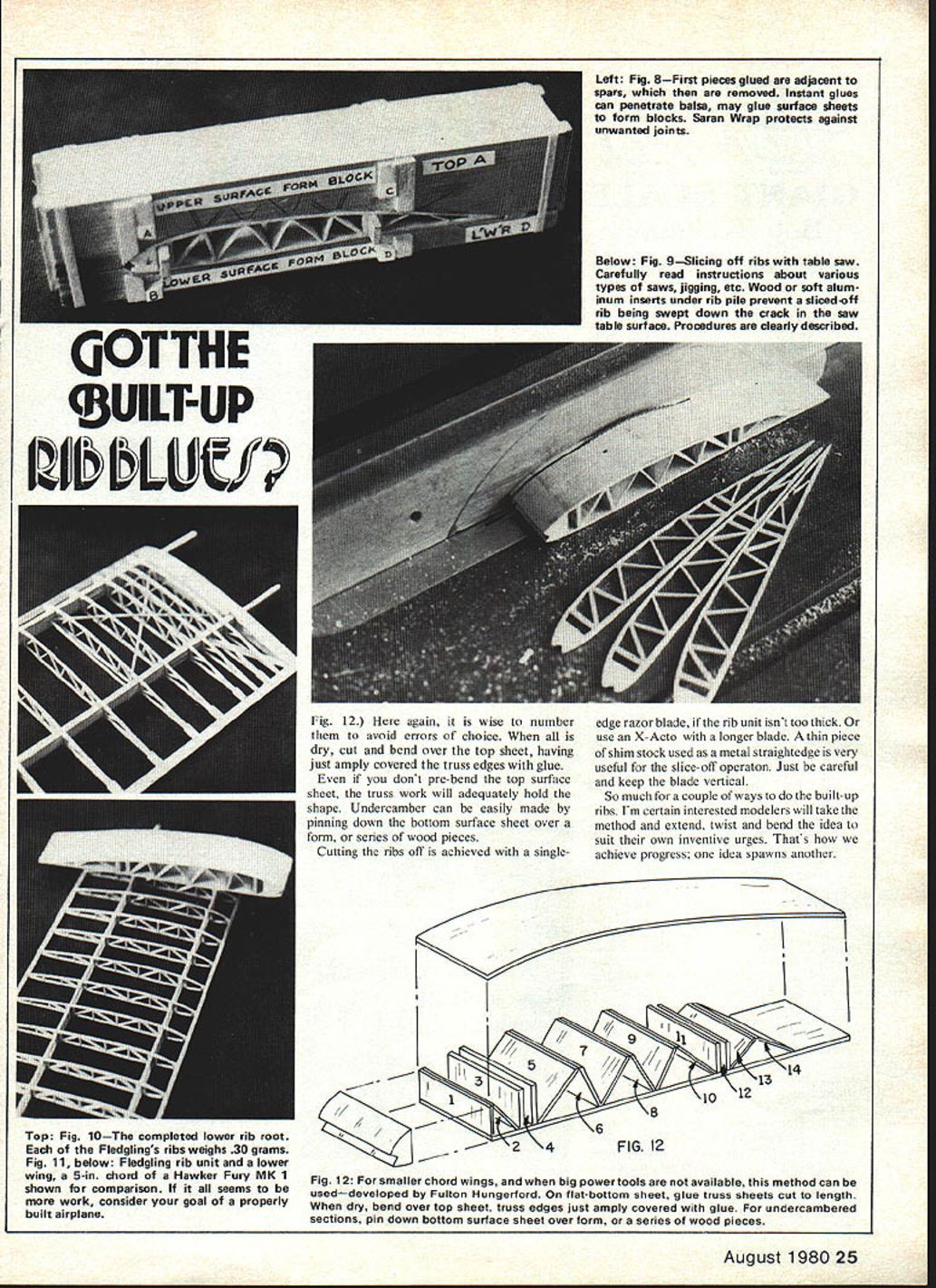 GOTTHEBUILT-UP Harry Schoaf looks scarey sure beats making em time weight 25% solid ribs Bet wont want cover wing THE method developed make possible production identical built-up ribs using minimum amount time effort object produce rib unit Fig 1 complete truss sheets glued place finished ribs may cutoff Naturally some preliminary work necessary order produce rib unit However once accomplished making ribs particular airfoil rapid very gratifying author has used method several years mostly flying scales has found strength weight ratio unequaled Once ribs place spars appearance striking almost prevents covering wing airfoil used illustrations 10 12 6 2FIG2 5 26 34 FIG 3 81012- l3J 911 14 Fig 3 begin select airfoil draw size desired show spar locations truss workallow cap strips usedand sizes rib pieces Curtiss C-72 used Curtiss Fledgling N2C1 model built scale ' ves span about 59 inches chord rib shown 7 inches Whatever chord being made have found advisable exceed 2 inches rib unit width makes insertion gluing truss sheets Fig 2 2-A reasonably easy Besides 2-in sheets handier work begin project select airfoil draw size desired show spar locations truss work allow cap strips used size rib pieces Note Fig 3 truss members numbered strongly suggest corresponding numbers put truss sheets order prevent later possible con fusion Have couple copies rib drawing made come handy reference later Glue drawing piece plywood Plexi glas whatever prefer make rib template used authentic scale truss arrange ment Fledgling rib happened work Out nicely truss zigzag between spars forming nice series triangles help maintain curvature sheets next step making surface sheet form blocks blocks should 2 inches wide thickness about least twice height airfoil system length equal sections chord plus inch inch half added end example N2C-l section about 7/g inches thick chord 7 inches form blocks measured 2 inches wide about 2 inches thick 10 inches long Having some white pine hand ideal job however other woods can used See Fig 5 Using template lay Out shape block taking care leading trailing edges same distance ends block necessary because later inter changeability Remember use cap strips contemplated must account cap thickness laying Out block lines Cutting form blocks means band saw time havent perhaps neighbor buddy does insure good smooth cut slowly wearing obtivisor magnifies nicely Sand out irregularities blocks almost ready order help along dryout surface sheets clamped up blocks cut grooves across faces intemal blocks band saw cuts about 3/32- deep spaced -5/32 apart See Fig 4 Both upper lower surface blocks shown Fig 5 Fledgling rib unit used 1/16 medium sheet top bottom surfaces estimated need 6 rib units cut 12 surface pieces soaked some boiling water 15 minutes clamped up form blocks let dry 20-24 hours warm oven would have reduced time-to-dry one-half perhaps no hurry rest sheets 22 Model Aviation Top Fig 2Chord example 7/2 innot advisable exceed 2 rib unit width makes reasonably easy labove insert glue truss sheets *///5/9~ . 6 4 2 soaked concentrated ammonia solution clamped dried found result method have little difference According big boys ammonia sheets should have very little spring-back reality little better boiled ones explanation believe balsa due its capsule cellular structure resists being thoroughly soaked re member Kon Tiki hence ammonia very effective Incidentally times past have clamped up two sheets time allowed little time dry True wont give piece same curve small consequence because after approximate curve stage Fig 6 illustrates surface sheets clamped up Attention may now given cutting truss sheets Refer rib drawing select sheet thickness various truss pieces differ try cut truss sheet its proper length Getting angle edge about right advantageous really much work certain get grain vertical direction Fig 2 order determine rib units needed produce required number ribs Ill refer Fledgling again planned cut ribs 116-in thick using 7-in hollow ground multitooth Sears veneer blade blade obtain able Sears stores has kerf about 1/16 inch So figured rib would takes inch plus hair thus 2-in rib unit would yield 14 15 ribs Since required 71 ribs six units yielded total 86 gave some spares came handy because some handling damage Now rib unit glue-up need top part upper surface form block lower part lower surface form block Place together shown Fig 7 attach suitable stops top block ends prevent fore aft movement dowel system would also work well Make dummy spars long enough project out side blocks Locate spars fixed side stops guides loose pieces shown Fig 7-A will need loose piece spar location removed proper truss piece inserted gluing Begin assembly clamping form blocks together surface sheets place will helpful place temporary spacer about 30% chord position keep surfaces fully separated Use ps during glue-up operation first pieces glued adjacent spars Once set remove spars should noted glues like Hot Stuff etc used mindful can penetrate balsa rib sheets may become part form block happening could disturb whole day same applies dummy spar Use material like Saran Wrap guard against unwanted joints Insert remaining truss sheets proper places voila its finished looks something like Fig 8 dried remove rib unit inspect internal glue joints Make certain joints solid Continue next rib unit glue-up proceed cut-off operationthe fun part couple ways cut off ribs band saw fence clamped place works very well however band saw gives rougher cut table saw plus band saw narrower kerf means ribs per rib unit table saw probably effective larger ribs table saw presents minor roadblock needs elim inated before cut standard blade insert has slot about blade comes through moves fence 1/16 inch blade cut rib being cut will break swept down crack sort work made up several wood inserts various blades Soft aluminum may also used August 198023 Fig 1 r b unt complete wth truss sheets glued place sothatfinished ribs may cut off