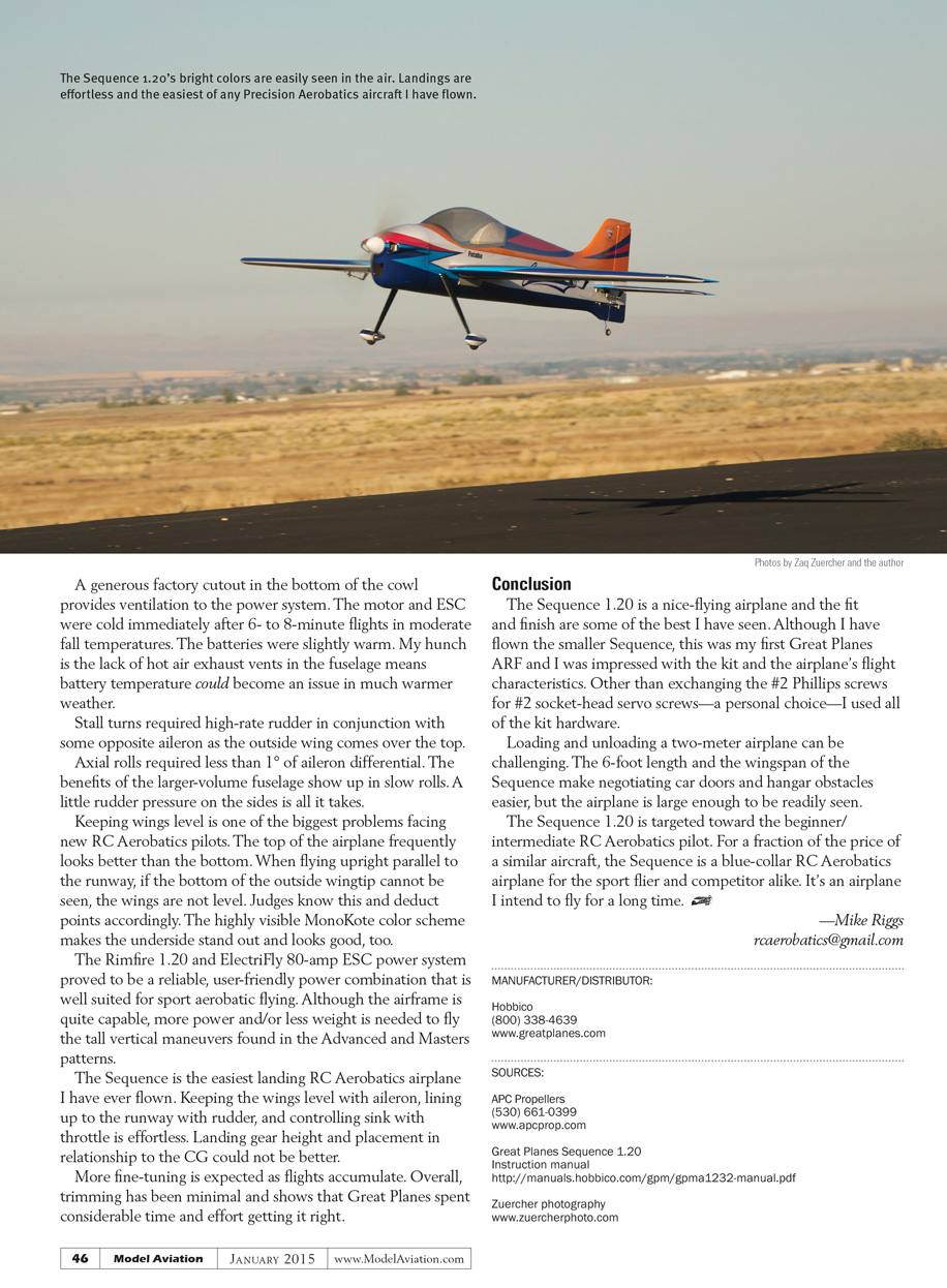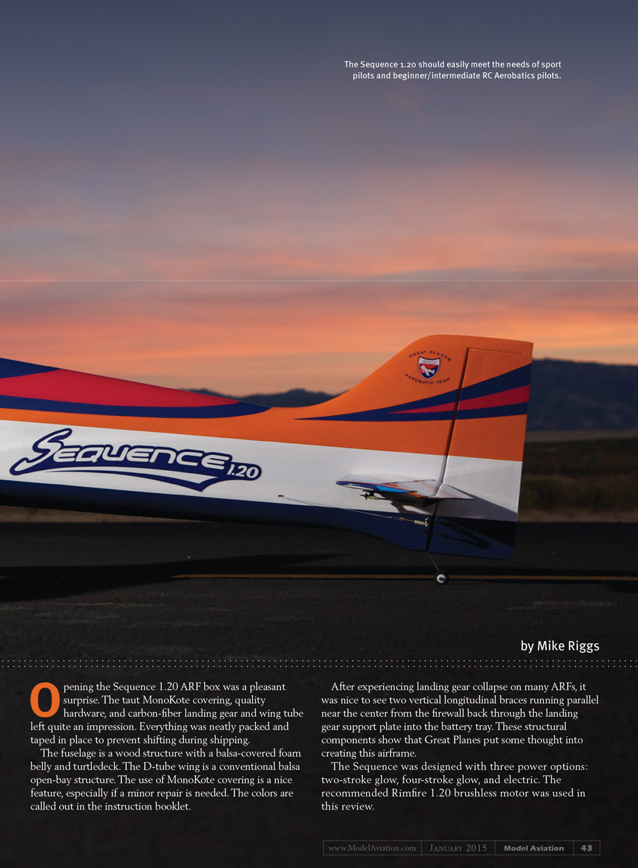 The Sequence 1.20 is targeted toward the beginner/intermediate Pattern pilot. For a fraction of the price, the Sequence is a blue-collar Pattern airplane for the sport flier and competitor alike. It’s an airplane I intend to fly for a long time.[dingbat]
