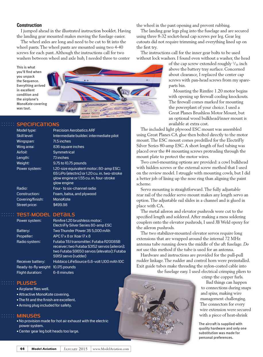 Flight characteristics of the Sequence are typical of modern pattern airplanes: positive control and fantastic tracking. Mother Nature did not provide windy conditions for extreme flight testing.