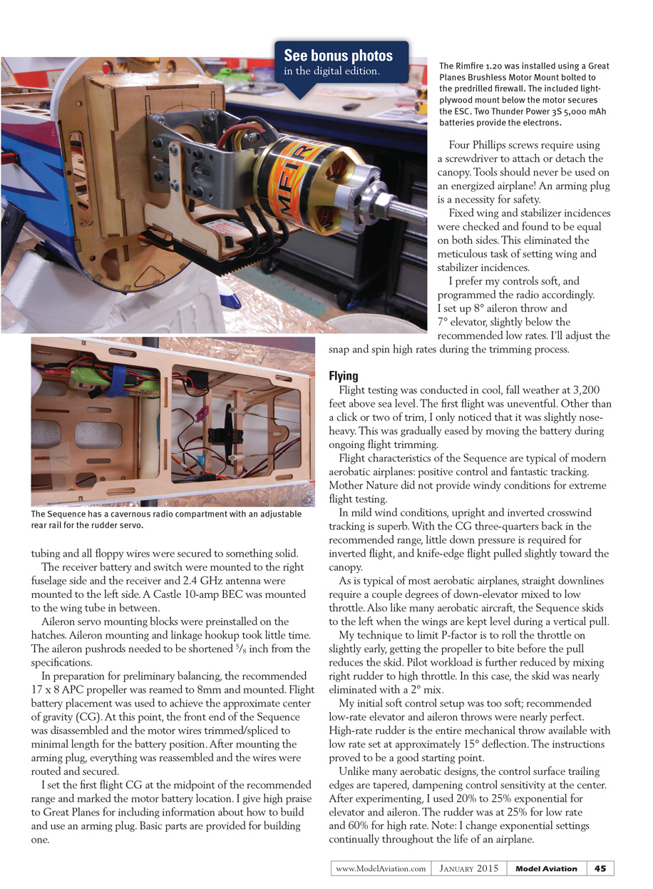 The Sequence was designed with three power options: two-stroke glow, four-stroke glow, or electric. The recommended Rimfire 1.20 brushless motor was used in this review.