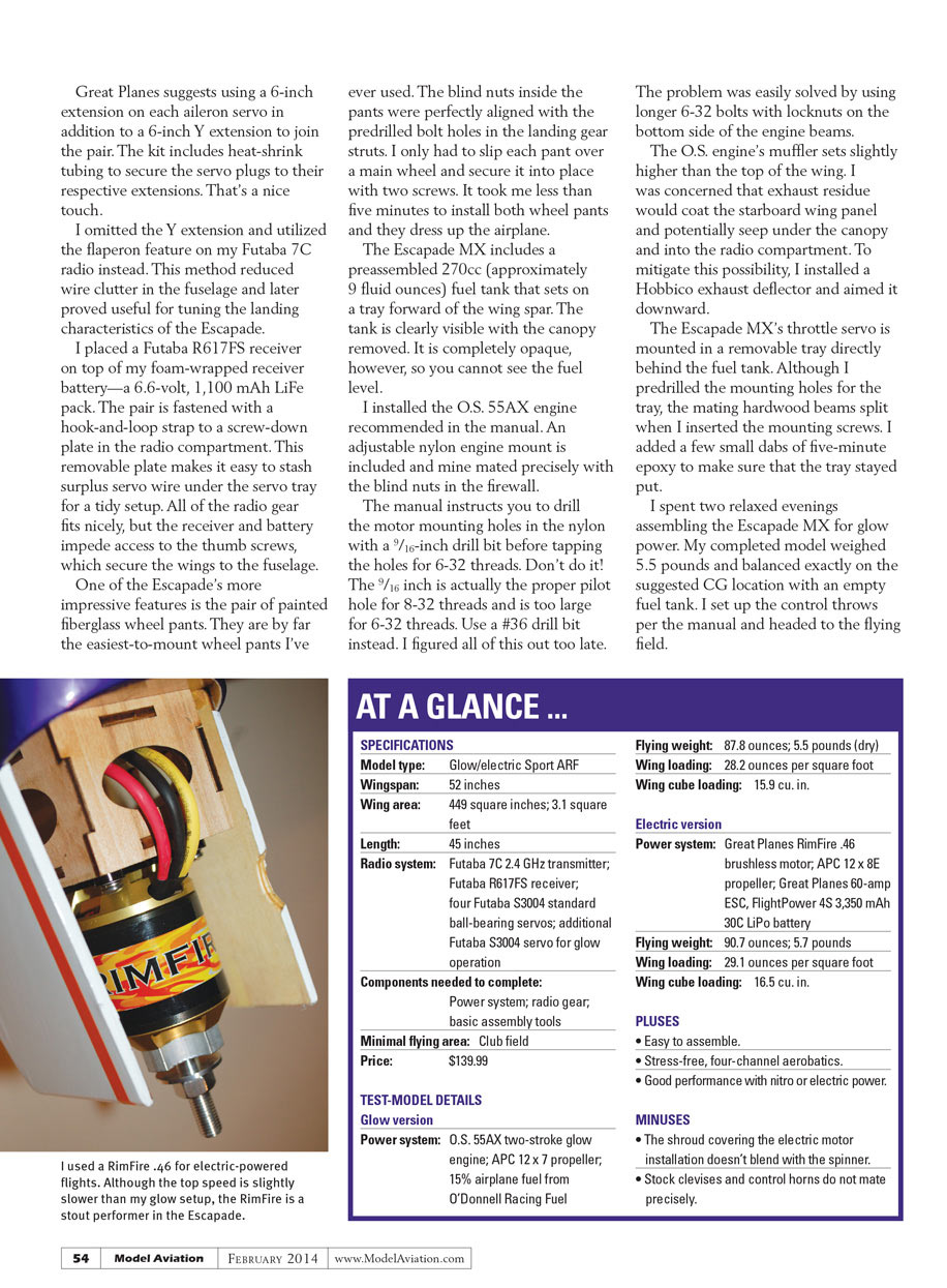 I spent two relaxed evenings assembling the Escapade MX for glow power. My completed model weighed 5.5 pounds and balanced right on the suggested CG location with an empty fuel tank. I set up the control throws per the manual and headed to the flying field.