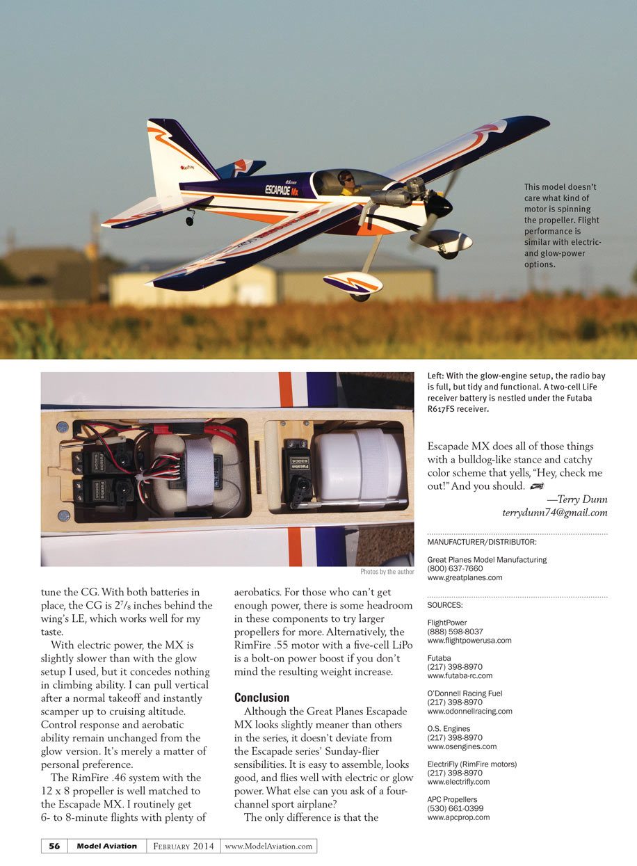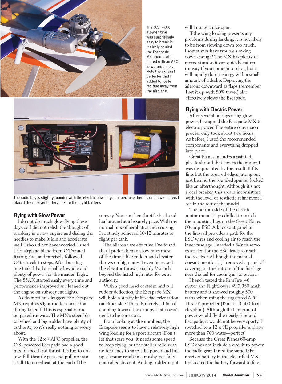 The RimFire .46 system with the 12 x 8 propeller is well matched to the Escapade MX. I routinely get 6- to 8-minute flights with plenty of aerobatics. For those who can’t get enough power, there is some headroom in these components to try larger propellers for more. Alternatively, the RimFire .55 motor with a five-cell LiPo is also a bolt-on power boost if you don’t mind the resulting weight increase.