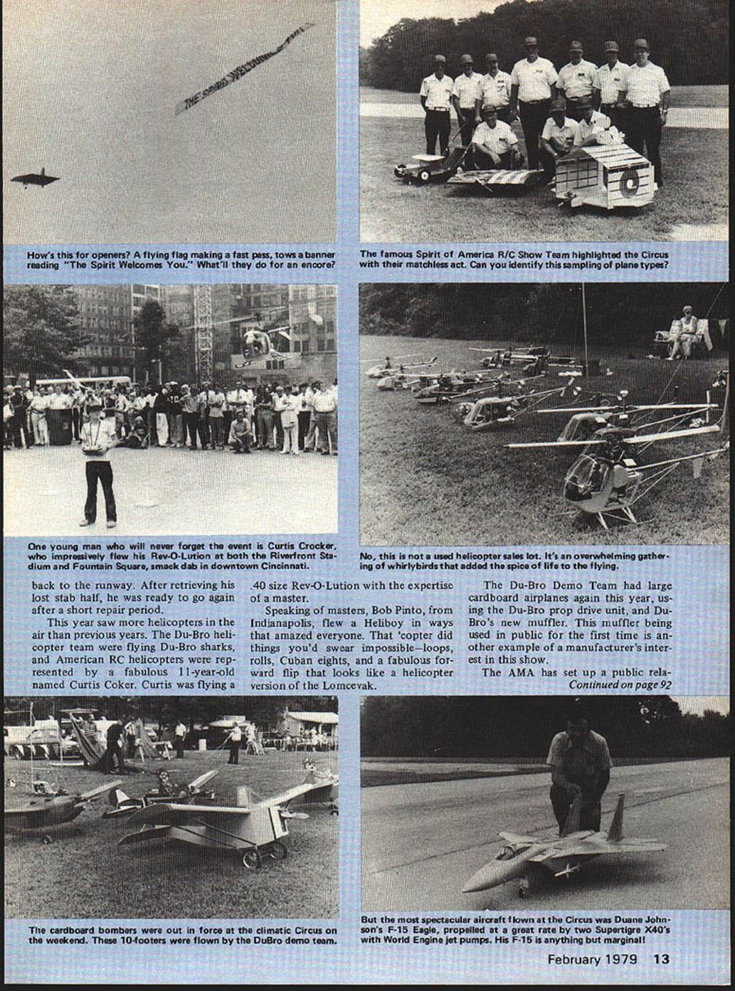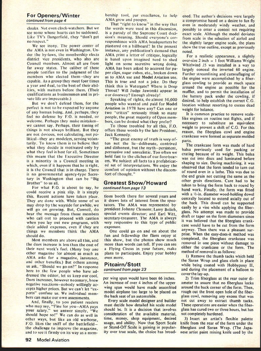 NO OCR TEXT NO OCR TEXT NO OCR TEXT NO OCR TEXT Openers/Winter continued page 4 cloaks clock-watchers see some hearts can saddened Like TVs Dangerfield dont get no respect see irony power center AMA Washington Un der by-laws membership elects district vice presidents also Council members Almost far away states caliber people testifies judgment members elected themthey capable As group meet four times year deal best abil ities matters before qualifications businessmen pri vate life impeccable dont defend perfect expected anyone human being perhaps feel no defense FO needed welcome Perhaps make mistakes cannot say Perhaps timing things always brilliant devious calculating po lit icalthey modelers serving volun tarily know believe what decide motivated what feel best Sometimes means Executive Director minority Council meeting happens right Council charge no governmental agency-type Secre tary Washington can Big Brother us what FO about say could receive pink slip simply Recent actions have taken place done some us may drop wayside awhile will go growing Council hear message members call out proceed caution lay out new programs added expenses things members think AMA should Most members above dues increase less cost next weeks fuel buy other magazine almost much AMA asks magazine insurance other benefits others among us ask Should go response few people have ad dressed editor let us keep cool Dues increases however necessary brew negative reactionsnobody willingly ac cepts higher prices cant let ex perts confuse us individual mem bers can make own assessments finally patient readers may say Fine youAMA pays salary answer simply should hope can well other ways like old warhorse FO likes sniff battlefield challenge improve magazine see firmly its way mem bership tool par excellance help AMA grow prosper right know way words used discussion parody Supreme Court deci sions meaning Should everyones cor respondence AMA headquarters plastered billboard present instance publications demand AMA print letter critique logically based upon imagined need shed light some secretive wrong doing AMA has asked account pa per clips sugar cubes etc broken down AMA use Model Aviation use true joke think Watergate Deep Throat Will Judge Jaworski appear doorway Enough already Speaking rights almost 50000 people wanted paid Model Aviation 1978 have Can two critics seriously think people great majority Open mem bers can denied what prefer troubled FO offers words late President Jack Kennedy great enemy truth very ten liedeliberate contrived dishonest mythpersistent persuasive unrealistic Too often hold fast cliches fore-bear ers subject facts prefabricat ed set interpretations enjoy comfort opinion discom fort thought Greatest Show/Howard continued page 13 tions booth several years draws lots interest spec tators AMA represented president Johnny Clemens Larry Bolich special events director Earl Witt secretary-treasurer AMA always very responsive type public exposure could go on about fun fellowship fliers enjoy show photos show much words can tell can see Flying Circus future make plans participate Enjoy hobby Pitcairn/Stott continued page 23 per wing span would have 66 inches An increase over 4 inches upper wing span would have made assembled model airplane too large placed back seat automobile scale model designer builder must decide detailed scale model should decision involves consideration available material time money shop equipment desired usage ability Now Sport Scale Stand-Off Scale gaining popular ity over true scale choice has broadened authors decisions largely compromise based desire fun fly moderately windy weather possibly enter contest requiring exact scale Although model deviates scale selection airfoil slightly larger engine scale plans show true outline except previously noted realistic appearance slightly over-size 2 inch ot Williams Wright Whirlwind J5 installed way largely conceal inverted 60 engine Further streamlining camouflaging engine accomplished fiber glass cowling provide much space around engine possible muffler permit installation battery pack under cowling desired help establish correct CG location resorting- excess dead weight balance common practice remove scalelike engines routine test flights necessary substitute equivalent weight prevent shift CG reason fiberglass cowl engine crankcase formed separate molded parts crankcase form made hard balsa previously used packing crating because its weight balsa cut discs laminated before shaping size During machining observed form tended turn out round lathe due end grain cutting same other grain directions Care taken bring form back round hand work Finally form fitted -in diameter wood-holding dowel centrally located extend axially out back dowel can supported easily vise applying fiber glass No attempt made provide draft taper form diameters since believed fiberglass crank case would have cut form anyway pleasant sur prise easy-does-it method completed fiberglass crankcase removed piece damage either crankcase form method removal follows I Remove thumb tacks held Saran Wrap glass cloth place being coated Hobbypoxy II during placement balloon cover lay-up 2 Trim fiberglass rear outer di ameter assure no fiberglass locks around back corner form rough out front open hole fiber glass cowl removing excess cut away extract thumb tacks operations easier fiber glass has cured two three hours has completely hardened 3 Insert artists flexible palette knife rear form under fiberglass Saran Wrap Japa nese artist paint mixing knife used 92 Model Aviation
