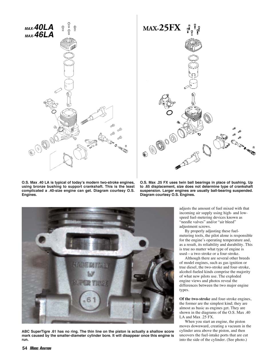 ported, ABC; black-headed Rossi .61 is high rpm, high compression, rear exhaust; O.S. rear-exhaust, long-stroke .61 produces