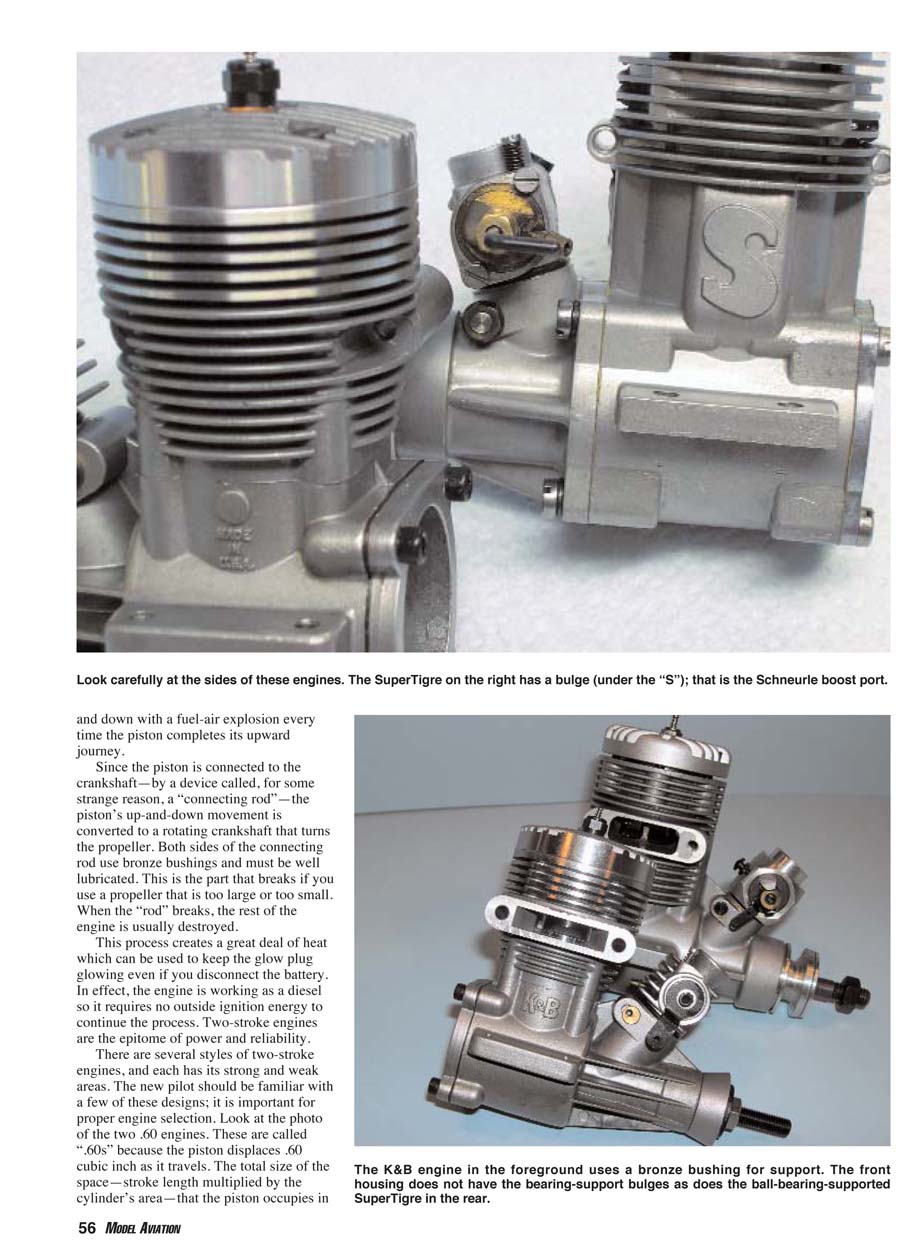 Engines come in bewildering series of variations; these are .60s. L-R: K&B .65 is ABC, non-Schnuerle; SuperTigre .61 is Schnuerle