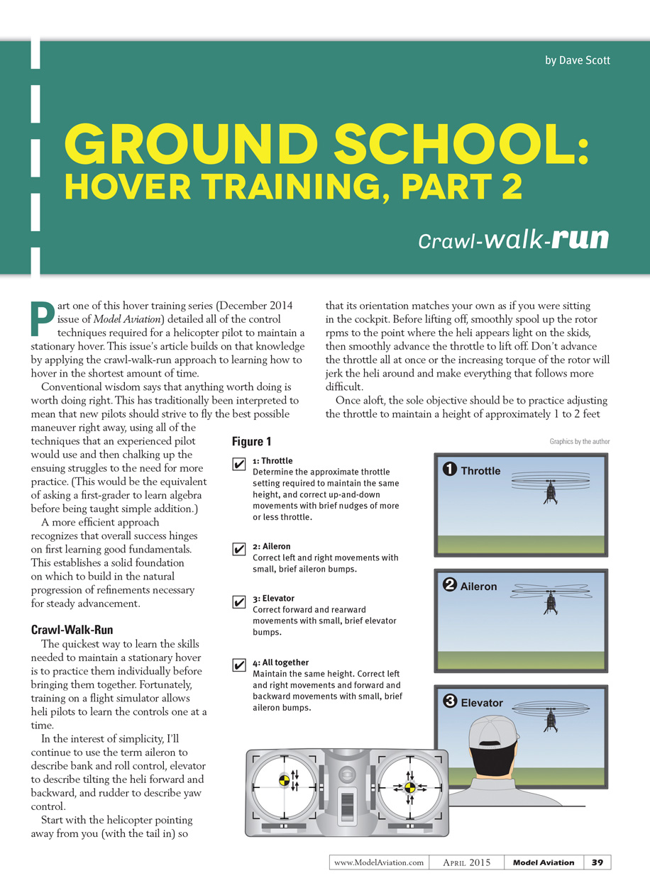 Part one of this hover training series (December 2014 issue) detailed all of the control techniques required to maintain a stationary hover. This issue’s article builds on that knowledge by applying the crawl-walk-run approach to learning how to hover in the shortest amount of time.