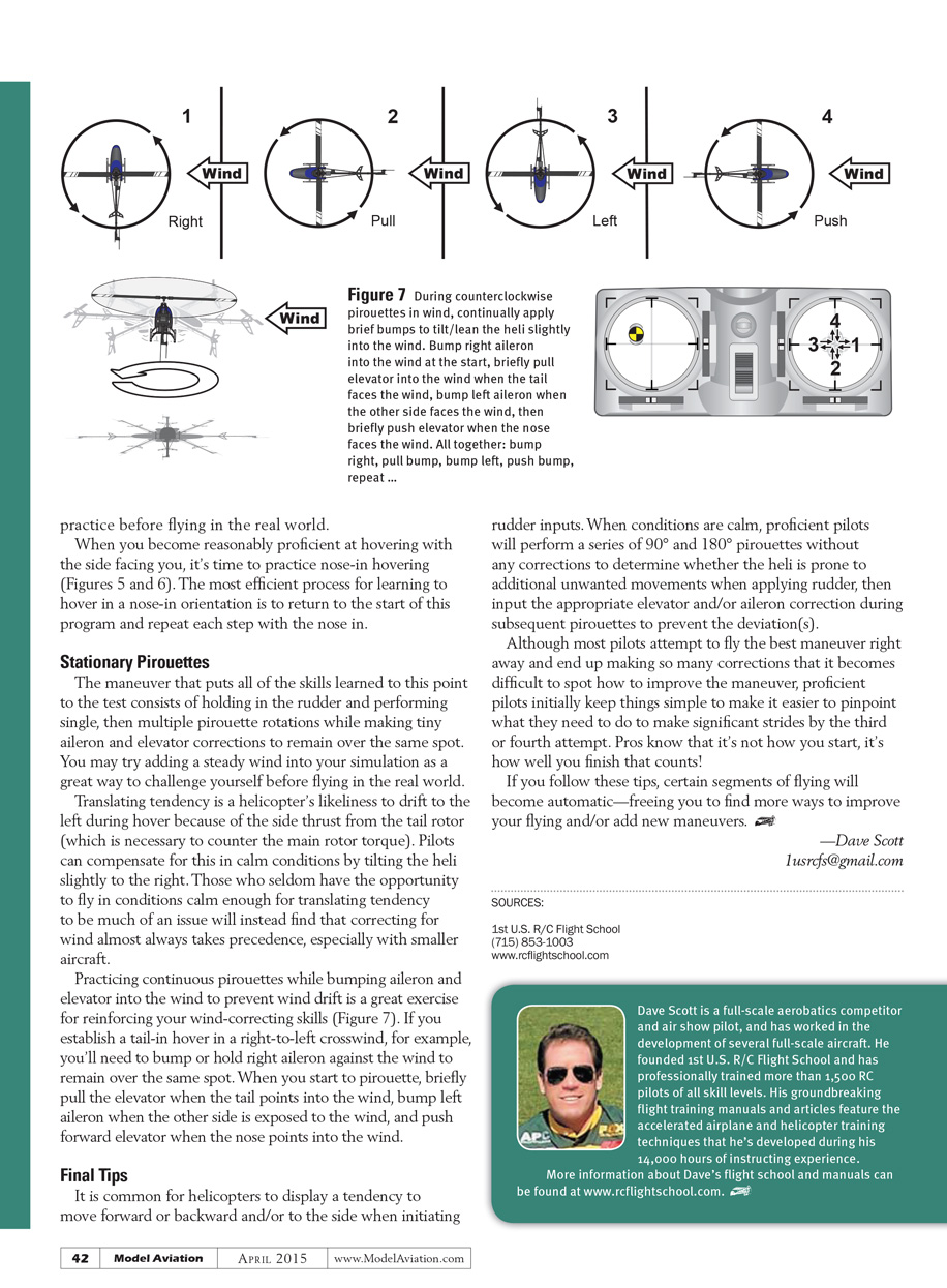 Practicing continuous pirouettes while bumping aileron and elevator into the wind to prevent wind drift is a great exercise for reinforcing your wind-correcting skills (Figure 7). If you establish a tail-in hover in a rightto-left crosswind, for example, you’ll need to bump or hold right aileron against the wind to remain over the same spot. When you start to pirouette, briefly pull the elevator when the tail points into the wind, bump left aileron when the other side is exposed to the wind, and push forward elevator when the nose points into the wind.