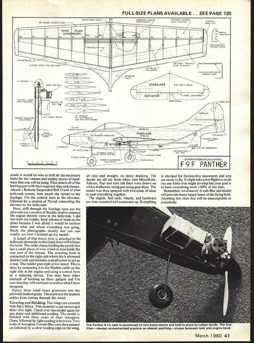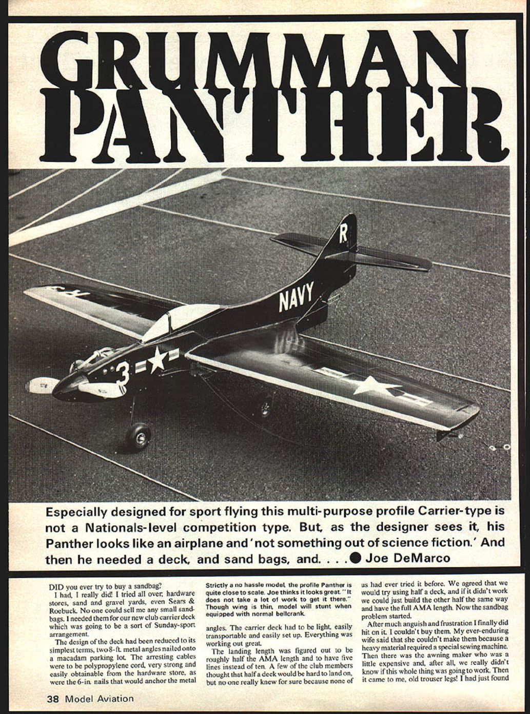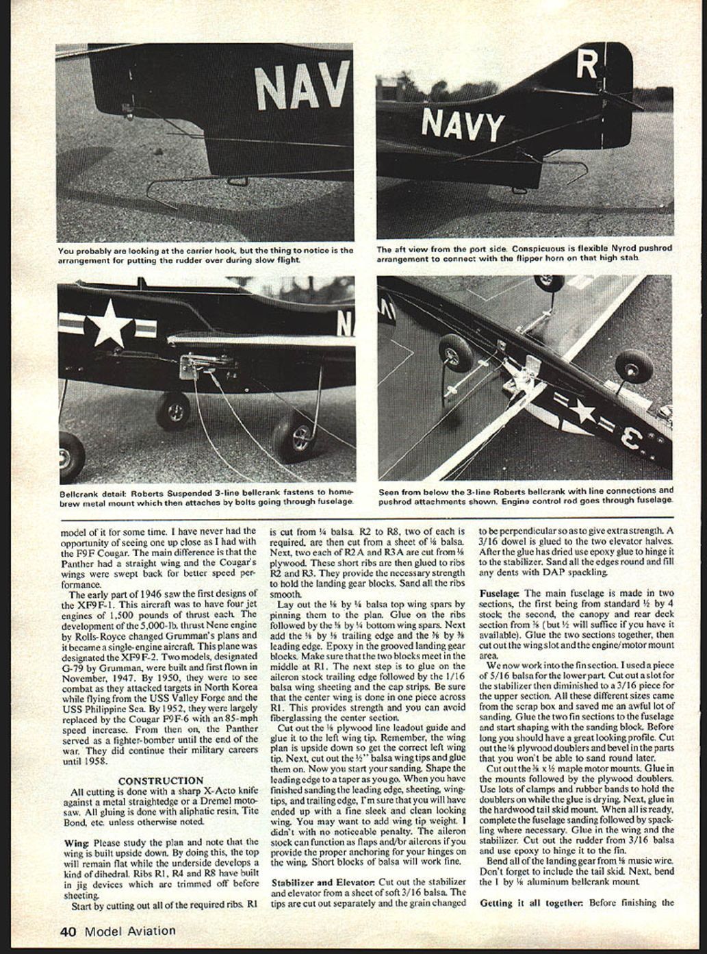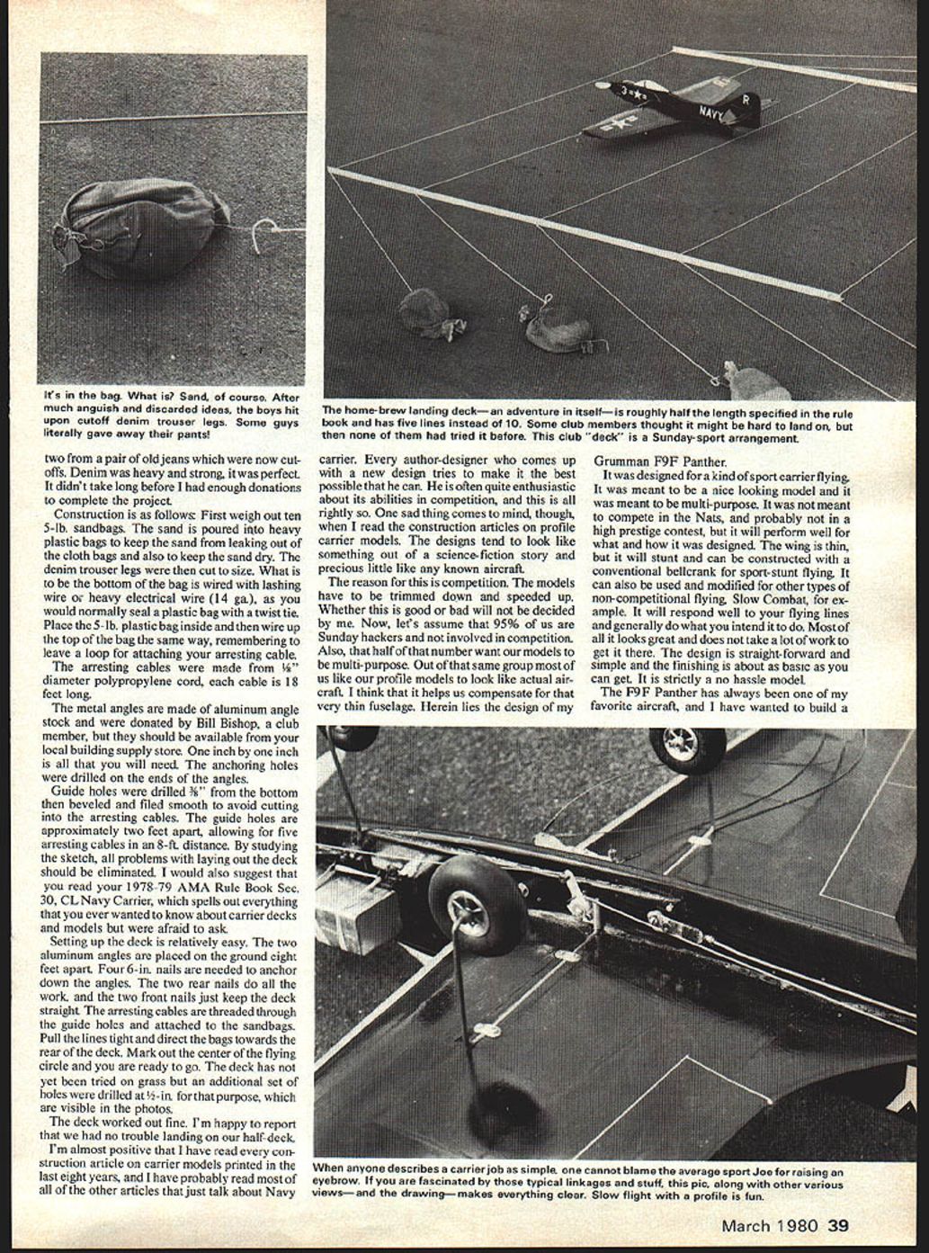Especially designed sport flying multi- purpose profile Carrier-type Nationals-level competition type designer sees Panther looks like airplane something out science fiction needed deck sand bags and..@ Joe DeMarco DID ever try buy sandbag I really did tried over hardware stores sand gravel yards Sears & Roebuck No could sell small sand bags needed new club carrier deck going sort Sunday-sport arrangement design deck reduced its simplest terms two 8-ft metal angles nailed onto macadam parking lot arresting cables polypropylene cord very strong easily obtainable hardware store 6-in nails would anchor metal Strictly no hassle model profile Panther quite close scale Joe thinks looks great does take lot work get Though wing thin model will stunt equipped normal bellcrank angles carrier deck light easily transportable easily set up Everything working out great landing length figured out roughly half AMA length have five lines instead ten few club members thought haifa deck would hard land no really knew sure because us ever tried before agreed would try using half deck didnt work could just build other half same way have full AMA length Now sandbag problem started After much anguish frustration finally did hit couldnt buy ever-enduring wife said couldnt make because heavy material required special sewing machine awning maker little expensive after really didnt know whole thing going work came old trouser legs just found 38 Model Aviation Its bag What Sand course After much anguish discarded ideas boys hit upon cutoff denim trouser legs Some guys literally gave away pants two pair old jeans now cut offs Denim heavy strong perfect didnt take long before enough donations complete project Construction follows First weigh out ten 5-lb sandbags sand poured isto heavy plastic bags keep sand leaking out cloth bags also keep sand dry denim trouser legs cut size What bottom bag wired lashing wire heavy electrical wire 14 ga would normally seal plastic bag twist tie Place 5-lb plastic bag inside wire up top bag same way remembering leave loop attaching arresting cable arresting cables made eter polypropylene cord cable 1 8 feet long metal angles made aluminum angle stock donated Bill Bishop club member should available local building supply store inch inch will need anchoring holes drilled ends angles Guide holes drilled i bottom beveled filed smooth avoid cutting arresting cables guide holes approximately two feet apart allowing five arresting cables 8-ft distance studying sketch problems laying out deck should eliminated would also suggest read 1978-79 AMA Rule Book Sec 30 CL Navy Carrier spells out everything ever wanted know about carrier decks models afraid ask Setting up deck relatively easy two aluminum angles placed ground eight feet apart Four 6-in nails needed anchor down angles two rear nails work two front nails just keep deck straight arresting cables threaded through guide holes attached sandbags Pull lines tight direct bags towards rear deck Mark out center flying circle ready go deck has yet tried grass additional set holes drilled -in purpose visible photos deck worked out fine Im happy report no trouble landing half-deck Im almost positive have read con struction article carrier models printed last eight years have probably read of other articles just talk about Navy carrier author-designer comes up new design tries make best possible can often quite enthusiastic about its abilities competition rightly sad thing comes mind though read construction articles profile carrier models designs tend look like something out science-fiction story precious little like known aircraft reason competition models have trimmed down speeded up Whether good bad will decided Now lets assume 95% us Sunday hackers involved competition Also half number want models multi-purpose Out same group us like profile models look like actual air craft think helps us compensate very thin fuselage Herein lies design Grumman F9F Panther designed kind sport carrier flying meant nice looking model meant multi-purpose meant compete Nats probably high prestige contest will perform well what designed wing thin will stunt can constructed conventional bellcrank sport- stunt flying can also used modified other types non-competitional flying Slow Combat ex ample will respond well flying lines generally what intend Most looks great does take lot work get design straight-forward simple finishing about basic can get strictly no hassle model F9 F Panther has always favorite aircraft have wanted build March 1980 39 home-brew landing deckan adventure itselfis roughly half length specified rule book has five lines instead 10 Some club members thought might hard land tried before club deck Sunday sport arrangement anyone describes carrier jon simple cannot blame average sport Joe raising eyebrow fascinated typical linkages stuff pic along other various viewsand drawingmakes everything clear Slow flight profile fun model some time have never opportunity seeing up close F9F Cougar main difference Panther straight wing Cougars wings swept back better speed per formance early part 1946 saw first designs XF9F-1 aircraft have four jet engines 1500 pounds thrust development 5000-lb thrust Nene engine Rolls-Royce changed Grummans plans became single-engine aircraft plane designated XF9F-2 Two models designated G-79 Grumman built first flown November 1947 1950 see combat attacked targets North Korea flying USS Valley Forge USS Philippine Sea 1952 largely replaced Cougar F9F-6 85-mph speed increase Panther served fighter-bomber until end war did continue military careers until 1958 CONSTRUCTION cutting done sharp X-Acto knife against metal straightedge Dremel motesaw gluing done aliphatic resin Tite Bond etc unless otherwise noted Wing Please study plan note wing built upside down doing top will remain flat underside develops kind dihedral Ribs Ri R4 R8 have built jig devices trimmed off before sheeting Start cutting out required ribs Ri cut a R2 