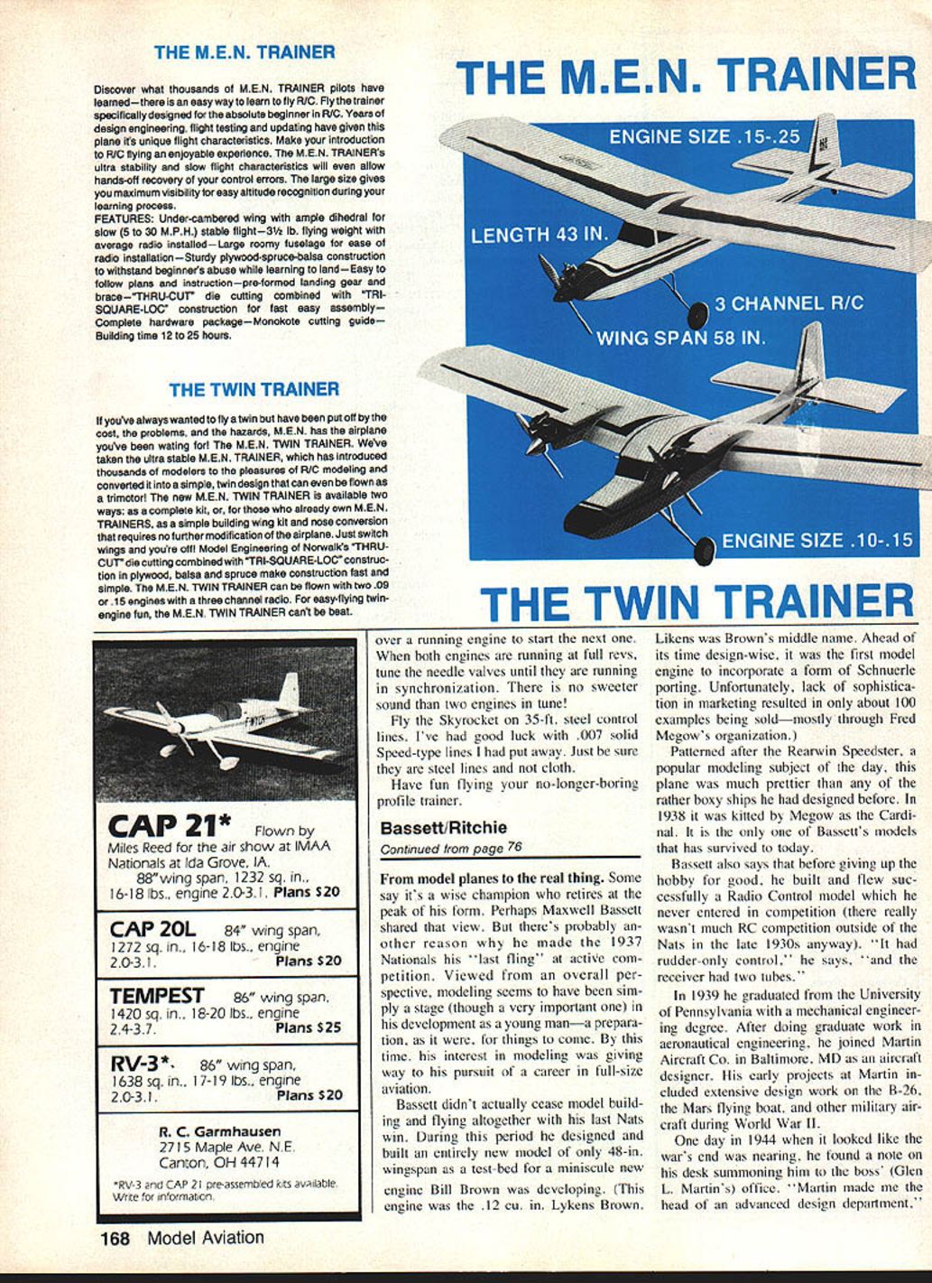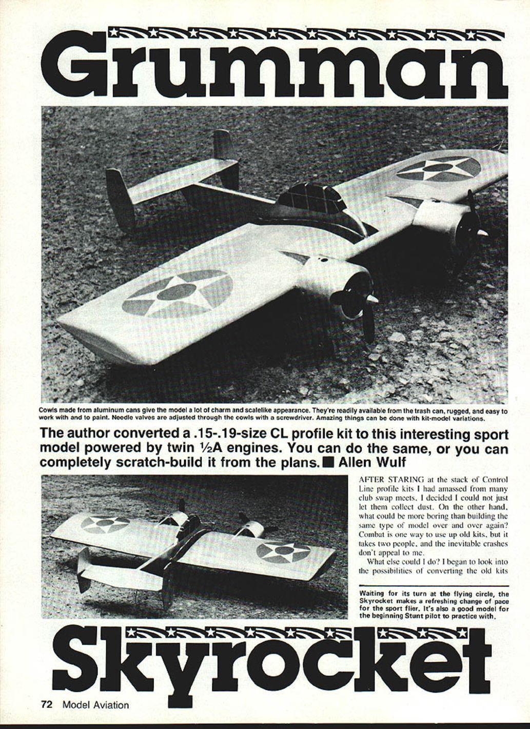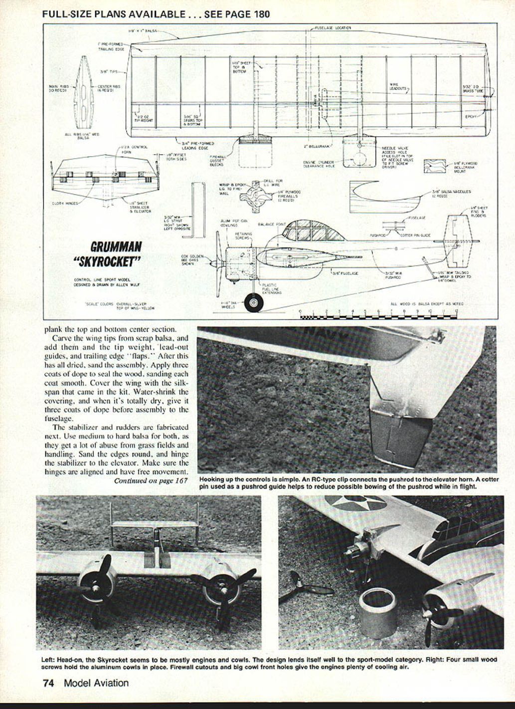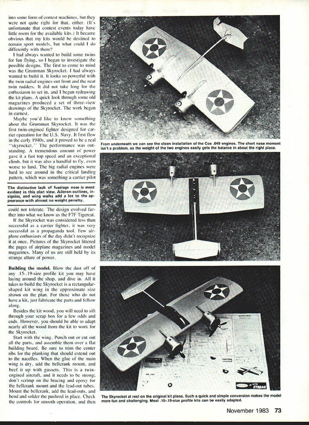 The author converted 15-19-size CL profile kit interesting sport model powered twin /2A engines can same can completely scratch-build plansE Allen WuIf AFTER STARING stack Control Line profile kits amassed club swap meets decided could just let collect dust other hand what could boring building same type model over over again Combat way use up old kits takes two people inevitable crashes dont appeal What else could I began look possibilities convertine old kits Waiting its turn flying circle Skyrocket makes refreshing change pace sport flier Its also good model beginning Stunt pilot practice 72 Model Aviation Cowls made aluminum cans give model lot charm scalelike appearance Theyre readily available trash can rugged easy work paint Needle valves adjusted through cowls screwdriver Amazing things can done kit-model variations some form contest machines quite right either Its unfortunate contest events today have little room available kits became obvious kits would destined remain Sport models what could differently always wanted build some twins fun flying began investigate possible designs first come mind Grumman Skyrocket always wanted build looks powerful twin radial engines out front neat twin rudders did take long enthusiasm set began redrawing kit plans quick look through some old magazines produced set three-view drawings Skyrocket work began earnest Maybe youd like know something about Grumman Skyrocket first twin-engined fighter designed car rier operation US Navy first flew early 1940s proved real skyrocket' performance out standing tremendous amount power gave fast top speed exceptional climb also handful fly worse land big radial engines hard see around critical landing pattern something carrier pilot distinctive lack fuselage nose evident plan view Aileron outlines signias wing walks add lot ap pearance almost no weight penalty could tolerate design evolved fur ther what know F7F Tigercat Skyrocket considered less successful carrier fighter very successful propaganda tool Few air plane enthusiasts day didnt recognize once Pictures Skyrocket littered pages airplane magazines model magazines us still held its strange allure power Building model Blow dust off 15- 19-size profile kit may have laying around shop dive takes build Skyrocket rectangularshaped kit wing approximate size shown plan have kit just fabricate parts follow along Besides kit wood will need sift through scrap box few odds ends However should able adapt nearly wood kit work Skyrocket Start wing Punch out cut out parts assemble over fiat building board sure trim center ribs planking should extend out nacelles glue main wing dry add bellerank mount beef up gussets twinengined aircraft needs strong dont scrimp bracing epoxy bellerank mount lead-out tubes Mount bellerank add lead-outs bend solder pushrod place Check controls smooth operation November 1983 73 underneath can see clean installation Cox 049 engines short nose moment isnt problem weight two engines easily gets balance about right place Skyrocket rest original kit plans Such quick simple conversion makes model fun challenging Most 15-19-size profile kits can easily adapted FULL-SIZE PLANS AVAILABLE. SEE PAGE 180 ISO X BA SA HAN 565 yN- CENTER RMS IDREDDICREDO 7 _____ 6 STEEDIII flI11lj0 4I-BRASST DECO61V KARE330 DO III jjs [C C----11 II ITpI r2v II1it1tI itII1iiIopo~ IiiIIIII CTOP IIII 4jROTTOR 4II Ii AL 585 T& MED 354 PRE FDRREO 0 HELLORANK NEEDLE VANE IBIS SLOT IN DOB DRIVER LO OD FIREAALDO PSADOD REDS TTH SALSA SADELLES READ GRUMMAN SKYROCKET7 CONTROL LINE SPORT MODEL DESANED DRAWN AS ALLEN WOLF S ALE CDL 0AFROSNOB MW F T N,OHSDA NODOWOlI F S LEFT OBBOSITE COO GOLDEN24-V ESTSMA U OLSDROIRTEH ON GADE LA ShEET 5200 VOL 0 / CO OS HO TAILSID 58 SWE 0000 IS SASH ERLOPT AS SOTED plank top bottom center section Carve wing tips scrap balsa add tip weight lead-out guides trailing edge flaps After has dried sand assembly Apply three coats dope seal wood sanding coat smooth Cover wing silkspan came kit Water-shrink covering its totally dry give three coats dope before assembly fuselage stabilizer rudders fabricated next Use medium hard balsa both get lot abuse grass fields handling Sand edges round hinge stabilizer elevator Make sure hinges aligned have free movement Continued page 167 Left Nead-on Skyrocket seems mostly engines cowls design lends itself well sport-model category Right Four small wood screws hold aluminum cowls place Firewall cutouts big cowl front holes give engines plenty cooling air 74 Model Aviation -BASEIATE LOOM ON Hooking up controls simple An HUtYP cup connects pusnroa elevator horn cotter pin used pushrod guide helps reduce possible bowing pushrod flight Box 1063 Lorain Ohio 44055 inA P hone 216 282-8354 Peanut Scale Models r Vagabend mAr Cab 125 kite .3495 Ligat Indoor kite eacb 5 Sport Scale Models 22 Span PC-6 Porter Taylor Craft Stinen Voyager Rubber CO2 Power N4PMIrKits each. Snort ModM An Embryo Mallet 16 Span designed wint br beginners Experts 5 HARD-TO-FIND ITEMS FOR YOUR BUILDING NEEDS Early Bird Tissue Antique Aircraft 5595 True Olde Japanese Tissue 10 3 colors . 3695 Japanese Tissue 12 6 colors 3395 Microlite Plain3325 Silver3395 Microfilm Glue 3150 Solvent Condenser Paper 3 sheets 3375 P1 Service over 17 Scale Sport Scale & Peanut Scale Rubber Strip 020 thro 085each 3175 3/32 fllrs 5/32each 3195 Winder 61 395 Mark 1161 195 Complete Line Brown CO2 Motors Balsa Wood Outdoor & Indoor Sheets & Strips Add 10% Postage mum Postage 3150 COMPLETE CATALOG 3150 Consumers Guide RC Aircraft Products 242 Pages Mundreds New Products Photos & Descriptions over 2000 RC Aircraft Products fered 176 companies Outstanding Value Only $495 pius shipping* Send $660 lincludes UPS & hendlingl Foreign orders send $786 US surface mail $1049 US air mail Catalogs companies would cost over 10 times price outstanding reference book product lines nearly major man ufacturer distributor importer well unique interesting products small companies seldom advertise