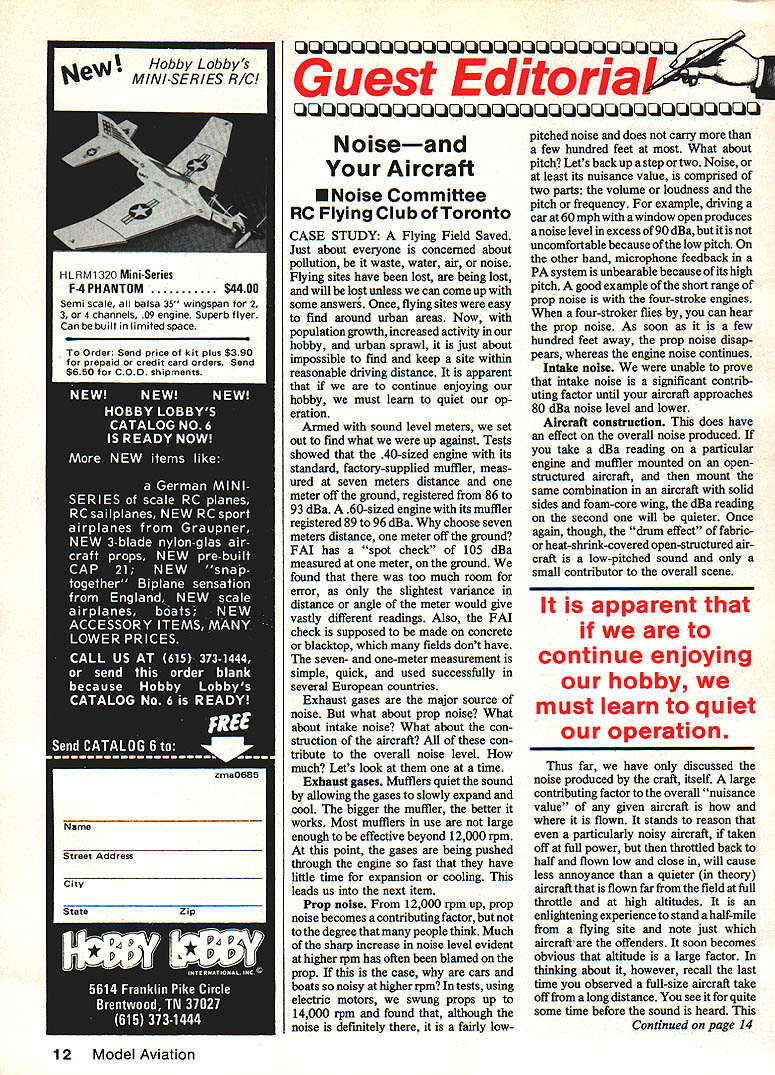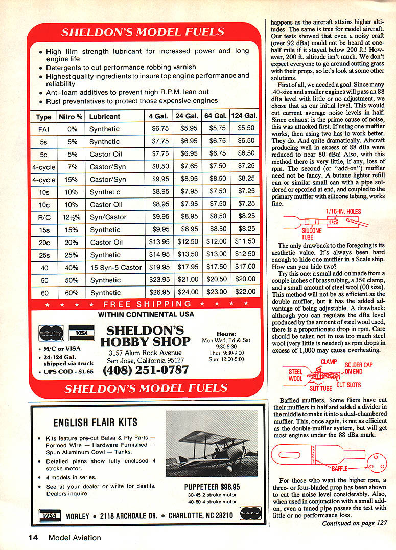Noiseand Aircraft U Noise Committee RC Flying Club Toronto CASE STUDY Flying Field Saved Just about everyone concerned about pollution waste water air noise Flying sites have lost being lost will lost unless can come up some answers Once flying sites easy find around urban areas Now population growth increased activity hobby urban sprawl just about impossible find keep site within reasonable driving distance apparent continue enjoying hobby must learn quiet op eration Armed sound level meters set out find what up against Tests showed 40-sized engine its standard factory-supplied muffler meas ured seven meters distance meter off ground registered 86 93 dRa 60-sized engine its muffler registered 89 96 dRa choose seven meters distance meter off ground FM has spot check 105 dBa measured meter ground found too much room error slightest variance distance angie meter would give vastly different readings Also FAI check supposed made concrete blacktop fields dont have seven- one-meter measurement simple quick used successfully several European countries Exhaust gases major source noise what about prop noise What about intake noise What about con struction aircraft con tribute overall noise level much Lets look time Exhaust gases Mufflers quiet sound allowing gases slowly expand cool bigger muffler better works Most mufflers use large enough effective beyond 12000 rpm point gases being pushed through engine fast have little time expansion cooling leads us next item Prop noise 12000 rpm up prop noise becomes contributing factor degree people think Much sharp increase noise level evident higher rpm has often blamed prop case cars boats noisy higher rpm tests using electric motors swung props up 14000 rpm found although noise definitely fairly lowpitched noise does carry few hundred feet What about pitch Lets back up step two Noise least its nuisance value comprised two parts volume loudness pitch frequency example driving car 60mph window open produces noise level excess 90 dBa uncomfortable because low pitch other hand microphone feedback PA system unbearable because its high pitch good example short range prop noise four-stroke engines four-stroker flies can hear prop noise As soon few hundred feet away prop noise disap pears whereas engine noise continues Tatake aoise unable prove intake noise significant contrib uting factor until aircraft approaches 80 dBa noise level lower Aircraft coastructioa does have effect overall noise produced take dBa reading particular engine muffler mounted openstructured aircraft mount same combination aircraft solid sides foam-core wing dBa reading second will quieter Once again though drum effect fabricor heat-shrink-covered open-structured air craft low-pitched sound small contributor overall scene apparent continue enjoying hobby must learn quiet operation Thus far have discussed noise produced craft itself large contributing factor overall nuisance value given aircraft flown stands reason particularly noisy aircraft taken off full power throttled back half flown low close will cause less annoyance quieter theory aircraft flown far field full throttle high altitudes enlightening experience stand half-mile flying site note just aircraft offenders soon becomes obvious altitude large factor thinking about however recall last time observed full-size aircraft take off long distance see quite some time before sound heard Continued page 14 12 Model Aviation Hobby Lobbys Guest Editoria IQJ MINI-SERIES RICI HLRM1 320 Mini-Series F-4 PHANTOM$4400 High film strength lubricant increased power long engine life Detergents cut performance robbing varnish Highest quality ingredients insure top engine performance reliability Anti-foam additives prevent high RPM lean out Rust preventatives protect expensive engines TypeNitro 0/oLubricant4 Gal24 Gal64 Gal124 Gal FAI0%Synthetic$675$595$575$550 5s50/0Synthetic$775$695$675$650 Sc50/aCastor Oil$775$695$675$650 4-cycle70/aCastor/Syn$850$765$750$725 4-cycle150/0Castor/Syn$995$895$850$825 lOs100hSynthetic$895$795$750$725 lOc100/0Castor Oil$895$795$750$725 R/O120/oSyn/Castor$995$895$850$825 iSs150/0Synthetic$995$895$850$825 20c200/aCastor Oil$1395$1250$1200$1150 25s250/aSynthetic$1495$1350$1300$1250 4040%15 Syn-5 Castor$1995$1795$1750$1700 50S00/oSynthetic$2395$2100$2050$2000 60600/0Synthetic$2695$2400$2300$2200 HIN CONTINENTAL USA SHELDONS rs HOBBY SHOPMon Wed Fri & Sat M/C VISA 0 530 24-124 Gal 3157 Alum Rock AvenueThur 930-900 shipped via truck San Jose California 95127Sun 1200-500 UPS COD $165408 251-0787 ENGLISH FLAIR KITS Kits feature pre-cut Balsa & Ply Parts Formed Wire ware Furnished Spun Aluminum Cowl s Detailed plans show fully enclosed 4 stroke motor 4 models series See dealer write deatils Dealers inquire PUPPETEER $98g5 30-45 2 stroke motor 40-60 4 stroke motor VIA MORLEY ARCHOALE DR LOTTE NC 28210 happens aircraft attains higher alti tudes same true model aircraft tests showed noisy craft over 92 dBa could heard onehalf mile stayed below 200 ft ever 200 ft altitude isnt much dont expect everyone go around cutting grass props lets look some other solutions First needed goal Since 40-size smaller engines will pass 88 dBa level little no adjustment chose initial level would cut current average noise levels half Since exhaust prime cause noise attacked first using muffler works using two has work better quite dramatically Aircraft producing well excess 88 dRa reduced near 80 dBa Also method very little loss rpm second add-on muffler need fancy butane lighter refill can similar small can pipe sol dered epoxied end coupled primary muffler silicone tubing works fine 1/16-IN HOLES SIUCONE TUBE drawback foregoing its aesthetic value Its always hard enough hide muffler Scale ship can hide two Try small add-on made couple inches brass tubing 35 clamp small amount steel wool 00 size method will efficient double muffler has added ad vantage being adjustable drawback although can regulate dBa level produced amount steel wool used proport