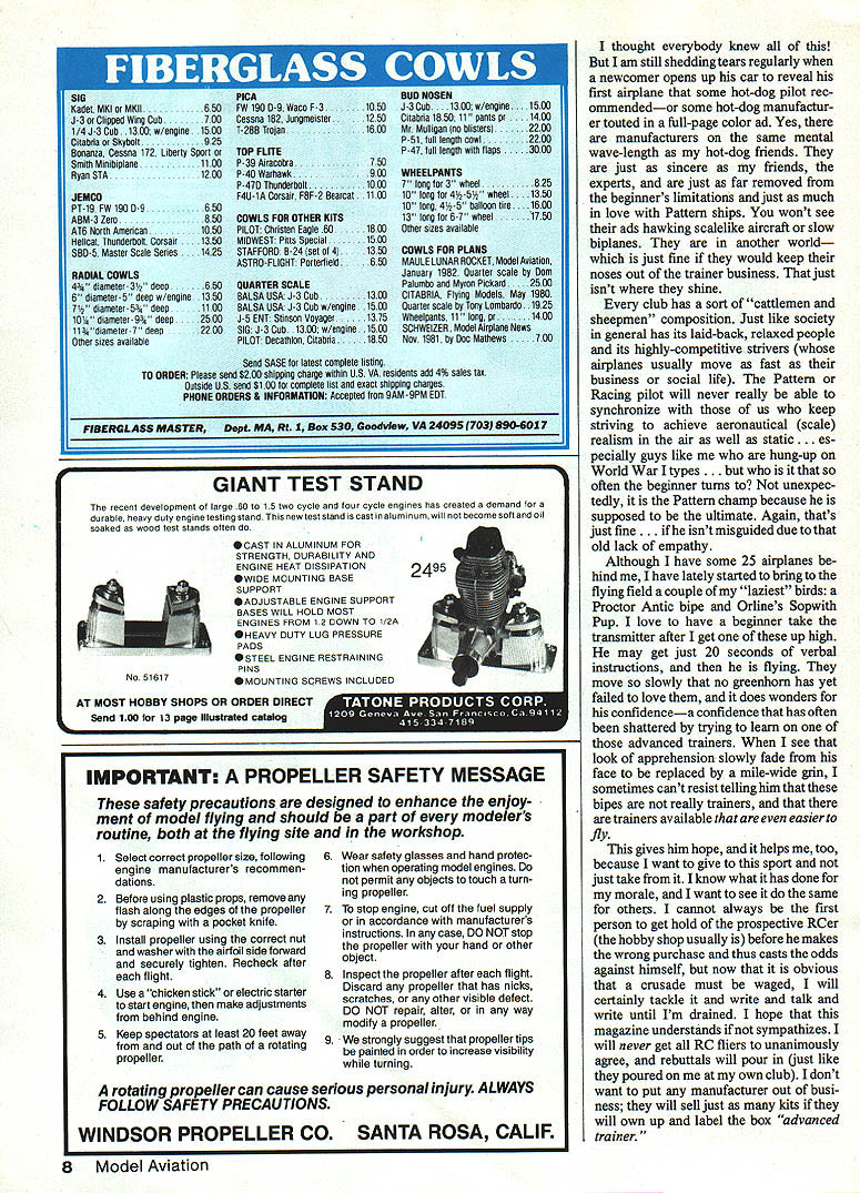 Guest Editoria I4J Trainer Controversy Jim Waterman San Antonio TX RC MODELING happy sport werent would have involved since 1968 Itcan alsobe afairlyeasysport little luck taught myself fly deserted field much other flier being present possible because lucked ideal trainer old second-hand Smog Hog first flying session pure pleasure no mishaps except couple broken props because Smog Hog tail-dragger learning flare correctly landing difficult part joined club soon realized important Experienced instruc tors worth weight gold just very lucky soloing attribute right trainer years have gone have watched hundred beginners come godiscour aged because trainer misrepresented really basic trainer Without true basic trainer odds beginner will quickly drop out sport never seen again Oh psuedo-trainers would fly al rightin hands instructor came think instructors enjoying student performed variety aerobatics Smog Hog could begin handed transmitter student couldnt circle field crying shame also entirely unnecessary student unusually patient perse vering adept instructor has hours weeks months spend him possible him finally solo symmetrical-winged bombs being passed off trainer instead advanced trainer know what have seen over years Without true basic trainer odds beginner will quickly drop out sport never seen again has heart rending observation ideal trainers market fliers willing give advice help see dam new arrivals carrying very type airplane should really second airplane have launched one-man cru sade get bottom tragedy friends have gotten bottom it going tougher sin eliminate should because very best fliers highly-adept hot dog fliers blame far removed beginner capable empathy see darn new arrivals [at field] carrying very type airplane should really second airplane average laid-back Sunday flier knows what beginner going through what needs likes stand upto expert knows having aerobatic airplane far less important beginner just getting up down piece enjoying process guts tied nervous knot certainly isnt enjoying reflec ted attrition rate Yes have personally flown advanced trainers have read listened arguments behalf save having buy second plane graduate groove stunt much fun advanced pilots Just throttle back tame Balderdash An airplane either inherently stable isnt stable ideal first flight would Old-Timer Free Flight RC-assist powered glider calm days course dont really need go extreme plane slow stable does over-respond push stick should suffice majority fliers RC journalists hobby shop proprietors will recommend high-wing shoulder-wing undercam bered flat-bottomed airfoil semi-sym metrical lots dihedral Ailerons advantage ad vanced trainers add trainer subtracts purpose goal trying achieve savings weight also plus Continued page 8 6 Model Aviation 4 MODEL AIRPLANE NEWS PLANS DIRECTORY publishers Model Airplane New magazine bring comprehensive listing plans available modeler today including hundreds K/C Free Flight Control Line plans Giant Peanut Scale model build Also included incredible scale drawings William Wylam Willis Nyc Tage Larsen other great aviation illustrators plus books back issues binders T-shirts Order yours today directory no modeler should Call TOLL-FREE 1-C Air Age Publishing 1837 Post Rd Darien CT 06820 closed S _______ Plan1 Directorys SI DYES Send latest copy Airplane News FREE lNI Address ___________________ Icity ______ _____ StateZip L. mm .. SI j 4 jej W11EIiOVAA raoet MKI MKII 650 J-3 Clipped Wing Cub 700 1/4J-3Cub 1300 w/engrne 1500 Citabria Skybolt 925 Bonanza Cessna 172 Liberty Sport Smitti Minibiplane 1100 Ryan STA 1200 JENCO PT-19 FW 190 0-9 ABM-3 Zero AT6 North American Hellcat Thunderbolt Corsair SBD-5 Master Scale Senes 650 850 1050 1350 1425 RADIAL COWLS 4 diameter-3s deep 650 6 diameter-S deep w/engine 1350 7 diameter-5 deep1100 lOtk diameter-9 deep2500 11diameter7 deep2200 Other sizes available PICA FW1900-9WacoF-3 1050 Cessna 182 Juogmeister 12 50 T-28B Trotan 1600 TOP FLITE P-39 Airacobra 750 P40 Warhawk 00 P-47D Thunderbolt. 1000 F4U-1A Corsair F8F-2 Bearcat 1100 COWLS FOR OTHER KITS PILOT Christen Eagle 60 MIDWEST Pitts Special 1500 STAFFORD B-24 set 014 1350 ASTRO-FLIGHT Porterlteld 6 50 QUARTER SCALE BALSA USA J-3 Cub 1300 BALSA USA J-3 Cub w/engine 1500 J-5 ENT Stinson Voyager1375 510 J3 Cub 1300 w/engine 1500 PILOT Decathlon Cilabria1850 BUD NOSEN J3 Cub 1300 w/engtne1500 Citabria 185011 pants pr1400 Mr Mulligan leo blisters2200 P-Si lull length cowl 2200 P-47 toll length ltaps3000 WHEELPANTS 7 long br 3 wheel 825 10 longtor4S wheel1350 10 long 4-5 balloon tire1600 13 long 6-7 wheel 1750 Other sizes available COWLS FOR PLANS MAULE LUNAR ROCKET Model Aviation January 1982 Quarter scale Dom Palumbo Myron Pickard2500 CITABRIA Flying Models May 1980 Quarter scale Tony Loinbardo 1925 Wheelpants 11 long pr 1400 SCHlZERModel Airplane News Nov 1981 Don Mathews700 1 Select correct propeller size following engine manufacturers recommen dations 2 Before using plastic props remove flash along edges propeller scraping pocket knife 3 Install propeller using correct nut washer airfoil side forward securely tighten Recheck after flight 4 Use chicken stick electric starter start engine make adjustments behind engine 5 Keep spectators least 20 feet away out path rotating propeller 6 Wear safety glasses hand protec tion operating model engines permit objects touch turn ing propeller 7 To stop engine cut off fuel supply accordance manufacturers instructions case DO NOT stop propeller hand other object B Inspect propeller after flight Discard propeller has nicks scratches other visible defect DO NOT repair alter way modify propeller 9 We strongly suggest propeller tips painted order increase visibility turning rotating propeller can cause serious personal injury ALWAYS FOLLOW SAFETY PRECAUTIONS WINDSOR PROPELLER CO SANTA ROSA CALIF thought everybody knew am still shedding tears regularly newcomer opens up car reveal first airplane some hot-dog pilot rec ommendedor some 