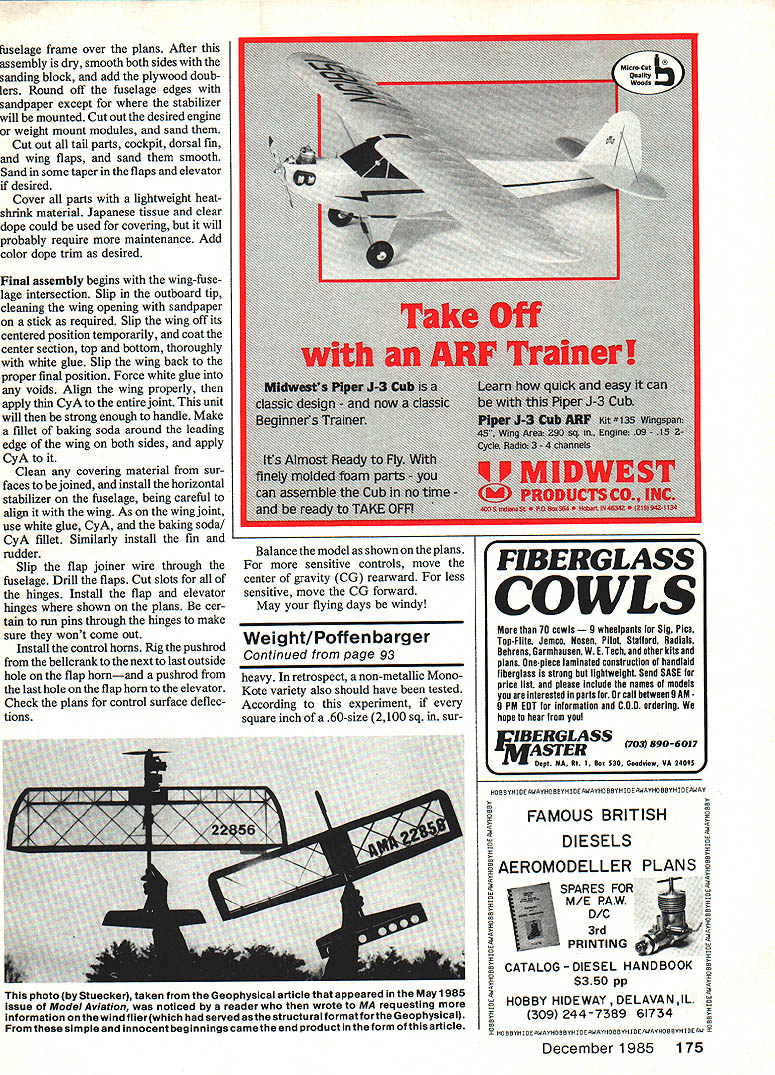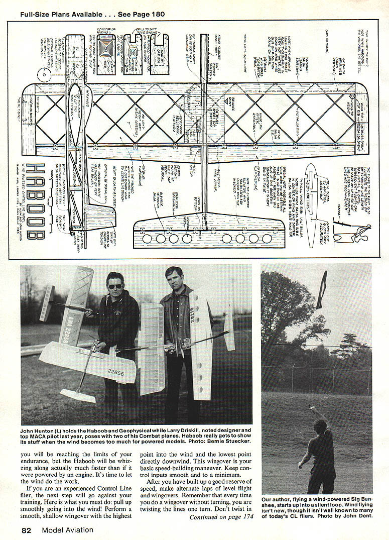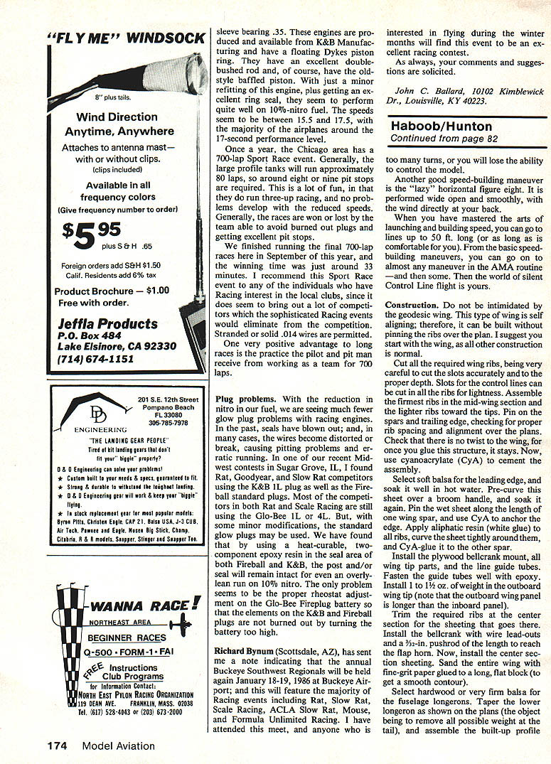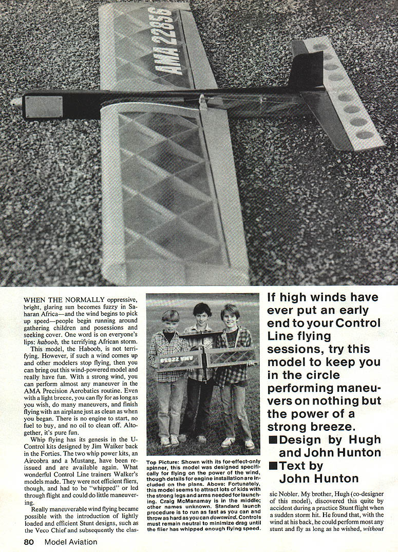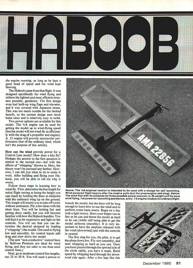 WHEN THE NORMALLY oppressive bright glaring sun becomes fuzzy Sa haran Africaand wind begins pick up speedpeople begin running around gathering children posessions seeking cover word everyones lips haboob terrifying African storm model Haboob terri fying However such wind comes up other modelers stop flying can bring out wind-powered model really have fun strong wind can perform almost maneuver AMA Precision Aerobatics routine light breeze can fly long wish maneuvers finish flying airplane just clean began no engine start no fuel buy no oil clean off Alto gether its pure fun Whip flying has its genesis UControl kits designed Jim Walker back Forties two whip power kits Aircobra Mustang have re issued available again What wonderful Control Line trainers Walkers models made efficient fliers though whipped led through flight could little maneuver ing Really maneuverable wind flying became possible introduction lightly loaded efficient Stunt designs such Veco Chief subsequently clas high winds have ever put early end Control Line flying sessions try model keep circle performing maneu vers nothing power strong breeze EDesign Hugh John Hunton U Text John Hunton sic Nobler brother Hugh co-designer model discovered quite accident during practice Stunt flight sudden storm hit found wind back could perform stunt fly long wished 80 Model Aviation Top Picture Shown its for-effect-only spinner model designed specifi cally flying power wind though details engine installation cluded plans Above Fortunately model seems attract lots kids strong legs arms needed launch ing Craig McManamay middle other names unknown Standard launch procedure run fast can throw hard can downwind Controls must remain neutral minimize drag until flier has whipped enough flying speed engine running long kept good head speed wind kept blowing Haboob came flight designed specifically wind flying utilizes lightest efficient struc ture possible geodesics first design built-up wing flaps elevator covered Japanese tissue too much trouble limited benefit current design uses stock balsa sizes relatively easy build Two power options available model engine can used getting model up wind-flying speed model will wind-fly efficient ly drag propeller engine 15 engine will provide spectacular per formance ordinary kind isnt purpose article can wind provide power Control Line model does kite fly Perhaps answer first question similar second onebut effects whipping thrown theory wont pursued further ever can tell what to make work After building flying Ha boob will able tell works Follow steps learning wind-fly First determine line length initial flight testing being height can reach holding lines midpoint outboard wing tip ground length will enable take off easily assistance Fly few times short lines will turning fast getting dizzy easily will become familiar Haboob handles will find responsive light controls will see can de termine desired airspeed leading whipping model Get used flying low smoothly control inputs add drag slow down model new non-conductive control lines Sullivan Products ideal wind flying safer use steel control lines Next go moderate control line lengths say 25 30 ft will need person launch model lines will long enough learn use wind perform some basic stunts Begin day light breeze Have helper run fast can throw model hard can still being able get model airborne smoothly very im portant have airplane released wind downwind controls neutral first step pilot get plane down low Fly very smoothly start whipping hard can Once have passed through upwind side circle safely have made Build speed whipping hard through down wind side again After few laps like December 1985 81 Above I ne Y2A-engined version intended used stooge self launching Wind-powered flight begins after engine quits prop/engine add drag Below wind flier its modules three possible power sources L-R weight unit pure wind flying powerfor launching assistance 15 engine moduleforordinaryflight 0 0 0 0~ c o % 0 0-- o0~ 2 0 r- - 0 0- - 0g- 2 0 C o 0 t--00 - -02- o 02 02 0202 02 n02 0 -U - U02 7 Co 02w 02 00 7 C flC 0 7 02027 2 -c 0 02m 002. 7 02U02 OOZ 002 02O Ch0 -0 0702 0 . o oC o002 70 -7 0 0 000 o 2 02 02 Sn 02 -aD. 70 0 02 -.zo C0 0 02 r Co C 02 00 020 flIN00 WOk -Fl II CN I3LN00WOO k iII 2tV A3 1s1kI1 I0 000M0Vl4 N0I0NK Oa09N03d0L NF 00VN 7W~ 1 32i0 dQNA1 I WOON3L Nl W30 01 WO3100NC1W0NIM LJ3 Q1A1 K1y 00 A0 42P4 2I30lcaklO Ii I001100 11 Fld03NO 00N0I-1N0 L3NI0C 3M 1 pI j3I0N01 kA31 301 31000 LOIJAL 04 000I oec0 31001 dO19 IAIN01L20LN02 FOO00i00MV0 NI0~a0d00044I NM 1704 UV42300 10N 3 1S0NM V04 SEI~C 05l00 02L30 ONW N1000 6 3311N3 N IM 30031000 y1gIA 100IdAj /UV0lSV 31IA G103~313305 01 / 0304 LA0N0 NON 0000031 13000310431 1I30I70 33100 04 0010000133031 0NINI0L 0 000013100 310031131331 314 11400 0a 311 3330a 0411 01311 OWL C ~a1 Ii I 1 04 31413131100 NIOIC -YAM 1100AM -11000 000 [00 041 000 3N3331l00 d0Co30&41140A 00 0 OONVVtO 0033131V 31A411141 0014 0041141 004100 003 3103 00T 0011 LO4OIOM 31L1 041 00 [I I1 -31I N II 0 N0I*33A 30-7 023301400 300 M 30030 3v39 NOOOO3 104100140 01031100 4003M34QNS 3312231 01 0002331 1~0014104I p0010II 11410 0041141111 0041W 300 20I00 000004111 MV 3 3103000 1400 30110100000100 31 LJJ/I 0N0N0A31 04I 003 000004 0000143lakO 30 3104 0030 0402 1100107 00110 L 3300 1040040 3131303041 400120 1001000131 111111 34101 04100141 030d 000/W ~0N0 012 0031000 300 01100 0LI00M020 040 90012 000 3110W 104 1000/0 NIftlOlOOl4 o00031 13100 003 00000001 ONAlddO NA/3M 3001 000100000 391Y0 04O0112A 4031411001 441*0 NV00 05000310140 0030000 03130 2401 A0NM SOIL 0000000 0414W 1041 C 11330 41141/NI 001 1 0 -U a 0 U 0 0 -U D 0 0 FL YME WINDSOCK Attaches antenna mast clips clips included Available frequency colors Give frequency number order 5u&H 65 Foreign orders add S&I-l $150 Calif Residents add 6% tax Product Brochure Free order Jeffla Products PO Box 484 Lake Elsinore CA 92330 714 674-1151 2 WANNA RACE flOUAT AOFAa BEGINNER RACES 0-500 * FORM-i FAI Instructions