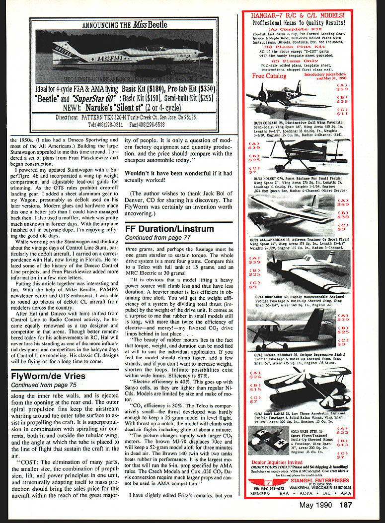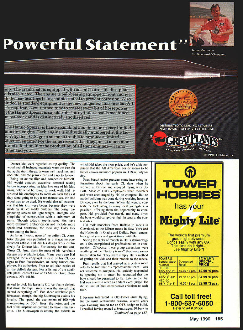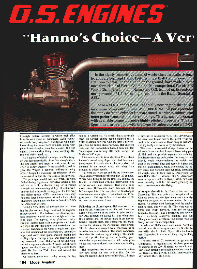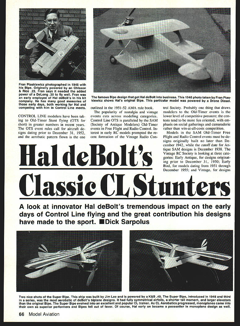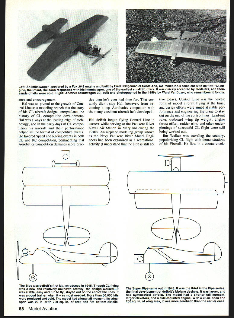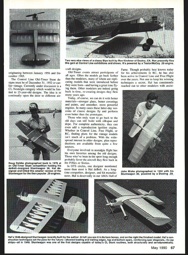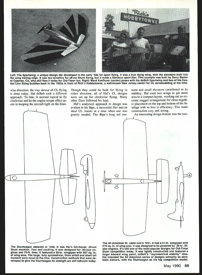 Fran Ptaskiewicz photographed 1946 Ripe Originally powered Ohisson & Rice 23 Fran says needed added power DeLong 30 fly well Fran early employee Hal deBolts kit company has good memories early days both working Hal competing him Control Line meets CONTROL LINE modelers have tak ing Old-Timer Stunt flying OTS short greater numbers recent years OTS event rules call aircraft de signs dating prior December 31 1952 aerobatic pattern flown outlined 195 1-52 AMA rule book popularity nostalgia vintage events cuts across modeling categories Control Line OTS paralleled SAM Society Antique Modelers Old-Timer events Free Flight Radio Control terest early RC models prompted re cent formation Vintage Radio ConHal deBolts trol Society Probably thing draws modelers Old-Timer events lower level competitive pressure con tests tend fun oriented em phasis social gatherings camaraderie rather win-at-all-costs competition Models SAM Old-Timer Free Flight Radio Control events must de signs originally built no later De cember 1942 cutoff date An tique SAM designs December 1938 Vintage RC Society looking three cate gories Early Antique designs originat ing prior December 31 1950 Early Bird models dating 1951 through December 1955 Vintage designs Classic CL Stunters look innovator Hal deBolts tremendous impact early days Control Line flying great contribution designs have made sport U Dick Sarpolus Two nice shots Super Ripe ship built Jim Lee powered K&B 40 Super Bipe introduced 1948 third series acrobatic deBolts biplane designs fully symmetrical airfoils shorter tail moment larger elevators original Ripe Super Ripe evolved excellent popular CL trainer As CL Aerobatics progressed monoplanes came own superior performers Bipes fell out favor course Hal early became pacesetter monoplane design well 66 Model Aviation famous Ripe design got Hal deRolt business 1948 photo taken Fran Ptas kiewicz shows Hals original Ripe particular model powered Drone Diesel originating between January 1956 De cember 1965 Control Line Old-Timer Stunt de signs must December 31 1952 ear lier vintage Currently under discussion CL Nostalgia category would lim ited 25-year-old designs idea continually open door different aircraft designs Old-Timer events attract participants ages Often models go back farther modelers repli cating models introduced before bornand having great time fly ing Other modelers indeed going back time re-creating designs flew years ago Today course can better materialsstronger glues better coverings paints smoother powerful engines cases latter-day ver sions classic designs fly perform better prototypes truly want go back old days can still build silkspan dope complete authenticity can add reproduction ignition engine Whether Control Line Free Flight RC finding plans vintage models isnt much problem wide spread interest older designs plan repro ductions available quite few sources Everyone involved nostalgia flight has own favorites among old designs whove sport long enough probably favor aircraft flew back Fifties Sixties OTS circles designer mentioned Hal deBolt As long time competitor designer kit manufac turer Hal deservedly AMA Hall Fame Though probably best known today achievements RC has also active Control Line Free Flight over years keep winning techniques secret Hal has consistently reached out other modelers assistHals 1948-designed Stuntwagon recently built author left see its bare bones right finished model Hals con struction techniques set pace futuresheeted leading trailing edges top bottom spars reinforcing spar diagonals rib cap stripsall 1948 Stuntwagon first designs capable todays CL Stunt routines both structurally aerodynamically May 1990 67 Two very nice views classy Bipe built Ron Kirchner Encino CA Ron presently flies gem Control Line exhibitions shows Its powered Testor/McCoy 29 engine Doug Dahike photographed back 1979 Old-Timer Stunt competition holding deBolt-designed Stuntwagon 30 Hal de signed kitted smaller version Stuntwagon popular 29 engines John Miske photographed 1950 Stuntwagon 30 powered Dooling 29 ance encouragement Hal pivotal growth Con trol Line modeling branch story CL aircraft designs encapsulates history CL competition development Hal always th leading edge tech nology early days CL compe tition aircraft performance helped set format competitive events favored Speed Racing events both CL RC competition commenting Aerobatics competition demands prac 0 hes ever time cer tainly didnt stop Hal however coming top Aerobatics competitor excellent aircraft hes developed Hal deBolt began flying Control Line earnest serving Patuxent River Naval Air Station Maryland during 1940s An airplane modeling group known Navy Patuxent River Model Engi neers organized recreational activity understand club still ac / tive today Control Line newest form model aircraft flying time design efforts aimed stable per formance engineering plane stay out end control lines Lead-out rake outboard wing tip weight engine thrust offset rudder trim other under pinnings successful CL flight still being worked out Jim Walker traveling country popularizing CL flight demonstrations Fireball flew counterclock \ I 0 Bipe deBolts first kit introduced 1945 Though CL flying new relatively unknown activity design workedit stable easy fun fly stayed out end lines good trainer needed 50000 kits produced sold model long tail moment Its wing span 22 200 sq area flat bottom airfoils cI Super Bipe came out 1948 third Bipe series final development deBolts biplane designs larger symmetrical airfoils model shorter tail moment larger elevators side-mounted engine 28-in span 200 sq wing area aerobatic earlier ones 68 Model Aviation Left An lnfantwagon powered Fox 049 engine built Fred Bridgeman 0 santa Ana CA K&B came out its Tirst hA en gine Infant Hal soon responded lnfantwagon earliest small Stunters quickly accepted modelers thou sands kits sold Right Another Stuntwagon 30 built photographed 1950s Ward VanDuzer remembers fondl