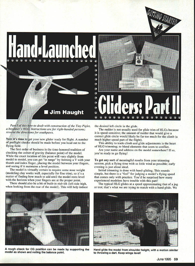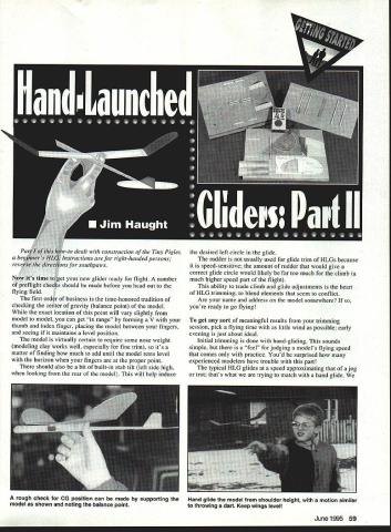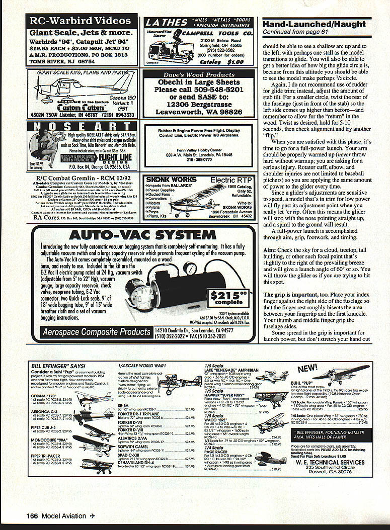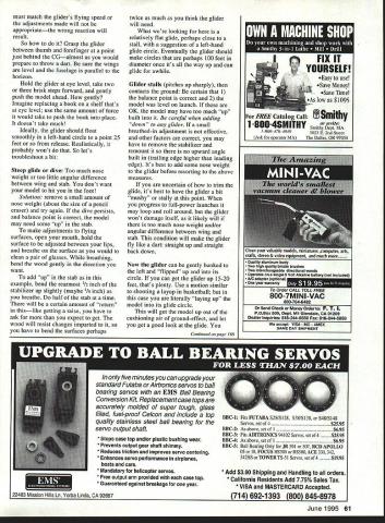 -to dealt Construction Tiny Piglet instructions right-handed persons ns southpaws time t~et new glider ready flight number peflight checs should made before head out tiying field first order business time-honored tradition checking center gravity balance point model exact location point will vary slightly model model can get range forming V thumb index finger placing model between fingers seeing maintains level position model virtually certain require some nose weight modeling clay works well especially fine trim its matter finding much add until model rests level horizon fingers proper point should also bit built-in stab tilt left side high looking rear model will help induce desired left circle glide rudder usually used glide trim HLGs because speed-sensitive amount rudder would give correct glide circle would likely far too much climb much higher speed part flight ability trade climb glide adjustments heart HLG trimming blend elements seem conflict Are name address model somewhere youre ready go flying get sort meaningful results trimming session pick flying time little wind possible early evening just about ideal Initial trimming done hand-gliding sounds simple feel judging models flying speed comes practice Youd surprised experienced modelers have trouble part typical HLG glides speed approximating jog trot thats what trying match hand glide June1995 59 rough check CO position can made supporting model shown noting balance point Hand glide model shoulder height motion similar throwing dart Keep wings level Proper gripnot too compact too stretchedis important Sandpaper glued fuselage sides keeps grip consistent moment truth launch begins Left foot planted eyes target weight comes forward adjust breathe surface bend desired direction compensating tendency return original shape L Release position Glider banked right launched nose up Should make rolling turn left glide Catapult launch similar HLG version Tiny Piglet set Junior national record its first contest 60 Model Aviation ch slightly right wind much force can consistently muster takes practice must match gliders flying speed adjustments made will appropriatethe wrong reaction will result So Grasp glider between thumb forefinger point just behind CCalmost would prepare throw dart sure wings level fuselage parallel horizon Hold glider eye level take two three brisk steps forward gently push model ahead gently Imagine replacing book shelf thats eye level use same amount force would take push book place doesnt take much Ideally glider should float smoothly left-hand circle point 25 feet release Realistically probably wont So lets troubleshoot bit Steep glide dive Too much nose weight too little angular difference between wing stab dont want model hit foot Solution remove small amount nose weight about size pencil eraser try again dive persists balance point correct model may need some up stab make adjustments flying surfaces open mouth hold surface adjusted between lips breathe surface would clean pair glasses breathing bend wood gently direction want add up stab example bend rearmost 1/2 inch stabilizer up slightly maybe /s inch breathe half stab time will certain amount return thislike getting raise have ask expect get wood will resist changes imparted have bend surfaces perhaps twice much think glider will need What looking relatively flat glide perhaps close stall suggestion left-hand glide circle Eventually glider should make circles perhaps 100 feet diameter once its way up can glide awhile Glider stalls pitches up sharply contacts ground certain 1 balance point correct 2 model level launch OK model may have too much up built careful adding down glider small breathed-in adjustment effective other factors correct may have remove stabilizer remount no upward angle built trailing edge higher leading edge Its best add some nose weight glider before resorting above measures uncertain trim glide its best have glider bit mushy stally point progress full-power launches may loop roll around glider wont damage itself likely will too much nose weight and/or angular difference between wing stab condition will make glider fly like dart straight up straight back down Now glider can gently banked left flipped up its circle can get glider up 15-20 feet thats plenty Use motion similar shooting layup basketball case literally laying up model its glide circle will get model up out cushioning air ground-effect let get good look glide GEasy use eSave Money eSave Time eAs low $1095 FREE Catalog Call 1 Smithy AffaAahm.uwrite 1 5UUIMIINJ smtr yDept MA 1 800-476 48493023 E 2nd Street Ask operator MAThe Dalles OR 9705S miniatures computer arts Lrau sieren & viaeo equipment much Quality aluminum body Two high quality bristle brushes Two interchangeable direcilonal wands Opersies singleS Voli Alkaline battery included AJC adapter tootional Oneyearwarranty Order CALL TOLL FREE 800-7MINI-VAC 800-7644482 Send Check Money Order P T POBox 509 Dept Ml Glendale CA 91209 Dealer inquiries 818-244-0888 Fax 818-244-5858 U accept VISA MC AMEX SAME DAY SHIPMENT Continued page 166 five minutes can upgrade standard Futaba orAirtronics seivos ball bearing servos EMS Ball Bearing Conversion Kit Replacement case tops accurately molded super tough glass filled fuel-proof Celcon include top qua fity stainless steel ball bearing servo output shaft * Stops case top andlor plastic bushing wear * Prevents output gear shaft shimmy * Reduces friction improves servo centering * Enhances servo performance airplanes boats cars * Mandatory helicopter servos * Free output arm provided case top * Guaranteed against breakage year BBC-1Fits FUTABA S28/S128 S38/S138 orS48/S148 Servos set 4$2595 BBC2As above set 1$695 BBC-3Fits AIRTRONICS 94102 Servos set 4$2595 BBC-4As above set 1$695 BBC-5Ball Bearing Only JR 501 507 RCDAPOLLO 05 10 FOCUS H5300 H5500 ACE 330342 342HS TOWER TS-51 Servos set 4$1995 * Add $300 Shipping Handling orders California Residents Add 775% Sales Tax * VISA MASTERCARD 