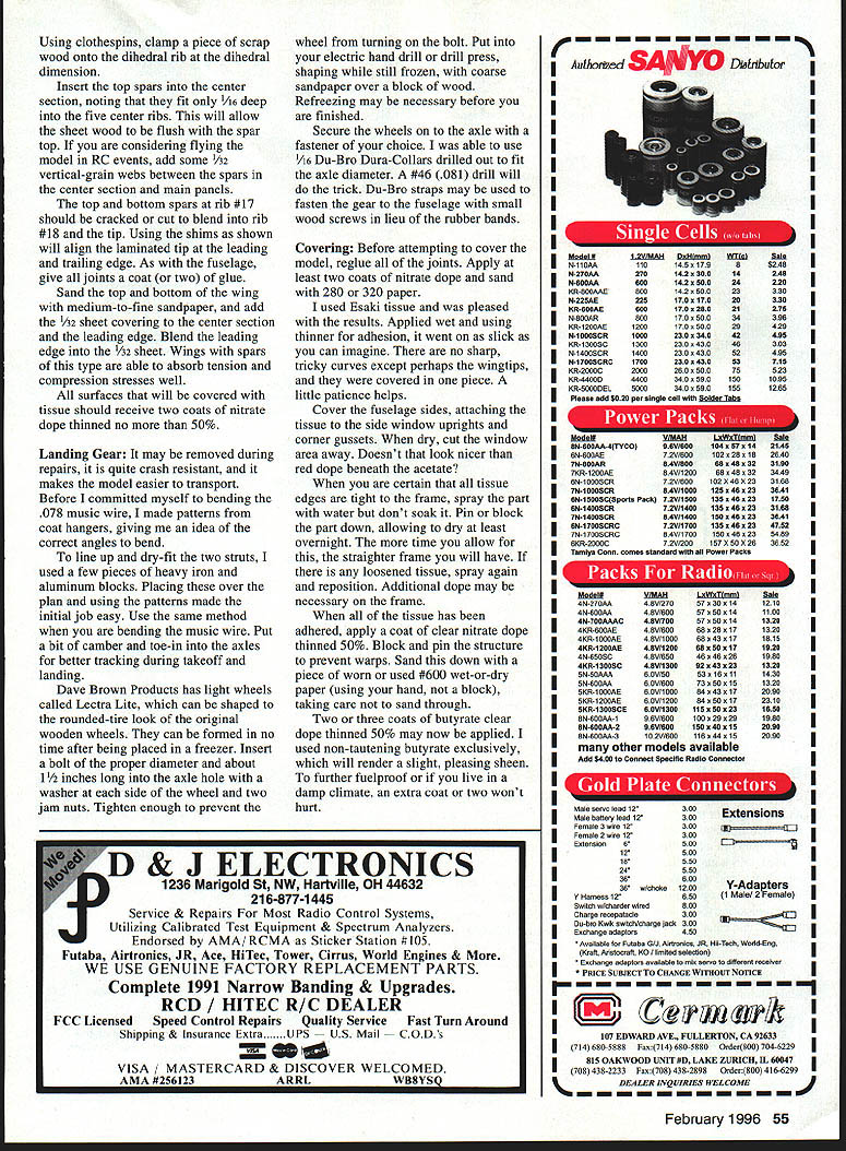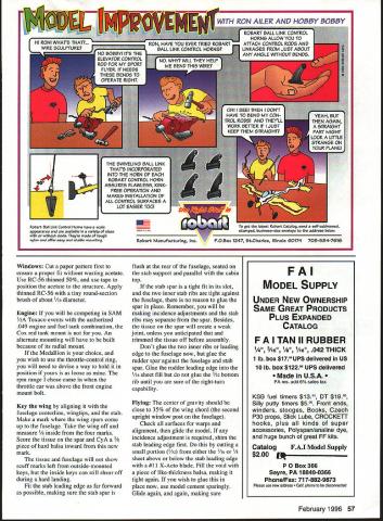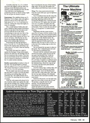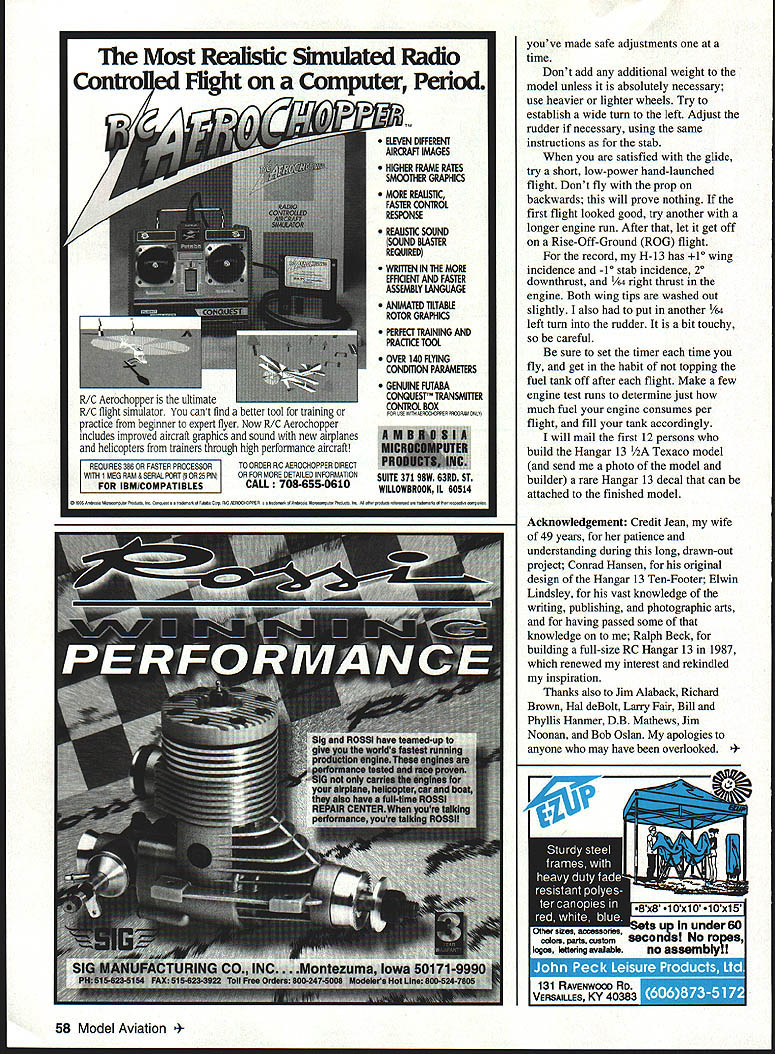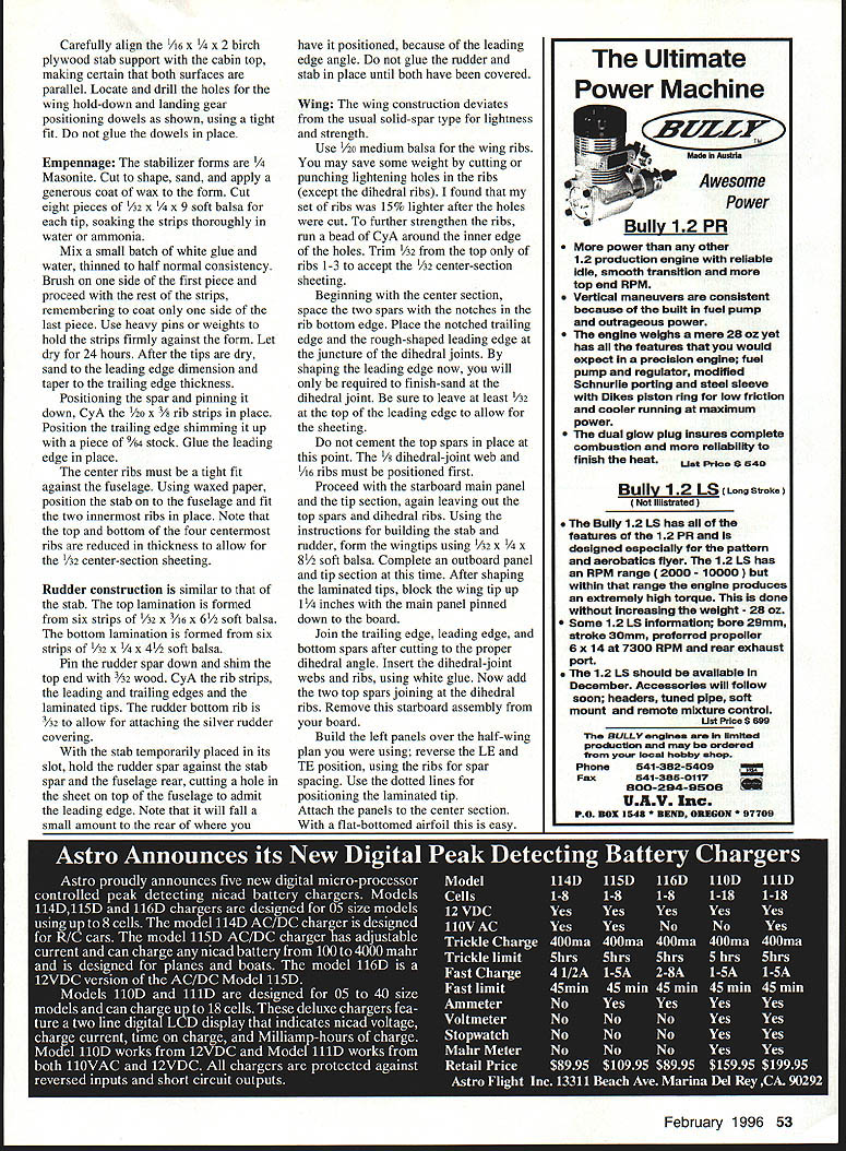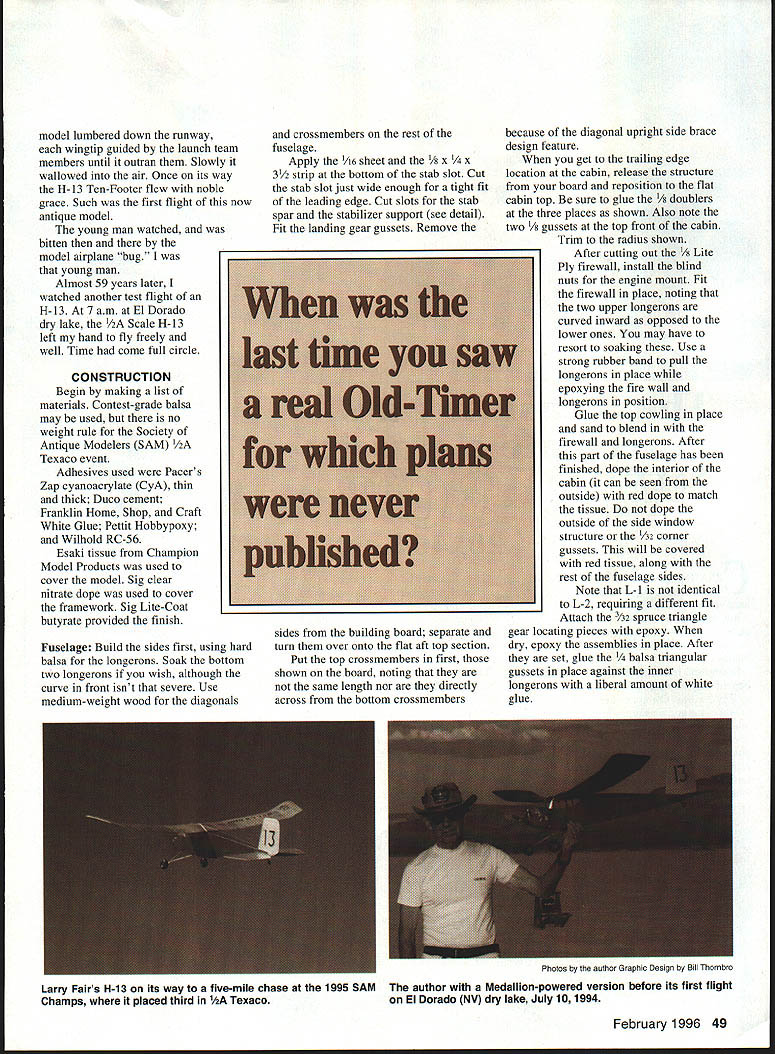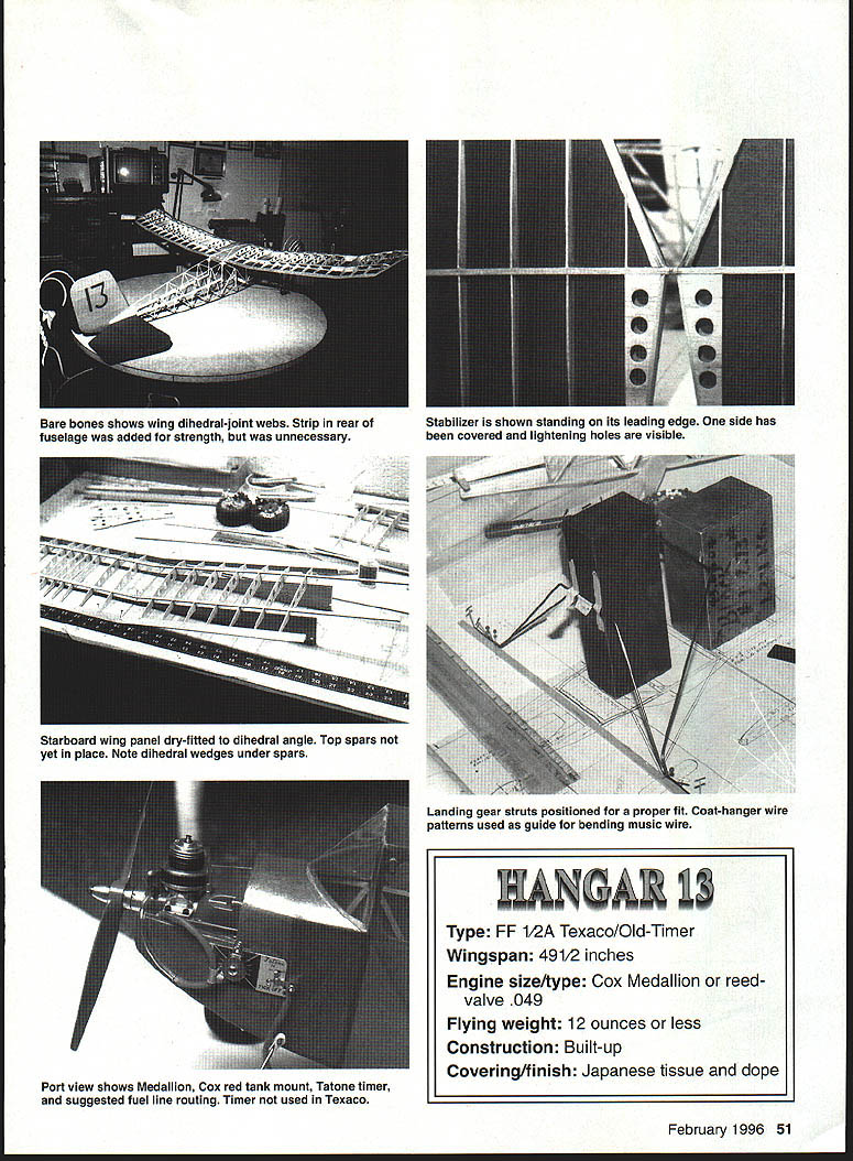 NO Texaco Gozp Nigbsuw scene Rock County Airport mostly mown hayfield near Beloit Wisconsin date August 25 1935 young fellow stands sidelines watching huge model airplane being launched first test flight Hangar 13 project designed club leader advisor Conrad Hansen built club members tension among present obvious peeled glue fingertips patiently fitted bits pieces build 10-foot wing bulky fuselage 40-inch-span stabilizer its Brown Jr engine revving scream 48 Model Aviation 4for original 1935 Hangar 13 Ten-Footer tar-paper takeoff strip Rock County WI Airport model lumbered down runway wingtip guided launch team members until outran Slowly wallowed air Once its way H-13 Ten-Footer flew noble grace Such first flight now antique model young man watched bitten model airplane bug young man Almost 59 years later watched another test flight H-13 7 am El Dorado dry lake Y2A Scale H-13 left hand fly freely well Time come full circle CONSTRUCTION Begin making list materials Contest-grade balsa may used no weight rule Society Antique Modelers SAM 1/2A Texaco event Adhesives used Pacers Zap cyanoacrylate CyA thin thick Duco cement Franklin Home Shop Craft White Glue Pettit Hobbypoxy Wilhold RC-56 Esaki tissue Champion Model Products used cover model Sig clear nitrate dope used cover framework Sig Lite-Coat butyrate provided finish Fuselage Build sides first using hard balsa longerons Soak bottom two longerons wish although curve front isnt severe Use medium-weight wood diagonals crossmembers rest fuselage Apply 1/16 sheet /8 X strip bottom stab slot Cut stab slot just wide enough tight fit leading edge Cut slots stab spar stabilizer support see detail Fit landing gear gussets Remove sides building board separate turn over onto flat aft top section Put top crossmembers first shown board noting same length nor directly across bottom crossmembers because diagonal upright side brace design feature get trailing edge location cabin release structure board reposition flat cabin top sure glue /a doublers three places shown Also note two /a gussets top front cabin Trim radius shown After cutting out 1/8 Lite Ply firewall install blind nuts engine mount Fit firewall place noting two upper longerons curved inward opposed lower ones may have resort soaking Use strong rubber band pull longerons place epoxying fire wall longerons position Glue top cowling place sand blend firewall longerons After part fuselage has finished dope interior cabin can seen outside red dope match tissue dope outside side window structure 142 corner gussets will covered red tissue along rest fuselage sides Note L- 1 identical L-2 requiring different fit Attach A2 spruce triangle gear locating pieces epoxy dry epoxy assemblies place After set glue /4 balsa triangular gussets place against inner longerons liberal amount white glue February 1996 49 Larry Fairs H-13 its way five-mile chase 1995 SAM author Medallion-powered version before its first flight Champs placed third 1/IA Texaco El Dorado NV dry lake July 101994 Photos author Graphic Design Bill Thornbro Port view shows Medallion Cox red tank mount Tatone timer suggested fuel line routing Timer used Texaco Landing gear struts positioned proper fit Coat-hanger wire patterns used guide bending music wire February 1996 51 Bare bones shows wing dihedral-joint webs Strip rear fuselage added strength unnecessary Stabilizer shown standing its leading edge side has covered lightening holes visible Starboard wing panel dry-fitted dihedral angle Top spars yet place Note dihedral wedges under spars Type FE 1/2A Texaco/Old-Timer Wingspan 49t2 inches Engine size/type Cox Medallion reed valve 049 Flying weight 12 ounces less Construction Built-up Covering/finish Japanese tissue dope PP I/B 01/4 BA OP ON LA IAN B ALS TRIE EGO L B LAO CtOR CA PARK NA ERAE5 CENTER SECTION 2 N TrLA V. 41 4zf iCR /1 I/N SO lB NE 1 B / ON ADA ~O10IOSREEAREBREAK/ PENEO\TOTL20RIiNJOR K LAIRI/IN B1110 ElK A_________ 2 CICR PKTIELJO NT ACE TIP UIOEDRAL AREAOPRSA ICGXITAAAPLAA/B CUPLOCATION Er BUTI/Ax TCIGWRSIREA 070I AJONERSLAO NAIl TAKES TAO LERA NOTATES ALE VZ9SOSI BRA 8SCE 1110 DARK TO AUOR EAR P/OCR EAHARISA RITA CEO SE OR AIRS tYIlK SO ATIRTANARS SX3j1 ALCT. __1 LRCBNDIJSLAOLSSARSSE AEAOARA/ BIRbrOA 0 -TURELALA ELAT -ERESACBBEPRTSO/AA zI4 LiCS LEE PTITA SRRXE L2TOIRBOJLAB POUR SENI KUINA NUTSI CI Ky EAT SORTSALE TARTEALL CONTROL RET ALL OKA UTOEPT C AR INAT STUAN ALL TIRE - CO [JIIADIU RALOEL TIP OAR ABEO IlOOSO P-AA/lEA ICC AT/KEEP SEAR U CAUCOUTLINE ARE LETTERING BLADE PRO PANE ECRECERS ALTER IIUAB A/A 1100/ATOREBAL STORy11801 SB _T__ ________ I________________ I/BA AIR AT SPAR CQRAPICIP/TIZEU/ UTU STCSCAA UAO EKIRLO BKRLDA UP TH13 1OTE AR/AINAT PLOWS RANANTWINARbASIN NISLAPAB ROllS RING ROEN-ENA 55 INCROL MODEL AVIATION 801 0 0 CD 0 -4 Carefully align A6 x birch plywood stab support cabin top making certain both surfaces parallel Locate drill holes wing hold-down landing gear positioning dowels shown using tight fit glue dowels place Empennage The stabilizer forms Masonite Cut shape sand apply generous coat wax form Cut eight pieces 2 x soft balsa tip soaking strips thoroughly water ammonia Mix small batch white glue water thinned half normal consistency Brush side first piece proceed rest strips remembering coat side last piece Use heavy pins weights hold strips firmly against form Let dry 24 hours After tips dry sand leading edge dimension taper trailing edge thickness Positioning spar pinning down CyA o x /8 rib strips place Position trailing edge shimming up piece /64 stock Glue leading edge place center ribs must tight fit against fuselage Using waxed paper position stab fuselage fit two innermost ribs place Note top bottom four centermost ribs reduced thickness allow A2 center-section sheeting Rudder construction similar stab top lamination formed six strips h2 x 3A6 x 6/2 soft balsa bottom lamination formed six strips A2 x /2 soft balsa Pin rudder spar down shim top end 3A2 wood CyA rib strips leading trailing