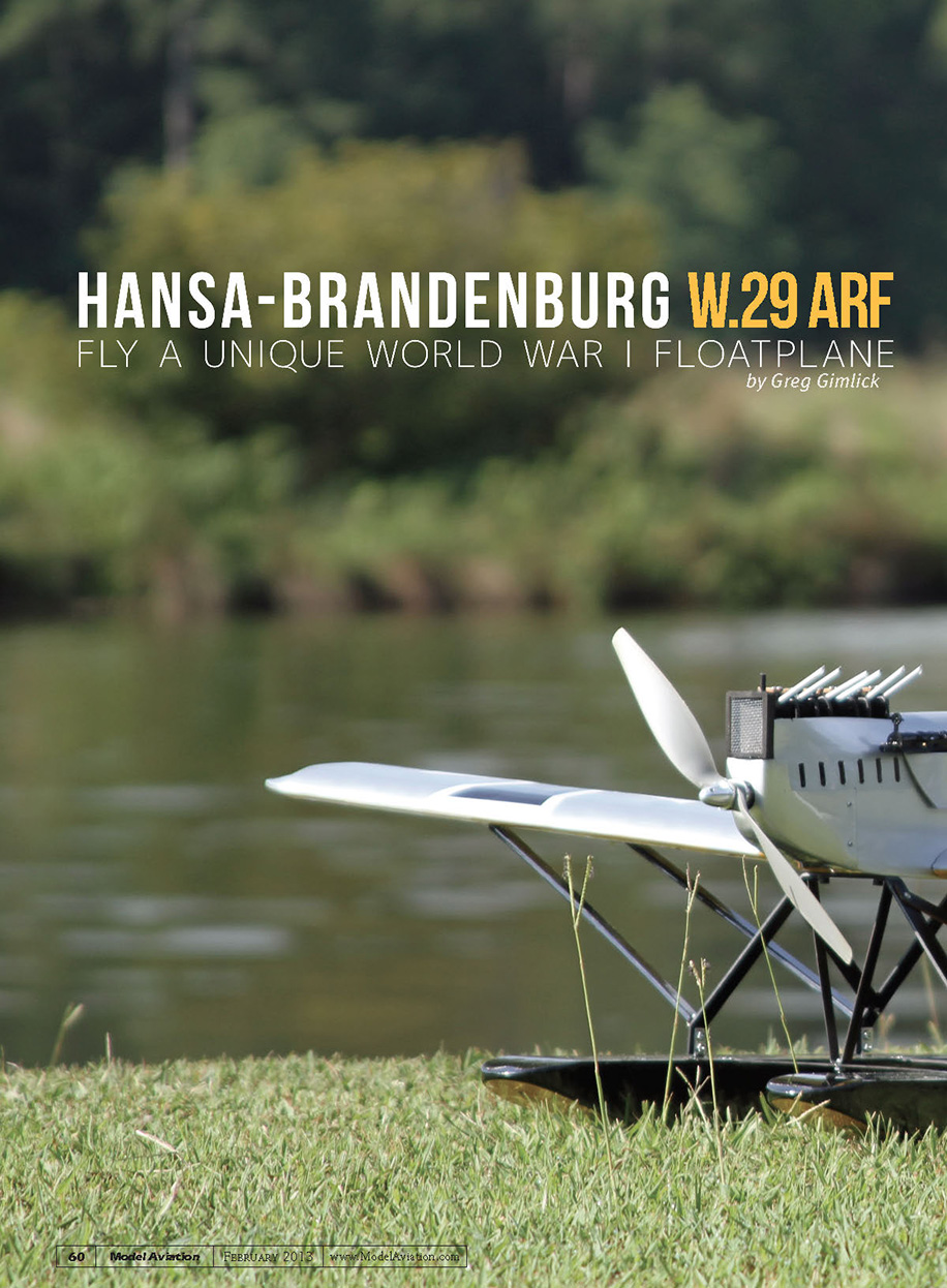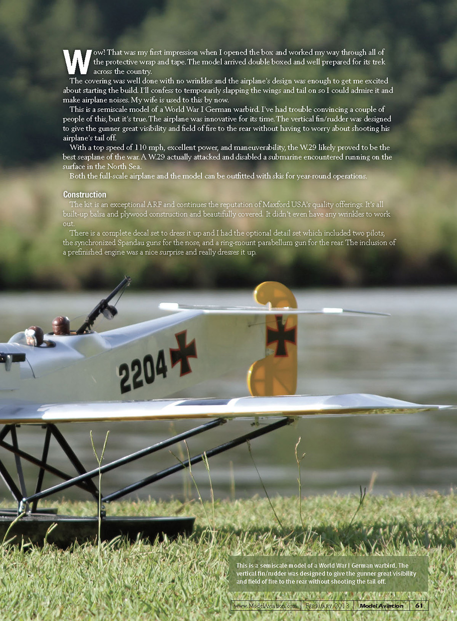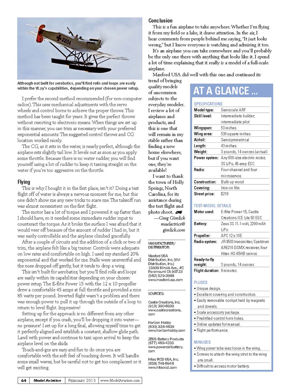 Although not built for aerobatics, you’ll find rolls and loops are easily within the W.29’s capabilities, depending on your chosen power setup.SPECIFICATIONSModel type: Semiscale ARFSkill level: Intermediate builder; intermediate pilotWingspan: 53 inchesWing area: 530 square inchesAirfoil: SemisymmetricalLength: 43 inchesWeight: 3 pounds, 14 ounces (actual)Power system: Any 600-size electric motor, 3S LiPo, 45-amp ESCRadio: Four-channel and four microservosConstruction: Built-up woodCovering: Iron-on filmStreet price: $219TEST-MODEL DETAILSMotor used: E-flite Power 15, Castle Creations ICE Lite 50 ESC Battery: Zeus 3S 11.1-volt, 2200 mAh LiPoPropeller: APC 12 x 10ERadio system: JR 9503 transmitter, Spektrum AR6210 DSMX receiver, four Hitec HS-65HB servosReady-to-flyweight: 3 pounds, 14 ouncesFlight duration: 8 minutesPLUSES• Unique design.• Excellent covering and construction.• Easily removable cockpit held by magnets and dowels.• Scale accessory package.• Predrilled control horn holes.• Online updates for manual.• Flight performance.MINUSES• Wing joiner tube was loose in the wing.• Screws to attach the wing strut to the wing are small.• Difficult to access motor battery.AT A GLANCE ... I prefer the second method recommended (for non-computer radios). This uses mechanical adjustments with the servo wheels and control horns to achieve the proper throws. This method has been taught for years. It gives the perfect throws without resorting to electronic means. When things are set up in this manner, you can trim as necessary with your preferred exponential amounts. The suggested control throws and CG location worked nicely. The CG, as it sets in the water, is nearly perfect, although the airplane sets slightly tail low. It levels out as soon as you apply some throttle. Because there is no water rudder, you will find yourself using a lot of rudder to keep it taxiing straight on the water if you’re too aggressive on the throttle. Flying This is why I bought it in the first place, isn’t it? Doing a test flight off of water is always a nervous moment for me, but this one didn’t show me any new tricks to scare me. The takeoff run was almost nonexistent on the first flight. The motor has a lot of torque and I powered it up faster than I should have, so it needed some immediate rudder input to counteract the torque. As it broke the surface I was afraid that it would veer off because of the amount of rudder I had in, but it was easily controllable and the airplane climbed gracefully. After a couple of circuits and the addition of a click or two of trim, the airplane felt like a big trainer. Controls were adequate on low rates and comfortable on high. I used my standard 20% exponential and that worked for me. Stalls were uneventful and the nose dropped off gently, but it tends to drop a wing. This isn’t built for aerobatics, but you’ll find rolls and loops are easily within its capabilities depending on your chosen power setup. The E-flite Power 15 with the 12 x 10 propeller drew a comfortable 45 amps at full throttle and provided a nice 85 watts per pound. Inverted flight wasn’t a problem and there was enough power to pull it up through the outside of a loop to return to level flight. Impressive! Setting up for the approach is no different from any other airplane, except if you crash, you’ll be dropping it into water—no pressure! I set up for a long final, allowing myself time to get it perfectly aligned and establish a constant, shallow glide path. Land with power and continue to taxi upon arrival to keep the airplane level on the skids. Touch-and-gos are easy and fun to do once you are comfortable with the soft feel of touching down. It will handle some small waves, but be careful not to get too complacent or it will get exciting. Conclusion This is a fun airplane to take anywhere. Whether I’m flying it from my field or a lake, it draws attention. In the air, I hear comments from people behind me saying, “It just looks wrong,” but I know everyone is watching and admiring it too. It’s an airplane you can take somewhere and you’ll probably be the only one there with anything that looks like it. I spend a lot of time explaining that it really is a model of a full-scale airplane. Maxford USA did well with this one and continued its trend of bringing quality models of uncommon subjects to the everyday modeler. I review a lot of airplanes and products, and this is one that will remain in my stable rather than finding a new home elsewhere, but if you want one, they’re available! I want to thank the town of Holly Springs, North Carolina, for its assistance during the test flight and photo shoot. —Greg Gimlickmaelectrics@gimlick.comMANUFACTURER/DISTRIBUTOR: Maxford USA Distribution, Inc. (Vivi Distribution, Inc.)15939 Illinois Ave., #CParamount CA 90723(562) 529-3988www.maxfordusa.comSOURCES: Castle Creations, Inc.(913) 390-6939 www.castlecreations.com Horizon Hobby(800) 338-4639www.horizonhobby.com ZEUS Battery Products(877) 469-4255www.powercellbattery.com Hitec RCD USA, Inc.(858) 748-6948www.hitecrcd.com64Model Aviation February 2013www.ModelAviation.com060