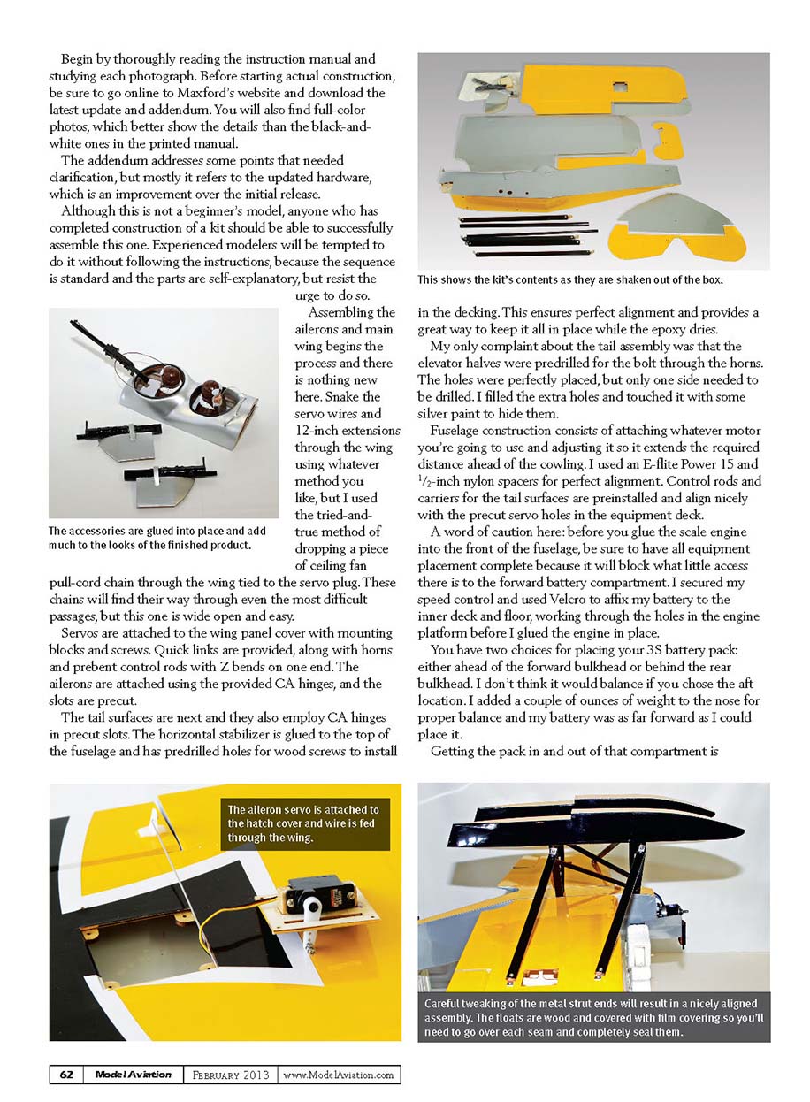 This shows the kit’s contents as they are shaken out of the box.The accessories are glued into place and add much to the looks of the nished product.The aileron servo is attached to the hatch cover and wire is fed through the wing.Careful tweaking of the metal strut ends will result in a nicely aligned assembly. The floats are wood and covered with lm covering so you’ll need to go over each seam and completely seal them. Begin by thoroughly reading the instruction manual and studying each photograph. Before starting actual construction, be sure to go online to Maxford’s website and download the latest update and addendum. You will also fi nd full-color photos, which better show the details than the black-and-white ones in the printed manual. The addendum addresses some points that needed clarifi cation, but mostly it refers to the updated hardware, which is an improvement over the initial release. Although this is not a beginner’s model, anyone who has completed construction of a kit should be able to successfully assemble this one. Experienced modelers will be tempted to do it without following the instructions, because the sequence is standard and the parts are self-explanatory, but resist the urge to do so. Assembling the ailerons and main wing begins the process and there is nothing new here. Snake the servo wires and 12-inch extensions through the wing using whatever method you like, but I used the tried-and-true method of dropping a piece of ceiling fan pull-cord chain through the wing tied to the servo plug. These chains will fi nd their way through even the most diffi cult passages, but this one is wide open and easy. Servos are attached to the wing panel cover with mounting blocks and screws. Quick links are provided, along with horns and prebent control rods with Z bends on one end. The ailerons are attached using the provided CA hinges, and the slots are precut. The tail surfaces are next and they also employ CA hinges in precut slots. The horizontal stabilizer is glued to the top of the fuselage and has predrilled holes for wood screws to install in the decking. This ensures perfect alignment and provides a great way to keep it all in place while the epoxy dries. My only complaint about the tail assembly was that the elevator halves were predrilled for the bolt through the horns. The holes were perfectly placed, but only one side needed to be drilled. I fi lled the extra holes and touched it with some silver paint to hide them. Fuselage construction consists of attaching whatever motor you’re going to use and adjusting it so it extends the required distance ahead of the cowling. I used an E-fl ite Power 15 and 1/2-inch nylon spacers for perfect alignment. Control rods and carriers for the tail surfaces are preinstalled and align nicely with the precut servo holes in the equipment deck. A word of caution here: before you glue the scale engine into the front of the fuselage, be sure to have all equipment placement complete because it will block what little access there is to the forward battery compartment. I secured my speed control and used Velcro to affi x my battery to the inner deck and fl oor, working through the holes in the engine platform before I glued the engine in place. You have two choices for placing your 3S battery pack: either ahead of the forward bulkhead or behind the rear bulkhead. I don’t think it would balance if you chose the aft location. I added a couple of ounces of weight to the nose for proper balance and my battery was as far forward as I could place it. Getting the pack in and out of that compartment is 62Model Aviation FEBRUARY 2013www.ModelAviation.com060