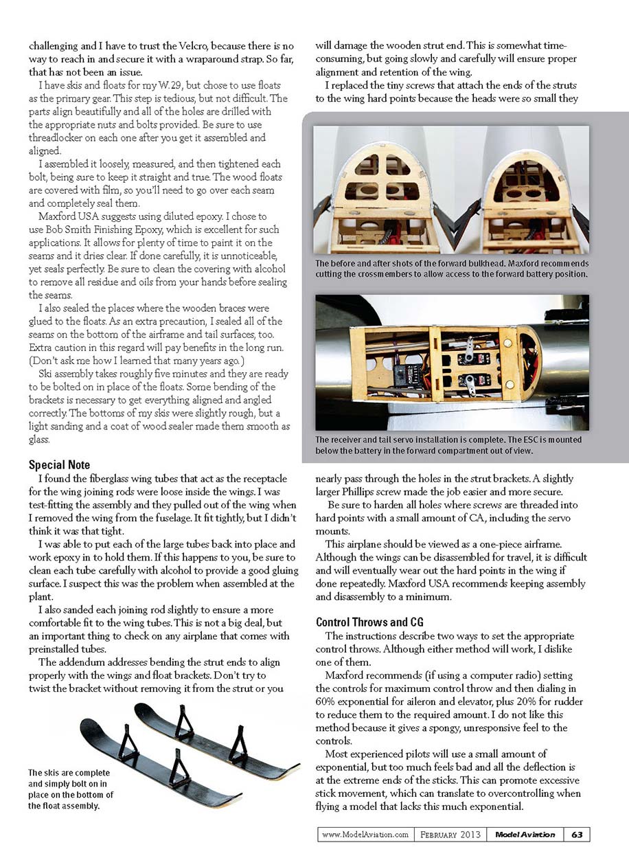 er shots of the forward bulkhead. Maxford recommends cutting the crossmembers to allow access to the forward battery position.The receiver and tail servo installation is complete. The ESC is mounted below the battery in the forward compartment out of view.challenging and I have to trust the Velcro, because there is no way to reach in and secure it with a wraparound strap. So far, that has not been an issue. I have skis and fl oats for my W.29, but chose to use fl oats as the primary gear. This step is tedious, but not diffi cult. The parts align beautifully and all of the holes are drilled with the appropriate nuts and bolts provided. Be sure to use threadlocker on each one after you get it assembled and aligned. I assembled it loosely, measured, and then tightened each bolt, being sure to keep it straight and true. The wood fl oats are covered with fi lm, so you’ll need to go over each seam and completely seal them. Maxford USA suggests using diluted epoxy. I chose to use Bob Smith Finishing Epoxy, which is excellent for such applications. It allows for plenty of time to paint it on the seams and it dries clear. If done carefully, it is unnoticeable, yet seals perfectly. Be sure to clean the covering with alcohol to remove all residue and oils from your hands before sealing the seams. I also sealed the places where the wooden braces were glued to the fl oats. As an extra precaution, I sealed all of the seams on the bottom of the airframe and tail surfaces, too. Extra caution in this regard will pay benefi ts in the long run. (Don’t ask me how I learned that many years ago.) Ski assembly takes roughly fi ve minutes and they are ready to be bolted on in place of the fl oats. Some bending of the brackets is necessary to get everything aligned and angled correctly. The bottoms of my skis were slightly rough, but a light sanding and a coat of wood sealer made them smooth as glass.Special Note I found the fi berglass wing tubes that act as the receptacle for the wing joining rods were loose inside the wings. I was test-fi tting the assembly and they pulled out of the wing when I removed the wing from the fuselage. It fi t tightly, but I didn’t think it was that tight. I was able to put each of the large tubes back into place and work epoxy in to hold them. If this happens to you, be sure to clean each tube carefully with alcohol to provide a good gluing surface. I suspect this was the problem when assembled at the plant. I also sanded each joining rod slightly to ensure a more comfortable fi t to the wing tubes. This is not a big deal, but an important thing to check on any airplane that comes with preinstalled tubes. The addendum addresses bending the strut ends to align properly with the wings and fl oat brackets. Don’t try to twist the bracket without removing it from the strut or you will damage the wooden strut end. This is somewhat time-consuming, but going slowly and carefully will ensure proper alignment and retention of the wing. I replaced the tiny screws that attach the ends of the struts to the wing hard points because the heads were so small they nearly pass through the holes in the strut brackets. A slightly larger Phillips screw made the job easier and more secure. Be sure to harden all holes where screws are threaded into hard points with a small amount of CA, including the servo mounts. This airplane should be viewed as a one-piece airframe. Although the wings can be disassembled for travel, it is diffi cult and will eventually wear out the hard points in the wing if done repeatedly. Maxford USA recommends keeping assembly and disassembly to a minimum.Control Throws and CG The instructions describe two ways to set the appropriate control throws. Although either method will work, I dislike one of them. Maxford recommends (if using a computer radio) setting the controls for maximum control throw and then dialing in 60% exponential for aileron and elevator, plus 20% for rudder to reduce them to the required amount. I do not like this method because it gives a spongy, unresponsive feel to the controls. Most experienced pilots will use a small amount of exponential, but too much feels bad and all the defl ection is at the extreme ends of the sticks. This can promote excessive stick movement, which can translate to overcontrolling when fl ying a model that lacks this much exponential.63Model Aviation FEBRUARY 2013www.ModelAviation.com060