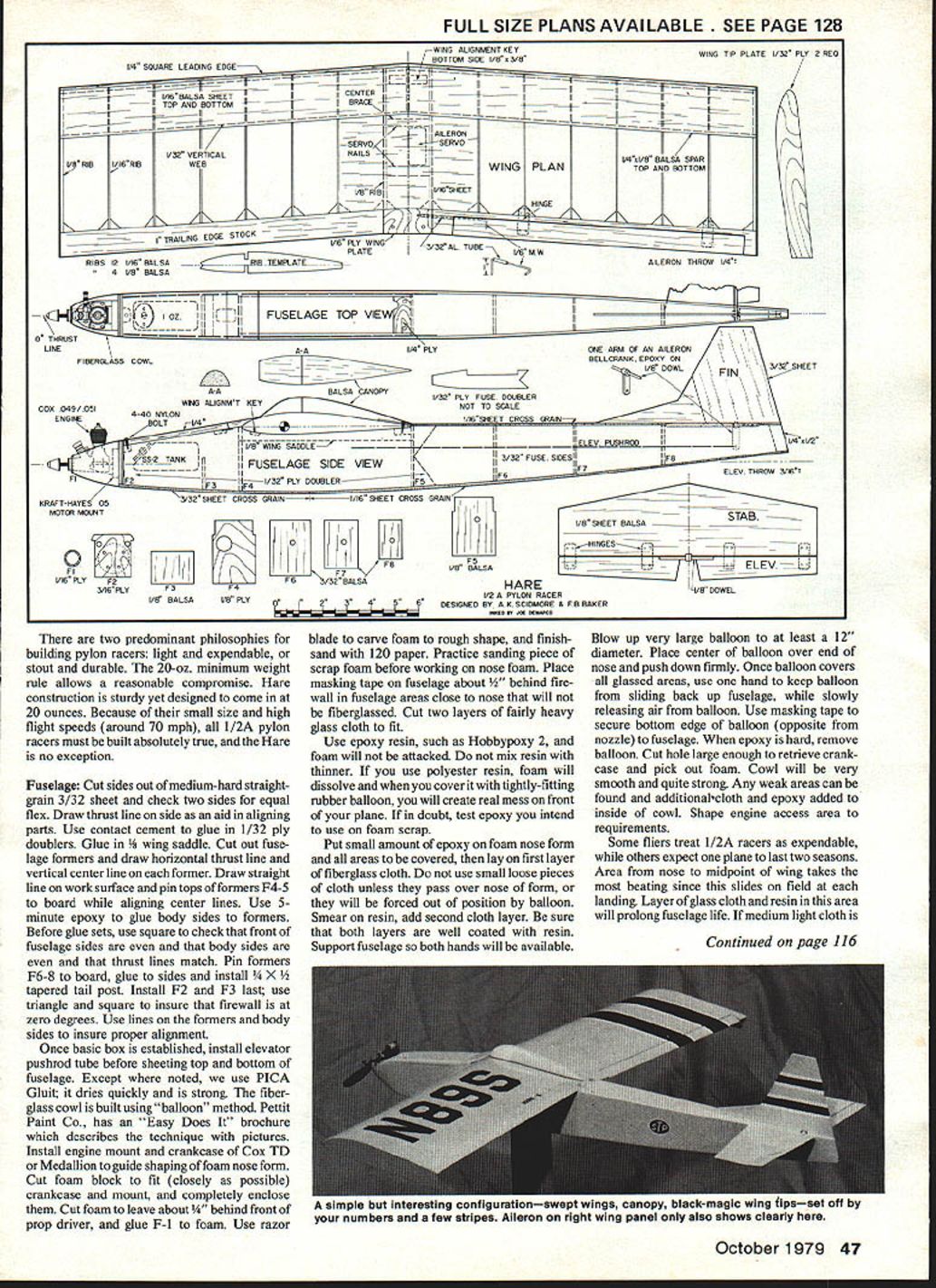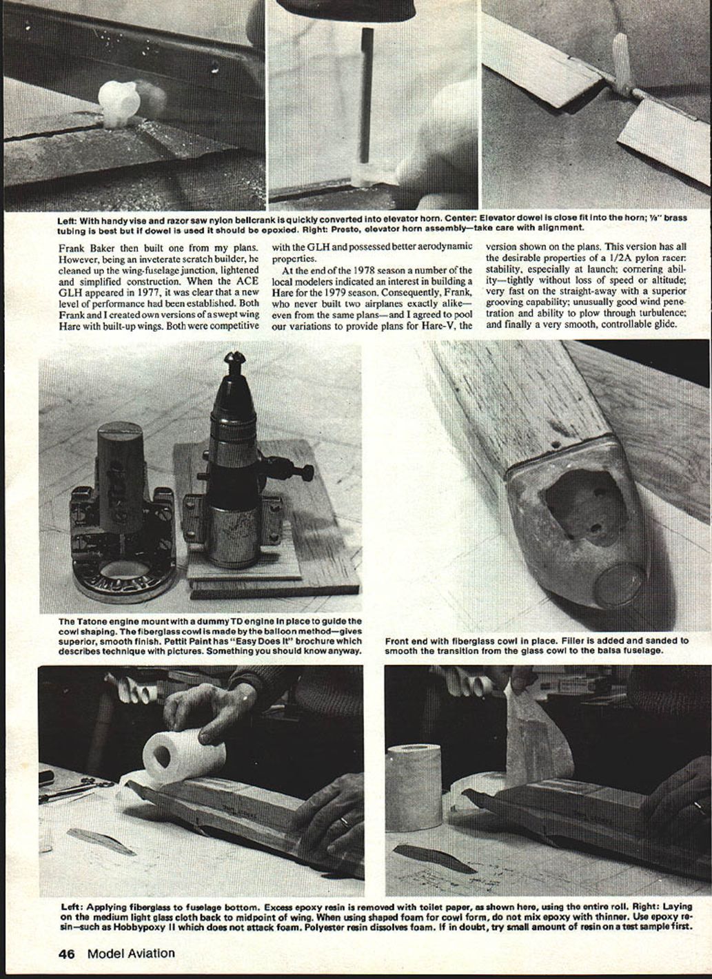 hot-dog pilots No has overwhelming advantage club Madison Area Radio Control Society MARCS contest event has cap tured interest large number members 1/2A pylon racing event beginning racer pro can both have great time neophyte just trying stay pack fin Yet same race experienced racers shaving pylons using pet strategies popularity due number factors equipment requirements hence investment minimal rules preclude winning event machine shop design parameters lead variety aircraft comparable performance finally little no practice necessary Evolution racer Top aircraft Hare MARCS rules preclude winning event machine shop Design parameters lead van etyof aircraft having comparable performance unfable Hare beats tortoise Most points well understood competition-oriented flier example nothing turns off average member quicker event such pattern requires hours hours practice before contest Some successful pilots fly 1/2A pylon racers contest Although old hands often win average club member leaves contest knowing point closely fought Around 1968 Frank Garcher commissioned MARCS member Owen Kampen design two 1/2A pylon racers rudder elevator controlpower Cox Golden Bees Bonzo Hoosier Hotshot published RCM kitted Midwest Products Typical 1/2A planes based upon chosen engine Testors foam wing slow difficult keep groove rudder/elevator After Owen designed Pacer speed poten tial clean airplane utilizing ACE foam wing recognized 1976 author designed Hare using 200 sq ACE straight foam wing fuselage meeting 2X4 rules effect Al Scidmore Frank Baker October1979 45 Flown out-of-the-box engines well proven 1 /2A pylon racer popular MARCS cluband circuit flyboth average members Left handy vise razor saw nylon belicrank quickly converted elevator horn center ievator aOWeI CIOSS TI norn vs orass tubing best dowel used should epoxied Right Presto elevator horn assemblytake care alignment Frank Baker built plans However being inveterate scratch builder cleaned up wing-fuselage junction lightened simplified construction ACE GLH appeared 1977 clear new level performance established Both Frank andl created own versions ofasweptwing Hare built-up wings Both competitive GLH possessed better aerodynamic properties end 1978 season number local modelers indicated interest building Hare 1979 season Consequently Frank never built two airplanes exactly alike same plansand agreed pool variations provide plans Hare-V version shown plans version has desirable properties 1/2A pylon racer stability especially launch cornering abil itytightly loss speed altitude very fast straight-away superior grooving capability unusually good wind pene tration ability plow through turbulence finally very smooth controllable glide Left Applying fiberglass fuselage bottom Excess epoxy resin removed toilet paper shown using entire roll Right Laying medium light glass cloth back midpoint wing using shaped foam cowl form mix epoxy thinner Use epoxy re sinsuch Hobbypoxy II does attack foam Polyester resin dissolves foam doubt try small amount resin onatest sample first 46 Model Aviation Tatone engine mount witn aummy U engine piace guide cowl shaping fiberglass cowl made bythe balloon methodgives superior smooth finish Pettit Paint has Easy Does brochure describes technique pictures Something should know anyway Front end fiberglass cowl place Filler aaaea sanded smooth transition glass cowl balsa fuselage FULL SIZE PLANS AVAILABLE SEE PAGE 128 WING ALIGNMENT KEY UBE /6 MW RIBS ID 1/16 BALSA41,BIiTEMPLATA 122z4AILERON THROW 1/4 4 I/B BALSA II I II Y--i i FUSELAGE TOP OZH O THRUST LINE FIBERGLASS COWL 1/4 PLY ONE ARM OF AS AILERON BELLCRANK EPOSY ON DOWLS/SD SHEET A-A A-ABALSA CANOPYFIN WING ALIGNMT KEY-V32 PLY FUSE DOUBLER COS 049/051 OT TO SCALE ENGINE4-40 NYLON/IRSHEET CROSS GRAIN____________ -BOLT i/4 -III IIt111/IIII TWB WING SADDLEELEVB5HRODII IIfr FY/4i4SS-2 TANKIIIKSIDES1'FR _________FUSELAGE SIDE VIEWS/SD FUSE Fl ..~II IIII\1FRF7ELEV THROW 3/IR F2 [Y-I1-------I/32 PLY DOUBLERFS FS P4 KRAFT-HAYES 053/32 SHEET CROSS GRAINI----------I/IR SHEET CROSS GRAIN MOTGR MOUNT 0 FS __________________I BALSA 0 IAFR/32 BALSA 3 P4 RASAI/RP0I23 HARE 1/ZA PYLON RACER DESIGNED BY AKSCIDMORE B FR BARER STAB I/B SHEET BALSA_______ ____ 2-YJ ELEVrnH4 /B DOWEL two predominant philosophies building pylon racers light expendable stout durable 20-oz minimum weight rule allows reasonable compromise Hare construction sturdy yet designed come 20 ounces Because small size high flight speeds around 70 mph 1/2A pylon racers must built absolutely true Hare no exception Fuselage Cut sides out medium-hard straightgrain 3/32 sheet check two sides equal flex Draw thrust line side aid aligning parts Use contact cement glue 1/32 ply doublers Glue saddle Cut out fuse lage formers draw horizontal thrust line vertical center line former Draw straight line work surface pin tops formers F4-S board aligning center lines Use 5minute epoxy glue body sides formers Before glue sets use square check front fuselage sides body sides thrust lines match Pin formers F6-8 board glue sides install pered tail post Install F2 F3 last use triangle square insure firewall zero degrees Use lines formers body sides insure proper alignment Once basic box established install elevator pushrod tube before sheeting top bottom fuselage Except noted use PICA Gluit dries quickly strong fiber glass cowl built using balloon method Pettit Paint Co has Easy Does brochure describes technique pictures Install engine mount crankcase Cox TD Medallion guide shaping foam nose form Cut foam block fit closely possible crankcase mount completely enclose Cut foam leave about nd front prop driver glue F-i foam Use razor blade carve foam rough shape finishsand 120 paper Practice sanding piece scrap foam before working nose foam Place masking tape fuselage about nd fire wall fuselage areas close nose will fiberglassed Cut two layers fairly heavy glass cloth fit Use epoxy resin such Hobbypoxy 2 foam will attacked mix resin thinner u