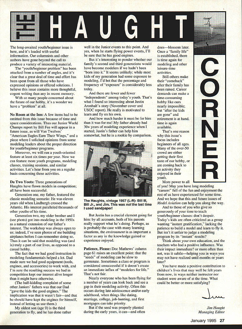The long-awaited youth/beginner issue its loaded useful information columnists other authors have gone beyond call produce variety interesting material youth/beginner problem has attacked number angles its clear great deal time effort has spent have expressed opinions offered solutions believe issue contains thoughtful cogent writing recent memory people concerned about future hobby its wonder have problem No Room Inn few items omitted issue because time space considerations Thus Junior World Champs report Bill Fee will appear future issue will Van Twelves American Eagles Earn Wings piece solicited opinions some modeling leaders about proper direction youth/beginner programs Moreover will run youth-oriented feature least six times per year Now can feature youth programs modeling classes training sessions similar activities Lets hear regular basis concerning activities Da Two Voots Three generations Haughts have flown models competition have successful Generation father featured classic modeling scenario eleven years old Lindbergh crossed Atlantic interest paralleled thousands other youths time Generation two older brother see photo got modeling 1950s natural extension fathers interest workshop always open us indeed Ive seen photos building airplanes before can remember doing Thus can said modeling truly part lives opposed casual hobby fact good instruction modeling fundamentals helped lot Dad made sure good equipment tools engines accessories work Im sure resulting success competition kept interest alive longer might have otherwise half-kidding complaint some other Juniors fathers Dad gave kids good engines implication wasnt fairand should have kept engines himself instead letting us use oldest son age 9 third generation fly has done rather well Junior events point yes starts flying power events Ill sure has good engines its interesting ponder whether familys second third generations would have become modelers hadnt born seems unlikely kids generation some exposure modeling Id bet percentage frequency exposure considerably less today fewer fewer independents among todays youth Thats what found interesting about Justin Aronhalts story November cover USOC report really motivated learn fly own much harder must him father already 30 years modeling experience started Justins father can help him somewhat rookie comparison Justin has crucial element going him accounts both parents really support what hes doing Perhaps probably case learning situations environment important factor knowledge gained experience enjoyed Patience Please Doc Mathews column page 61 raises excellent point seeds modeling can slow germinate Sometimes class program considered unsuccessful doesnt create immediate influx modelers life Thats fair Nearly everyone has flying number years can look back see gap modeling activity Often occurs during late adolescence and/or early adulthood things like dating marriage college job-hunting first mortgages can take priority seed properly planted during early years canand often doesblossom later Once family life established time again modeling other C leisure-time activities Still others make comeback after family has 0 raised Career demands can make time-consuming hobby like nearly impossible R after kids gone retirement hand time again available N Thats reason issues focus includes beginners ages over-50 getting first E crowd either taste hobby coming back activity youth R enjoyed power May have long modeling careers full fun enjoyment rest us have experienced some time hope future issues Model Aviation can help along way give generously time teach youth/beginner classes dont despair Todays kids often criticized group wanting instant gratification lacking patience build model learn fly isnt unfair judge modeling program its instant results Think about own education teachers positive influence impact immediate often subtlehelping ways may have realized until months years later have made positive contribution childrens lives may well felt years now ways neither instructor nor student aware time What could better satisfying S&AAA Jim Haught Managing Editor January1995 27 Haughts vintage 1957 L-R Bill Ill Bill Jr Jim last time used sandpaper
