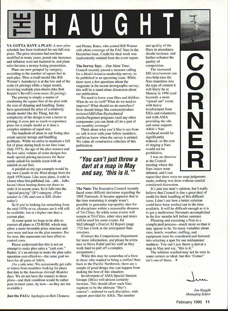 YA GOTTA HAVE PLAN new price schedule has instituted full-size plans price structure modified years postal rate increases inflation factored plans sales became money-losing proposition Plans now grouped category according number square feet plan Thus small model like Bill Warners Aerodactyl low end scale pricing larger model involving multiple plan sheets like Bob Kopskis Revolt costs D pricing pricing simply matter combining square feet plan cost shipping handling Some have questioned price relatively simple model like Thing complexity design factor pricing costs just much reproduce plans simple model does complex airplane equal size hundreds plans listing also create special storage handling problems strive maintain full list plans dating back first issue July 1975 age plan masters low sales volume some designs has made special pricing necessary rarely-asked-for models seen asterisk list painful-to-my-ego example would own Candle Wind design April 1976 issue Like plans sold burst first published but. .. folks havent beating down doors order recent years So falls special pricing B* category Plan number 138 cost $20 Order today So youre looking something mid-I 970s chances will still available higher rate current plan some point hope able convert plans CD-ROM may allow favorable price structure save wear tear plan masters now represents best effort control costs Please understand attempt make plan sales cash cow Rather its attempt make plan sales operation cost-effective-the same goal have parts AMA As side note occasionally get calls letters modelers looking plans date American Aircraft Modeler days have masters plansand condition would rather poor cases nowso available Just FACs Apologies Bob Clemens Survey Says. Time Council recently passed measure calling Model Aviation readership survey published upcoming issue few questions about magazine recent demographic survey will stand-alone discussion about publication need know likes dislikes What well What need improve What should more/less should things like contests/product reviews/ARFs/fun-flys/technical articles/beginner programs other components can think part monthly coverage Think about what youd like see us talk over fellow modelers lei us know survey printed value constructive criticism publication cant just throw dart map May say Nats Executive Council recently faced some difficult decisions regarding 1995 Nationals became apparent time remaining simply wasnt possible guarantee top-quality sites disciplines within reasonable distance Tn-Cities So some events will remain Tn-Cities other sites times will used some events Ed McColloughs District XI Report page 172 has look anticipated Nats structure Contact Competitions Department information please extranice Steve Kaluf staff work hard pull off complex assignment may somewhat blow wanted bring unified Nats back Pacific Northwest couple good things can happen making best situation Involvement AMA Special Interest Groups SIGs will almost certainly increase should allow Nats segment ultimate fliers contesttailored discipline support provided AMA number quality fliers attendance should increase further enhance quality C competition increased SIG involvement can also help ease Nats transition will likely 0 type contest Muncie 1996 beyond involvement R spread out event heavy SIGs volunteers AMA AMAs Nats N providing site some support overhead would significantly wouldnotbeE reduced cost staging Nats prohibitive observer Nats issues R Council meeting debated can report no snap judgments made nothing done careful considered discussion Its just mans opinion really believe Council due great deal credit handling difficult issue dont see better solution could have worked out time available will difficult enough get multivenue Nationals accomplished few months left before summer Planning executing Nats complicated processmuch may appear So variables about sites hotels weather staffing equipment must considered factored selecting spot midsummer madness cant just throw adart map May say solution reached may seen some corners ideal Corner isnt Haught Managing Editor February 1995 11 Plenny Bates assited Bill Warner photo coverage FAC Nats December issue Credit work inadvertently omitted event report