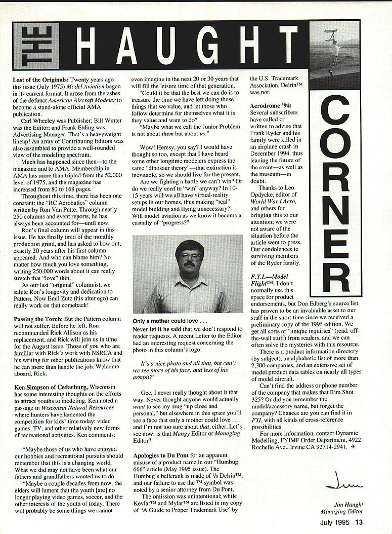 Last Originals Twenty years ago issue July 1975 Model Aviation began its current format arose ashes defunct American Aircraft Modeler become stand-alone official AMA publication Carl Wheeley Publisher Bill Winter Editor Frank Ehling Advertising Manager Thats heavyweight lineup An array Contributing Editors also assembled provide well-rounded view modeling spectrum Much has happened since thento magazine AMA Membership AMA has tripled 52000 level 1975 magazine has increased 80 168 pages Throughout time has constant RC Aerobatics column written Ron Van Putte Through nearly 250 columns event reports has always accounted foruntil now Rons final column will appear issue has finally tired monthly production grind has asked bow out exactly 20 years after first column appeared can blame him No matter much love something writing 250000 words about can really stretch love thin As last original columnist salute Rons longevity dedication Pattern Now Emil Zutz alter ego can really work comeback Passing Torch Pattern column will suffer Before left Ron recommended Rick Allison replacement Rick will join us time August issue familiar Ricks work NSRCA writing other publications know can handle job Welcome aboard Rick Ken Simpson Cedarburg Wisconsin has some interesting thoughts efforts attract youths modeling Ken noted passage Wisconsin Natural Resources hunters have lamented competition kids time today video games TV other relatively new forms recreational activities Ken comments Maybe us have enjoyed hobbies recreational pursuits should remember changing world What did may have what fathers grandfathers wanted us Maybe couple decades now elders will lament youth [are] no longer playing video games soccer other interests youth today will probably some things cannot imagine next 20 30 years will fill leisure time generation Could best can treasure time have left doing things value let whoAerodrome 94 follow determine themselves what isSeveral subscribers value want dohave called Maybe what call Junior Problemwritten advise about about usFrank Ryder family killed alrplane crash December 1994 thus leaving future eventas well museumin Wow Heresy say would have thought too except have heard some other longtime modelers express same dinosaur theorythat extinction inevitable should live present Are fighting battle cant win really need win anyway 1015 years will have virtual-reality setups homes thus making real model building flying unnecessary Will model aviation know become casualty progress Only mother could love. Never let said dont respond reader requests recent Letter Editor interesting request concerning photo columns logo Its nice photo cant see face less armpit Gee never really thought about way Never thought anyone would actually want see mug up close personal elsewhere space youll see face mother could love Im too sure about either Lets see now Mangy Editor Managing Editor C 0 R N E F YIModel R FlightTM I dont normally use space product endorsements Don Edberg s source list has proven invaluable asset staff short time since received preliminary copy 1995 edition get sorts unique inquiries read offthe-wall stuff readers can often solve mysteries resource product information directory subject alphabetic list 2300 companies extensive set model product data tables nearly types model aircraft Cant find address phone number company makes Rim Shot 325 did remember modellaccessory name forget company Chances can find FYI kinds cross-reference possibilities information contact Dynamic Modelling FYIMF Order Department 4922 Rochelle Ave Irvine CA 92714-2941 ogies Du Pont apparent misuse product name Humbug 666 article May 1995 issue Humbugs bellcrank made 1/g DelrinTM failure use TM symbol noted senior attorney Du Pont omission unintentional KevlarTM MylarTM listed copy Guide Proper Trademark Use WA Jim Haught Managing Editor doubt Thanks Leo Opdycke editor World War IAero others bringing attention aware situation before article went press condolences surviving members Ryder family July1995 13